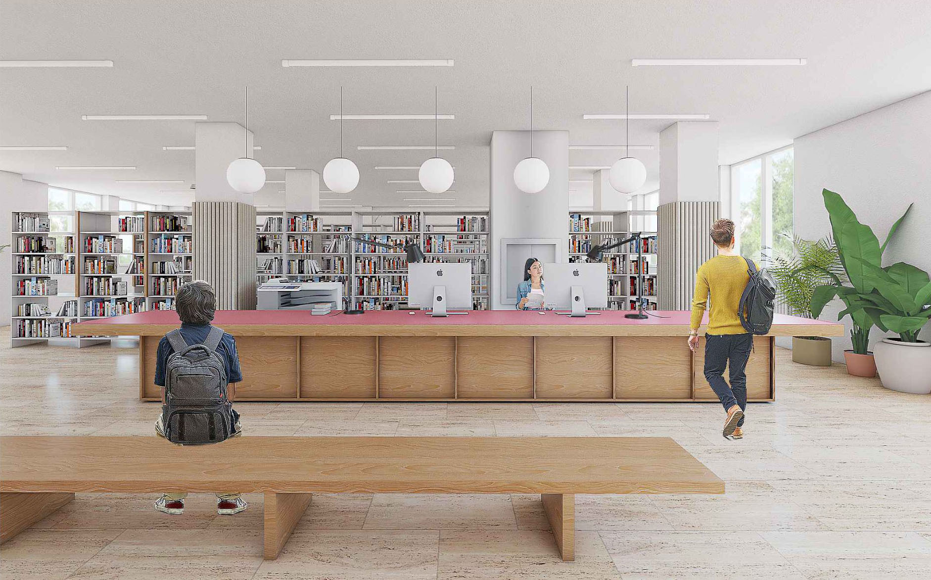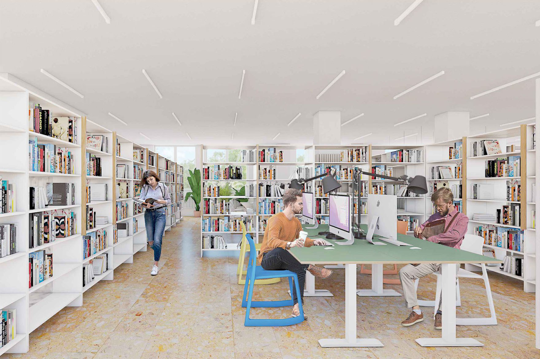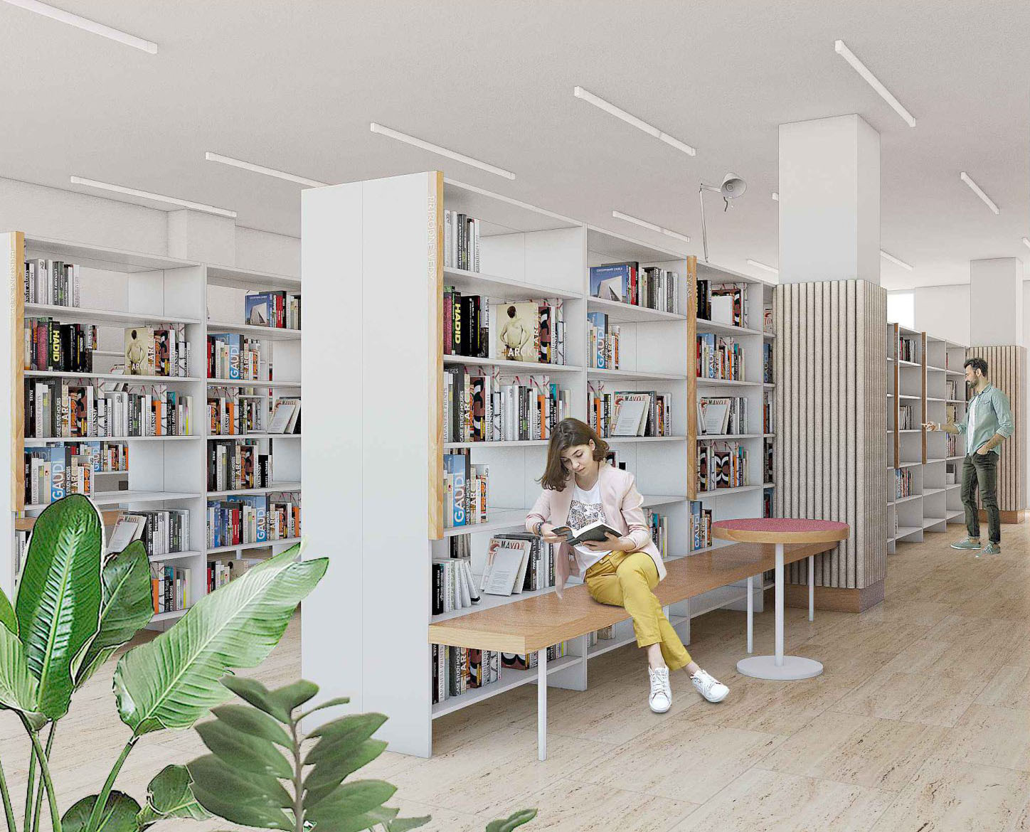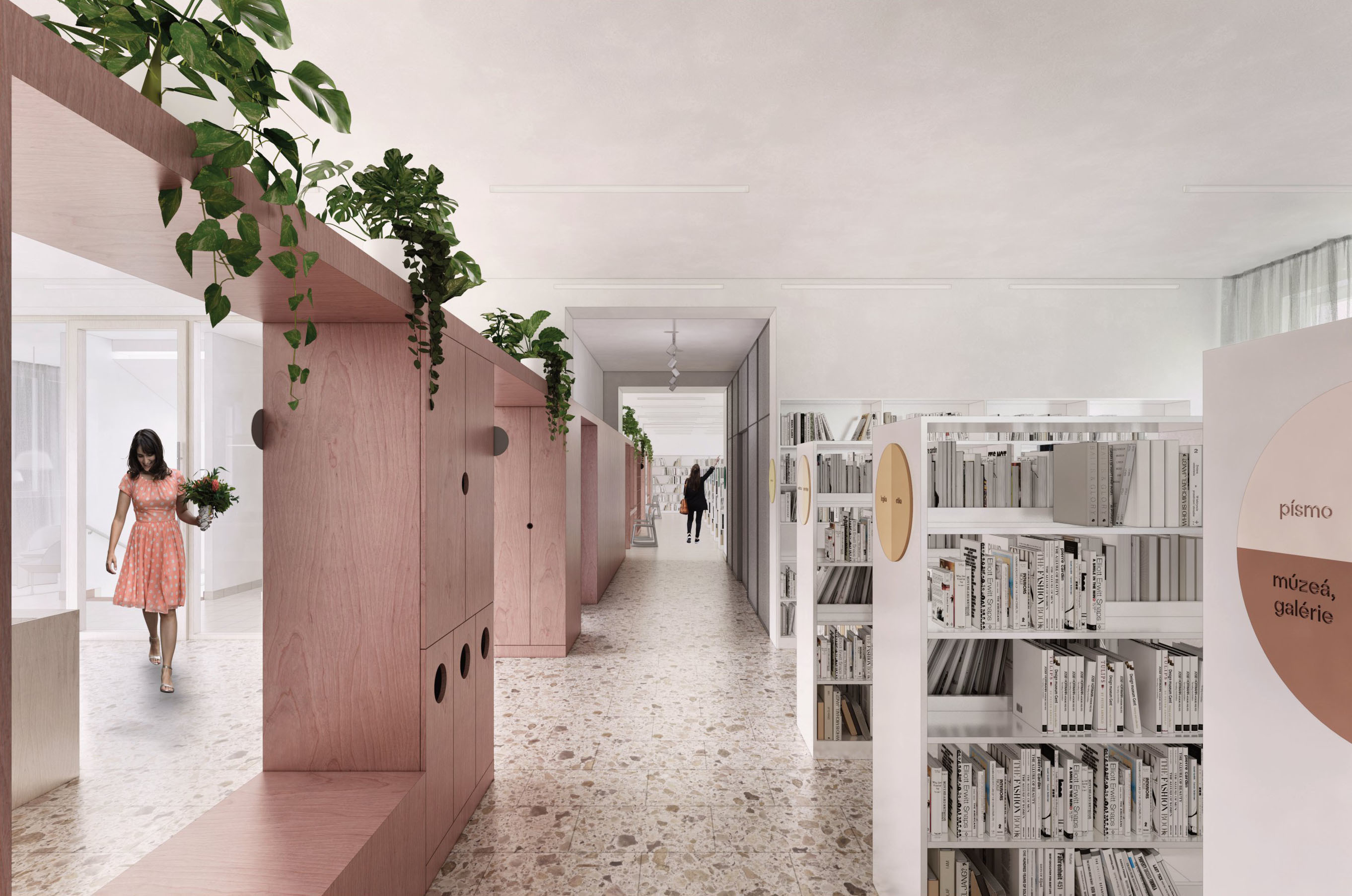 Zámer návrhu by mohol byť charakterizovaný ako prepájanie a kontinuita. Nielen priestorová, ale najmä myšlienková a koncepčná. Hľadanie a zastieranie optických bariér si dáva za cieľ minimalizovať dvojakosť oddelenia knižnice na jednom podlaží. Priestor je dnes delený na dva stavebné celky, ktoré pretína komunikačné jadro - bariéra. Návrh multifunkčnej nábytkovej zostavy, vo farbe oddelenia náučnej literatúry, priebežne prechádza oboma časťami podlažia a je hravým stvárnením novej funkcionality priestoru. Nejedná sa však o bežnú knižnú zostavu, ale súbor pracovných miest, neformálnych sedení, skriniek či iných úložných priestorov. Skrýva tak v sebe obslužné prvky, a umiestňuje ich na miestach na to potrebných. Línia multifunkčnej zostavy taktiež pomáha zónovať priestor knižnice podľa funkčnej náplne. Pritom však zachováva svojimi perforáciami a výškou prehľad o nadväzujúcich zónach. Porota vnímala tento novotvar ako zásadný a jasne čitateľný benefit návrhu.