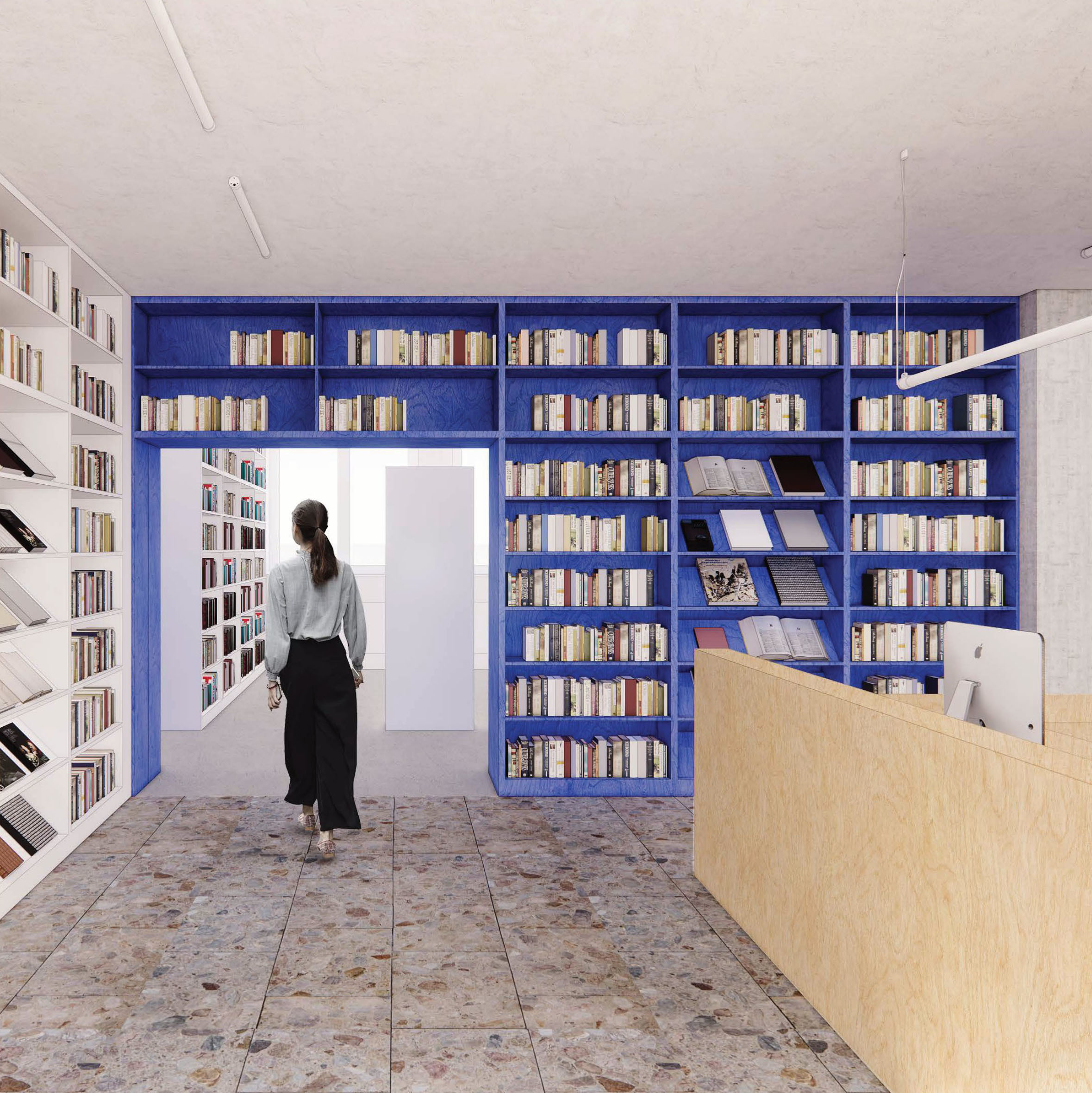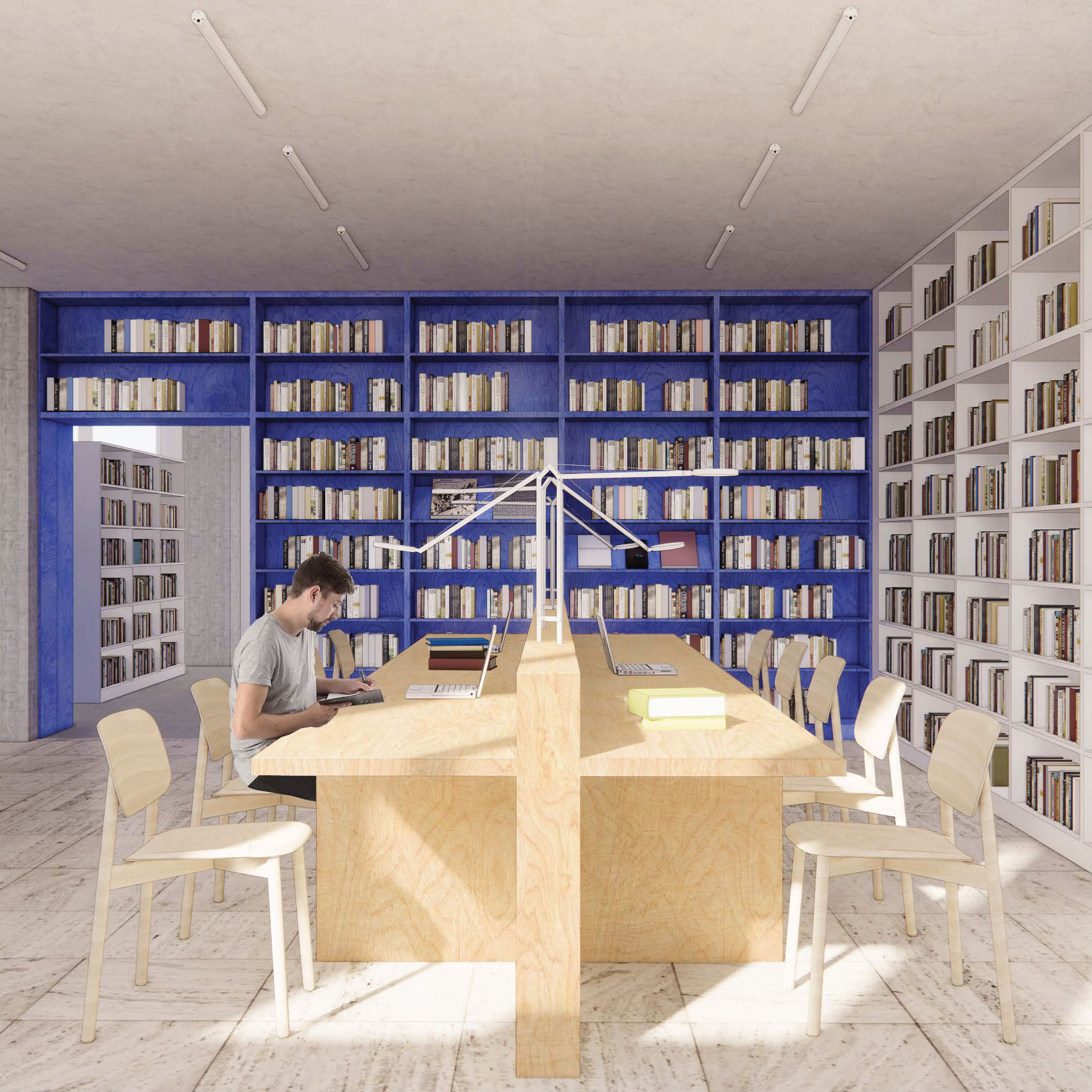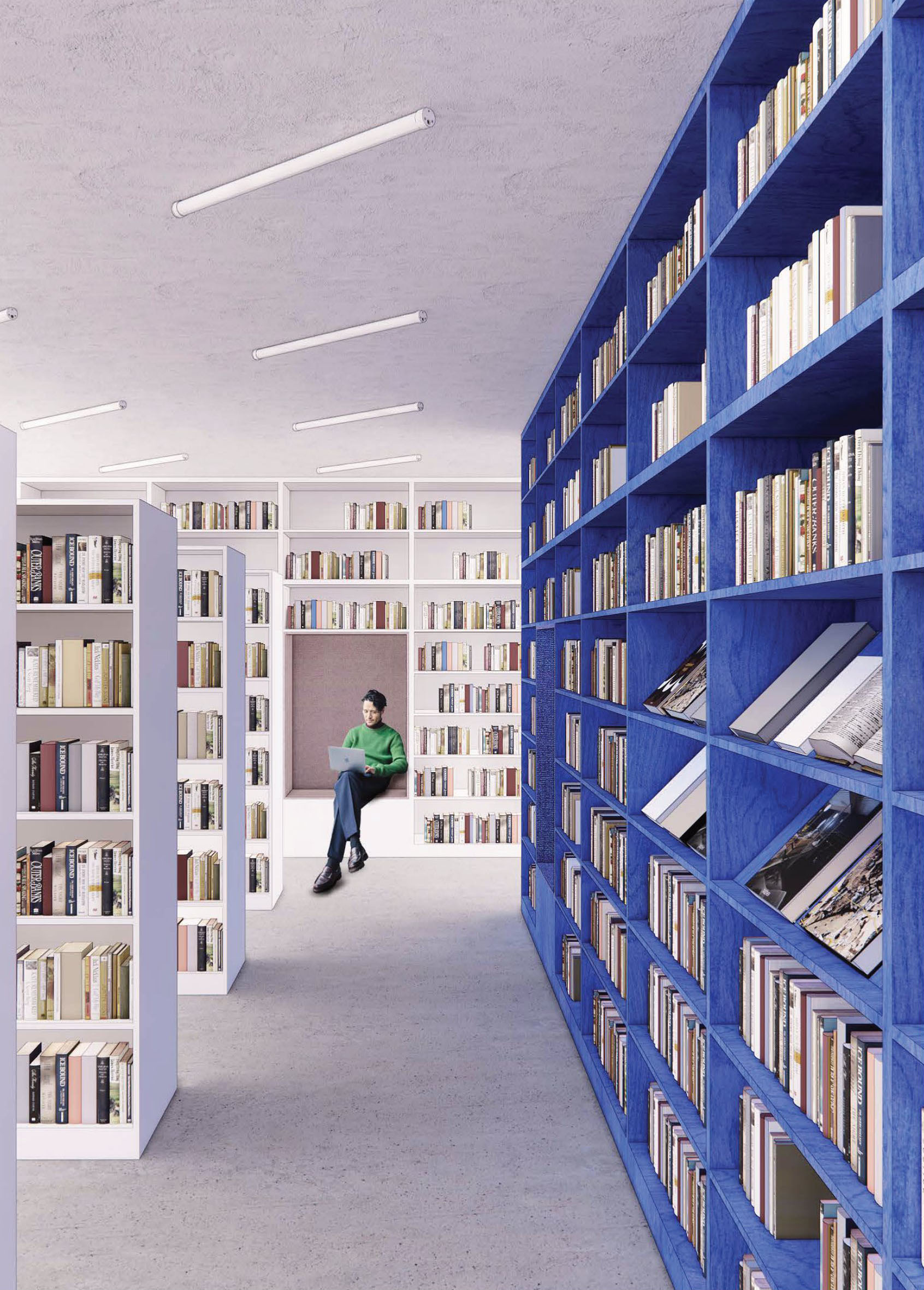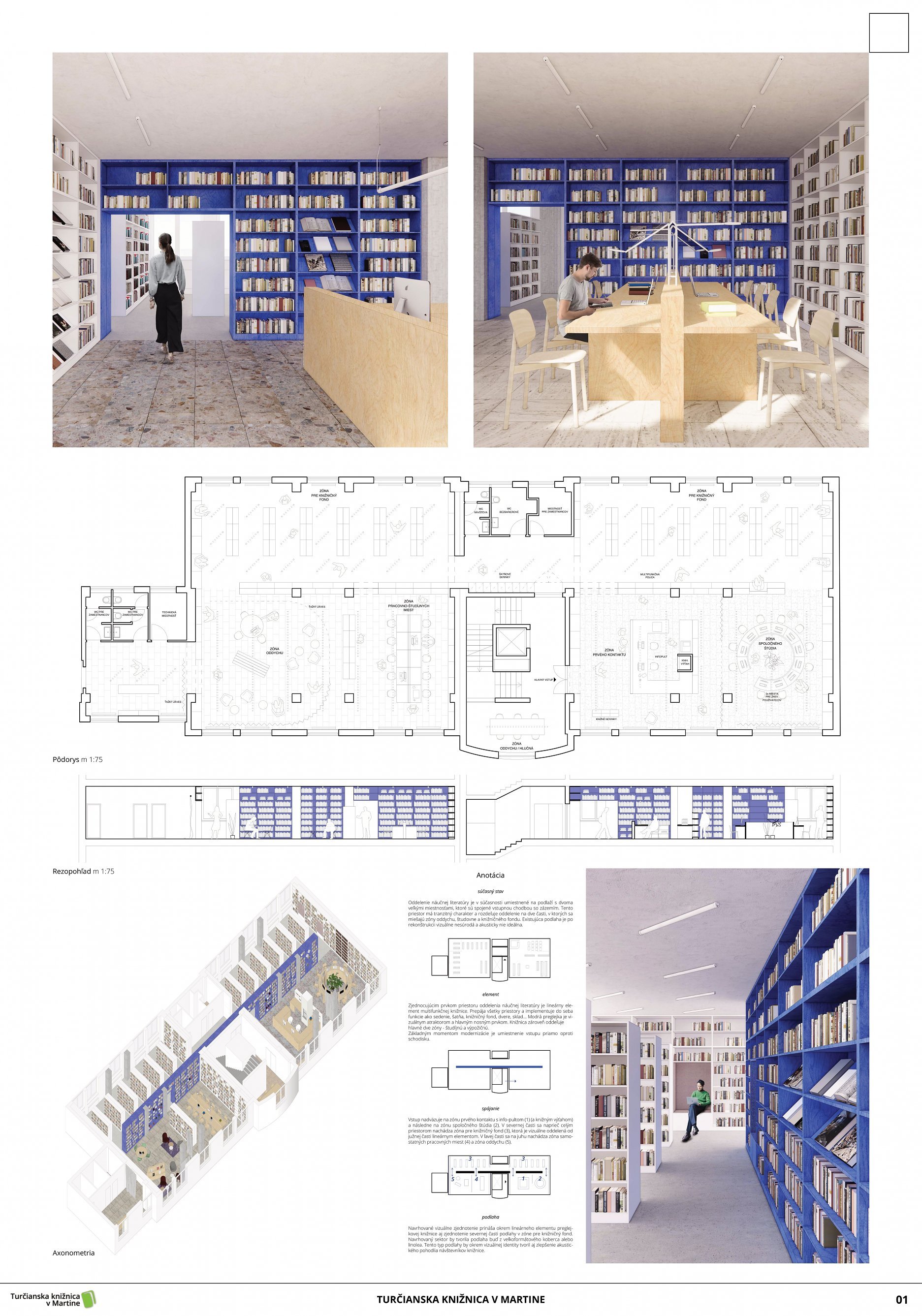 Dominantným prvkom návrhu je výrazná modrá línia, element, ktorý pretína priestor knižnice naprieč celým pôdorysom. Tento výrazný akcent je konceptom a atraktorom zároveň. Púta svojou dominanciou v materiálovej striedmosti ostatných nábytkov a povrchov. Zároveň je to skôr deliaci ako spájací prvok, ktorý člení priestor na ďalšie zóny. Týmto delením priznáva súčasné dve časti knižnice a vytvára z nich až štyri sekcie. Takéto riešenie má jeden výrazný benefit, a to je akustika priestoru, ktorá vďaka menším uzavretým plochám dokáže lepšie odhlučniť neželané ruchy rôznych funkcií. Otázny zostáva potom dôvod vymeniť takmer polovicu nášlapnej vrstvy, ktorej prínos pravdepodobne nebude prevyšovať vstupnú investíciu v napätom rozpočte. Porota napriek výhodám navrhovaného elementu a jeho jednoznačnému konceptu, vnímala aj súvisiace negatíva. Vzhľadom na tendenciu znižovania vystaveného knižného fondu, sa javí množstvo úložných metrov políc v návrhu ako nadbytočné. Návrh taktiež opomenul orientačný infosystém, ktorý mohol vniesť do silného konceptu, ešte ďalšiu vrstvu. Z hľadiska pôdorysného usporiadania je návrh veľmi funkčný, pričom drobné prevádzkové nezrovnalosti sú riešiteľné preusporiadaním solitérnych prvkov.