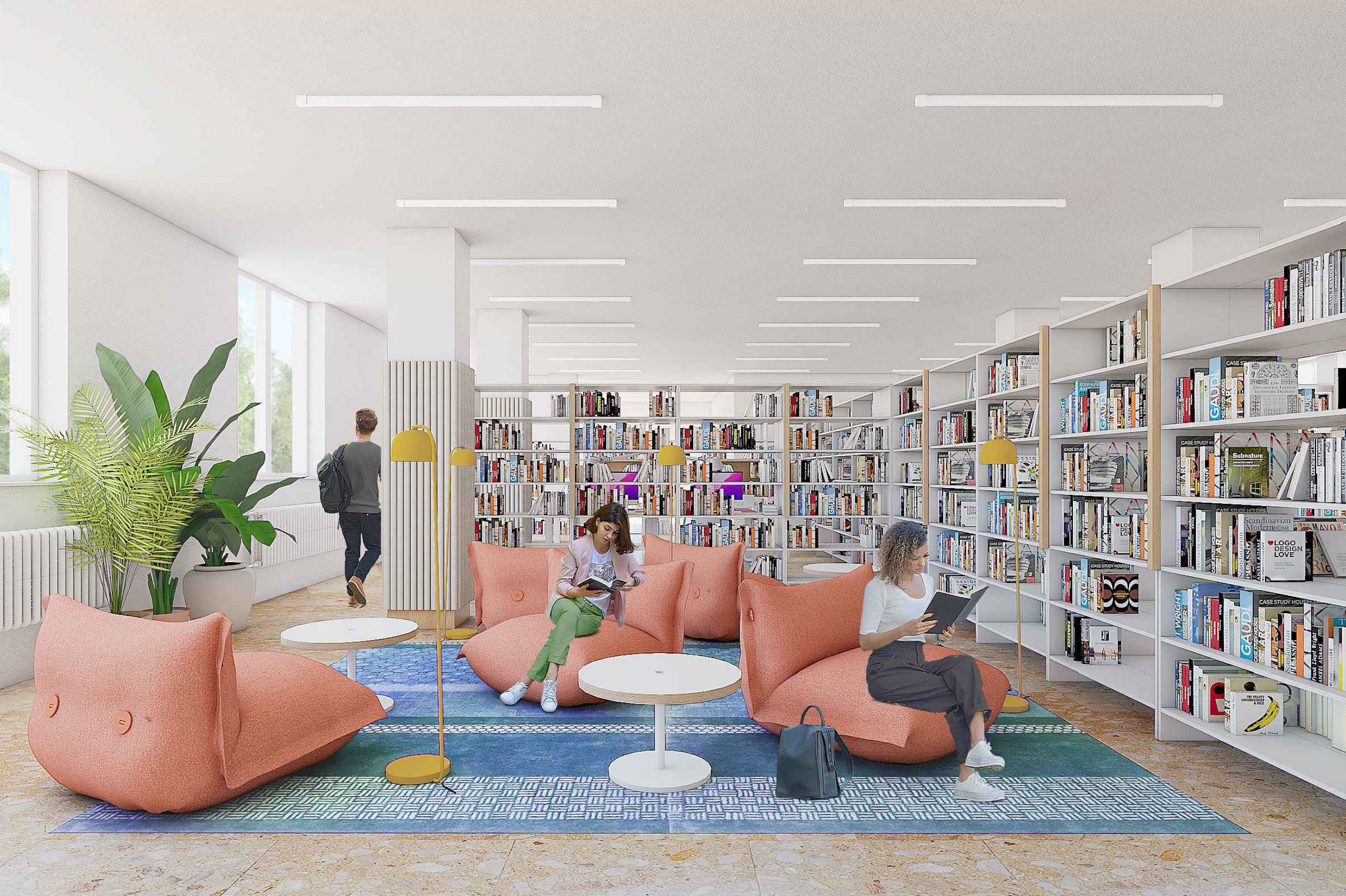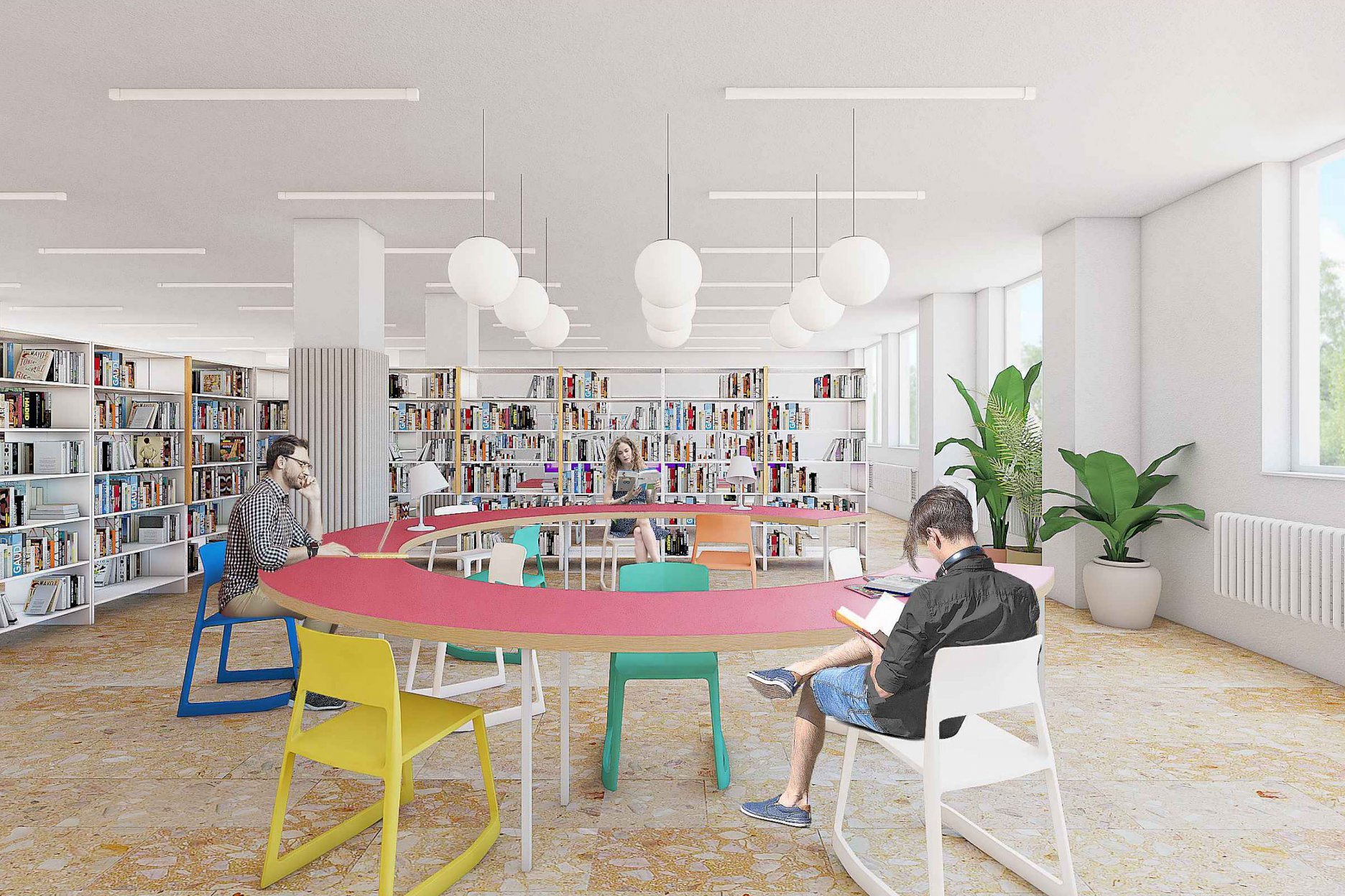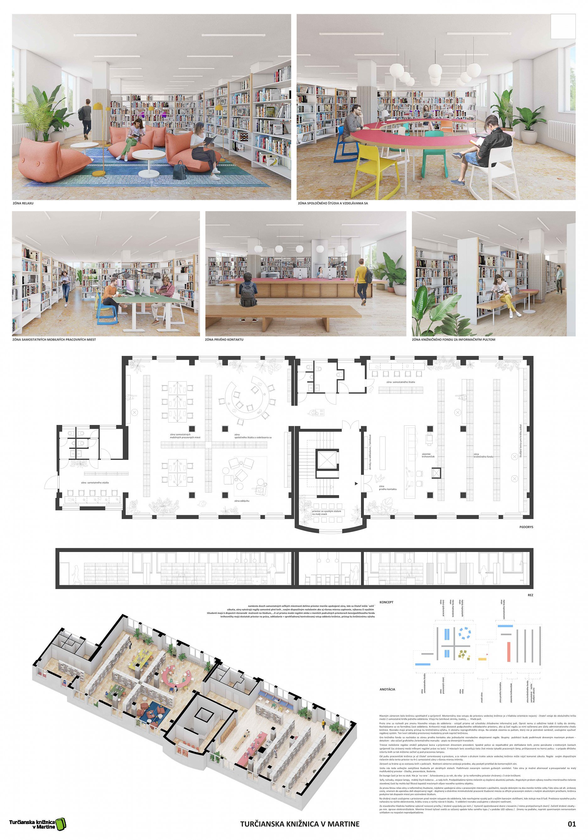 Návrh si dáva za cieľ priestor sprehľadniť a spríjemniť. Nehľadá za každú cenu ústredné koncepčné prvky, avšak veľmi dobre sa orientuje vo vytváraní nových nálad a charakterov. Nepopierateľný a dobre čitateľný je zmysel pre detail a hravosť v celom návrhu. Autori pragmaticky nazerali na požadované potreby knižnice a hľadali im správne miesto. Pravá časť pôdorysu je využitá primárne ako knižný fond a ľavá časť na aktívne nové funkcie. Kvalita návrhu sa potom ukrýva v stvárnení jednotlivých zón, ktoré navodzujú rozličné atmosféry a trávenia času v knižnici. Zvolená farebnosť pravdepodobne reflektuje väčšinových užívateľov - mládež. Návrh vo svojom celku avšak zakrýva isté prevádzkové pochybnosti. Chýba členenie zón z hľadiska ich hlučnosti, ktoré by si vyžadovalo radikálnu úpravu. Taktiež je obmedzená variabilita a orientácia v priestore z hľadiska navrhovaného líniového radenia knižných regálov. Otázne je tiež priznávanie nosných stĺpov v tesnej blízkosti nábytkov, čím je sťažený prístup k nim. Pozitívom je na druhú stranu etapizovateľnost a reálnosť investičných nákladov s ohľadom na riešenie vybavenia a použitia prevažne typizovaných prvkov.