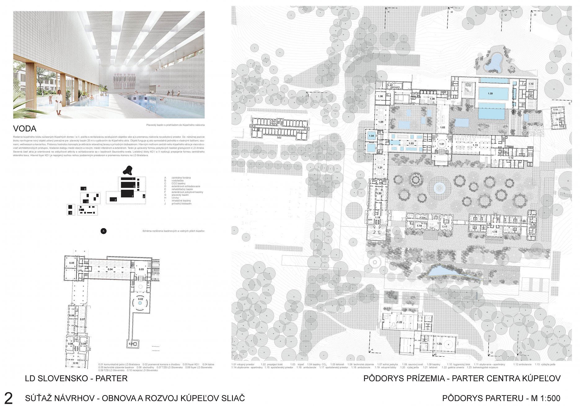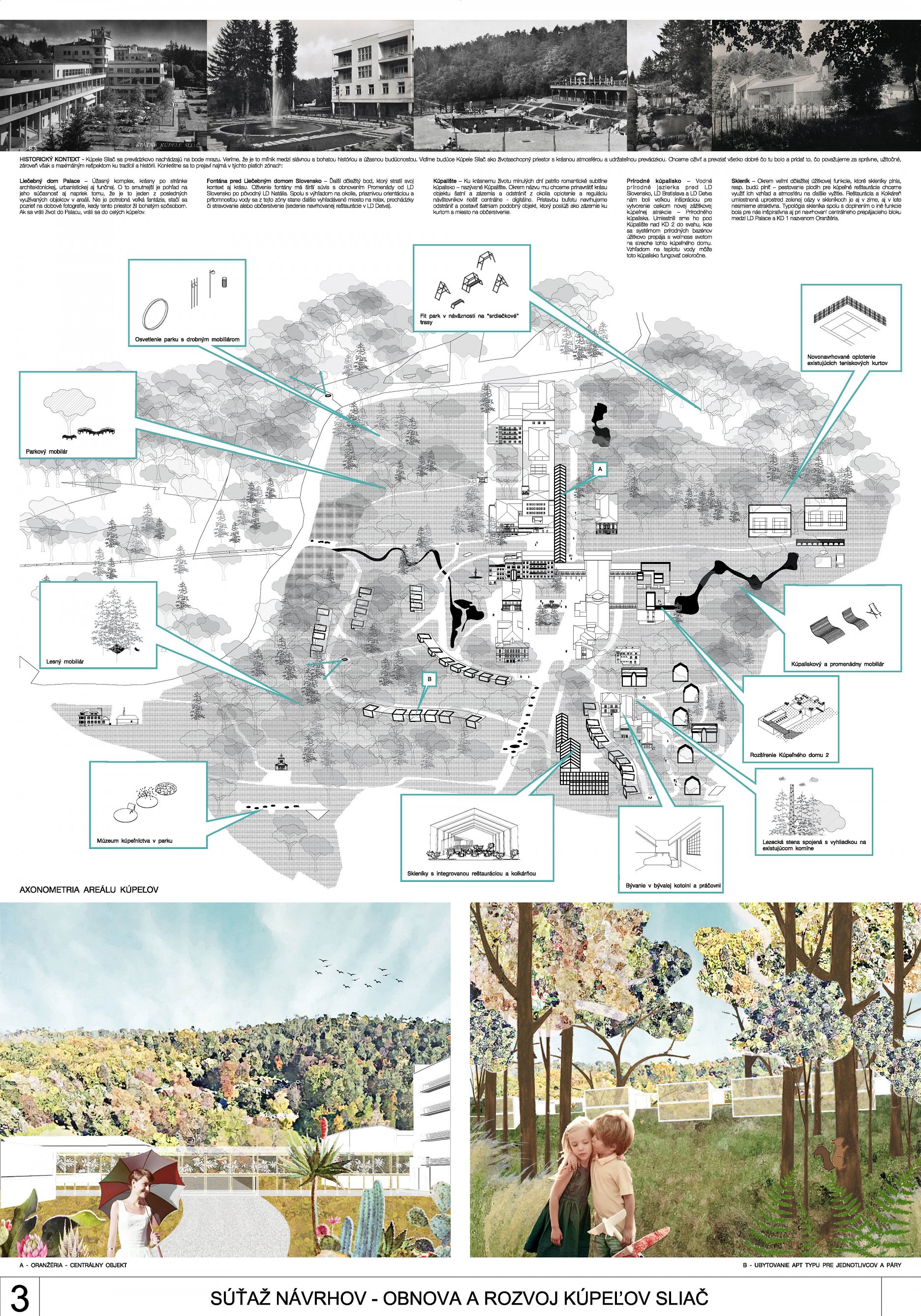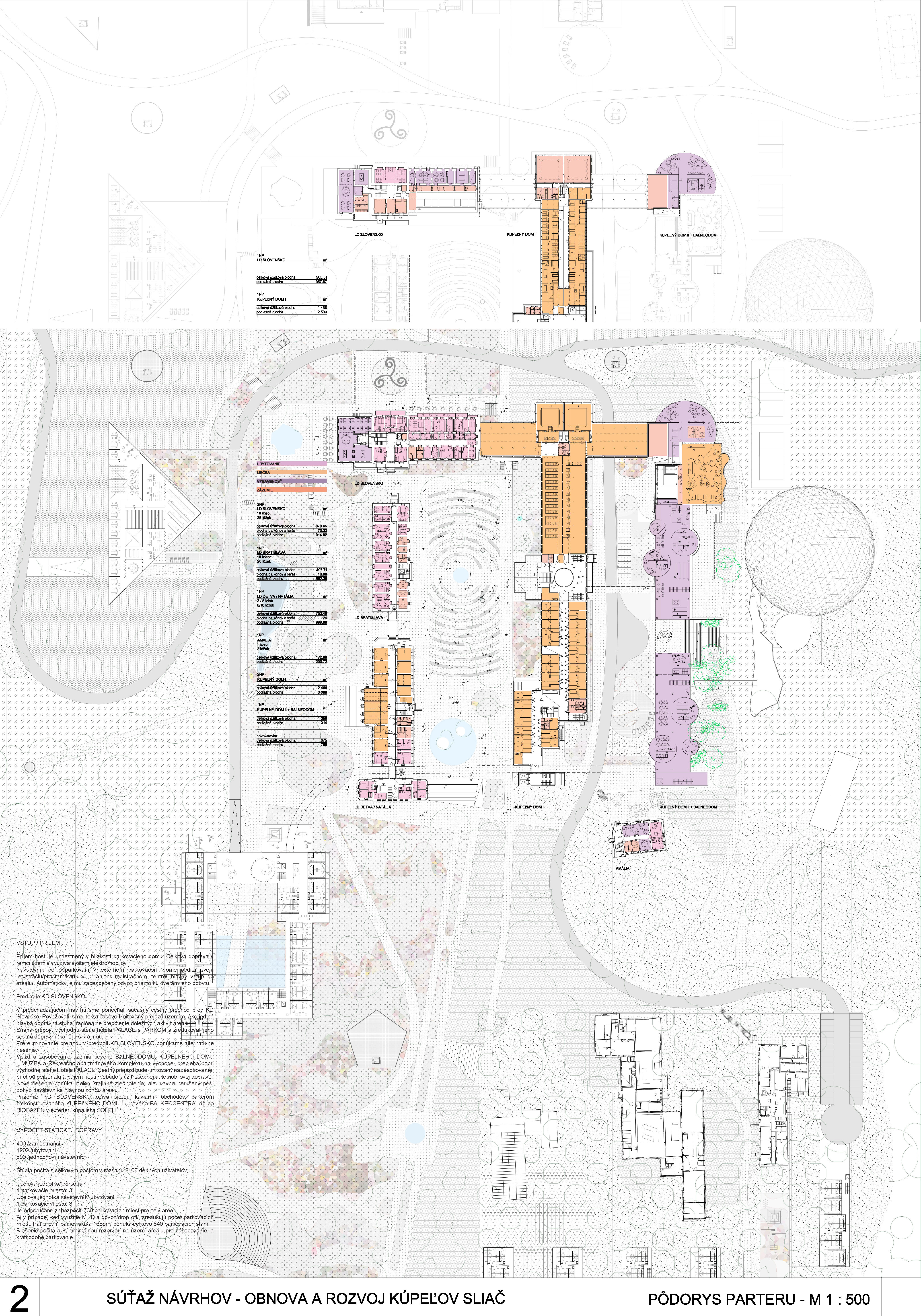 - do územia sebavedome vkladá novú architektonickú vrstvu balneoterapie, balneolab-u a sférickou kupolou prekrytý biobazén,