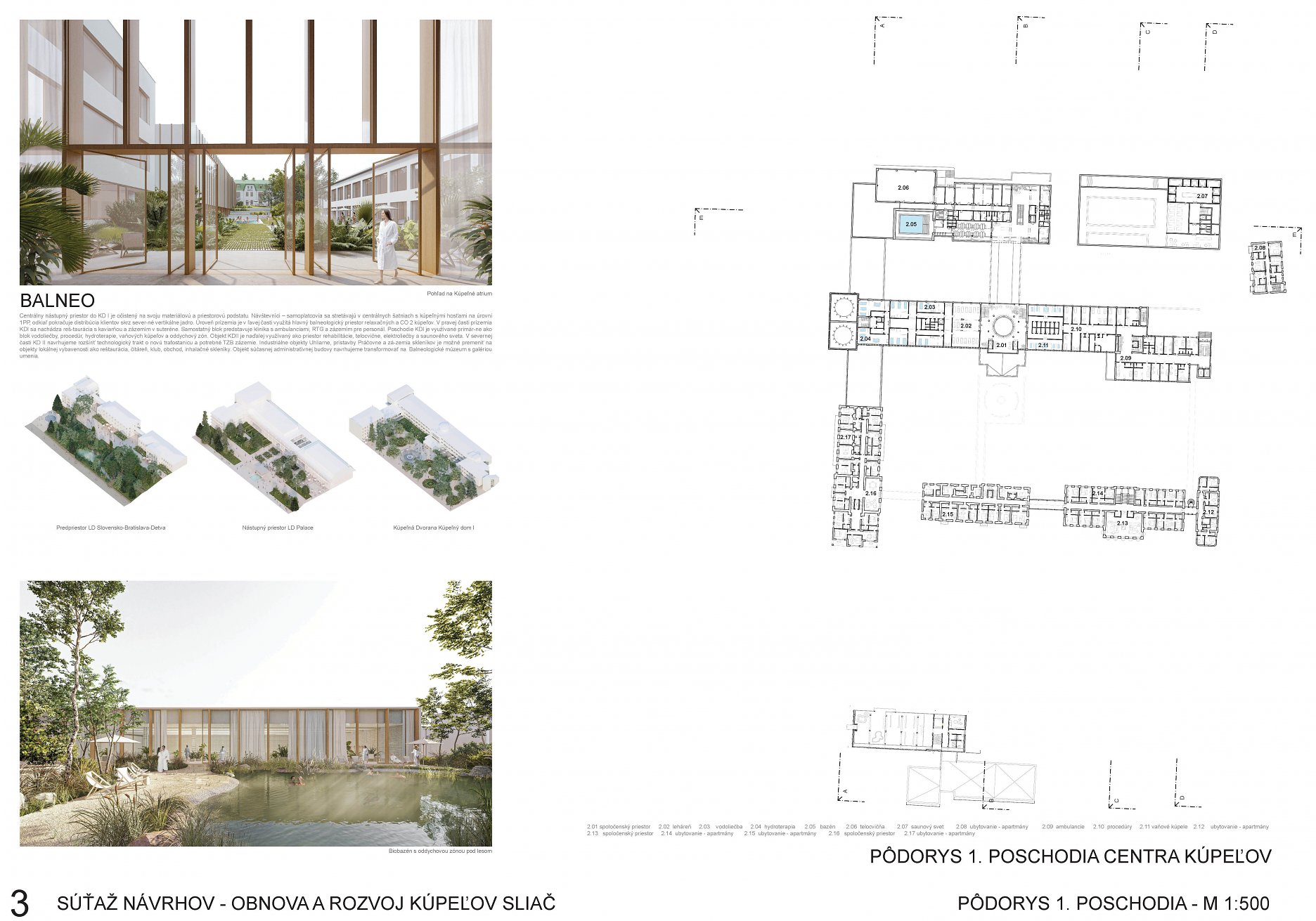 - novonavrhované objekty balneoterapie vyznačujúce sa prelínaním interiéru a exteriéru hodnotila porota pozitívne. V tejto snahe o invenčné riešenie však porota identifikovala značné problémy vo funkčnosti dispozícii,