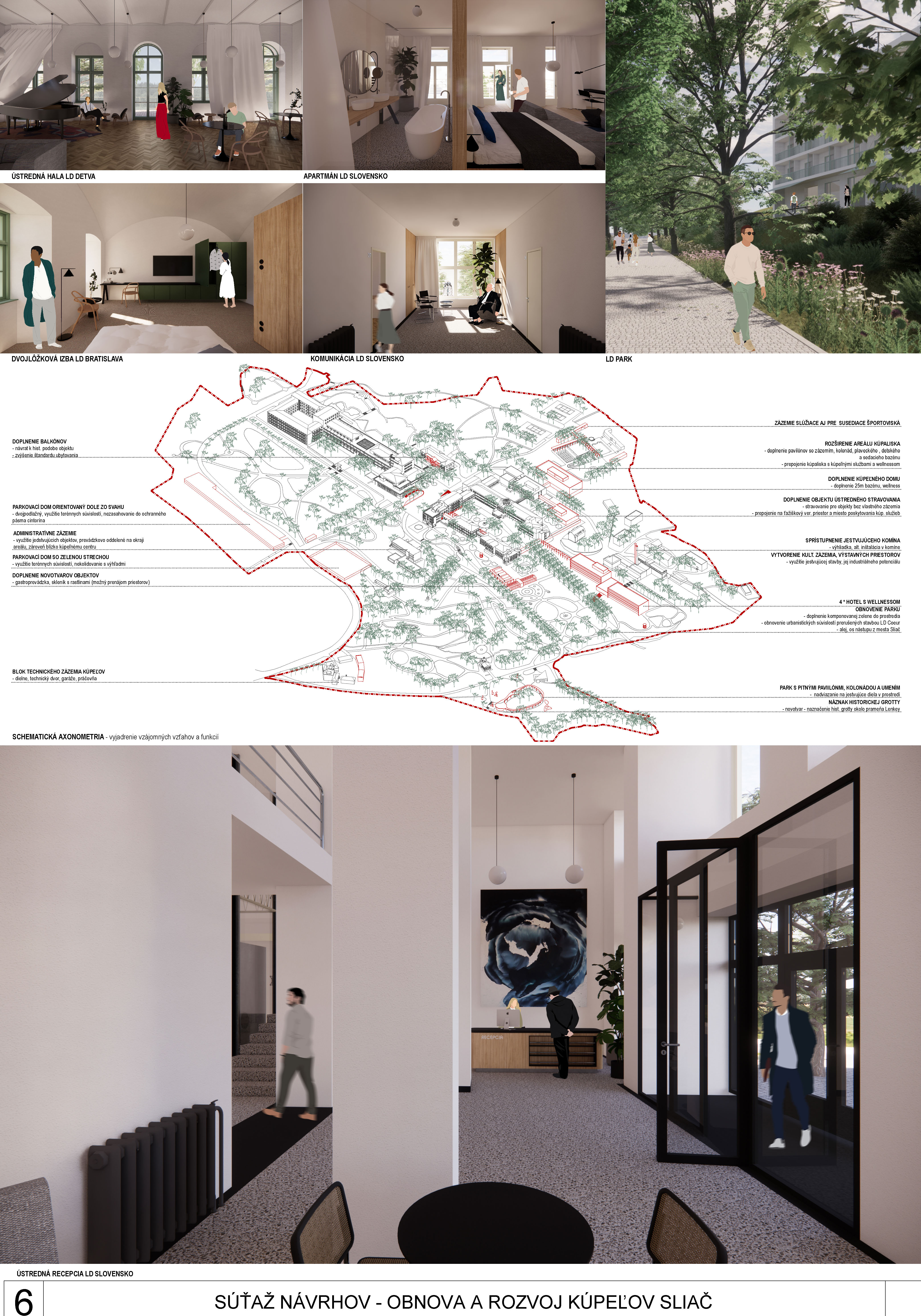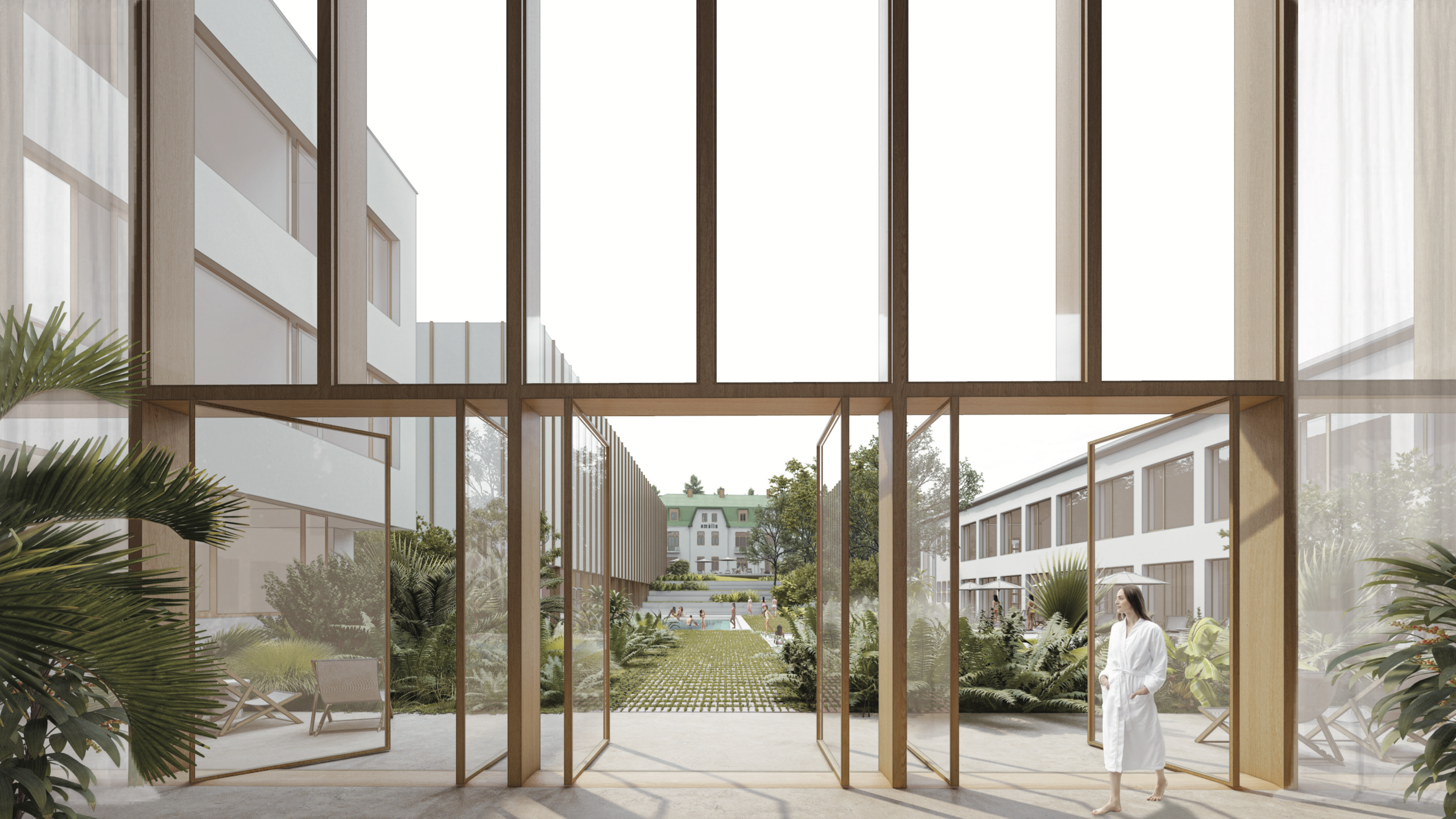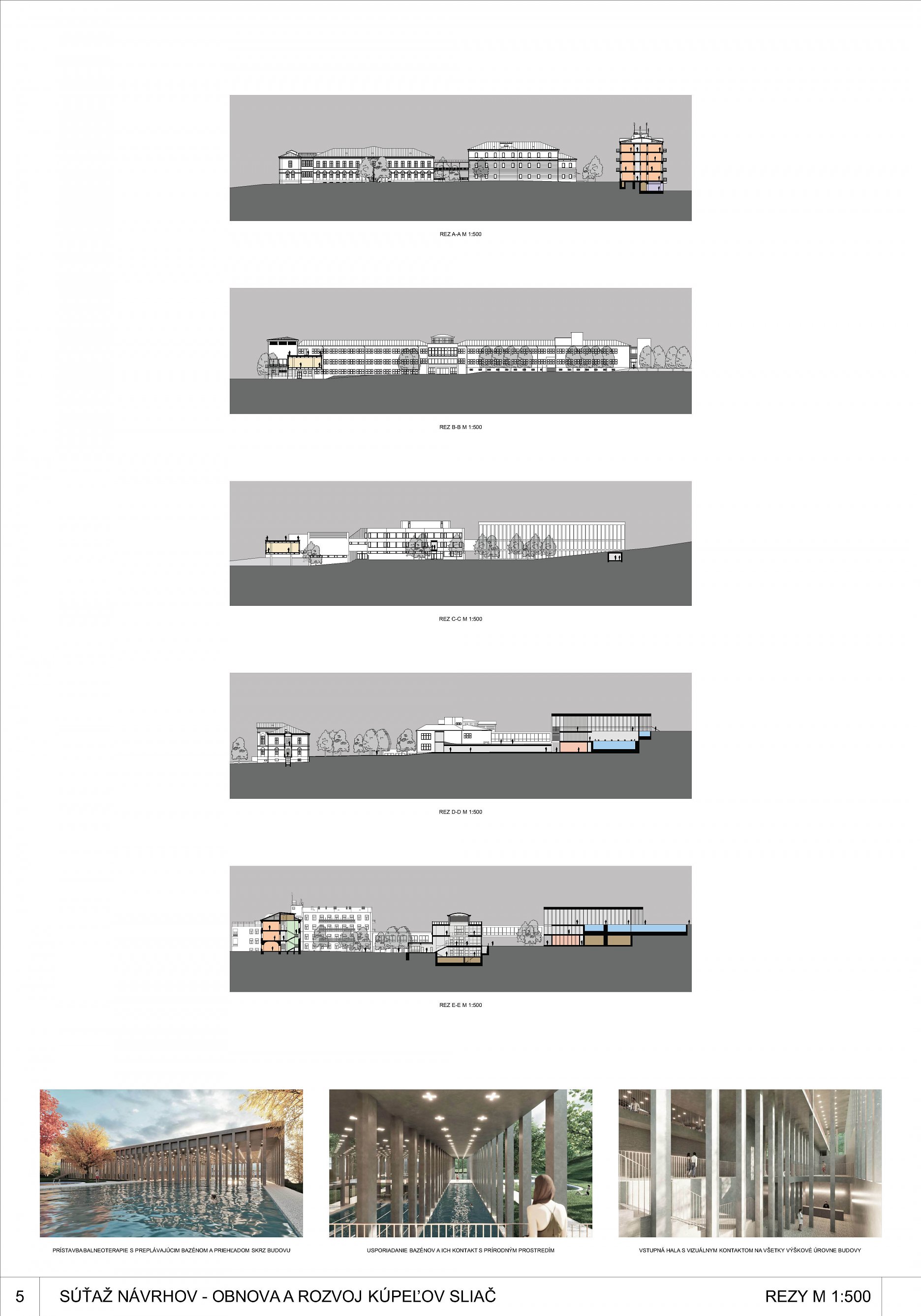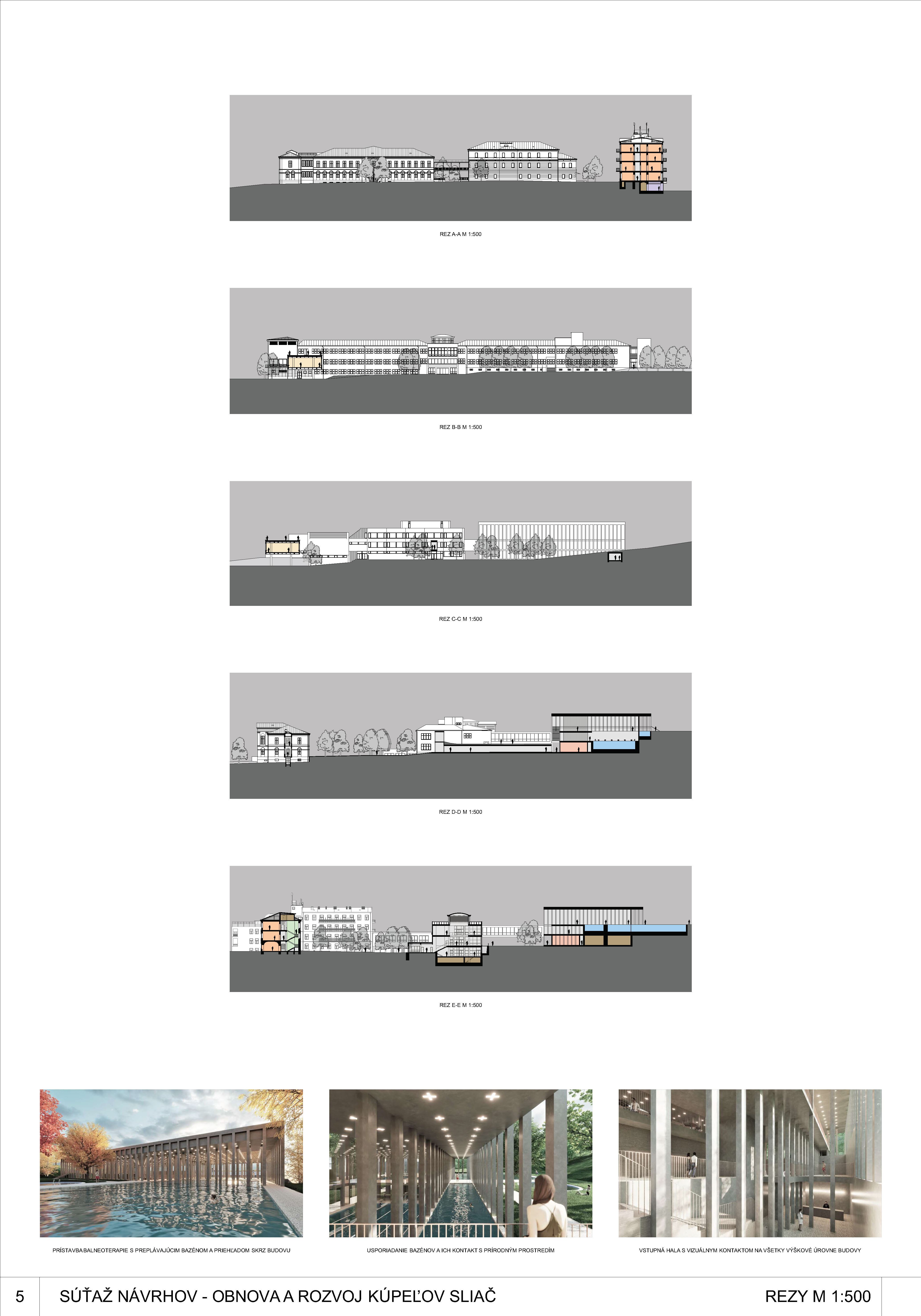 - dobre prepája interiér s exteriérom, navrhuje doplnenie verejného priestoru „kúpeľného námestia“ a vytvorením nového komplementárneho intímneho priestoru medzi kúpeľnými domami