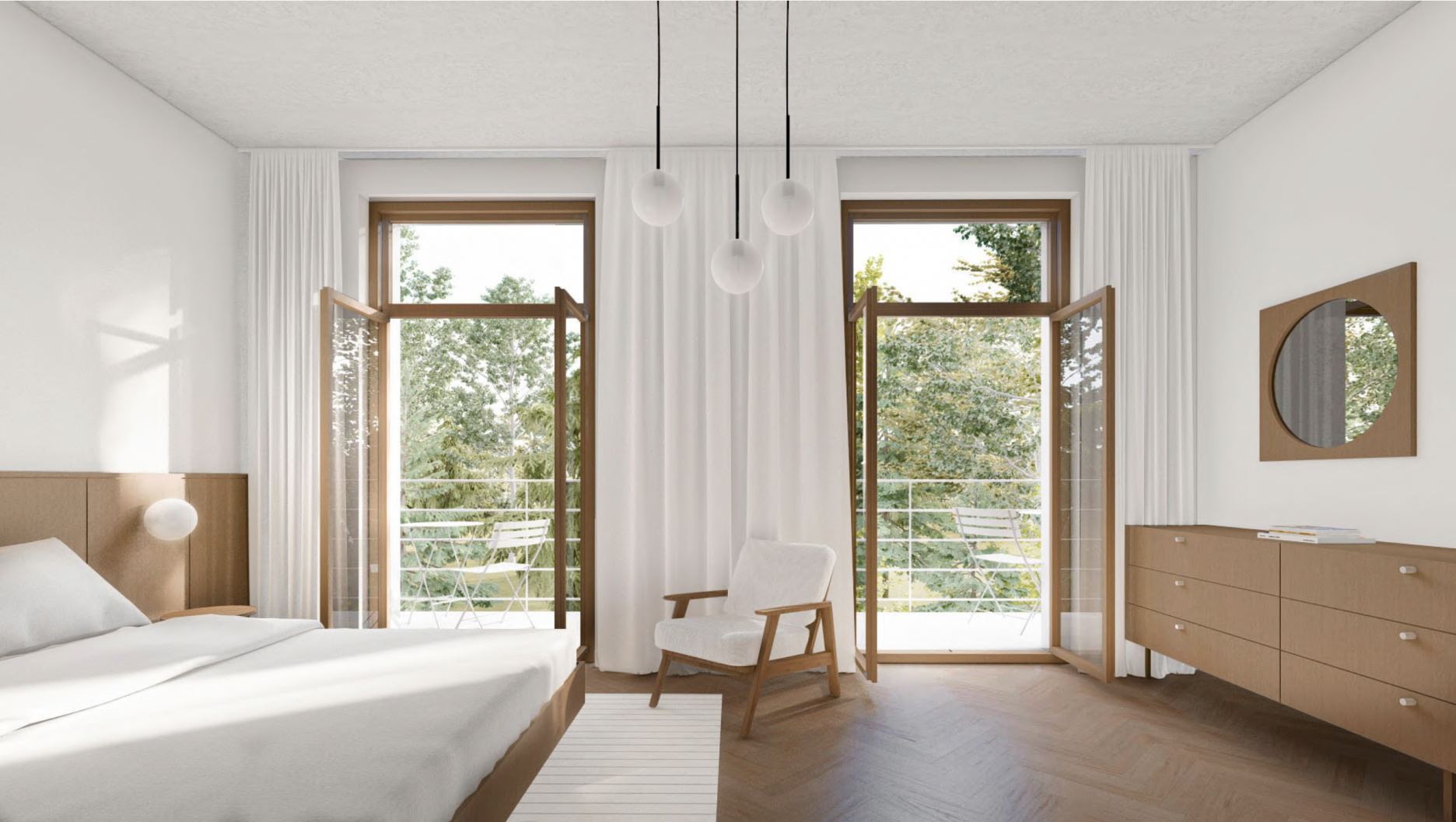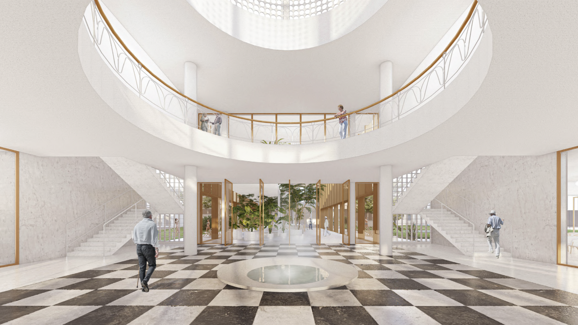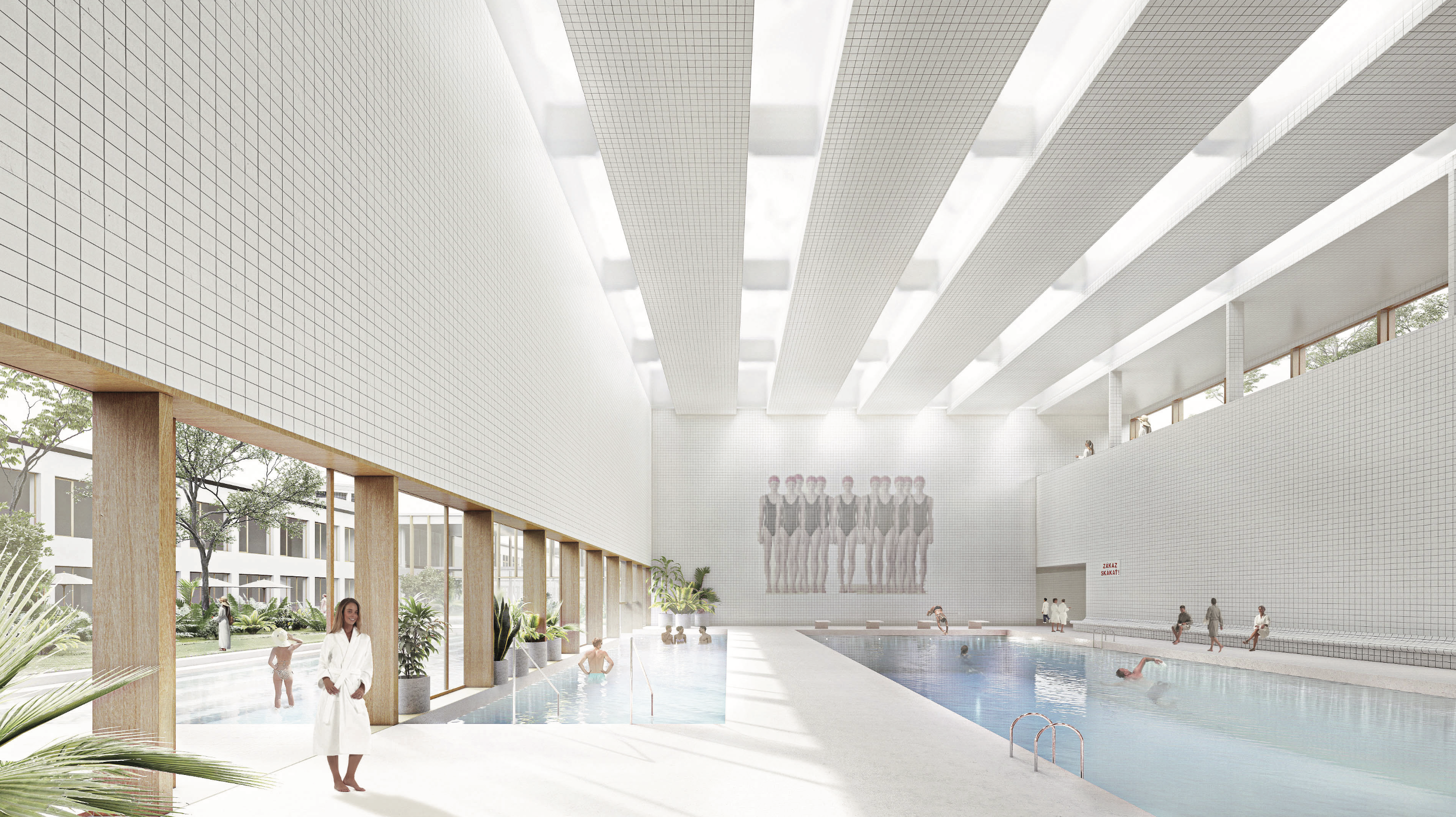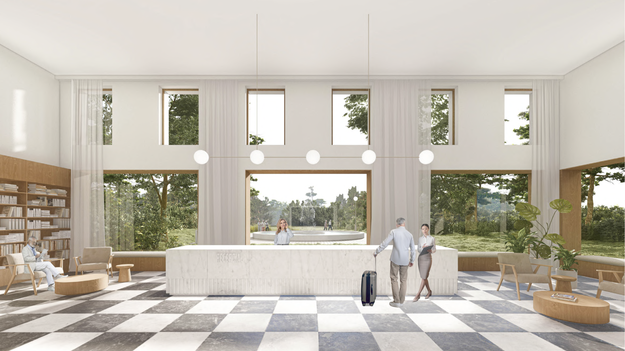 - dobre prepája interiér s exteriérom, navrhuje doplnenie verejného priestoru „kúpeľného námestia“ a vytvorením nového komplementárneho intímneho priestoru medzi kúpeľnými domami