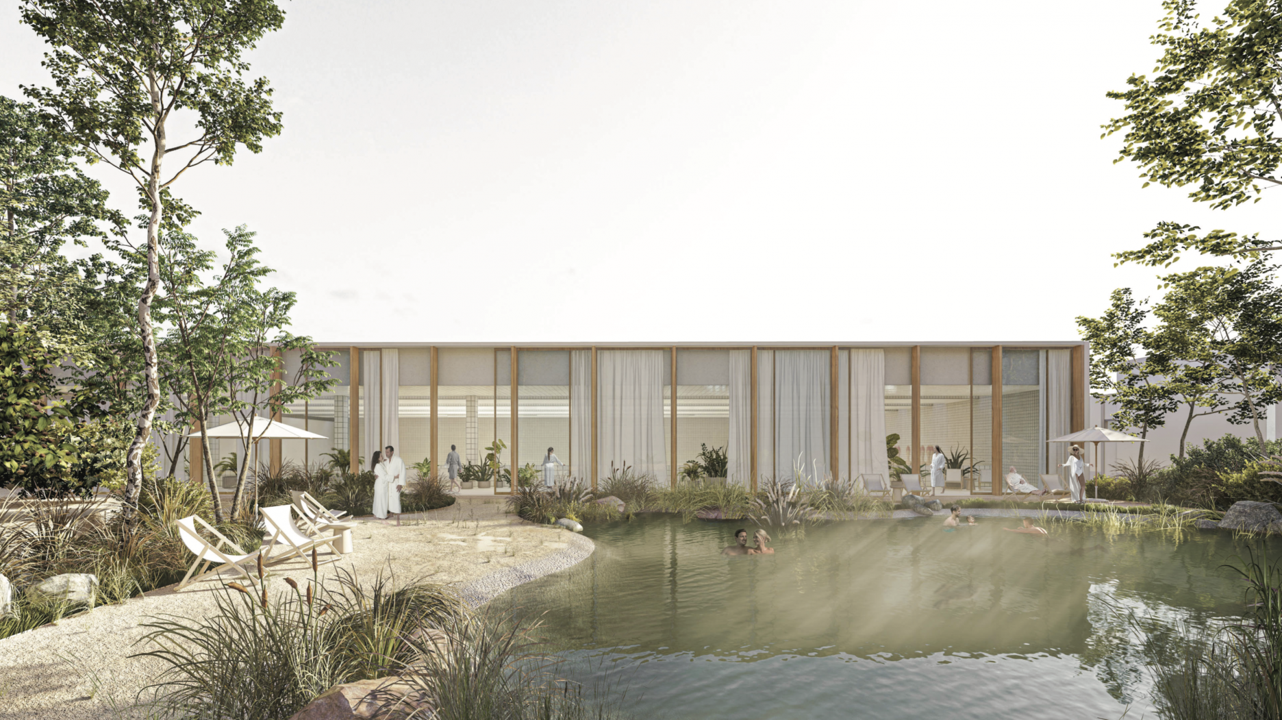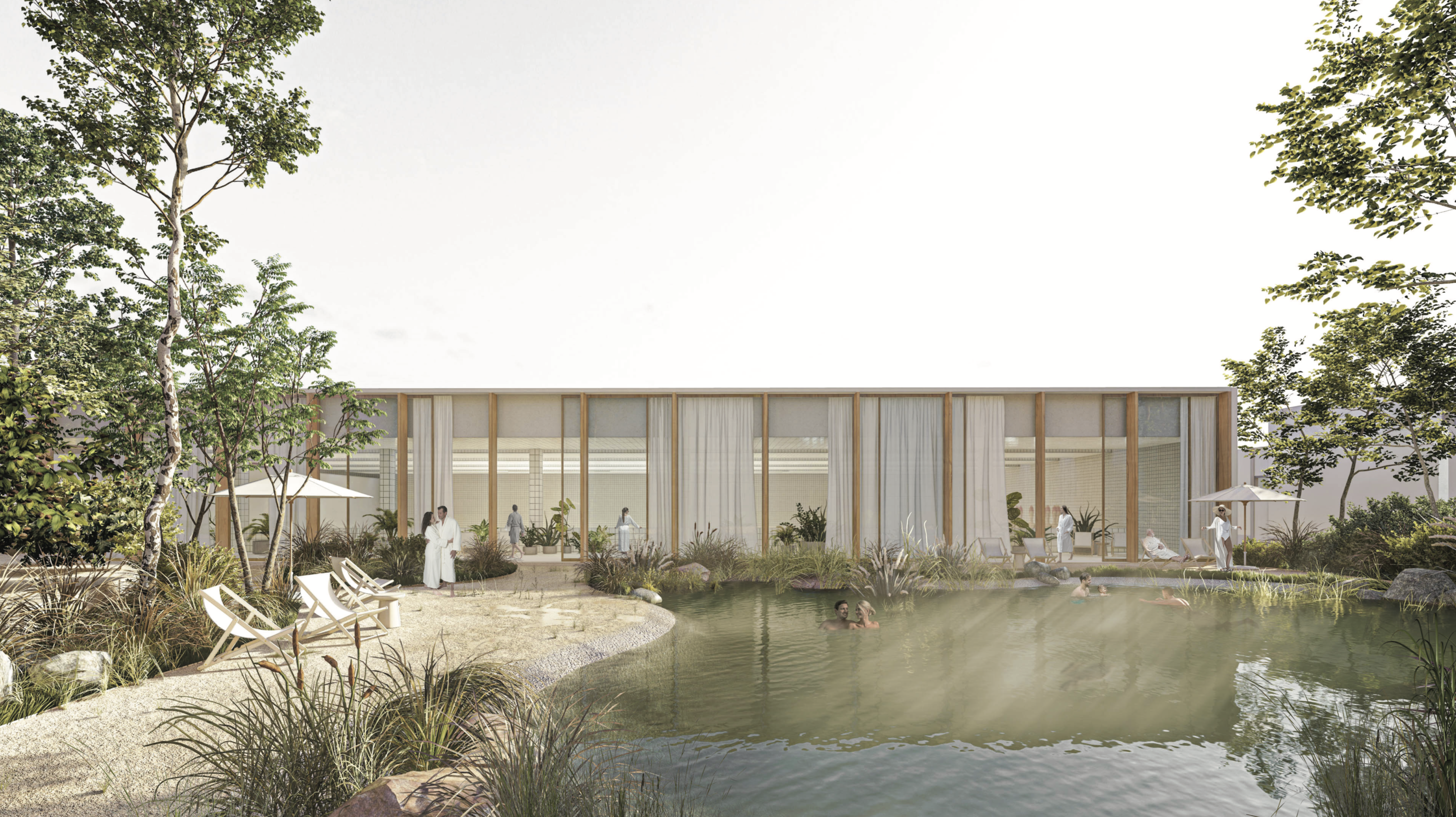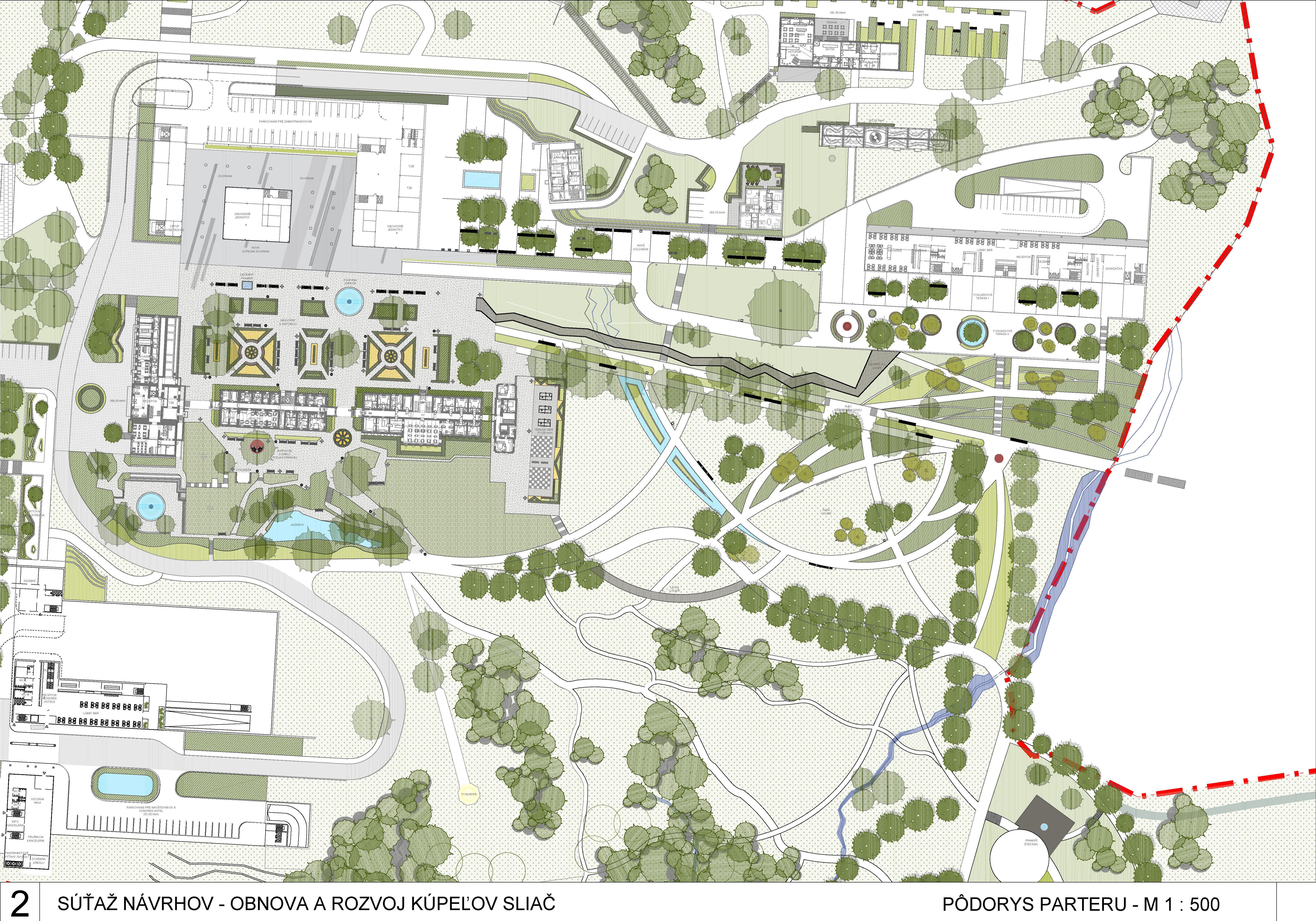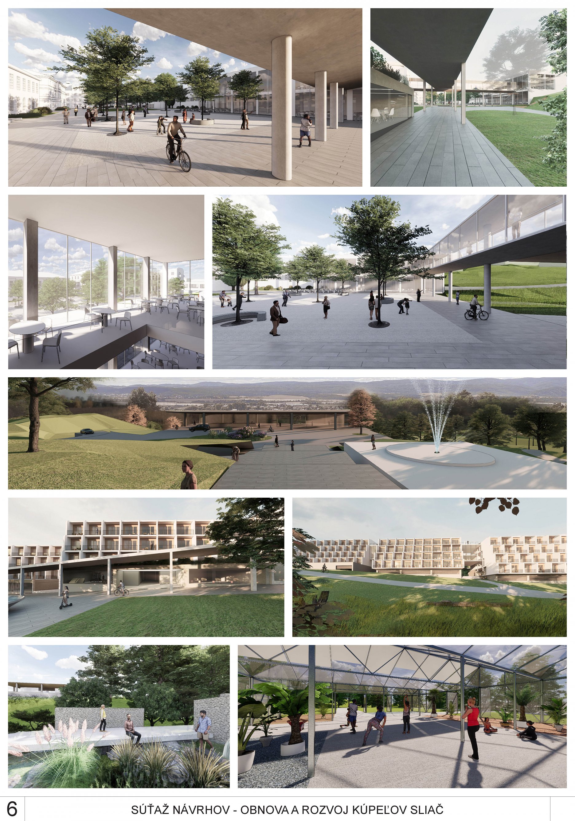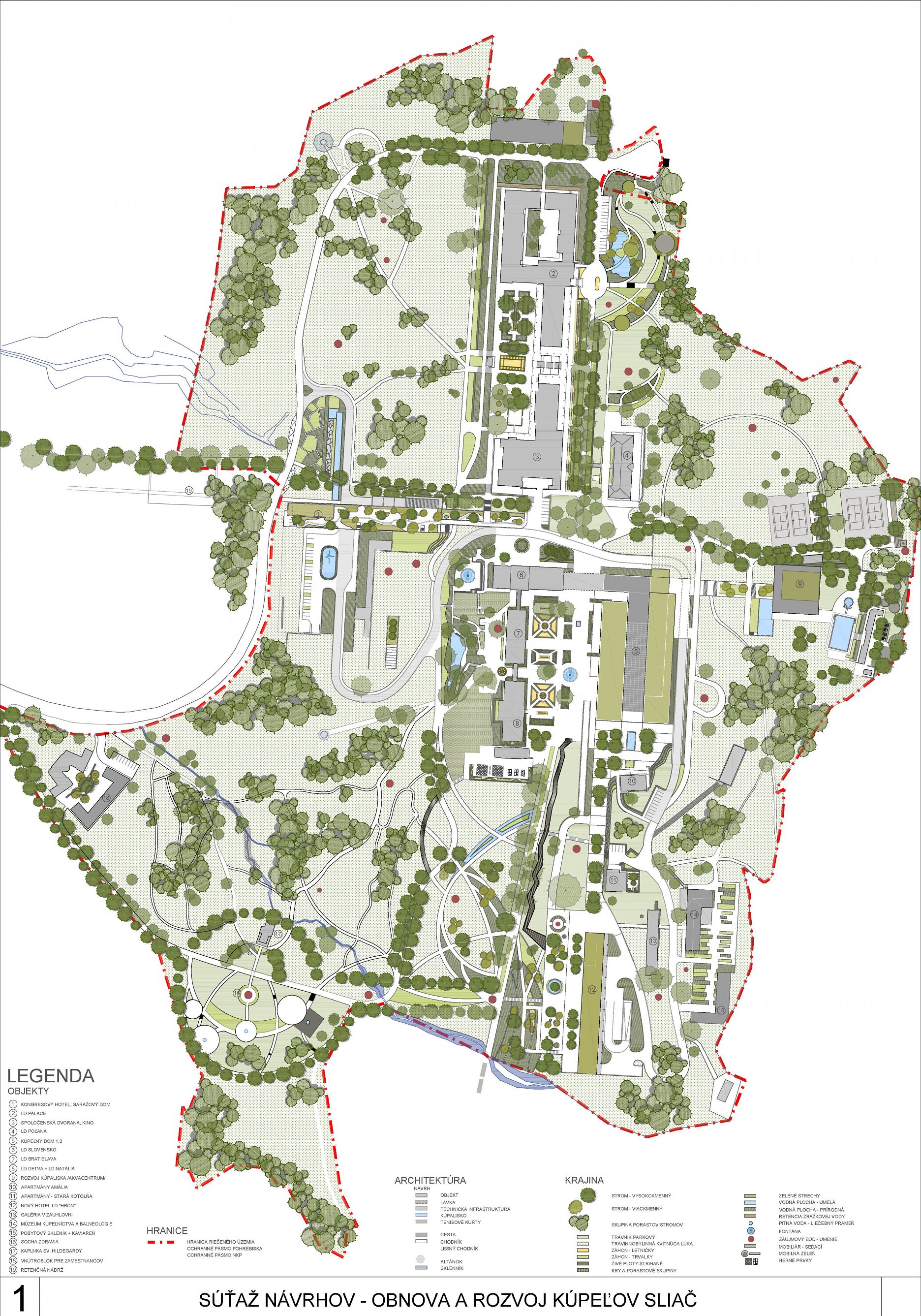 - kvalitné krajinárske riešenie, práca s fenoménom vody (vodné prvky, ochladzovacie jazierka, manažment dažďových vôd) rozširuje a obohacuje charakter územia a dopĺňa ho o nové biotopy. Vodnými a sadovníckymi atrakciami rozvíja a zhodnocuje územie a plynulo ho napája na existujúce spoločenské centrum kúpeľného nádvoria