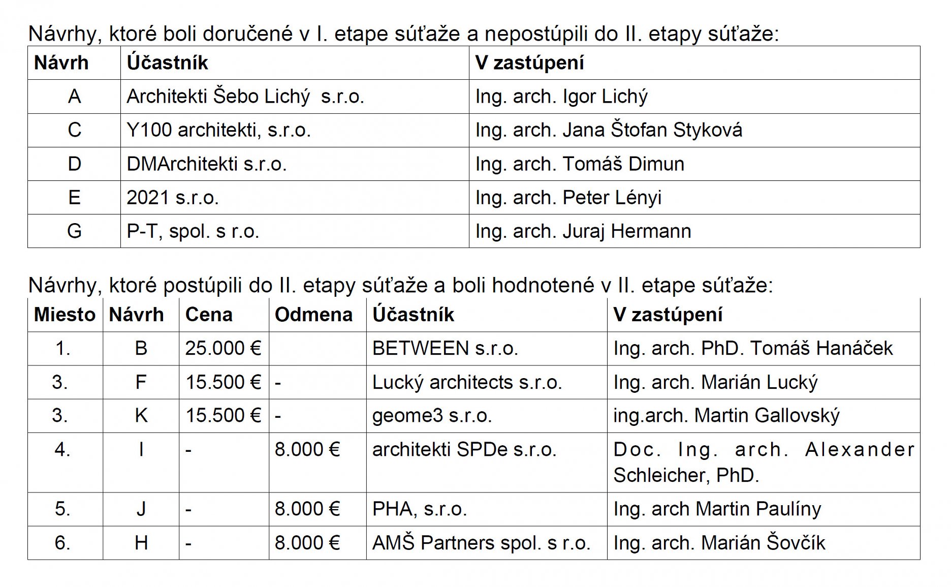 V prvom kole boli tiež doručené a hodnotené návrhy od:
