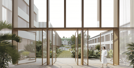 • dobre prepája interiér s exteriérom, navrhuje doplnenie verejného priestoru „kúpeľného námestia“ a vytvorením nového komplementárneho intímneho priestoru medzi kúpeľnými domami