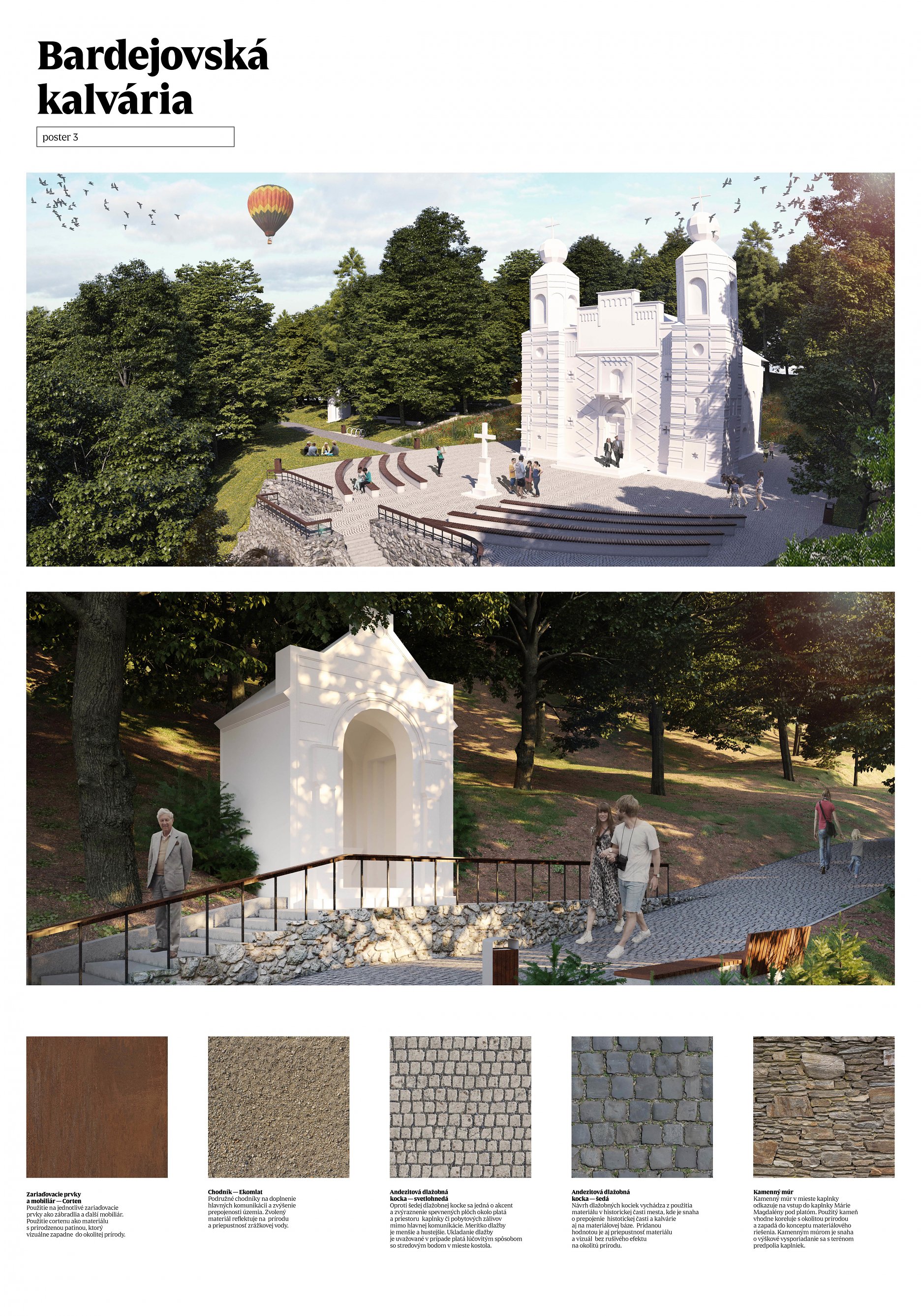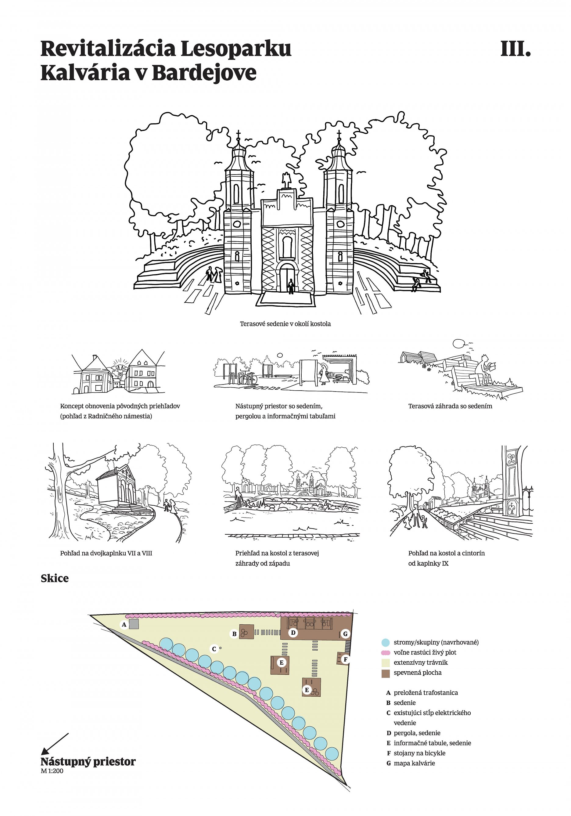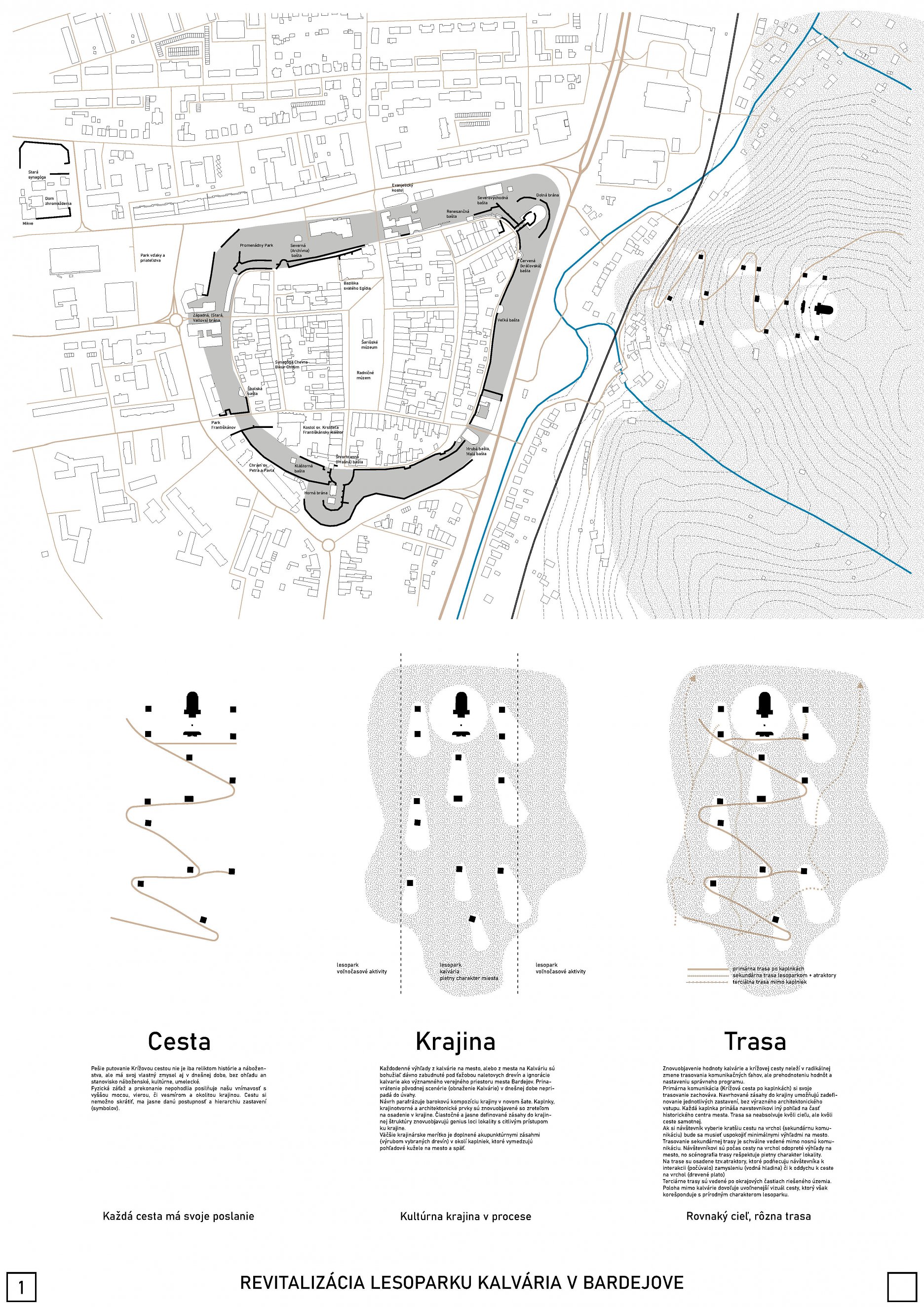 Návrh jasne štrukturuje jednotlivé nosné témy daného architektonického riešenia. Hlavnou kostrou je pôvodná krížová cesta, ktorej dominanty v podobe štrnástich kaplniek sú artikulované primeraným očistením od náletovej vegetácie sledujúc definované výhľadové kužele, zabezpečujúce vizuálny kontakt s historickým jadrom mesta. Bezprostredné okolie kaplniek je riešené citlivo, s rešpektom k pôvodnej architektonickej substancii. Pomyselným vrcholom cesty so štrnástimi zastaveniami je ústredný priestor predpolia Kostola sv. Kríža. Navrhované „plató" je koncipované ako abstraktný a zároveň civilný verejný priestor s potenciálom reflektovať spoločenské potreby spojené s pietnym charakterom tohto miesta. Zdanlivo neviditeľnou vrstvou návrhu sa ukazuje byť sieť komorných architektonických intervencií, podporujúcich sekundárnu profánnu vrstvu lesoparku. Ich formálna redukovanosť, ako aj dôraz na udržateľnosť a ekologické aspekty, spolu s načrtnutou koncepciou možnej etapizácie boli porotou vnímané veľmi pozitívne. Porota odporúča v ďalšom riešení zvážiť možnosti a potenciál pešieho napojenia na historické centrum, ako aj jasnejšie dopovedať a zadefinovať trasu posledných zastavení krížovej cesty.