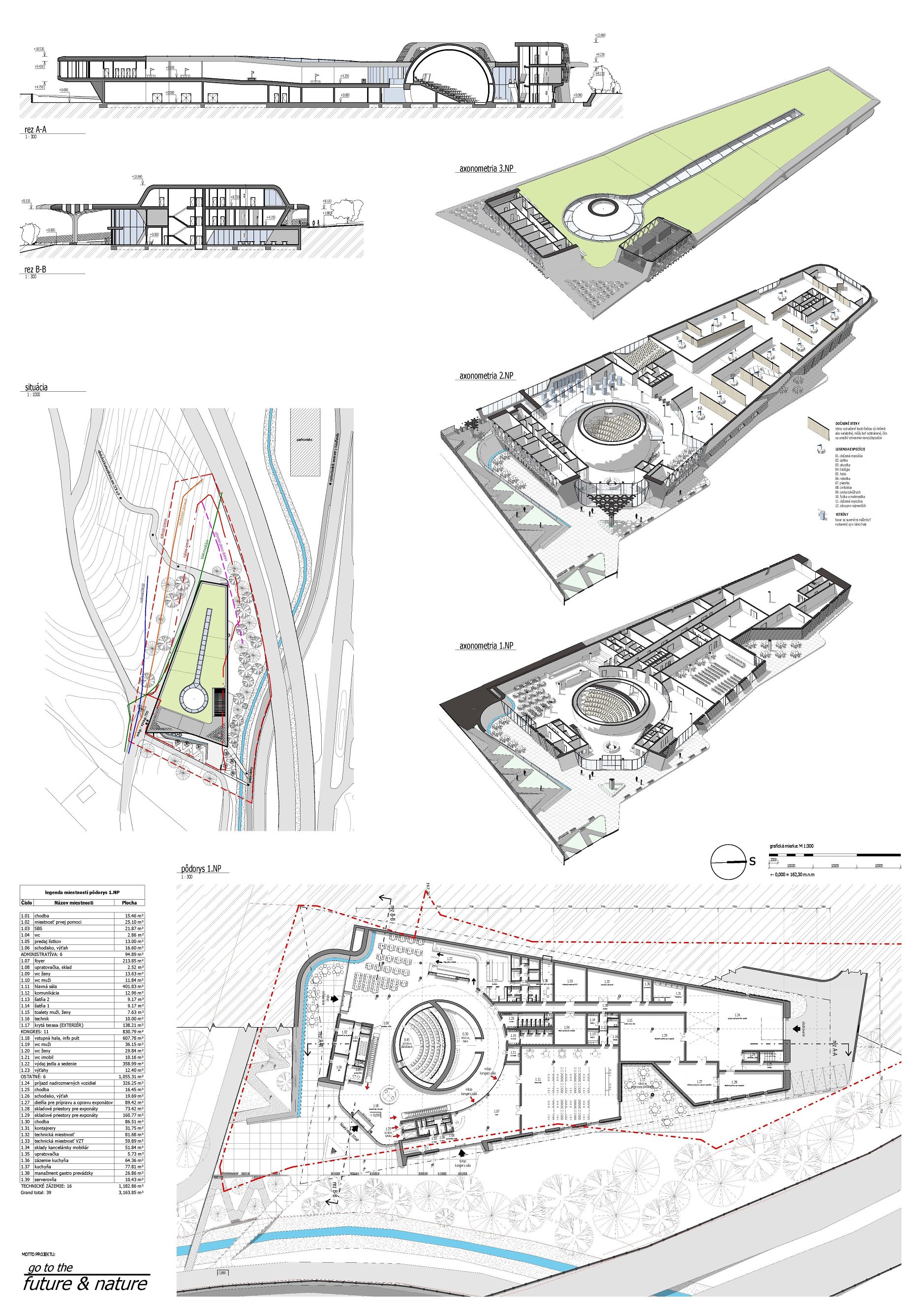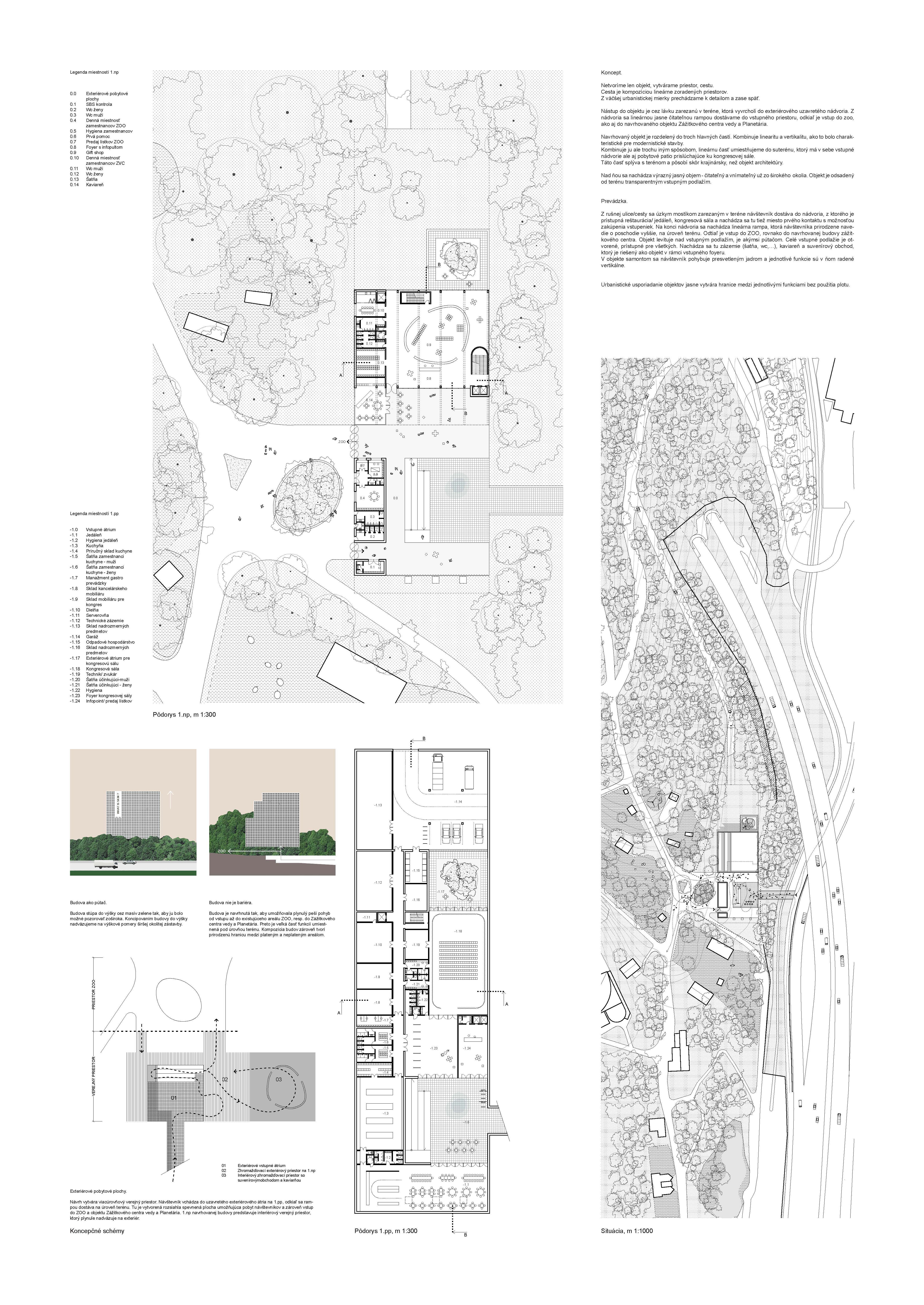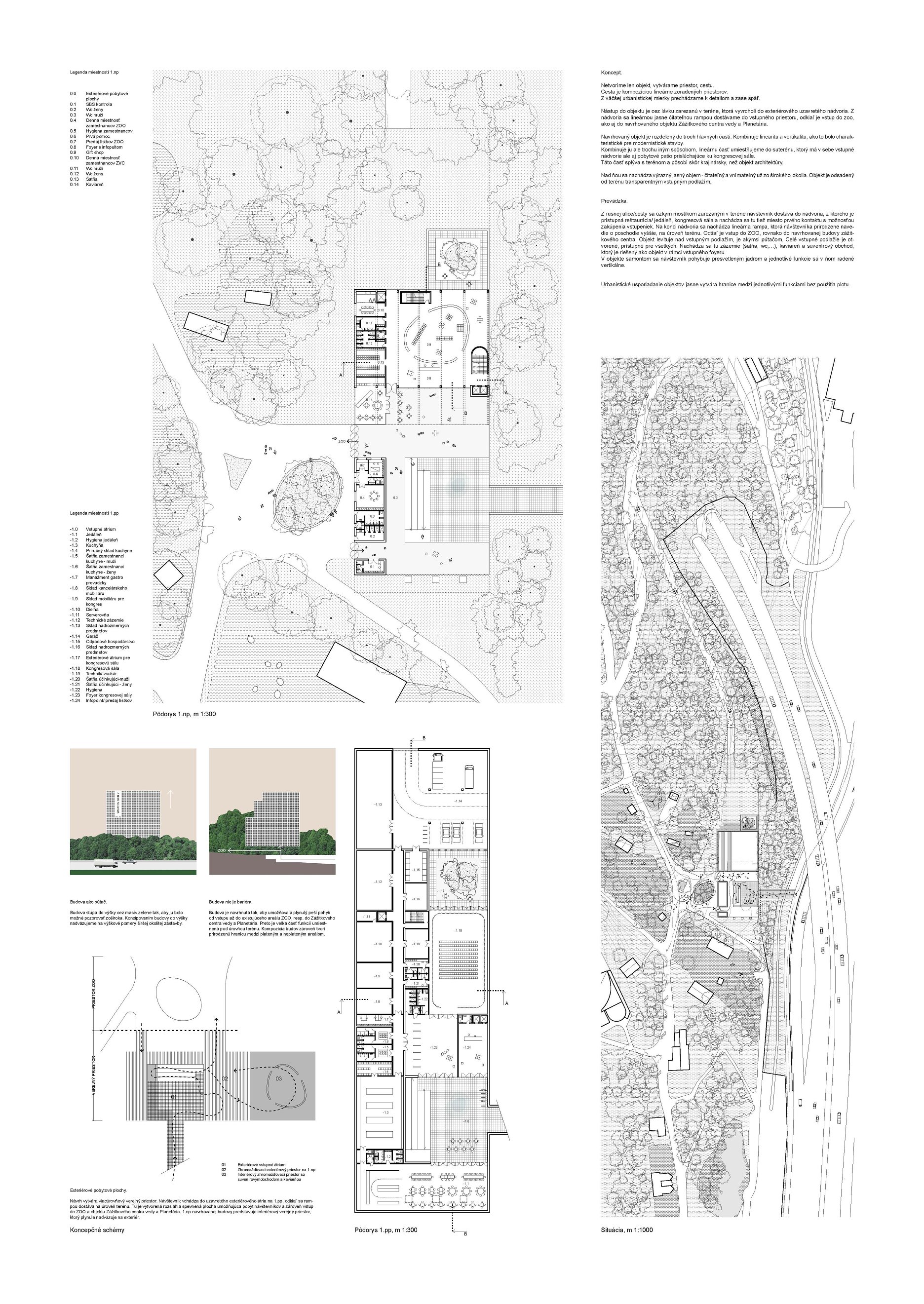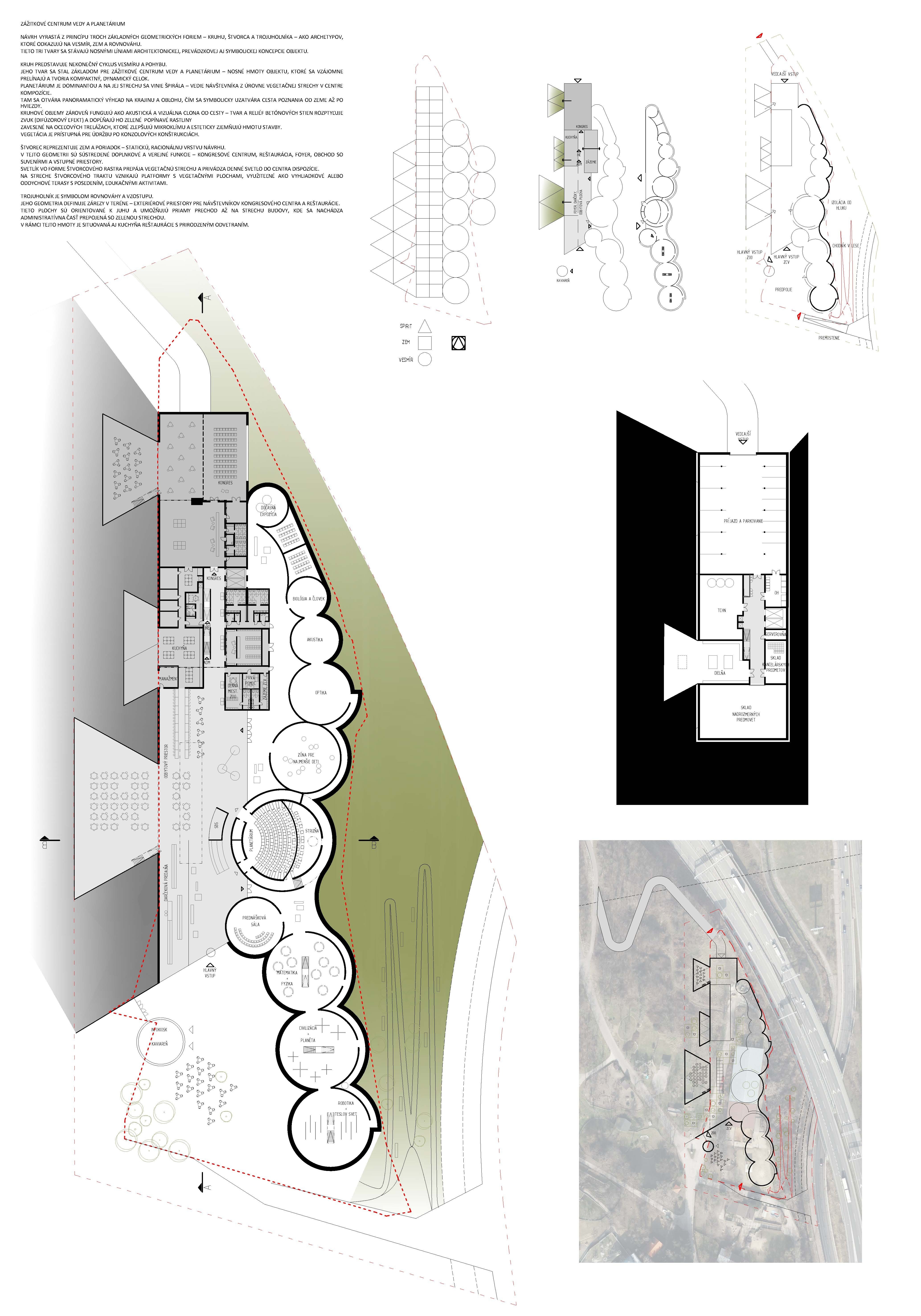 Porota pri predloženom návrhu ocenila celkový koncept, ktorý sa pretavil aj do návrhu zhromažďovacích plôch v okolí objektu. Vstup do územia je umiestnený vo vhodnom bode z pohľadu vzdialenosti od parkoviska. Dve úrovne nástupu pre návštevníkov ponúkajú bezkonfliktnú prevádzku pre kongresovú časť a ZCV, pričom sa ponúka aj možnosť oddeleného využitia planetária a prednáškových priestorov. Dispozícia je teda jednoznačná, administratívny blok je príjemne rozdelený na časť lektorov k učebniam a ostatných zamestnancov, vhodne sa javí aj vonkajšie riešenie zásobovania. Výnimkou je zásobovanie a prevádzka kuchyne s komplikovaným prístupom cez úzku chodbu.