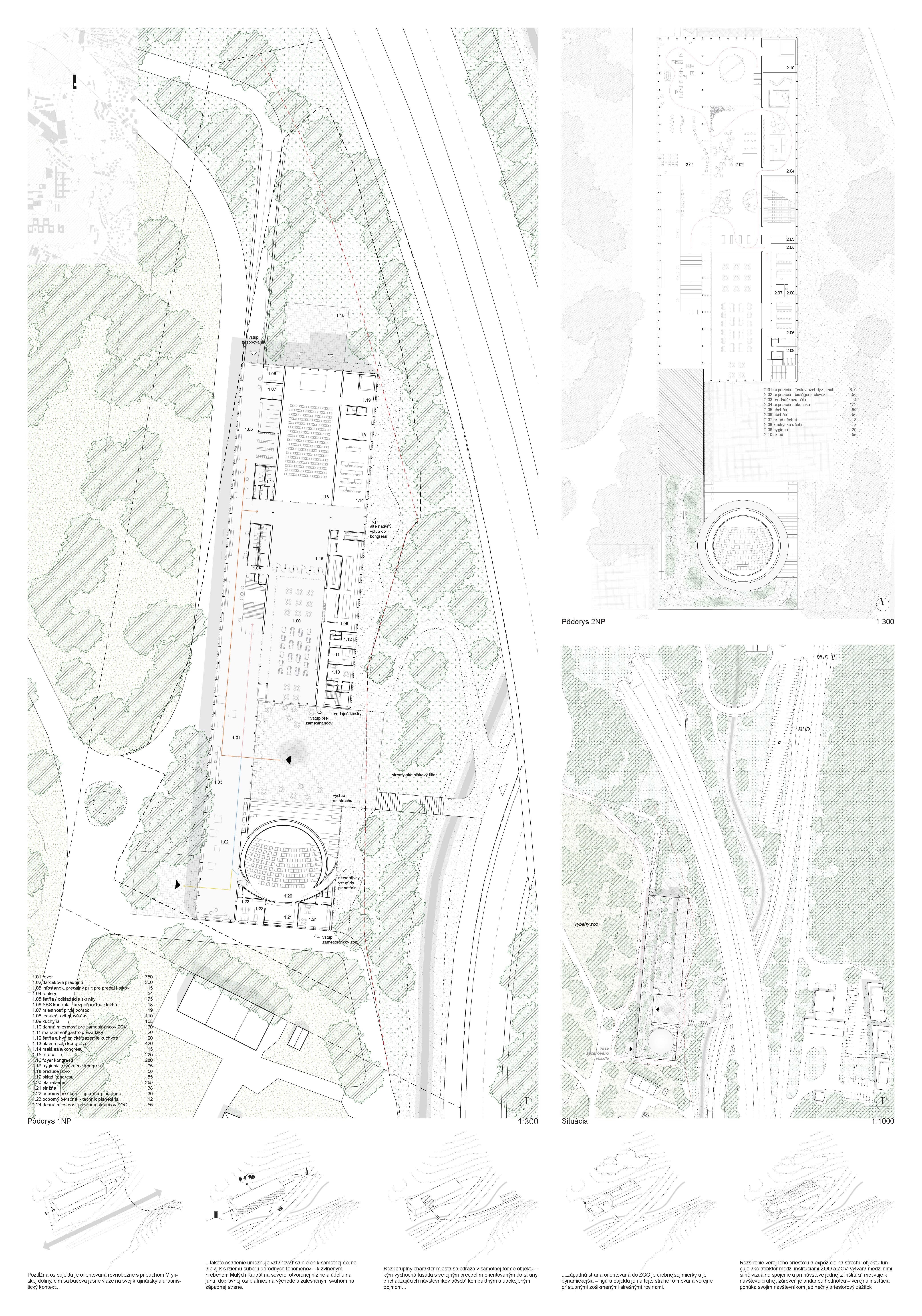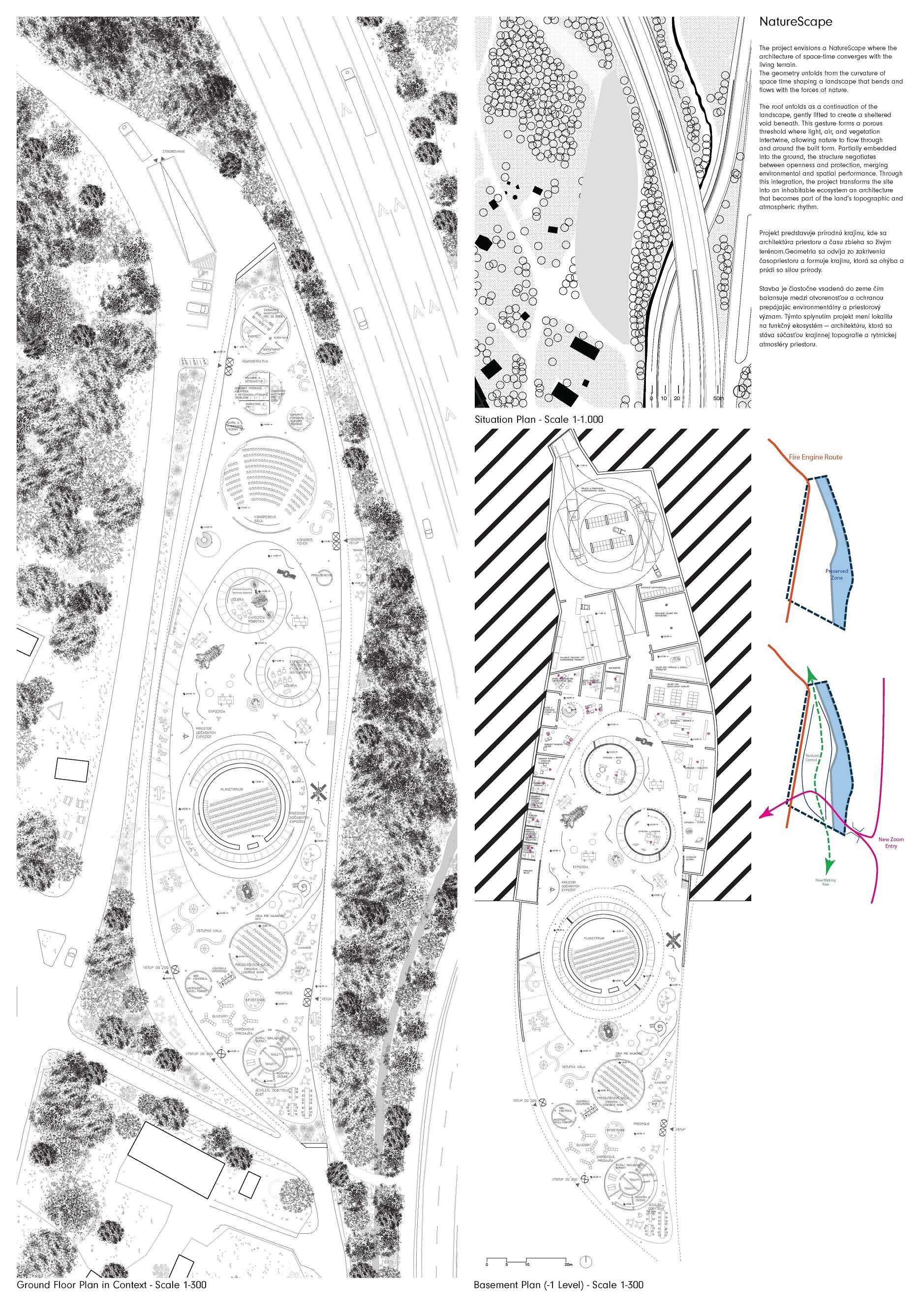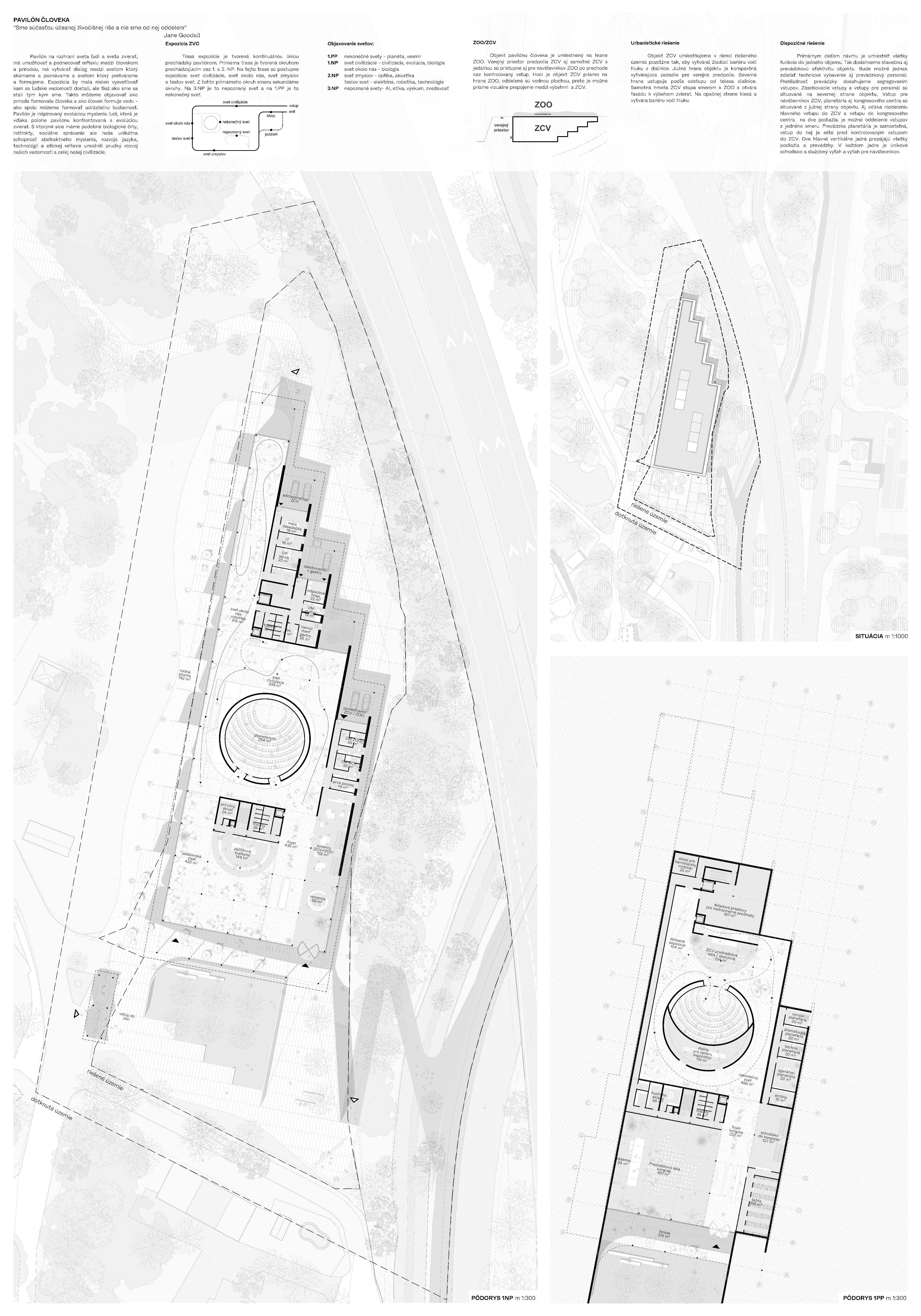 Návrh predstavuje jednoznačné urbanistické gesto, ktorého orientáciu potvrdzuje aj vzťah ku svetovým stranám. Lapidárna obdĺžniková pôdorysná stopa doplnená o kruh vytvára ikonický a ľahko zapamätateľný obraz. Parter domu živo komunikuje na všetky strany, čo je všeobecne správne, no v tomto prípade vzniká otázka, či je táto stratégia vhodná na danom mieste, ktoré je skôr hranicou než voľným priestorom. Klesajúci terén, ktorý akoby pretekal zo ZOO voľne cez dom a končil pri akustických stenách diaľnice, je obrazom, ktorý nie je vhodné tematizovať. Prekvapivé je tiež vedenie prístupového chodníka dlhou cestou okolo domu, čo je v úplnom rozpore s gravitačnou príťažlivosťou planetária. To by pre prichádzajúcich návštevníkov mohlo pôsobiť ako malý zázrak, ktorý treba bezodkladne preskúmať.