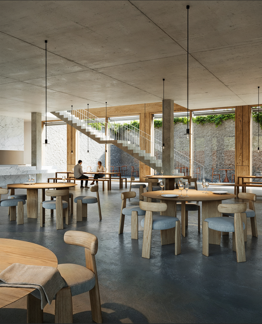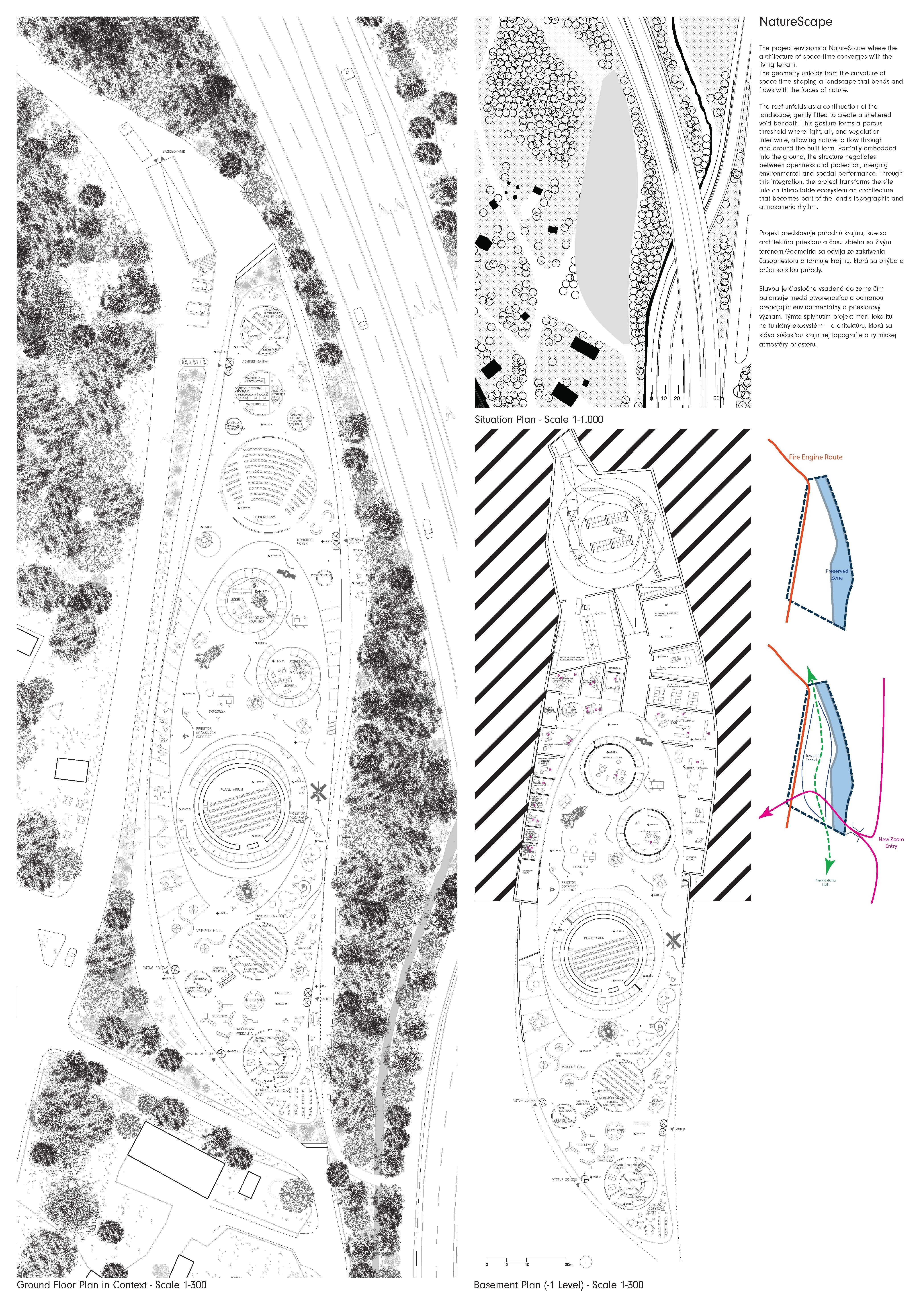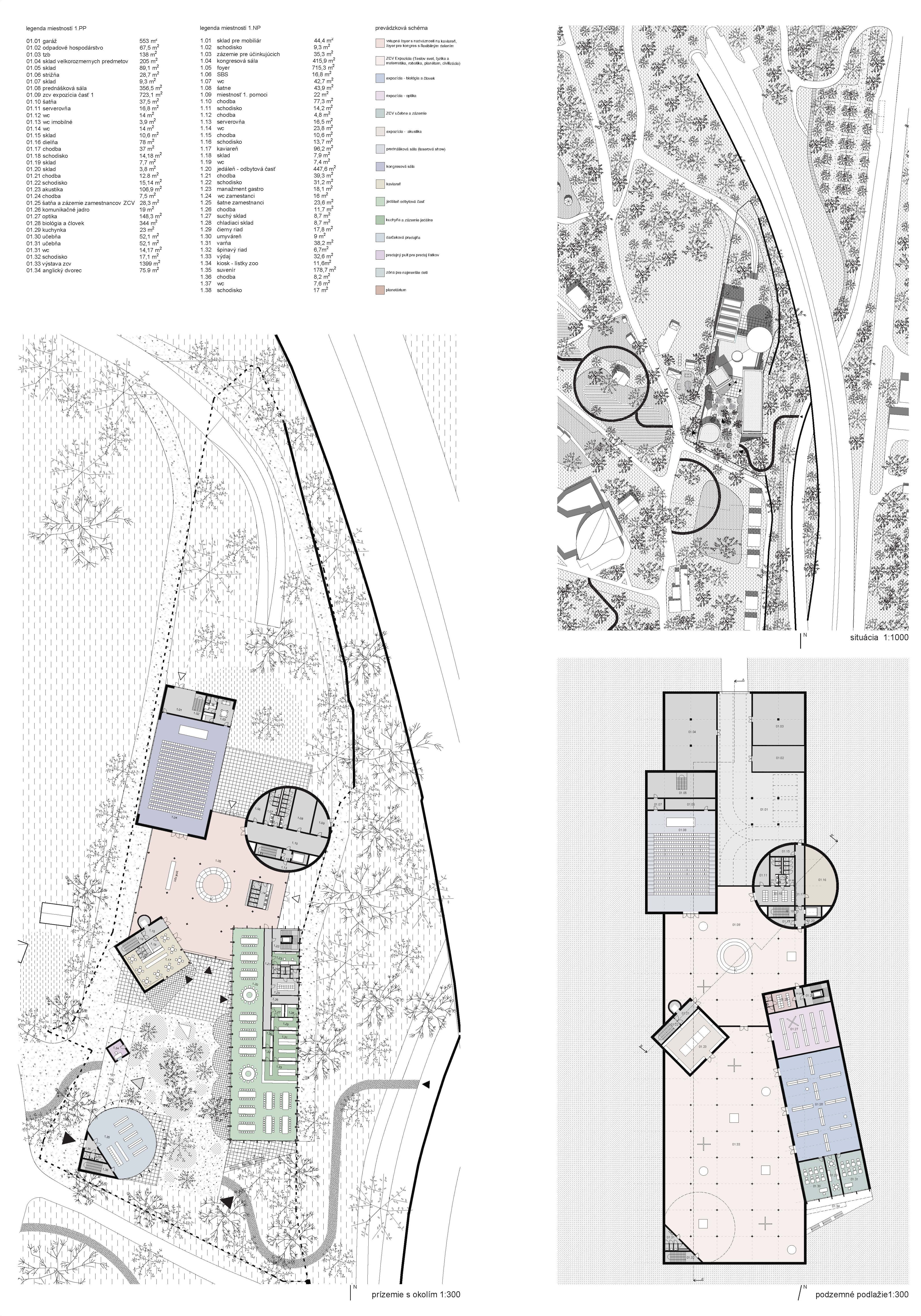Autori návrhu vizuálne jednoduchým spôsobom spracovali limity osadenia a topografie do funkčného celku, ktorý sa do prostredia premieta svojou nehmotnosťou a racionálnym prístupom. Zo strany hlučnej cesty je objekt napojený vstupným tunelom, ktorý zároveň slúži ako prekrytý nástup do častí stavby, ale aj ako vnemové prekročenie hrany medzi vonkajším a vnútorným svetom – svetom hluku a chráneným prostredím svahu zoologickej záhrady. Od frekventovanej cesty je jeho (ne)vizibilita podporená terénnym násypom a objekt sa vynára len ako jednopodlažná, horizontálna linka utopená v zeleni. Z opačnej strany sa stavba otvára do protiľahlého svahu dvoma plnými podlažiami a prehĺbeným spodným dvorom (akýmsi sunken court), s možnosťou spojenia ďalšieho spodného podlažia s exteriérom. Miesto je ako stvorené na chránenú vonkajšiu expozíciu. K prospechu riešenia by bolo vhodné zamyslieť sa nad spojením tichého exteriéru s časťou reštaurácie.