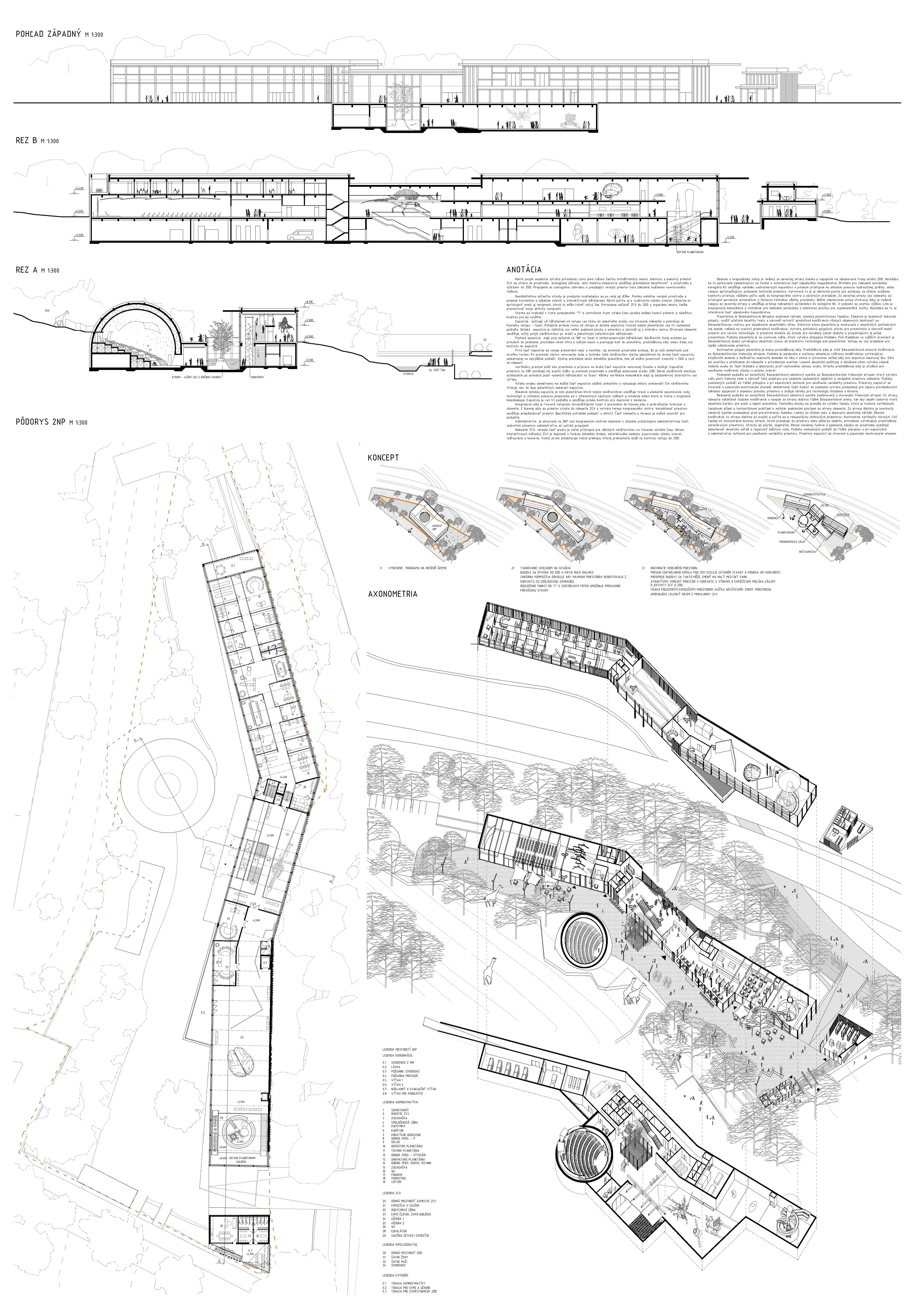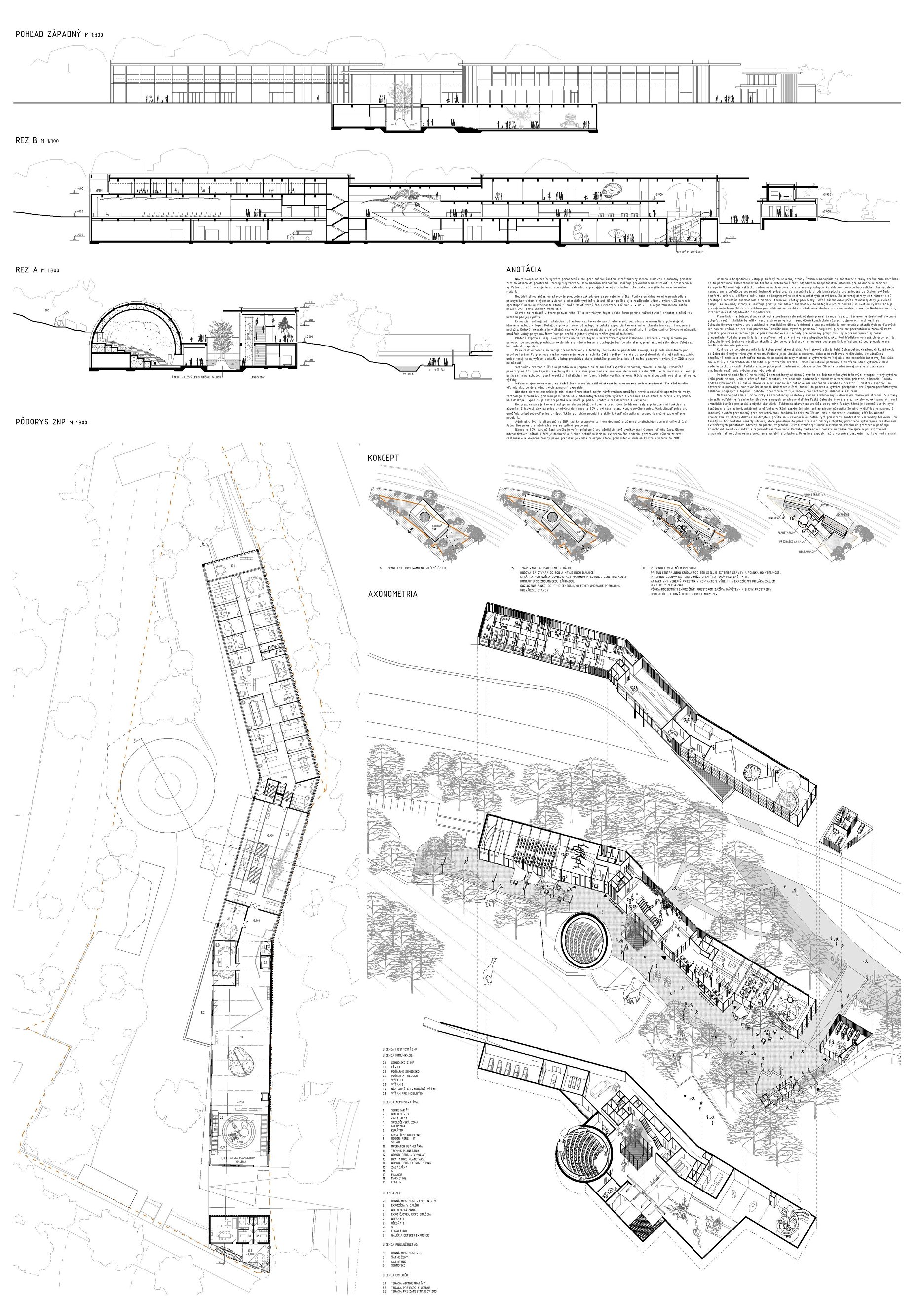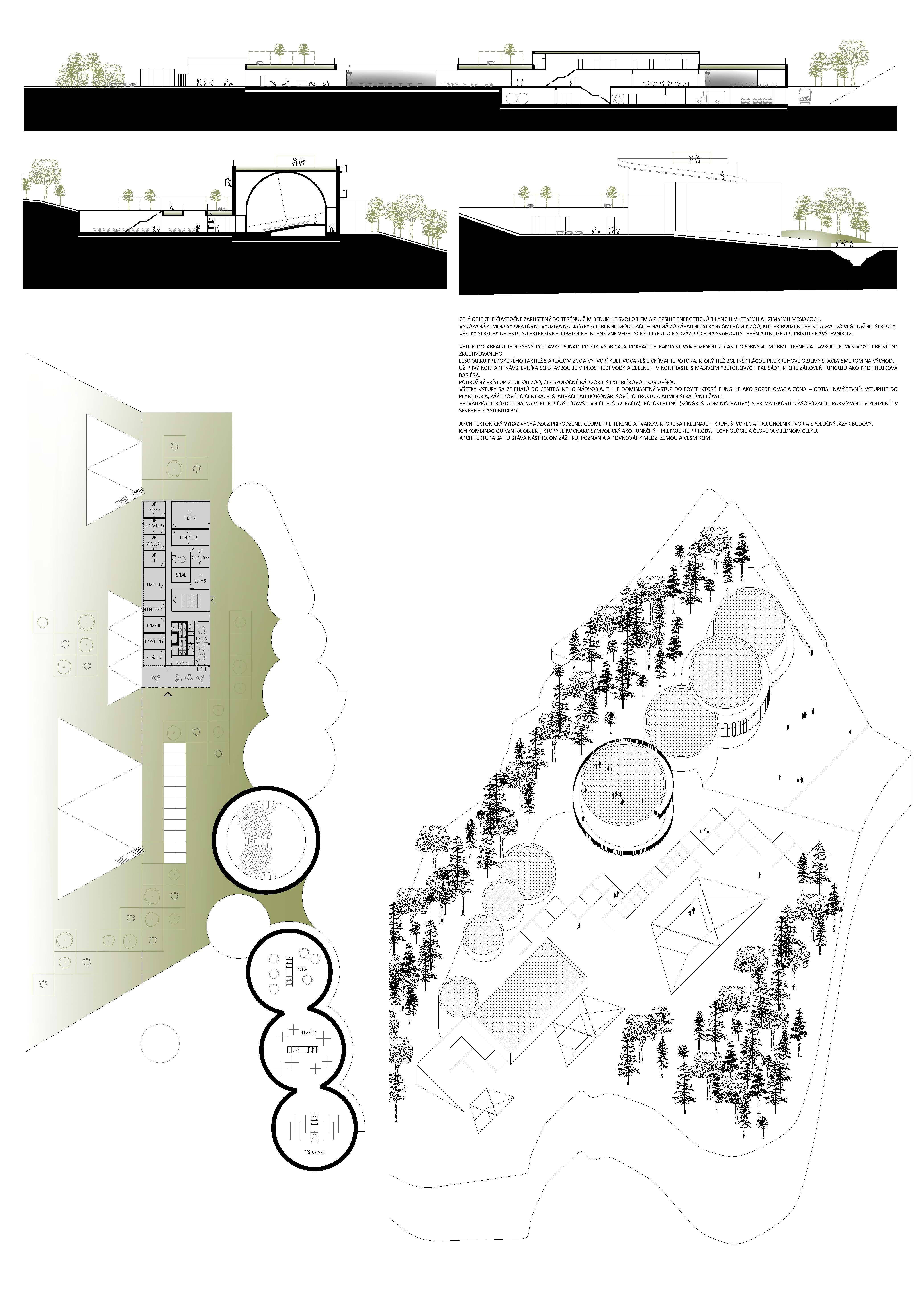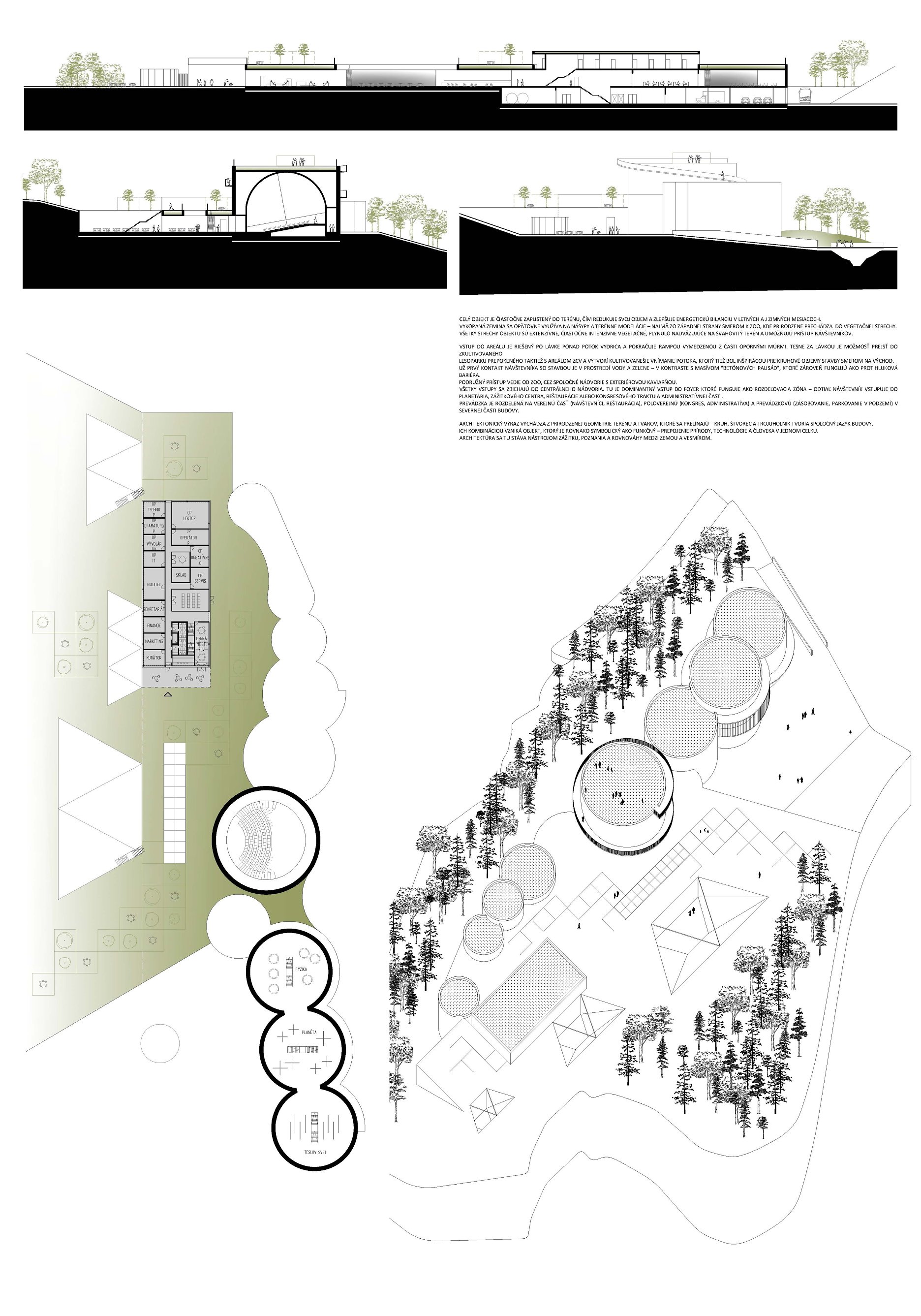 Objekt minimalizuje pôdorysnú stopu v území a tým zachováva existujúce zelené plochy a ich vhodne dopĺňa novými. Kompaktná hmota, vyčnievajúca nad koruny stromov pôsobí ako pozitívny pútač na zážitkové centrum pre svoje okolie.