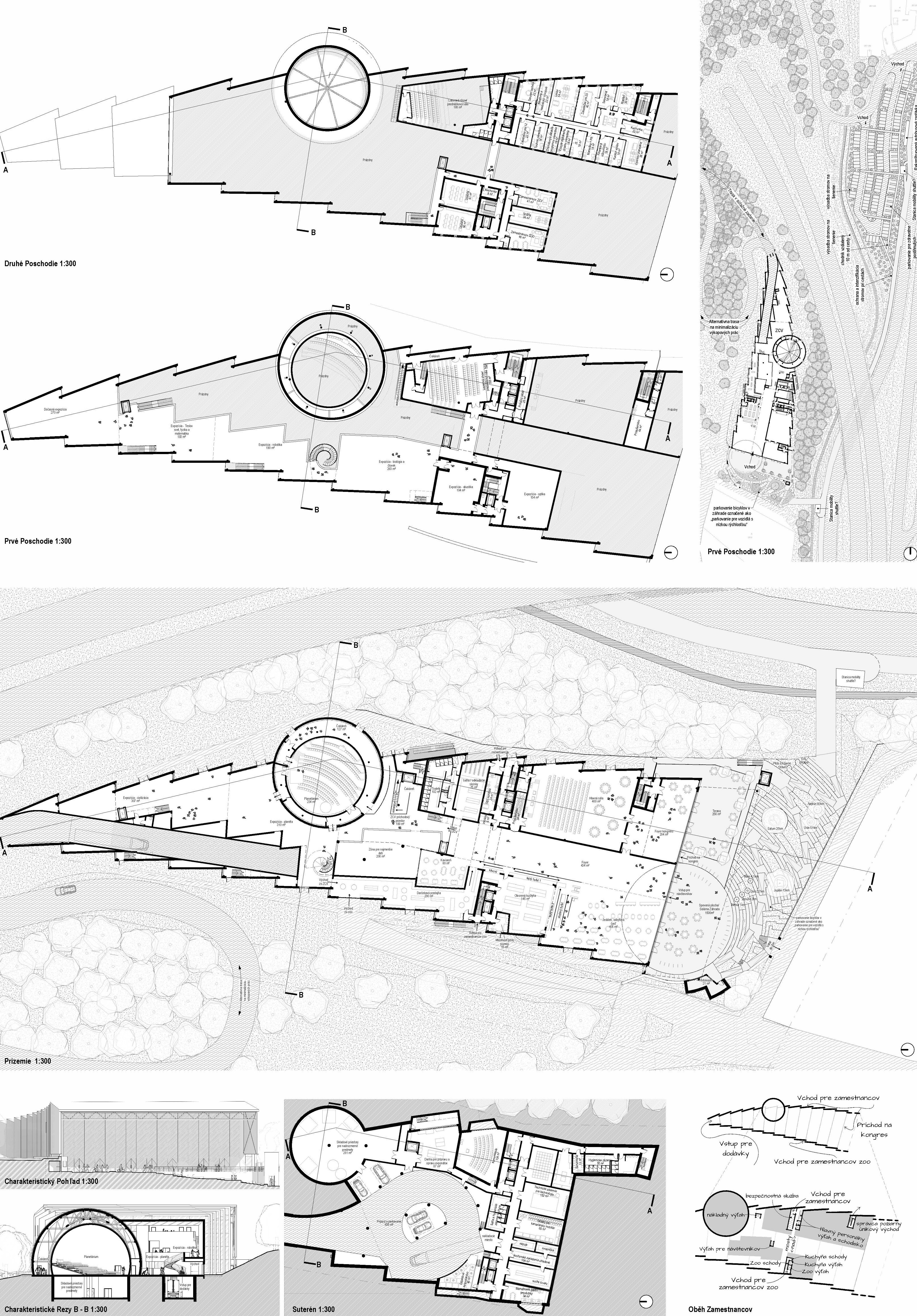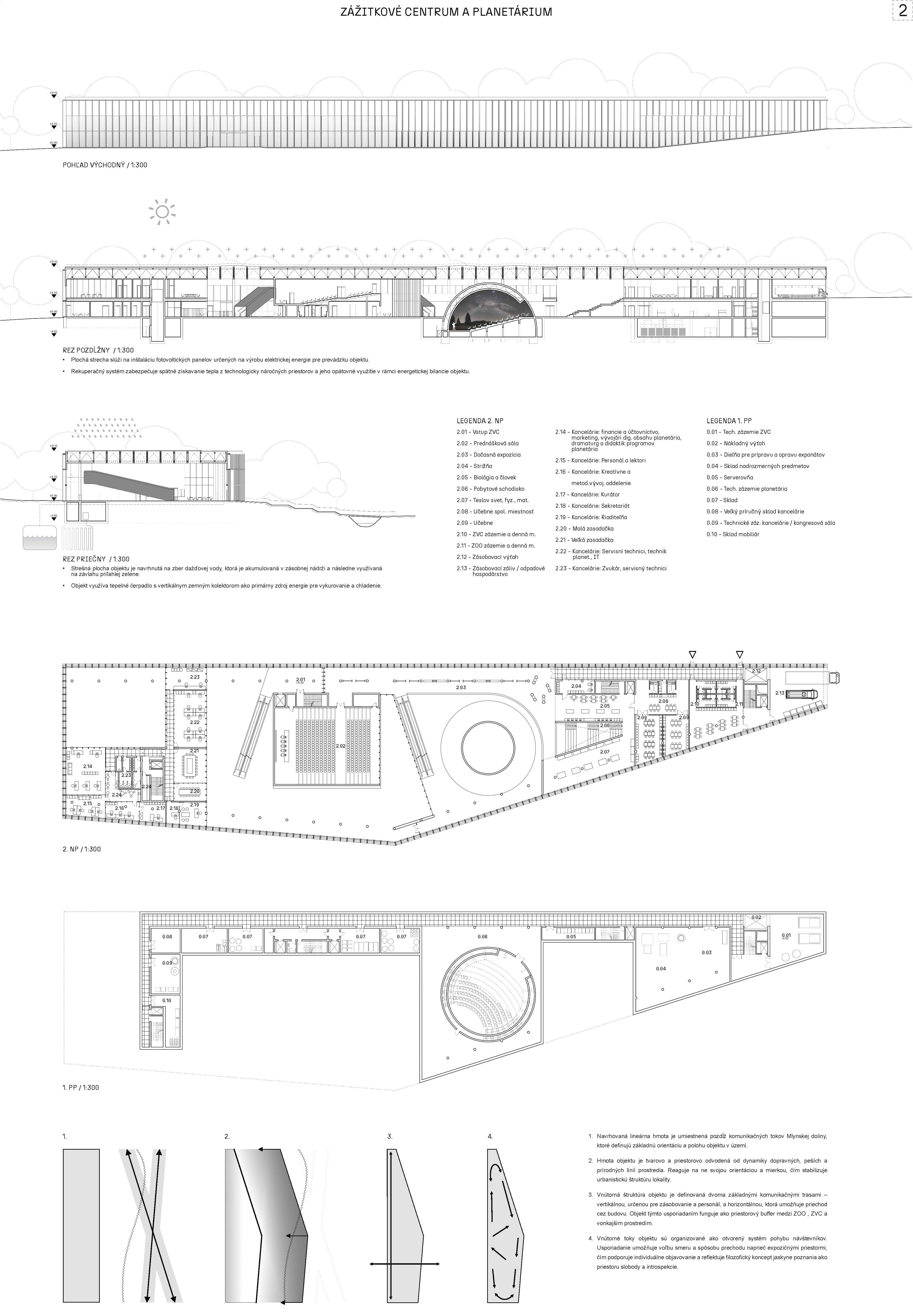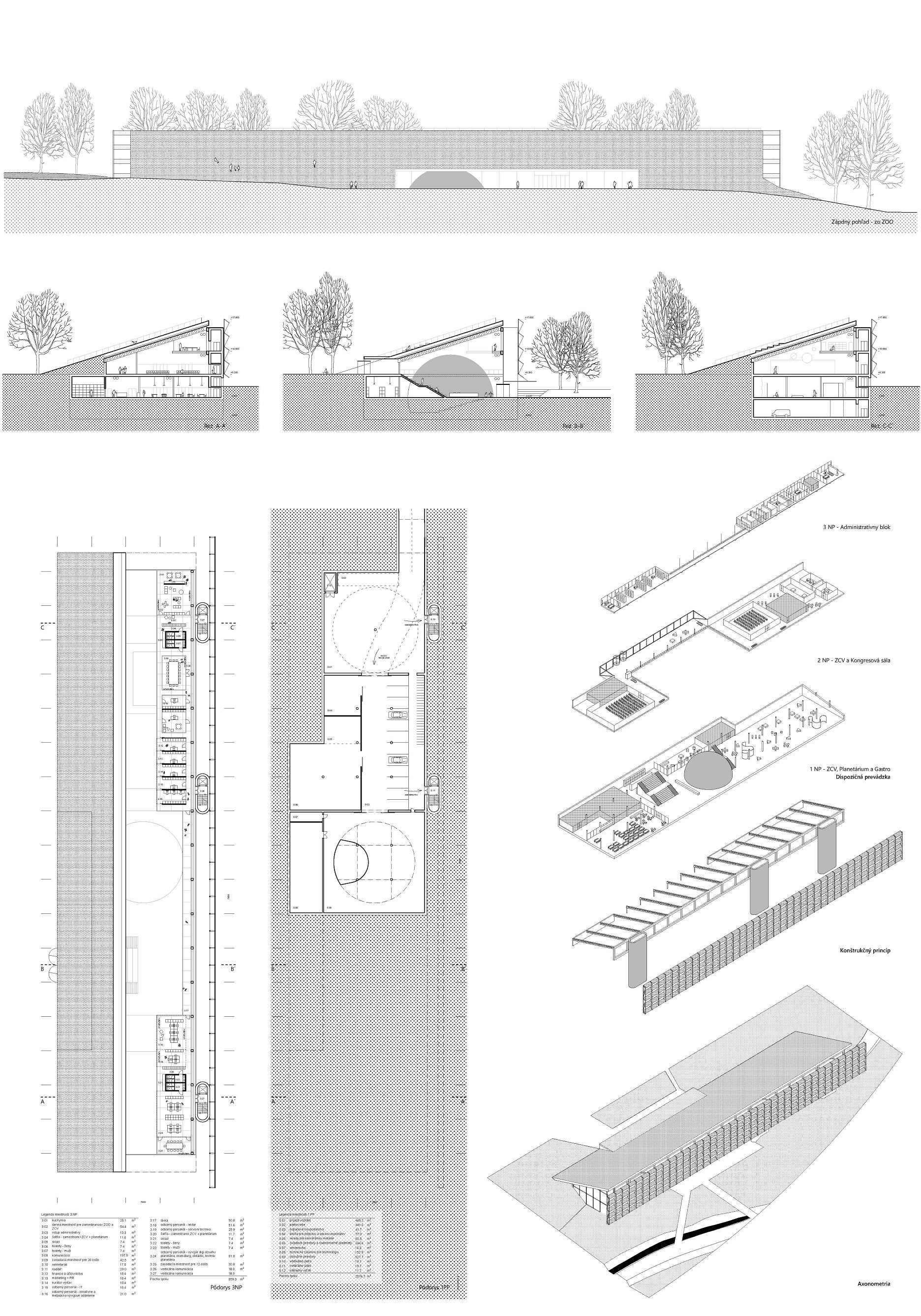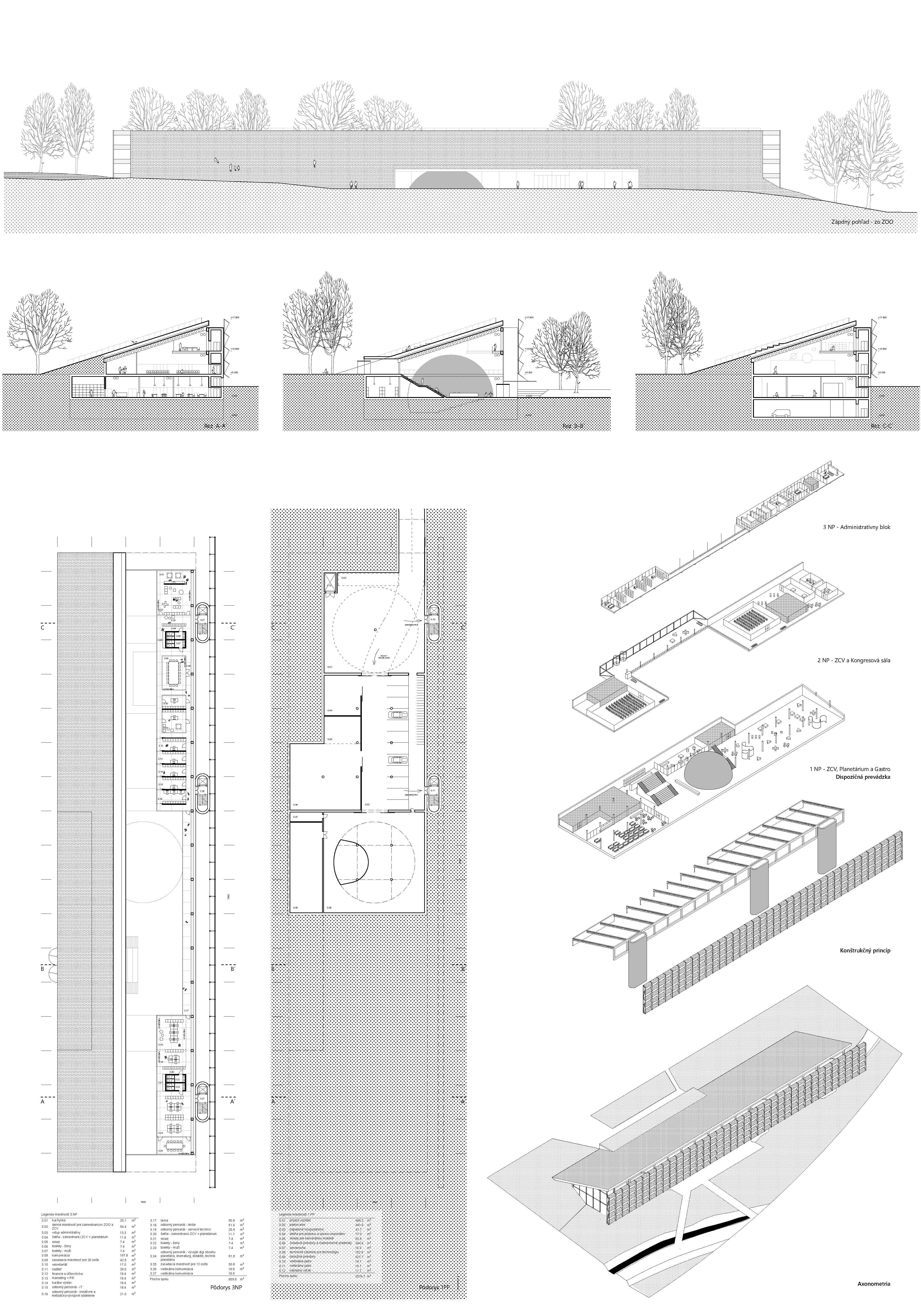 Vnútorné členenie je logické, prehľadné a zodpovedá rozsahu zadania. Jednotlivé funkčné celky sú čitateľne oddelené a zároveň ponúkajú možnosti prepojenia expozícií, kongresovej časti a planetária. Porota pozitívne hodnotí oddelenie prevádzky zamestnancov ZCV a ZOO, ako aj prehľadné riešenie zásobovania.