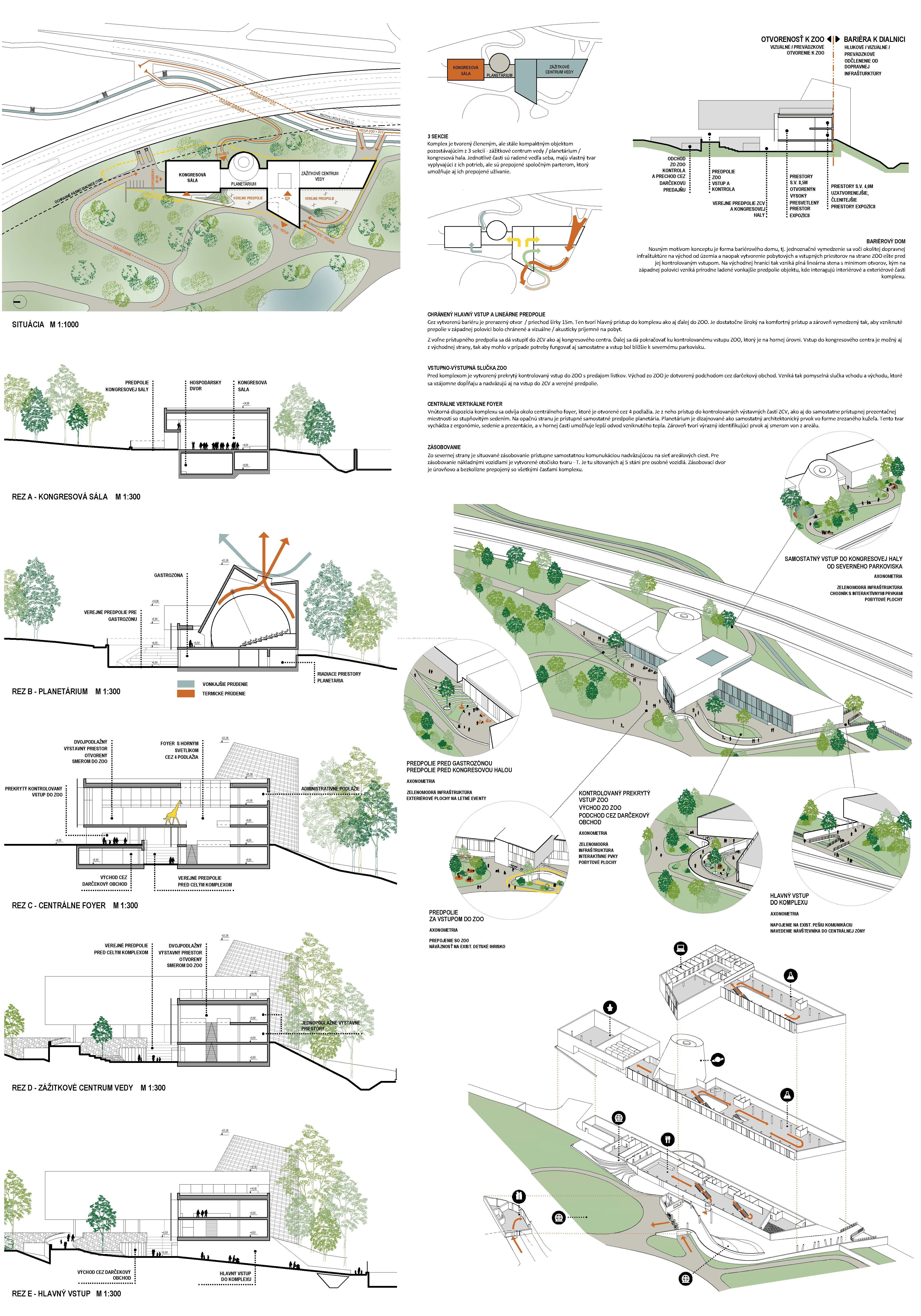 Návrh pracuje s mierkou formou členenia funkčných celkov do vzájomne prepojených objemov, ktoré pôsobia ako samostatné hmoty. Táto kompozícia reaguje na pavilónový charakter zoologickej záhrady. Ponúka tak vytváranie hodnotných medzipriestorov, ktoré sú zároveň umne využívané, či už na hlavný vstup, terasy gastro prevádzok alebo predpolie zo strany záhrady.
