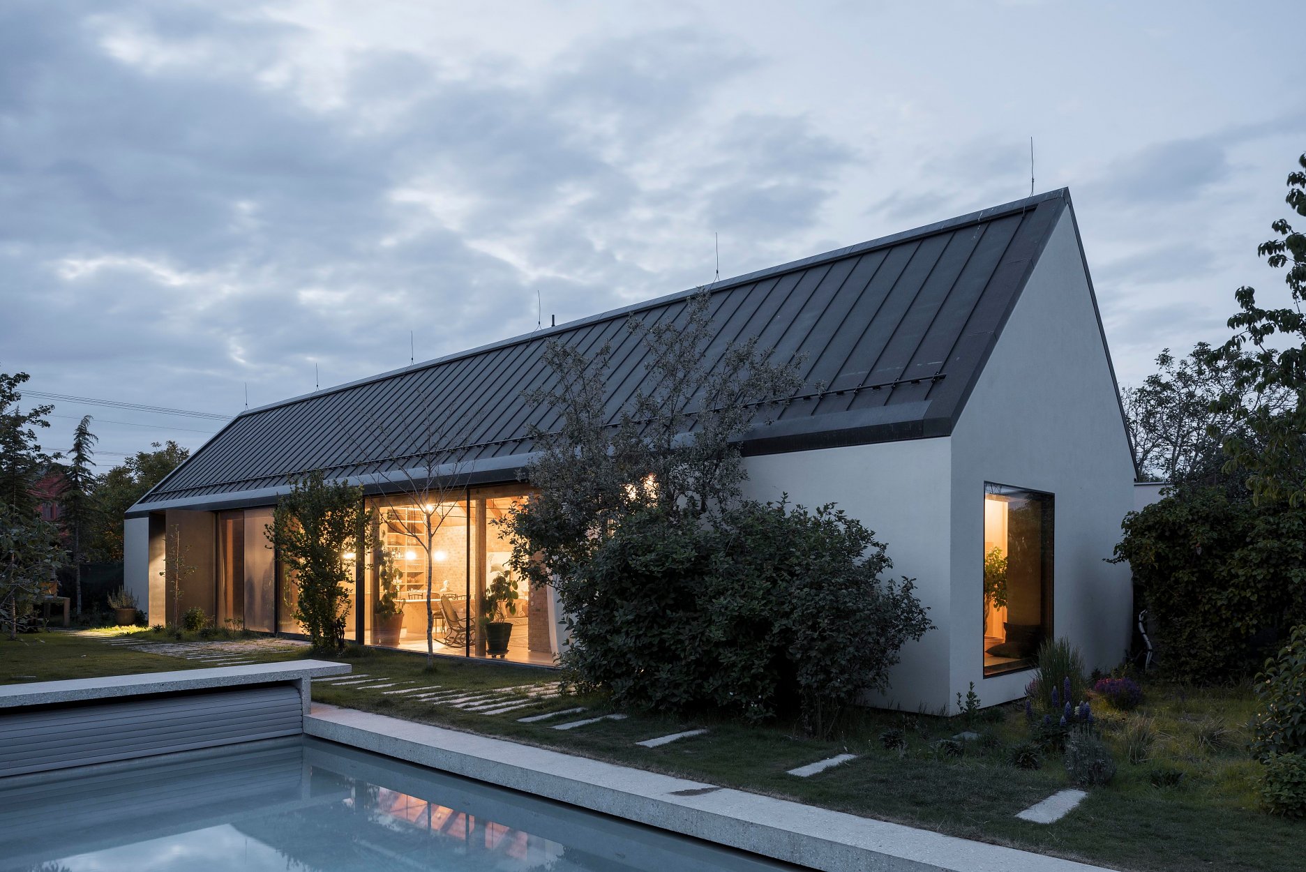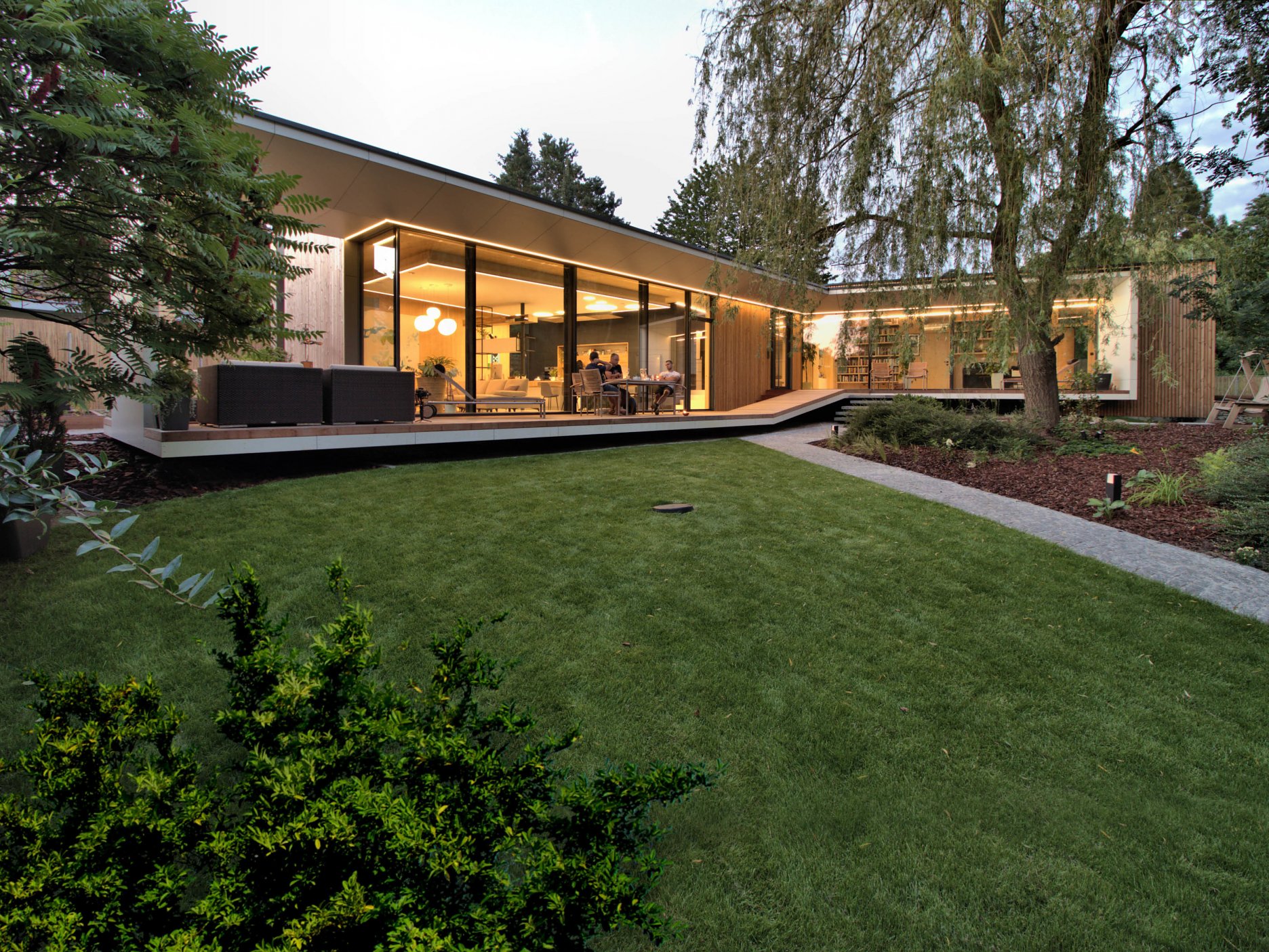 Výraznou kvalitou domu je spôsob, akým sa prelína zo záhradou situovanou na dvoch rôznych úrovniach s dvomi rôznymi témami: centrálny priestor s kuchyňou má po ľavej strane záhradu, ktorá upúta svojou až dekoratívnou neformálnosťou. Na druhej strane má záhradu, ktorá svojím predsadením rámcuje výhľad do okolia. Odfiltruje tak nežiadúce výhľady a zároveň vytvára v oddychovej časti s bazénom súkromnú zónu. Celý dom pôsobí priestranne, čo podčiarkuje aj vyvýšený centrálny priestor nad kuchyňou. Kvalita prepojenia domu so zeleňou bude postupom času rásť a symbióza so záhradou bude stále zjavnejšia.