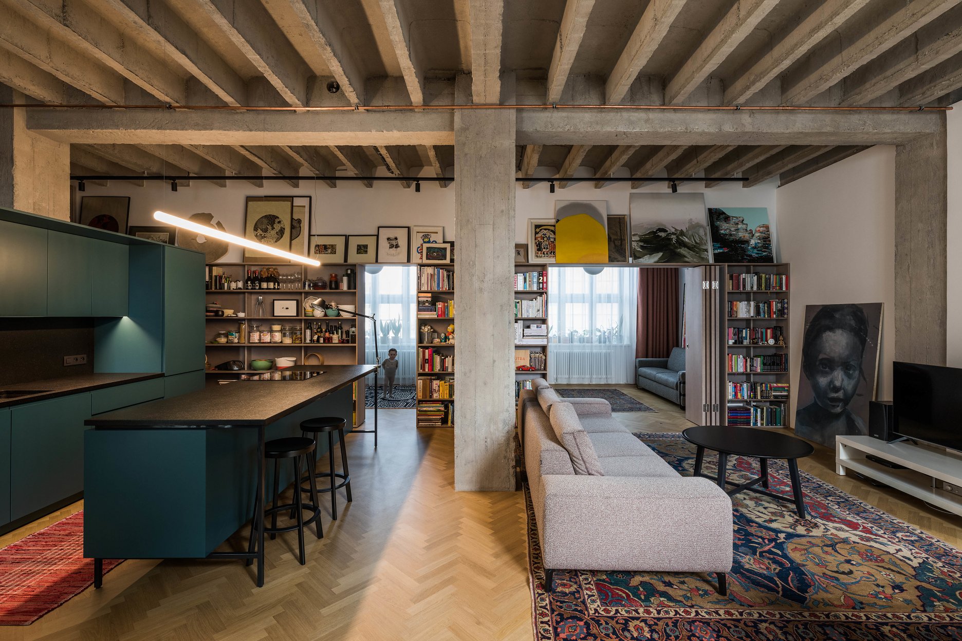 Veľká hodnota tohto bytu spočíva v jeho odvážnom, priam experimentálnom dispozičnom riešení. Priehľadná stena prechádza diagonálne naprieč bytom, čím pôvodný a rozsiahly historický interiér delí na menšie miestnos-ti šité pre potreby mladej rodiny. Toto riešenie však nenarušuje vzdušnosť a veľkorysosť vnútorného priestoru. Porota si všimla mimoriadne pozitívny trend - mladé rodiny stále viac spolupracujú s architektmi aj napriek limitom vlastného rozpočtu. Kombinácia invencie, spolupráce a rešpektu dáva základ pre kvalitné architekto-nické riešenie.
