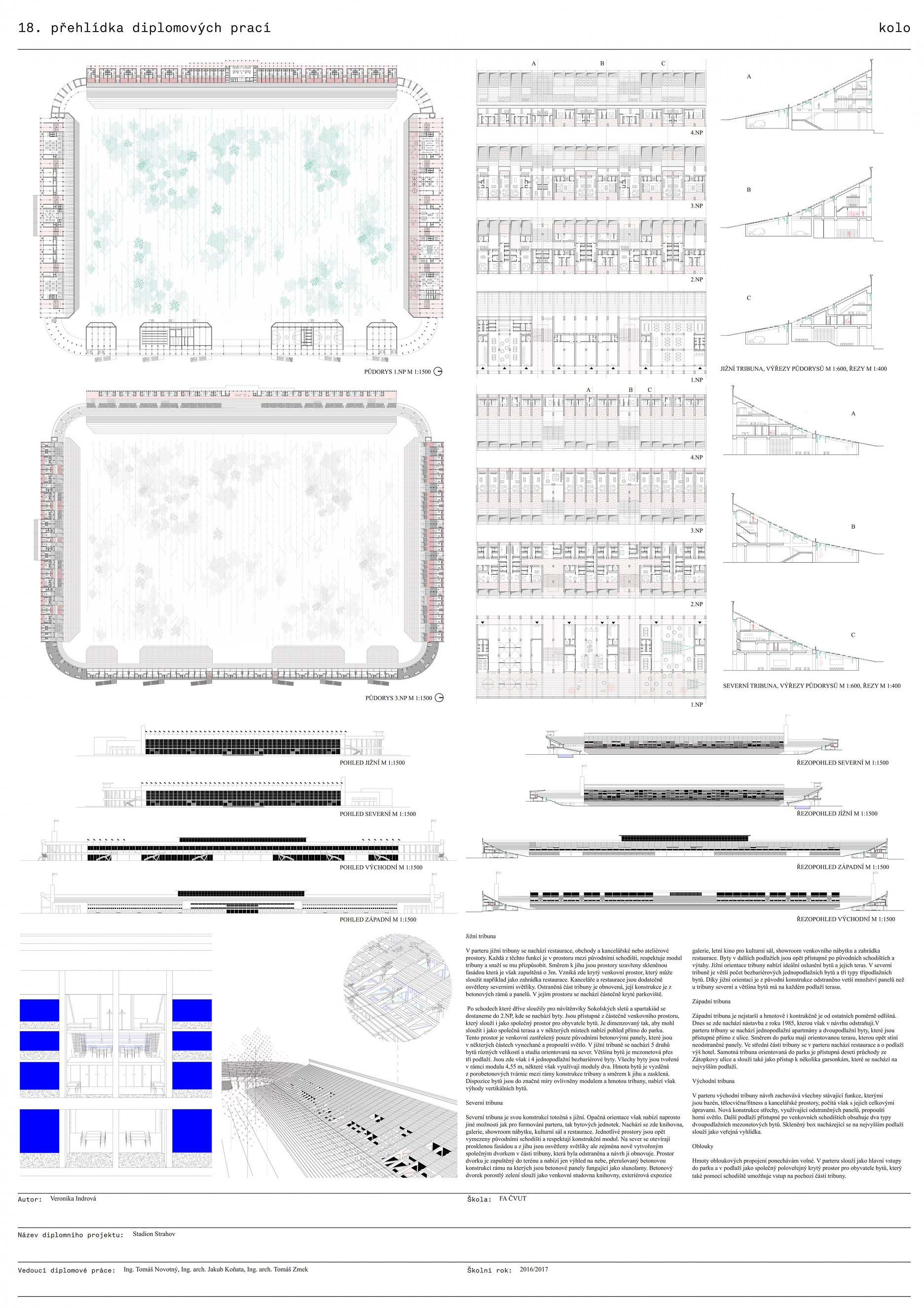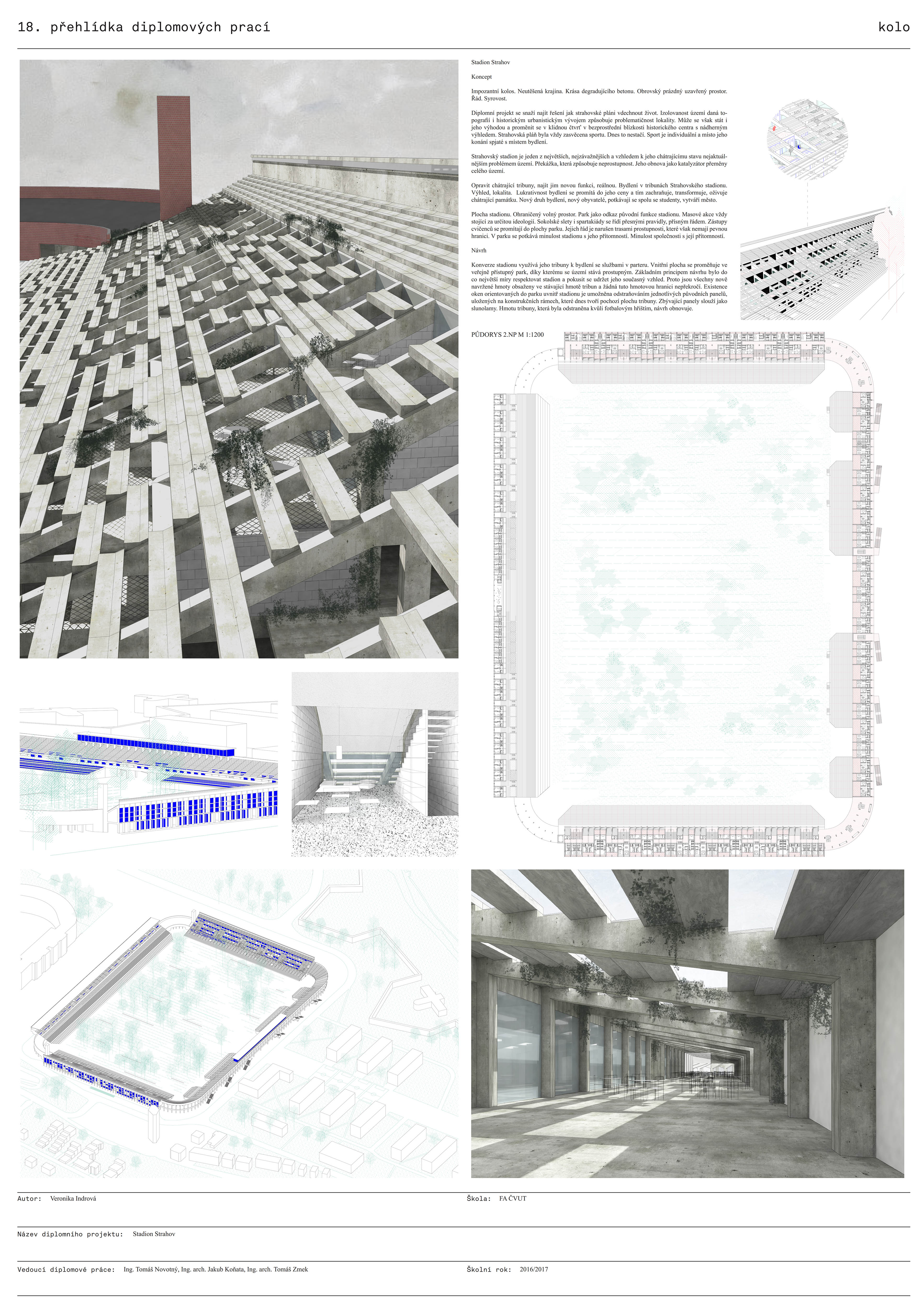 Využitie chátrajúceho Strahovského štadiónu, redefinícia a nová funkčná náplň Pražského hradu alebo dostavba pražského kostola Panny Márie Snežnej - aj tieto veľkorysé témy si pre svoje diplomové práce zvolili finalisti 18. ročníka Prehliadky diplomových prác. Tú každoročne organizuje česká komora architektov so zámerom porovnávať úroveň kvality štúdia na architektonických vysokých školách. V aktuálnom ročníku sa o ocenenie uchádzalo 67 diplomantov. Víťazkou sa stala Veronika Indrová s projektom Štadión Strahov. Na Fakulte architektúry Českého vysokého učenia technického v Prahe (FA ČVUT) jej prácu viedli Tomáš Novotný, Jakub Koňata a Tomáš Zmek.