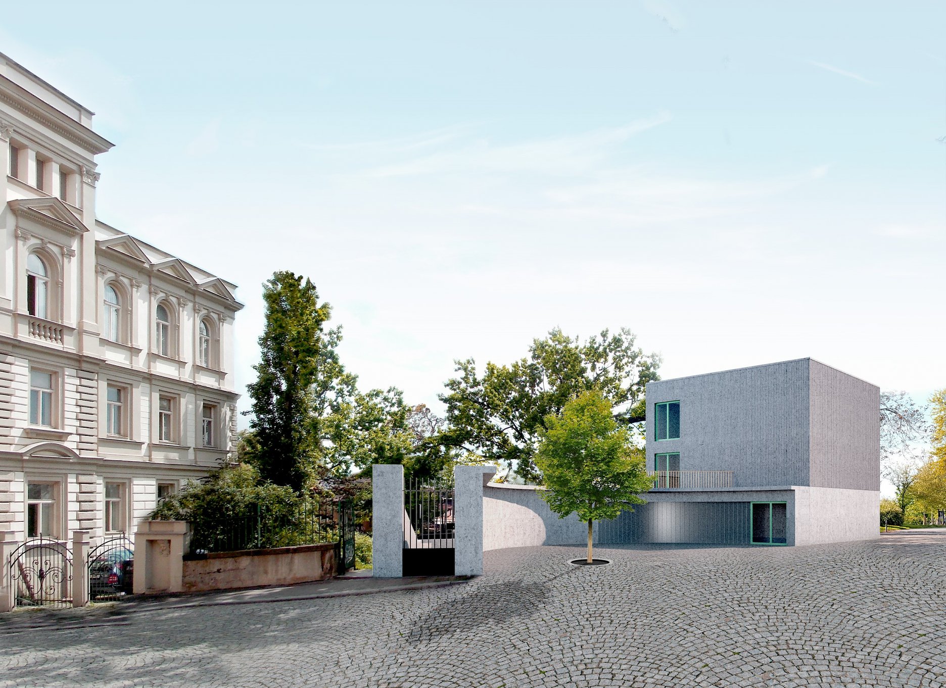 Nacházíme se na parcele vymezenou Letenskými sady a Skaleckou ulicí. Na první pohled nedokončený letenský blok se jeví jako příhodné místo pro zásah. Roh má ale spíše dvojznačný charakter, polohou náleží bloku, ale vzezřením Letenským sadům. Právě nedokončenost bloku nám umožňuje vhlédnout do rozmanité struktury dvorků a zahrad. Návštěvník musí prvně projít brankou. V podobném duchu jsem se tedy snažil navázat a jasně vymezuji, co je přístupné a co není. Odkrojením dostatečně velkého oblouku ze zdi získávám rychlý přístup k domu, tři dočasná parkovací místa přímo na pozemku a v neposlední řadě dům zanechává rozpoznatelnou půdorysnou stopu.