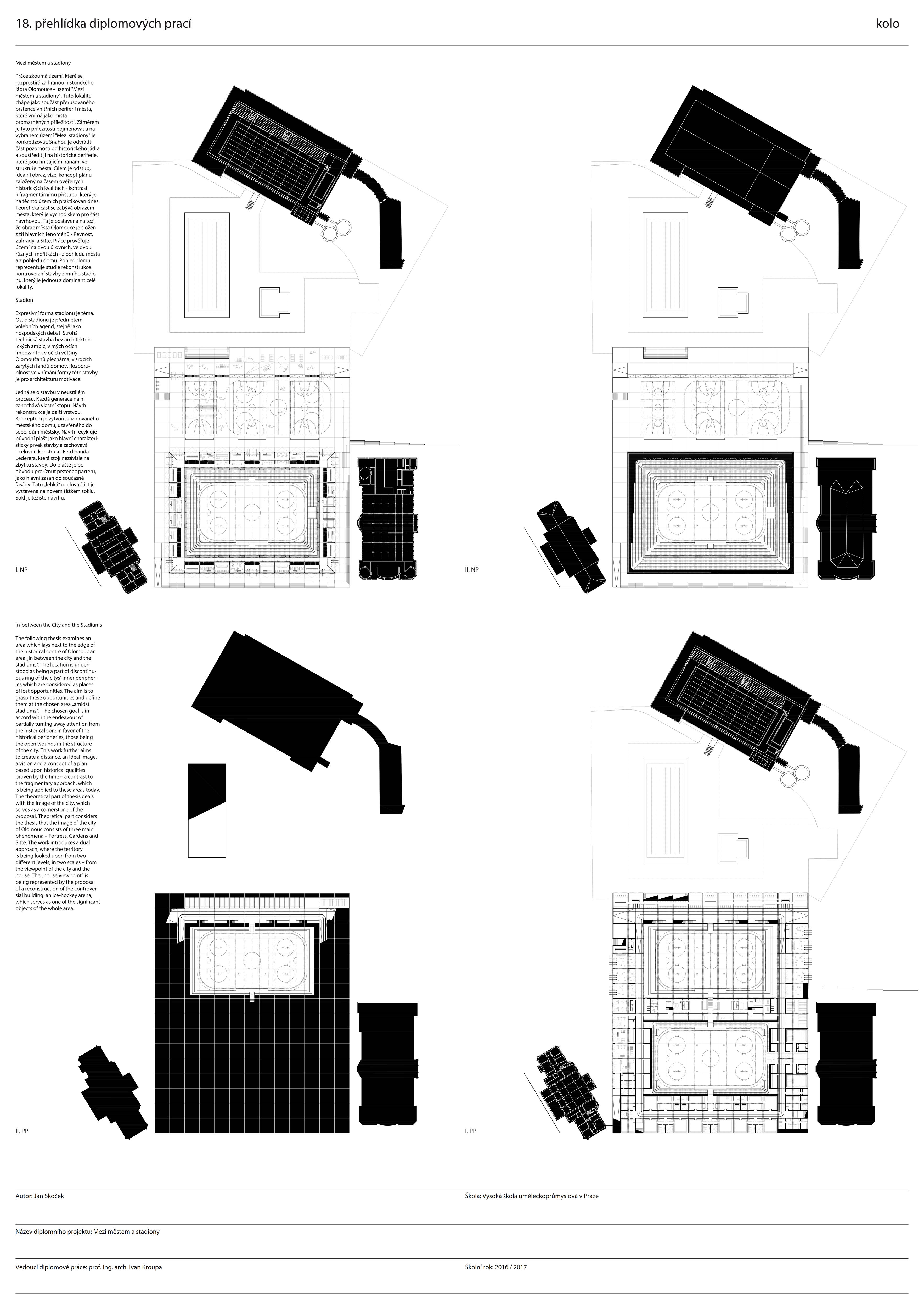 Práce zkoumá území, které se rozprostírá za hranou historického jádra Olomouce - území "Mezi městem a stadiony". Tuto lokalitu chápe jako součást přerušovaného prstence vnitřních periferií města, které vnímá jako místa promarněných příležitostí. Záměrem je tyto příležitosti pojmenovat a na vybraném území "Mezi stadiony" je konkretizovat. Snahou je odvrátit část pozornosti od historického jádra a soustředit ji na historické periferie, které jsou hnisajícími ranami ve struktuře města. Cílem je odstup, ideální obraz, vize, koncept plánu založený na časem ověřených historických kvalitách - kontrast k fragmentárnímu přístupu, který je na těchto územích praktikován dnes. Teoretická část se zabývá obrazem města, který je východiskem pro část návrhovou. Ta je postavená na tezi, že obraz města Olomouce je složen z tří hlavních fenoménů - Pevnost, Zahrady, a Sitte. Práce prověřuje území na dvou úrovních, ve dvou různých měřítkách - z pohledu města a z pohledu domu. Pohled domu reprezentuje studie rekonstrukce kontroverzní stavby zimního stadionu, který je jednou z dominant celé lokality.
