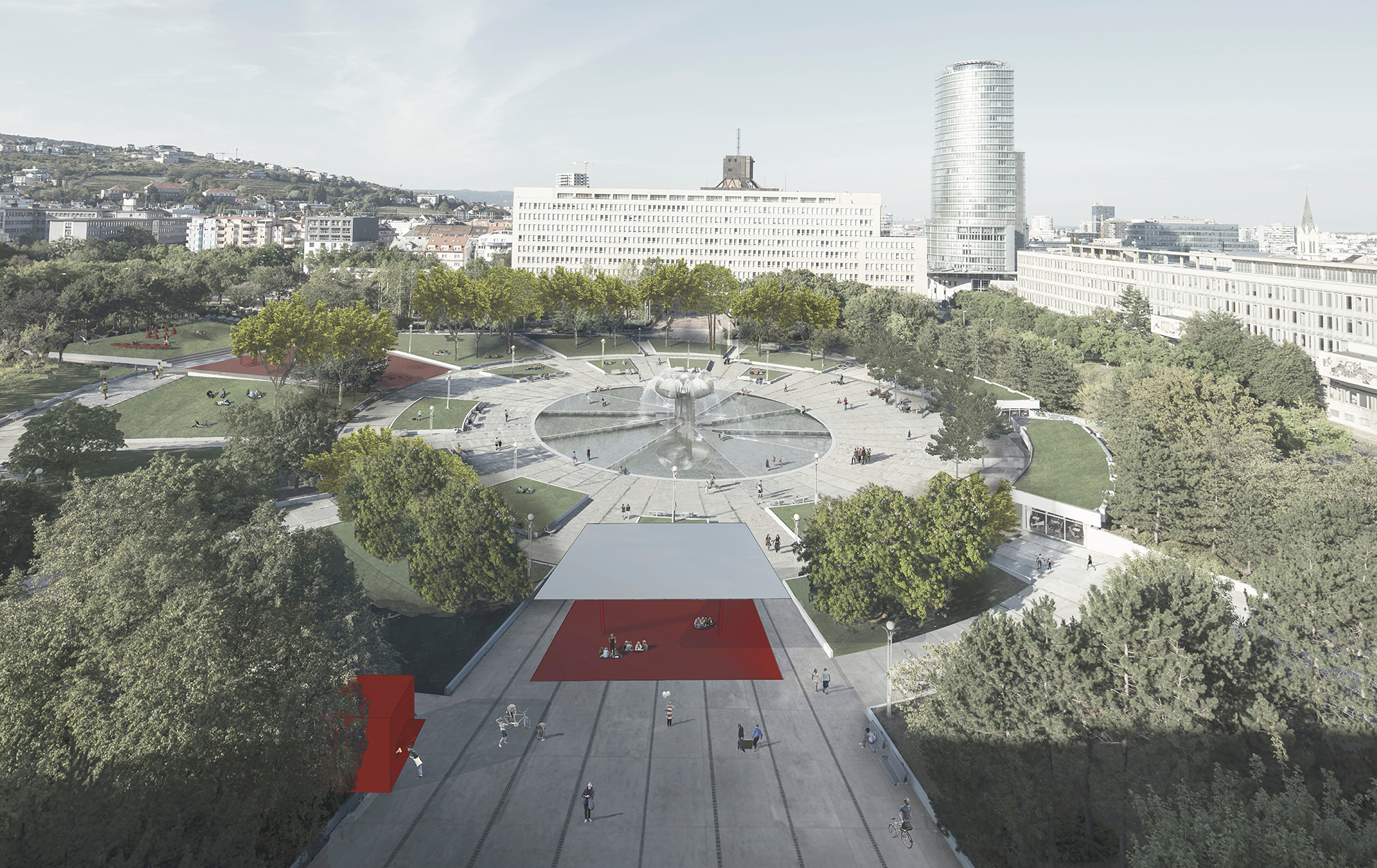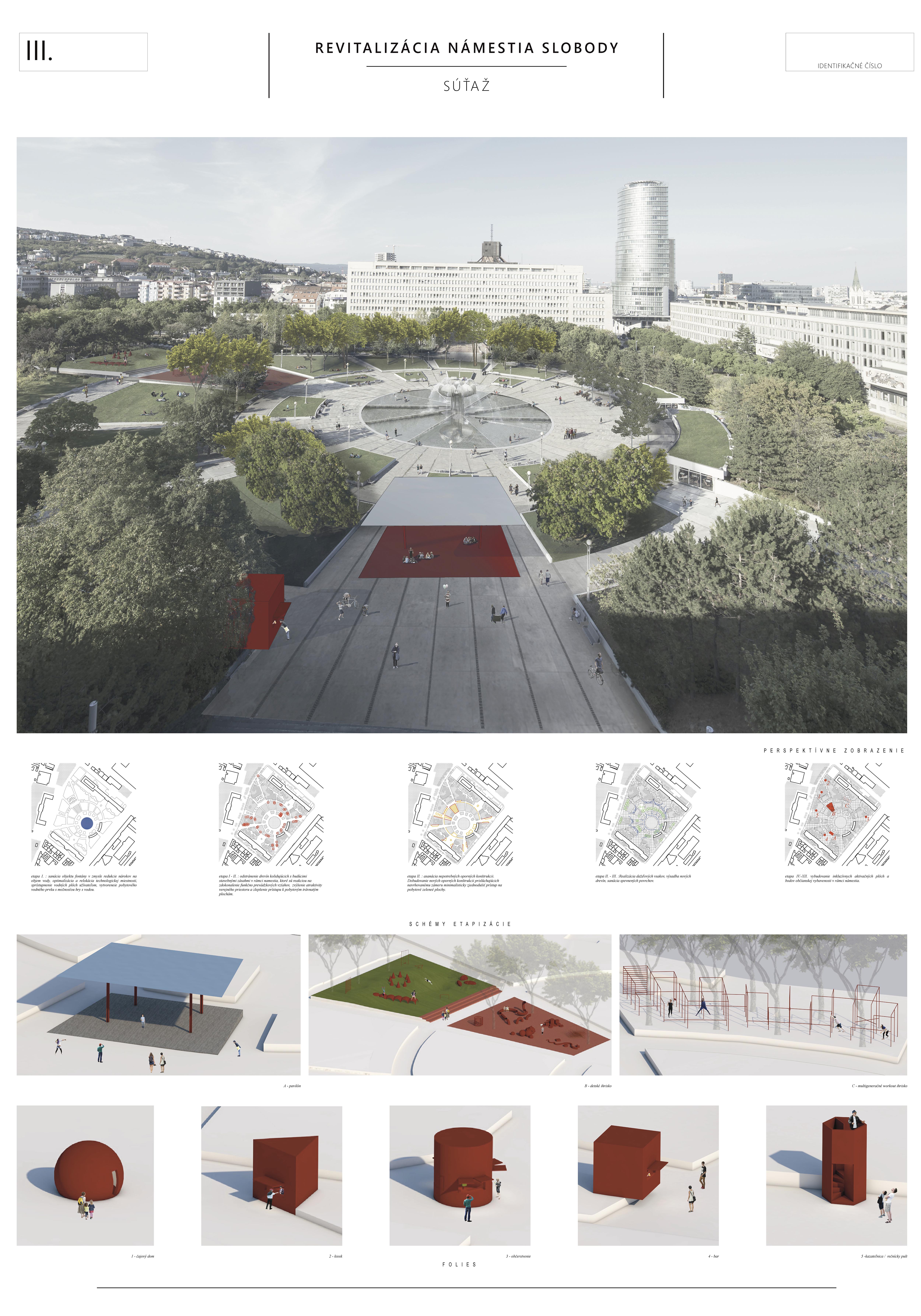Súčasťou novej „užívateľskej“ vrstvy sú architektonické objekty, tzv. folies, rôznej veľkosti a charakteru, ktoré vstupujú do priestoru námestia ako podpora novej programovej náplne námestia (inšpirácia z Parc de la Villette v Paríží?) alebo červená farba objektov reprezentuje brand mesta? „...poskytujú zázemie pre rôzne aktivity, pre programové rámcovanie okolitého priestoru. Sekundárne tvoria aj orientačné body.“ Tento počin posúdila porota ako vítaný, objekty môžu priniesť žiadanú obsahovú animáciu a zážitok. V jeho interpretácii však ostal zatiaľ nepresvedčivý, bez definovania jasnej filozofie a princípov, a predovšetkym nedostatočne zdokumentovaný. Aj ostatné navrhované zmeny (odstránenie múrikov pri vyvýšených kvetináčoch, „ponorenie“ sa fontány na úroveň terénu a pod.) nie sú dostatočne spracované a čitateľné.