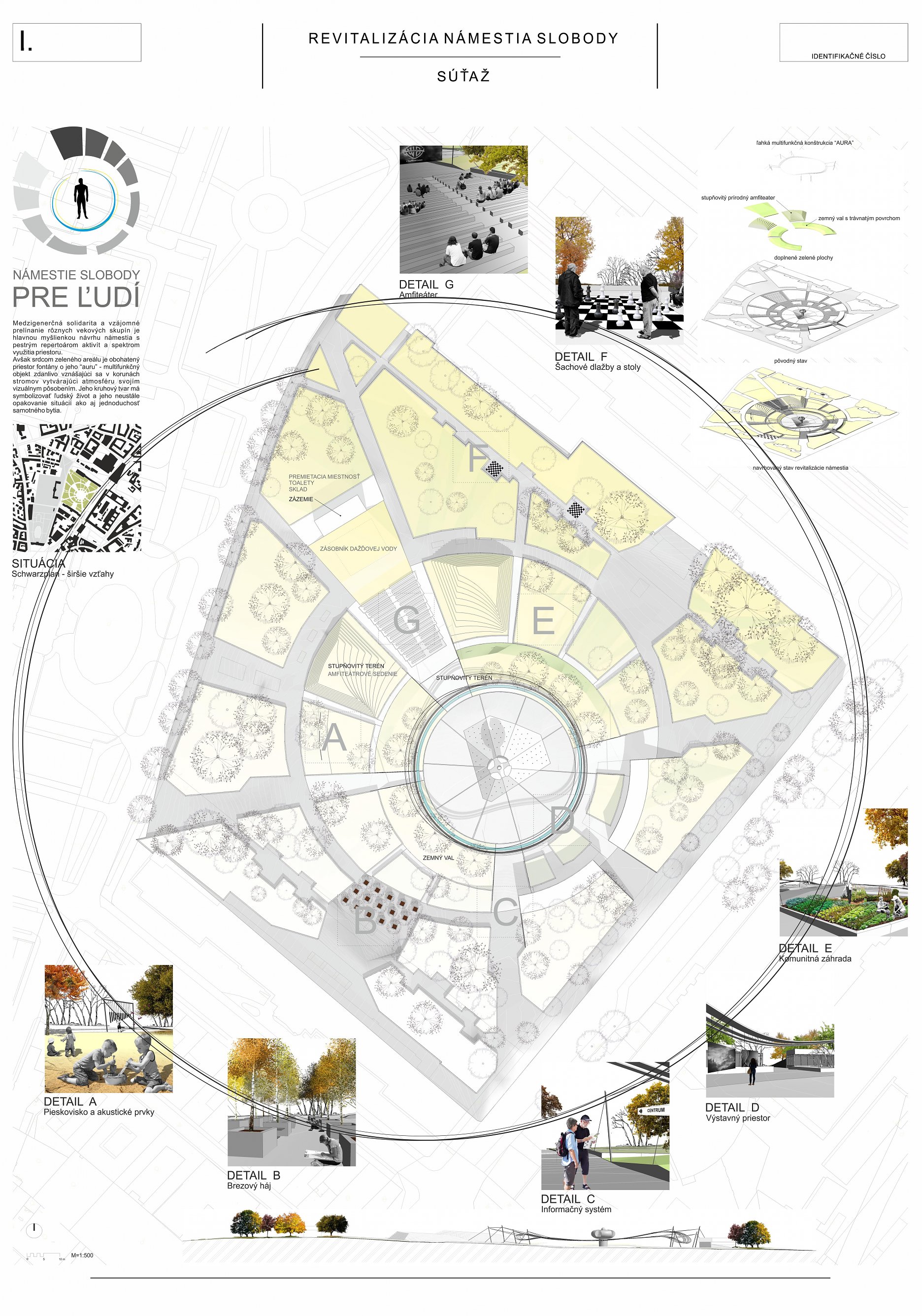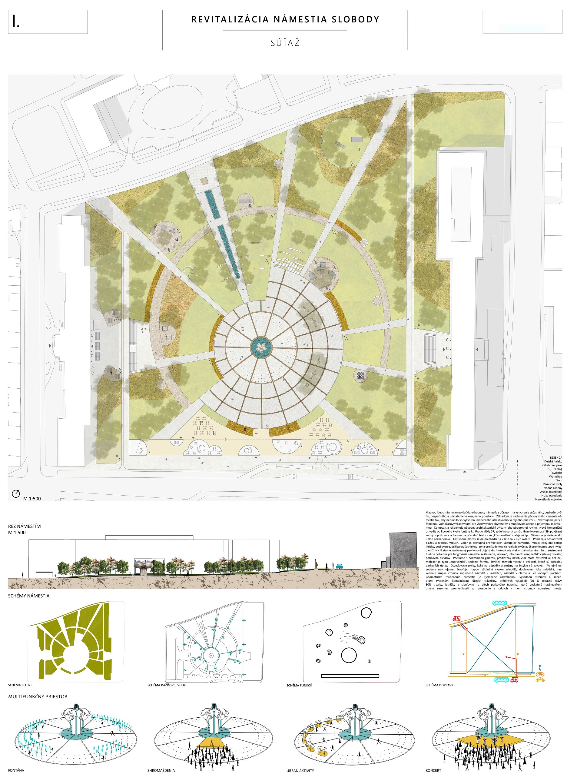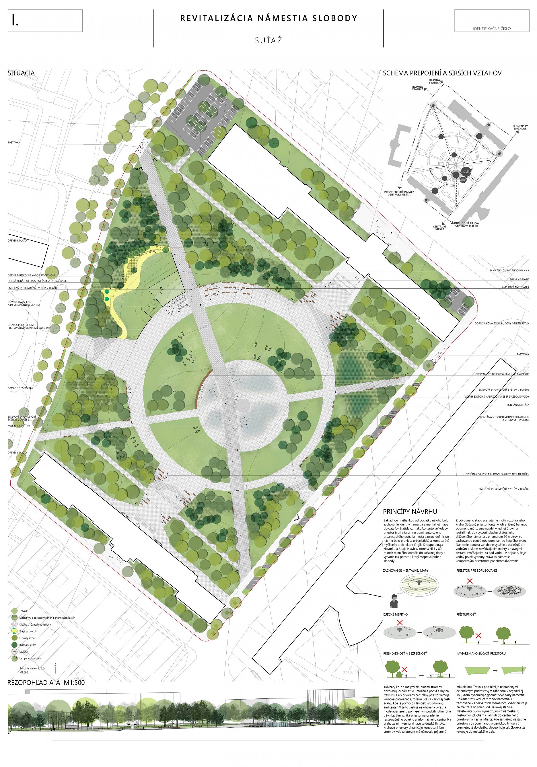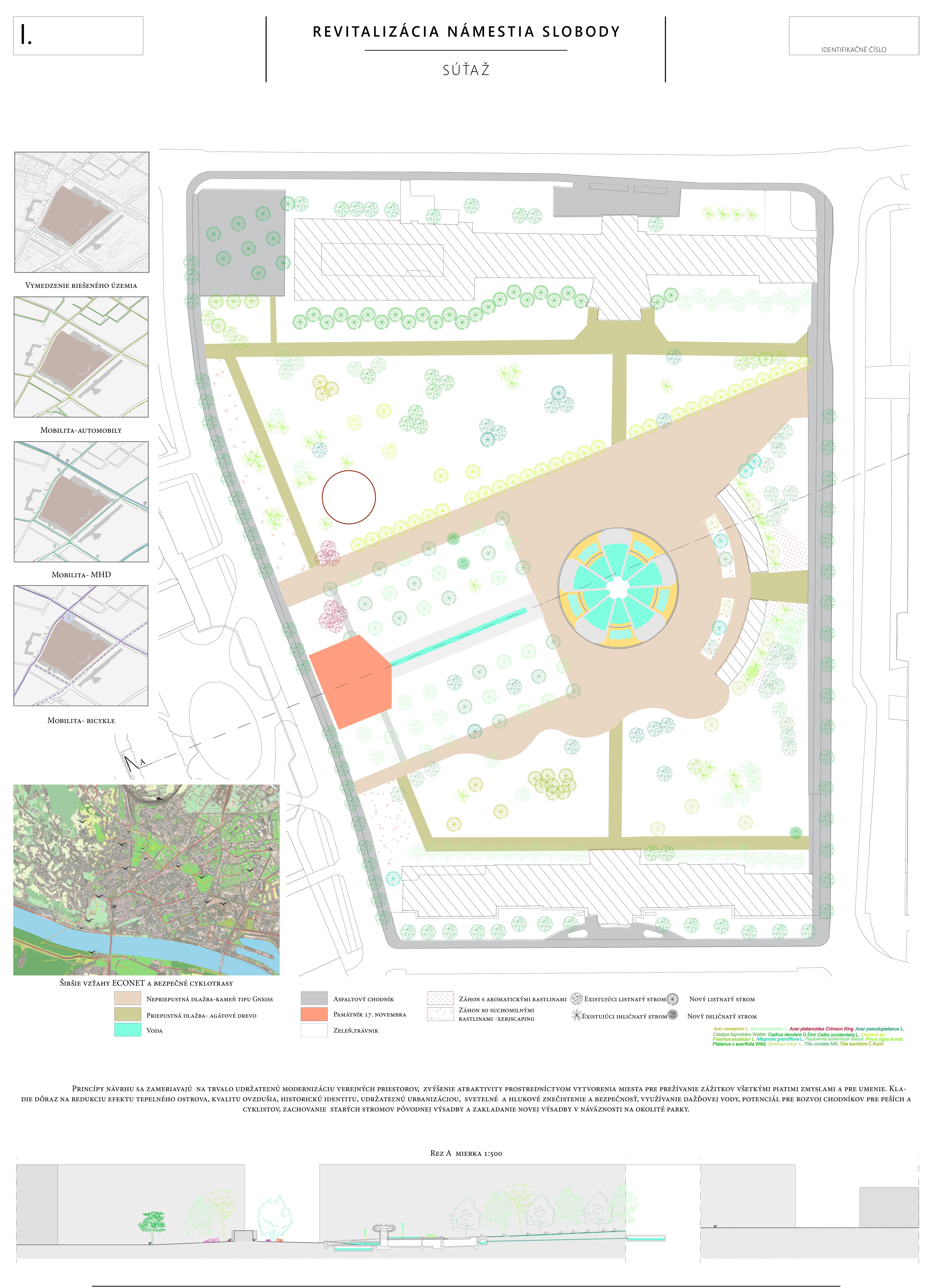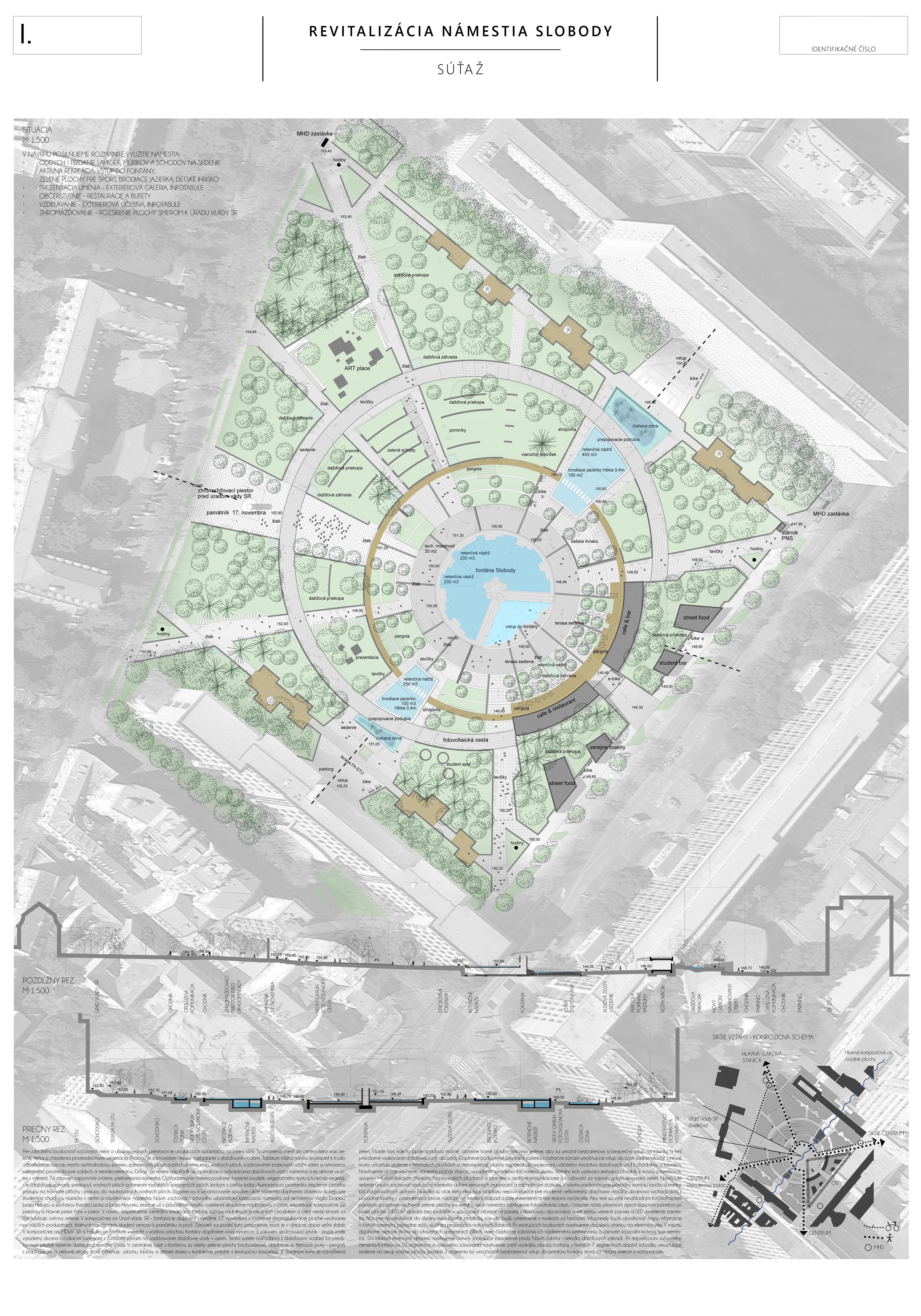 Návrh prináša minimálne, praktické a cielené zmeny, ktoré majú viesť k jeho celkovému sfunkčneniu, bezbariérovému sprístupneniu všetkých plôch a zelene. Riešenie v maximálnej miere rešpektuje existujúci charakter námestia a akceptuje súčasnú zdieľanú spoločenskú kvalitu miesta.