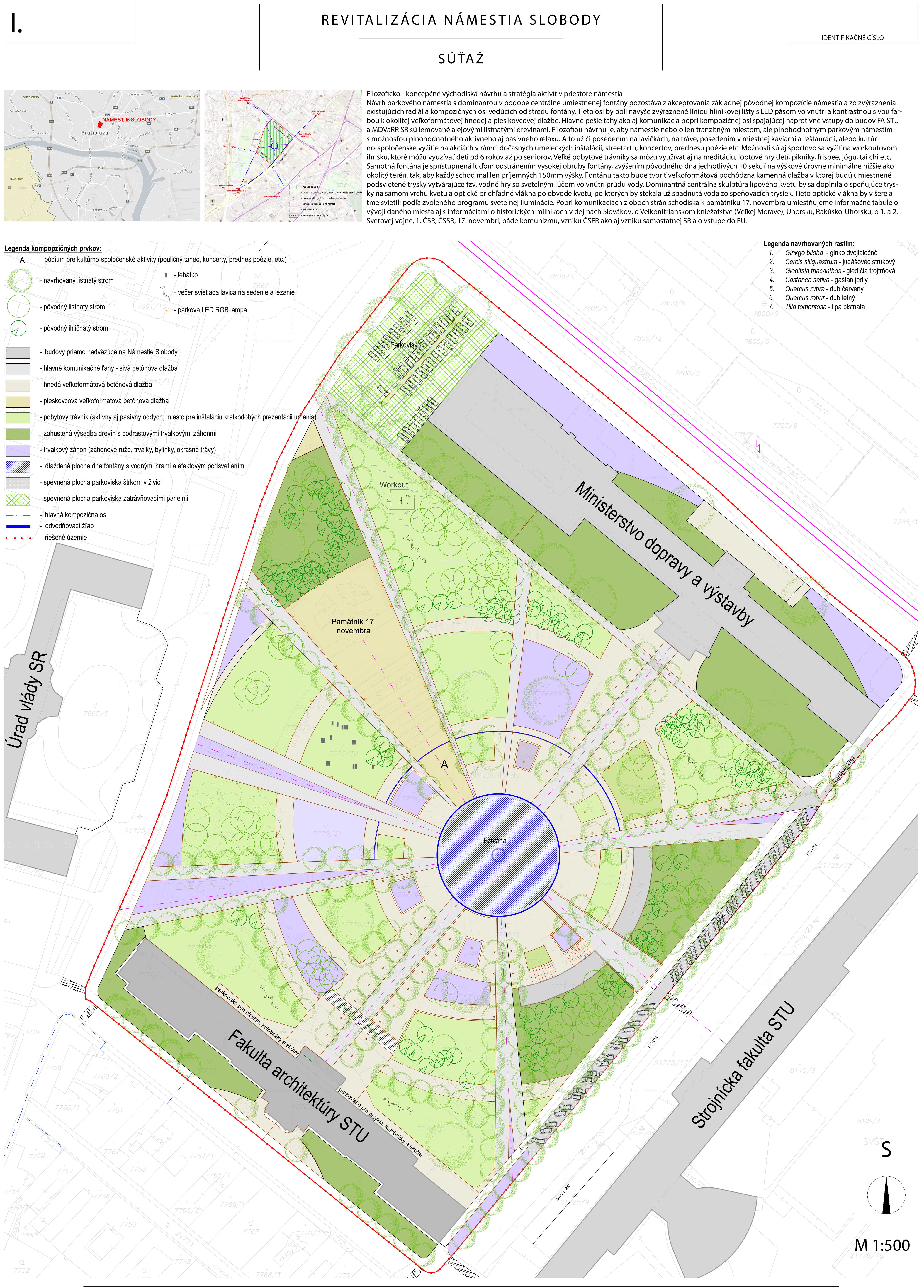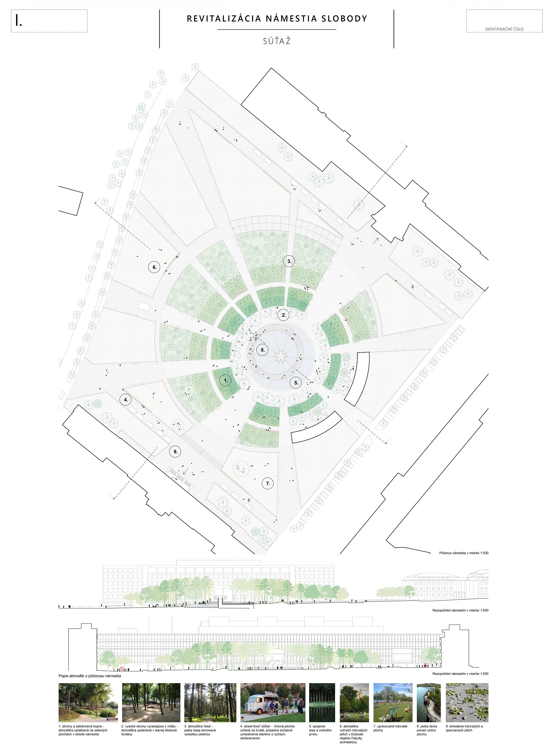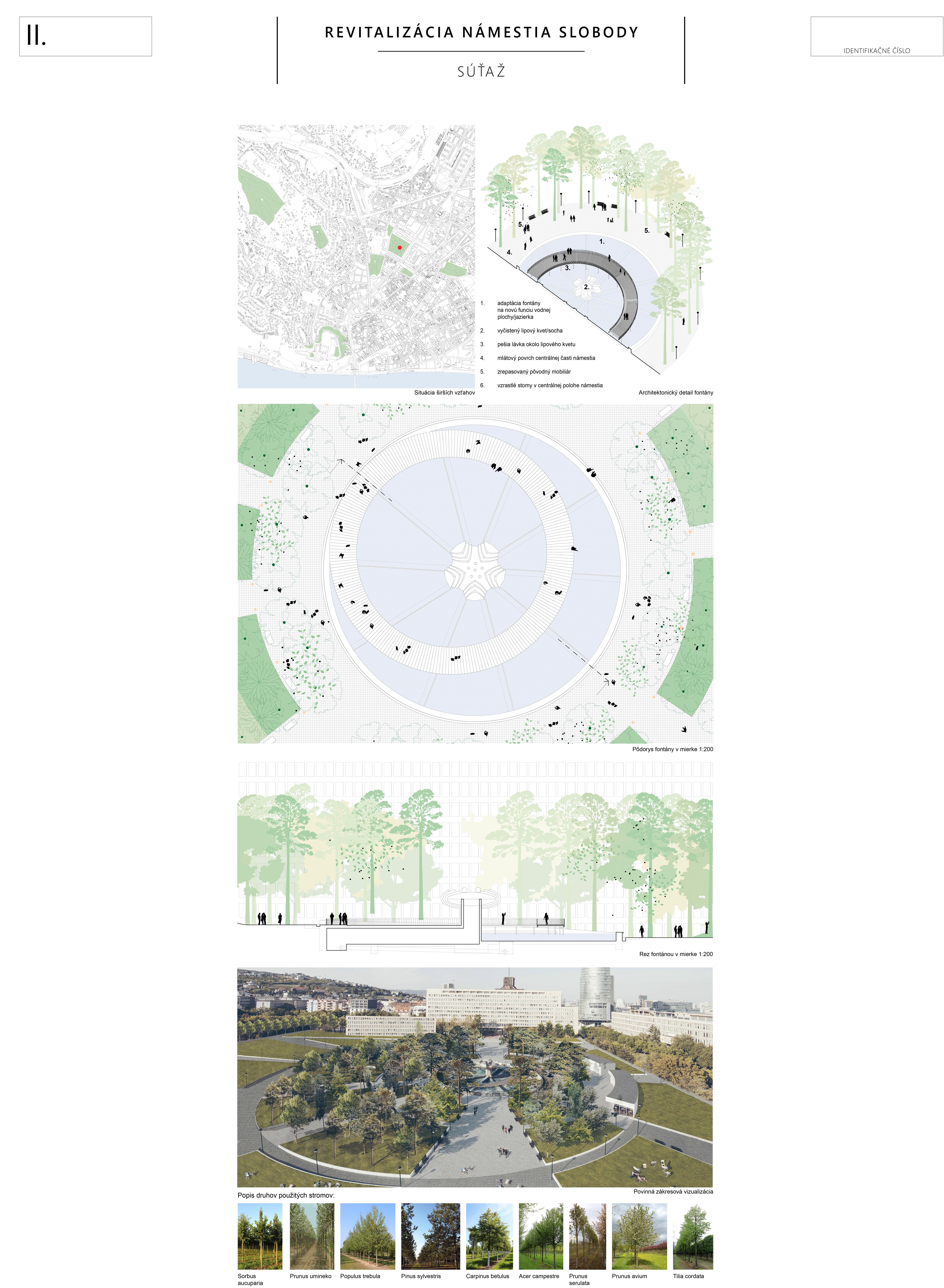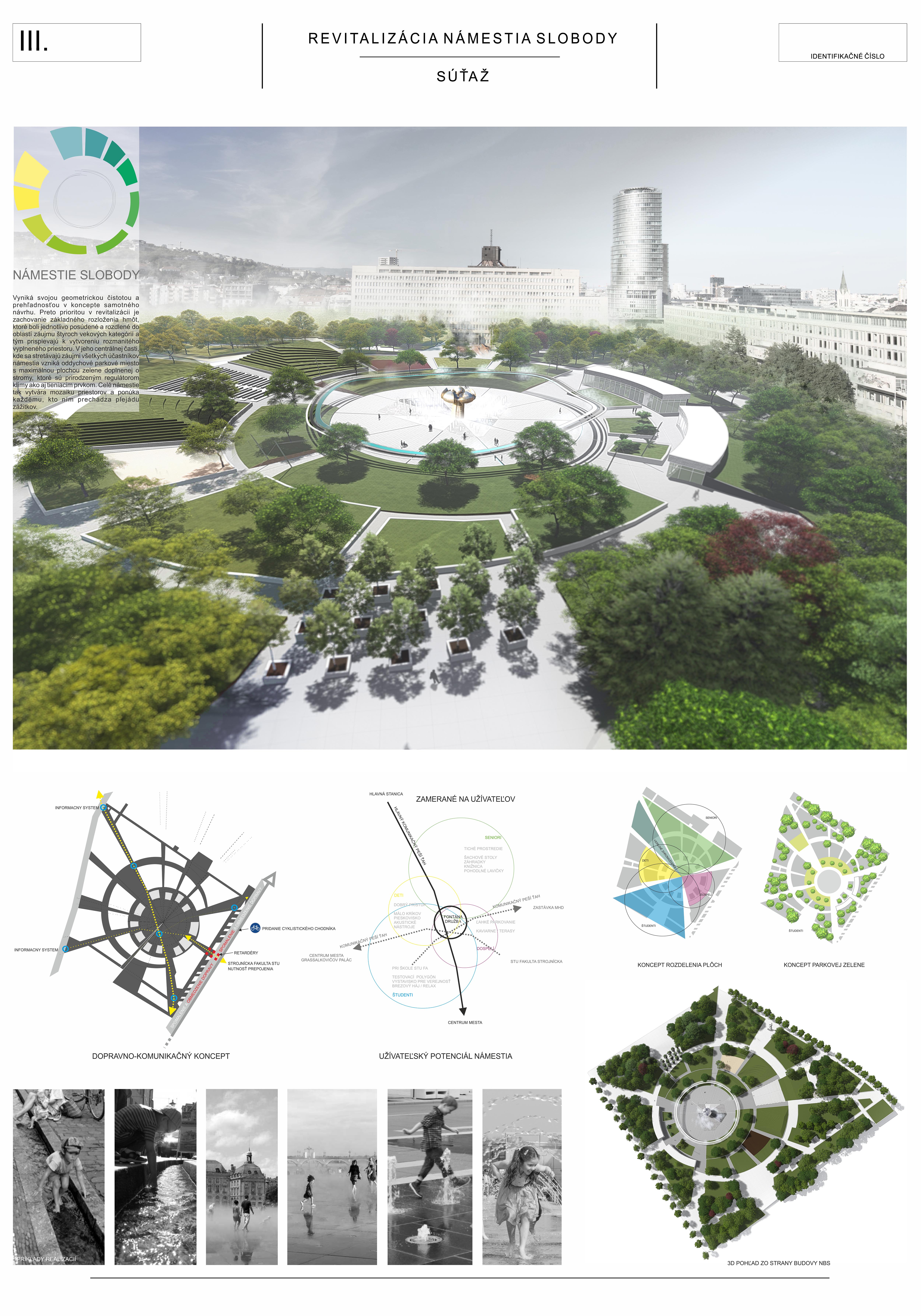 Porota oceňuje veľmi jasný, aj keď kontroverzný autorský názor, ktorý bol presvedčivo prezentovaný. Otočením existujúcej logiky námestia a dotvorenie „zeleného“ ťažiska v centre námestia. Obrátenie jestvujúceho stavu na ruby, s lesom stromov v strede, s uvoľnením a otvorením priestoru námestia po jeho obvode prinieslo do námestia nečakanú intimitu. Žiaľ tento koncept popiera už existujúcu zeleň a je v rozpore so snahou zachovať čo možno najviac existujúcich stromov.