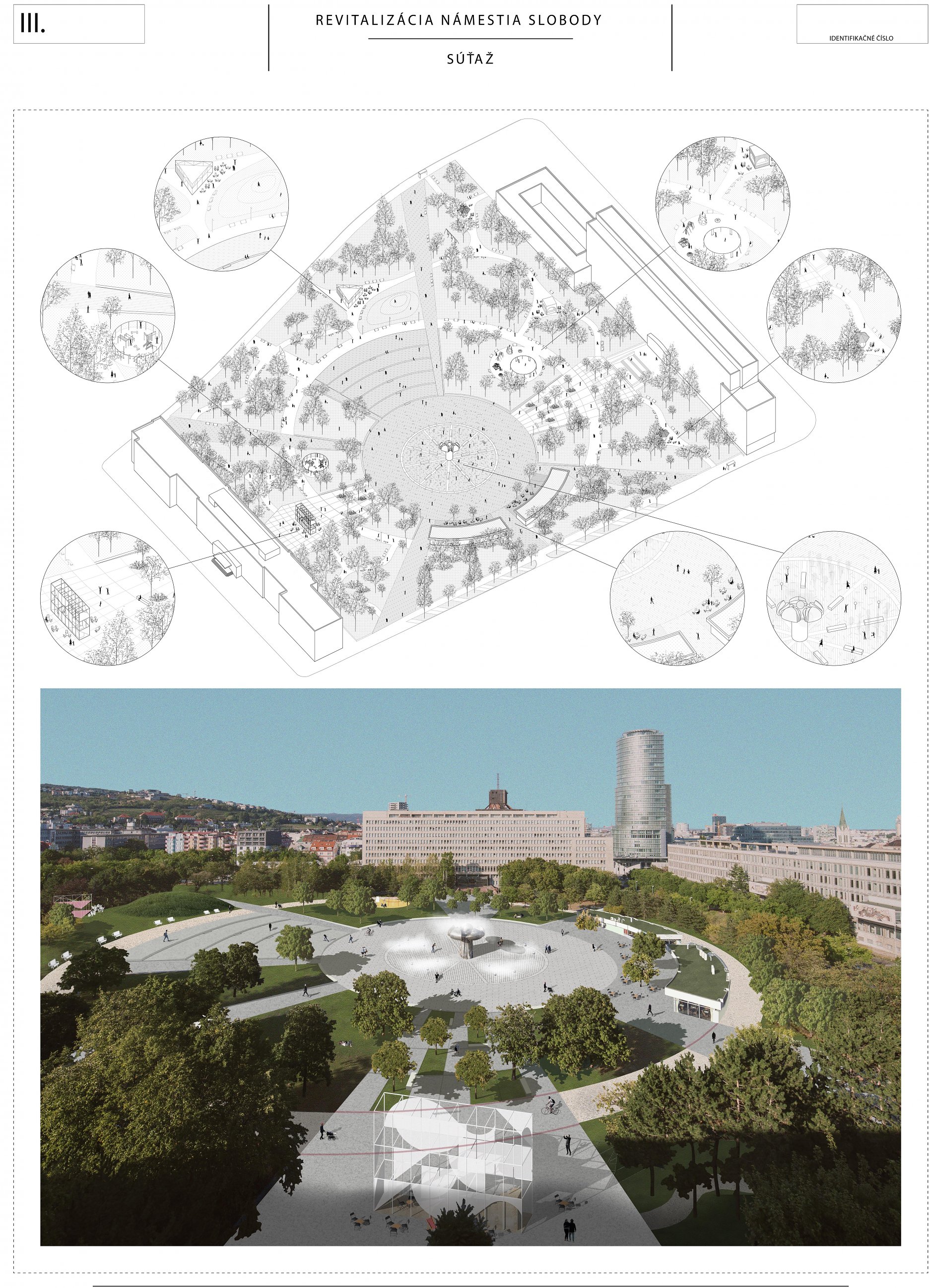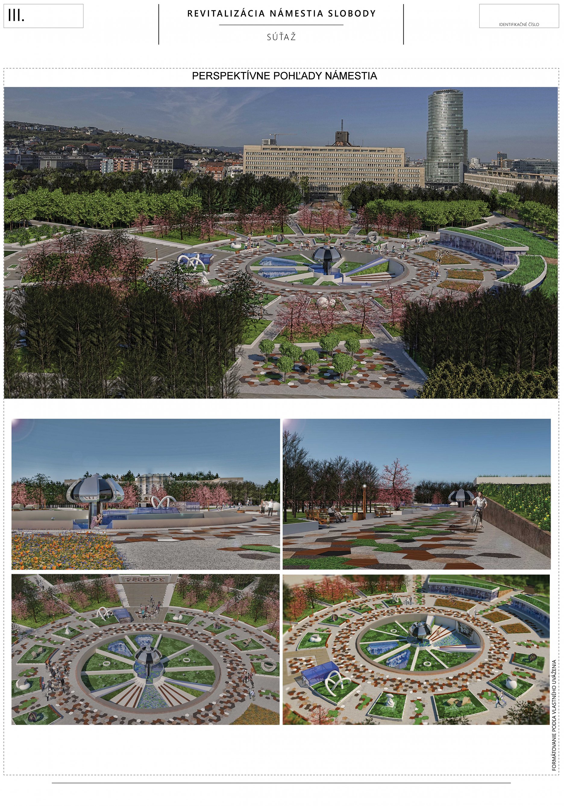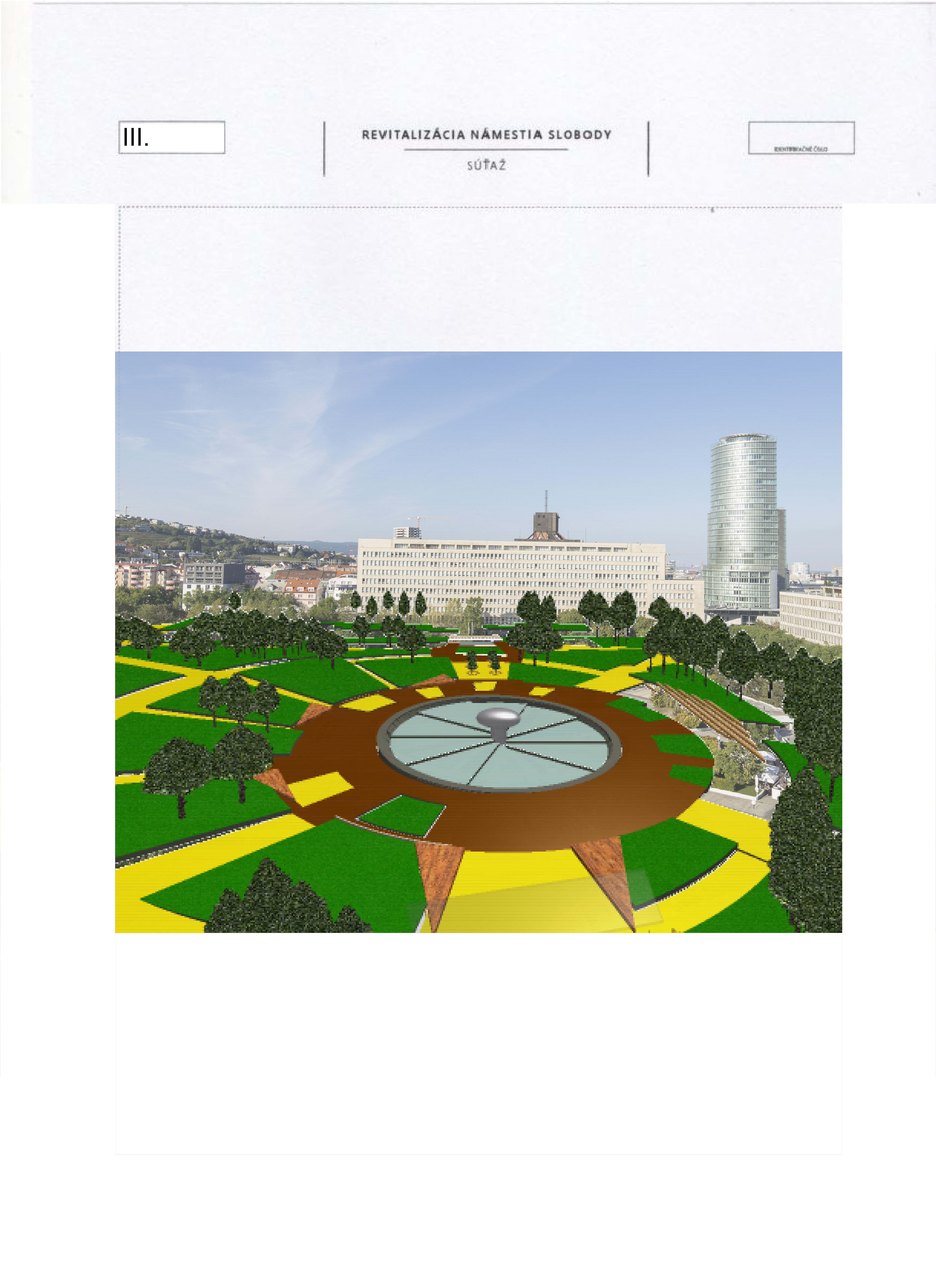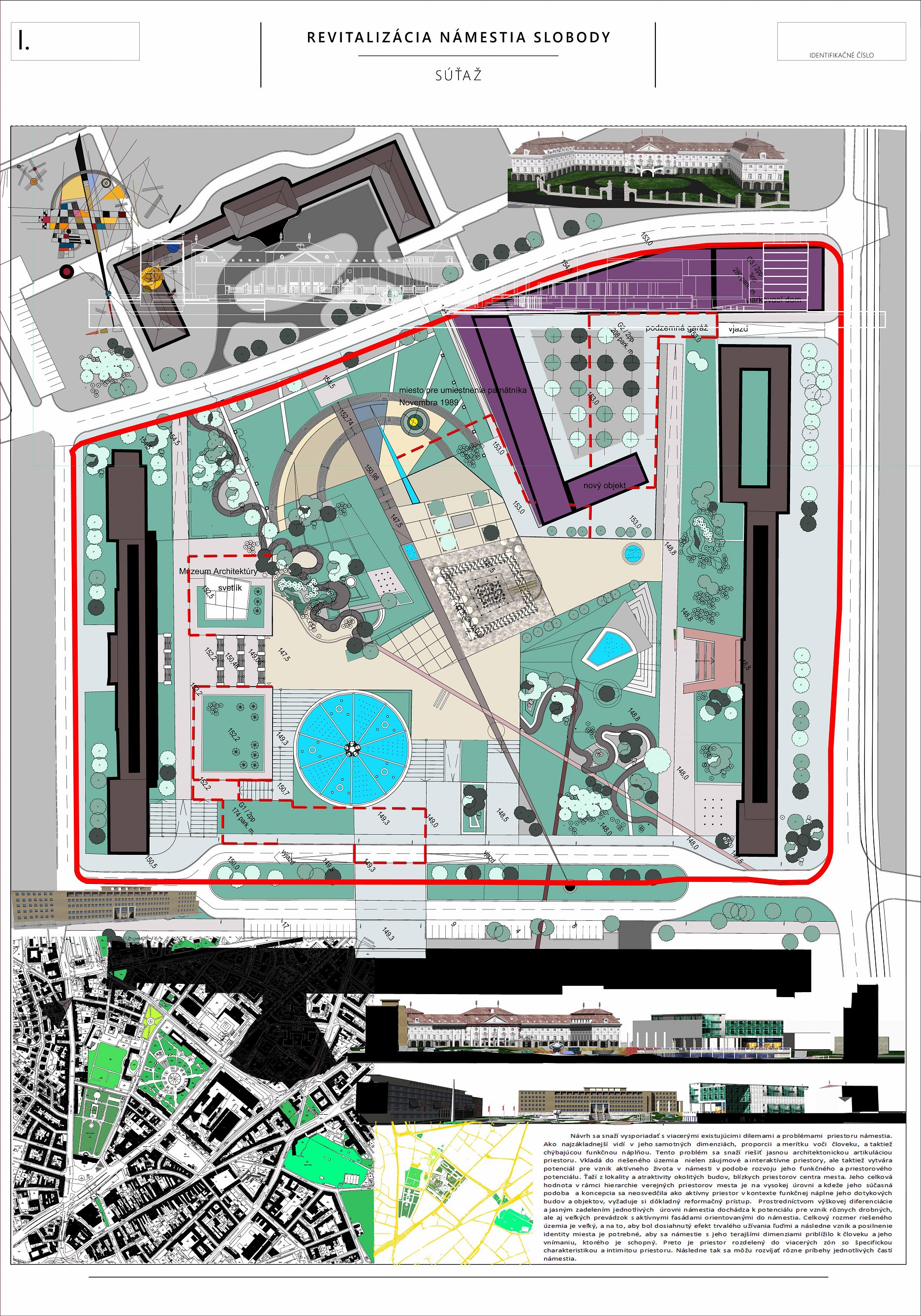 Porota oceňuje veľmi jasný, aj keď kontroverzný autorský názor, ktorý bol presvedčivo prezentovaný. Otočením existujúcej logiky námestia a dotvorenie „zeleného“ ťažiska v centre námestia. Obrátenie jestvujúceho stavu na ruby, s lesom stromov v strede, s uvoľnením a otvorením priestoru námestia po jeho obvode prinieslo do námestia nečakanú intimitu. Žiaľ tento koncept popiera už existujúcu zeleň a je v rozpore so snahou zachovať čo možno najviac existujúcich stromov.