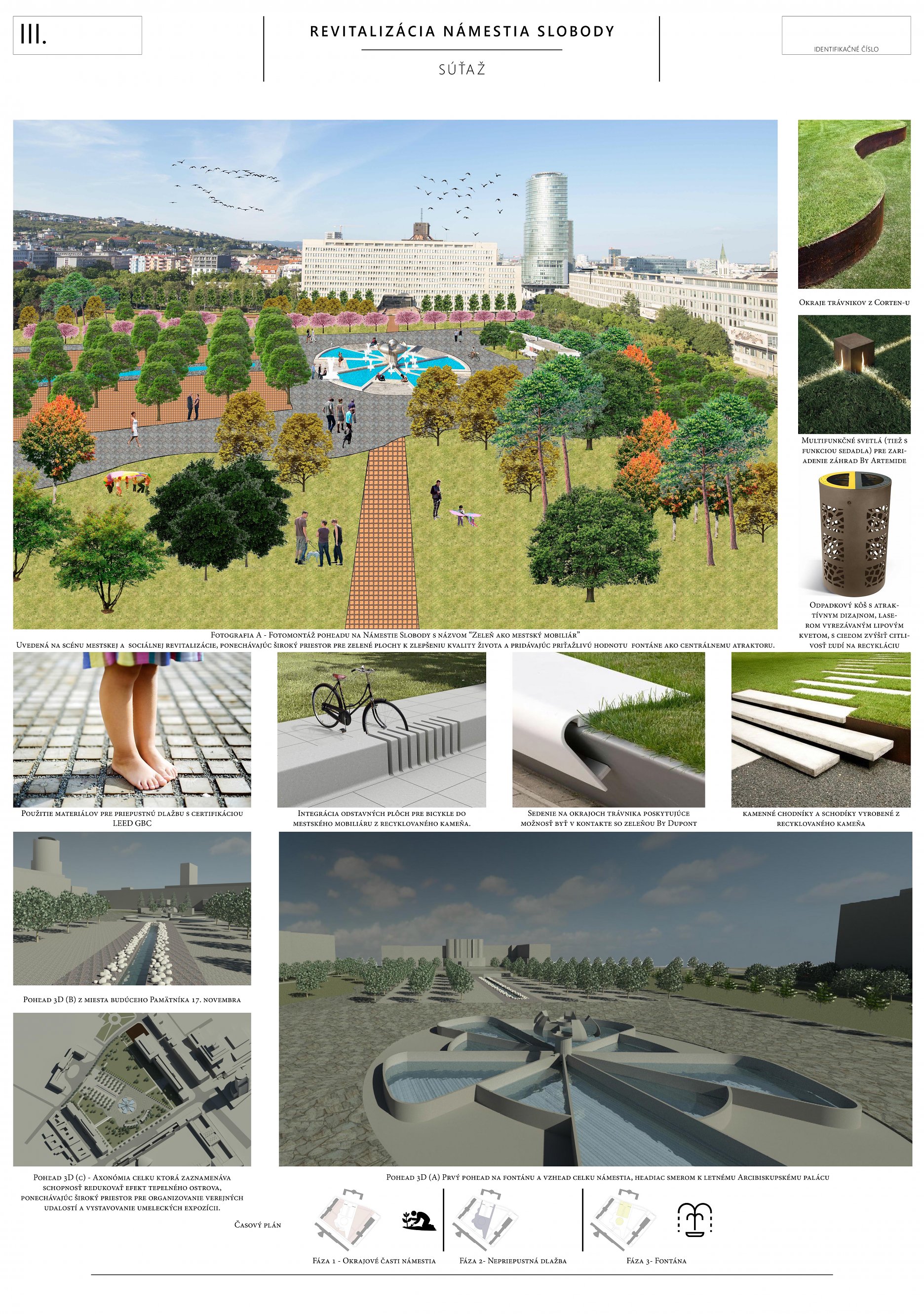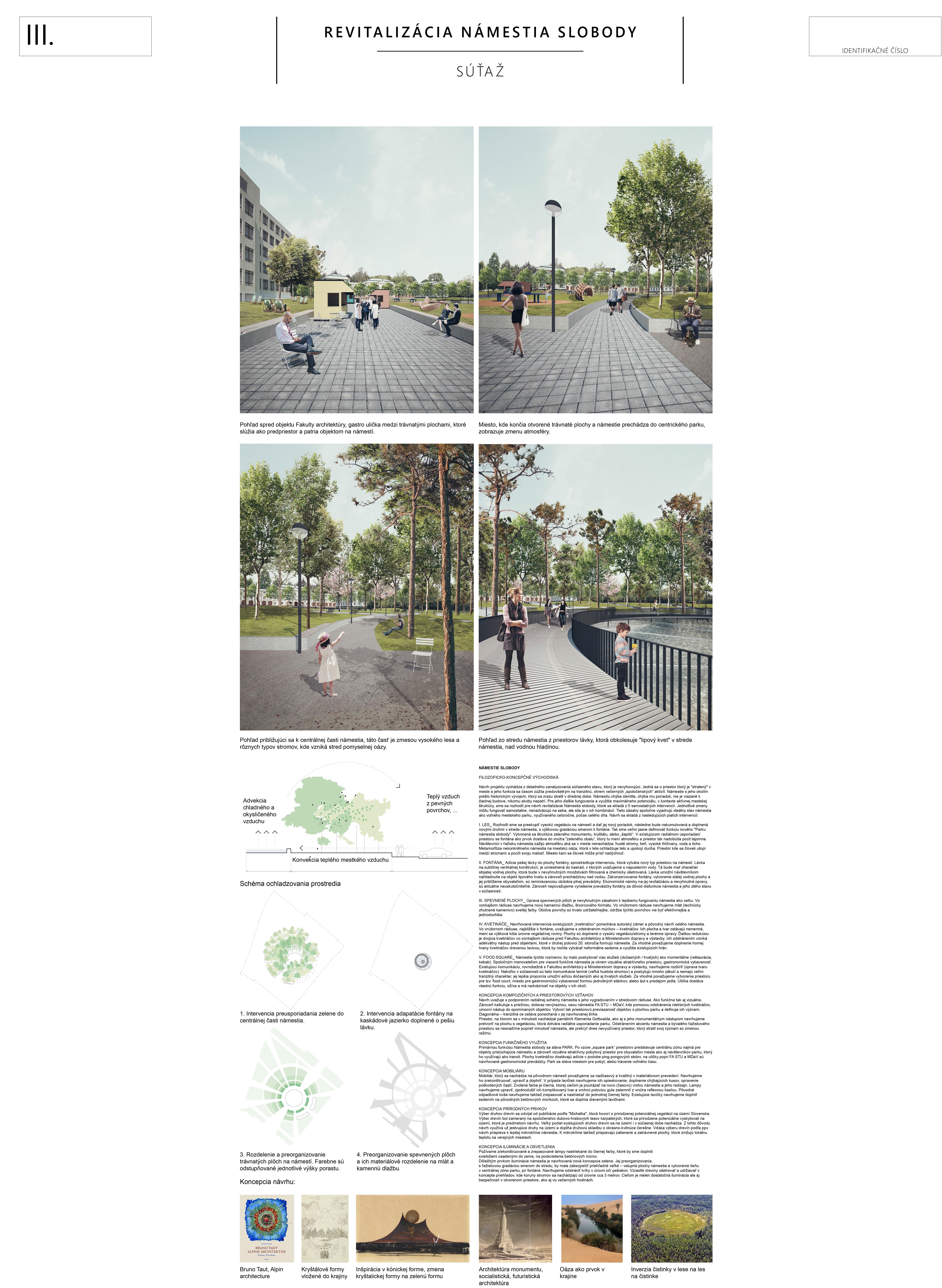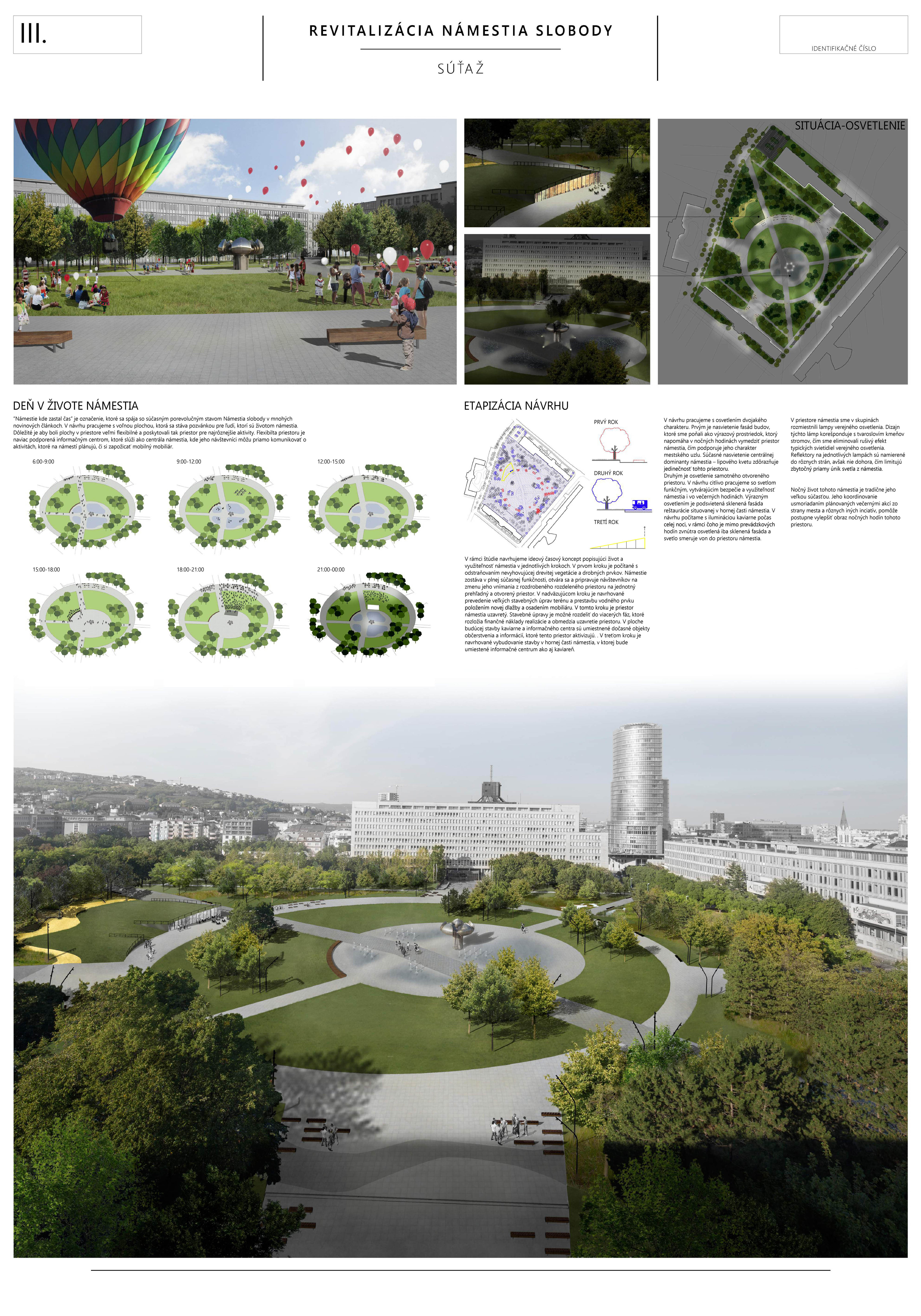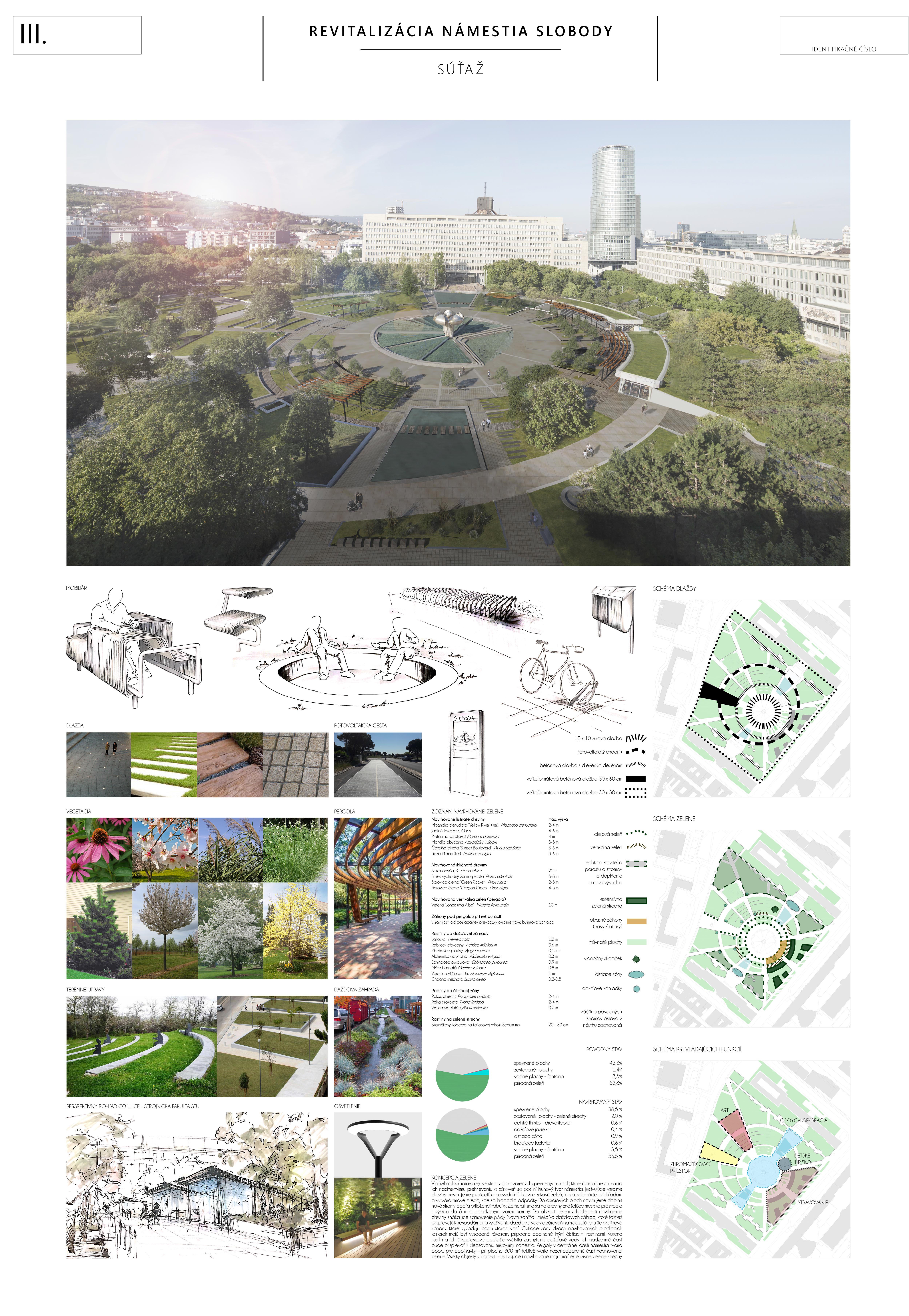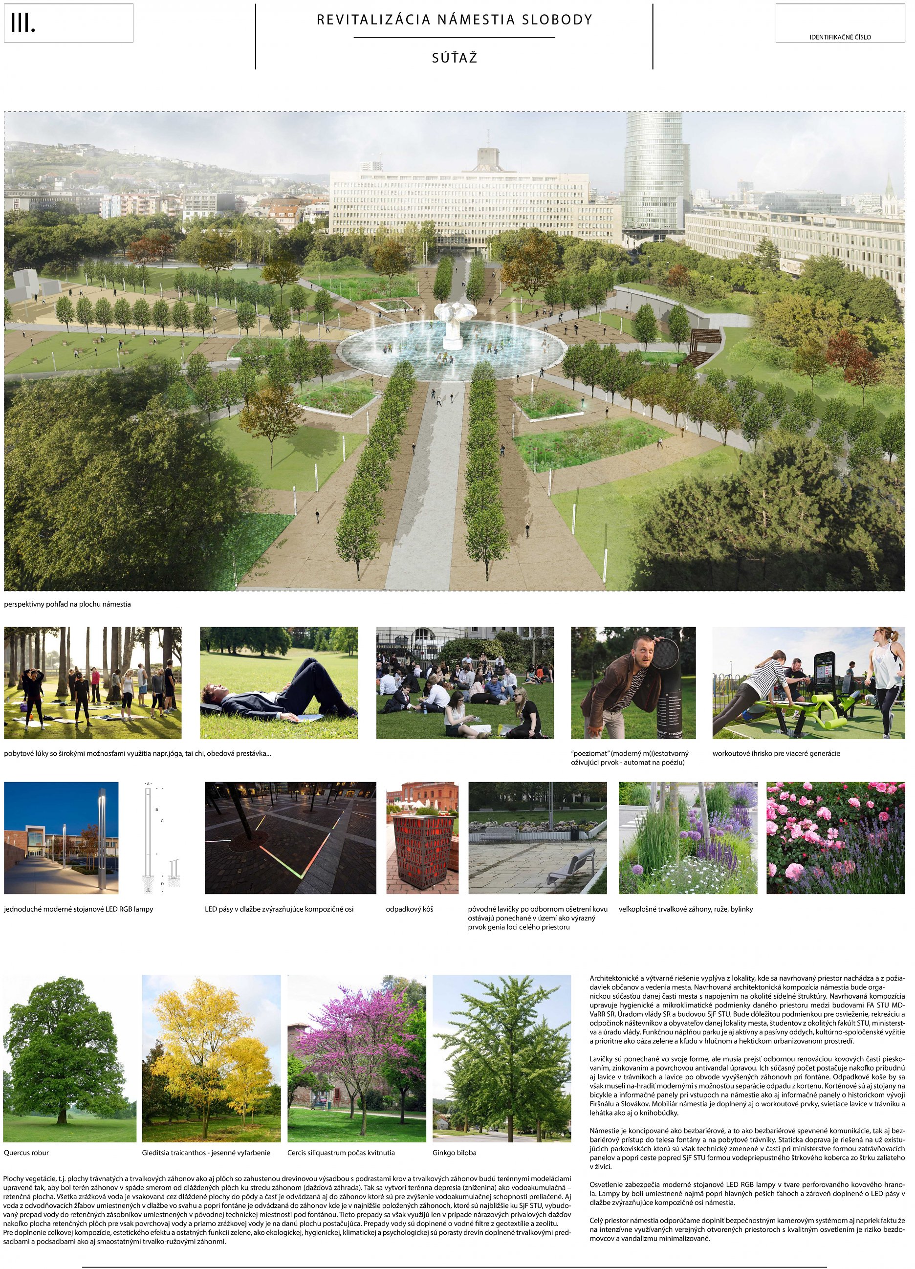 Ocenený návrh zásadne reagoval, či v grafickej alebo stručne v textovej časti (napr. k adaptácii na zmenu klímy, opatrenia v súvislosti so zeleňou, mobiliárom a pod.) na všetky požadované kritériá novej podoby námestia. Svoju kvalitu zakladá na pôvodnom architektonickom návrhu a zohľadňujúc potreby prevádzky, údržby, udržateľnosti a pod. ho "faceliftuje". Podobne, ako mobiliár, ide podľa autorov o kvalitný dizajn vhodný pre dané miesto. Navrhujú využitie súčasných svietidiel (pozn. poroty: tieto však nie sú pôvodné a ani technickými parametrami nespĺňajú požadovanú energetickú udržateľnosť). Svoj postoj autori vysvetľujú v sprievodnej správe: