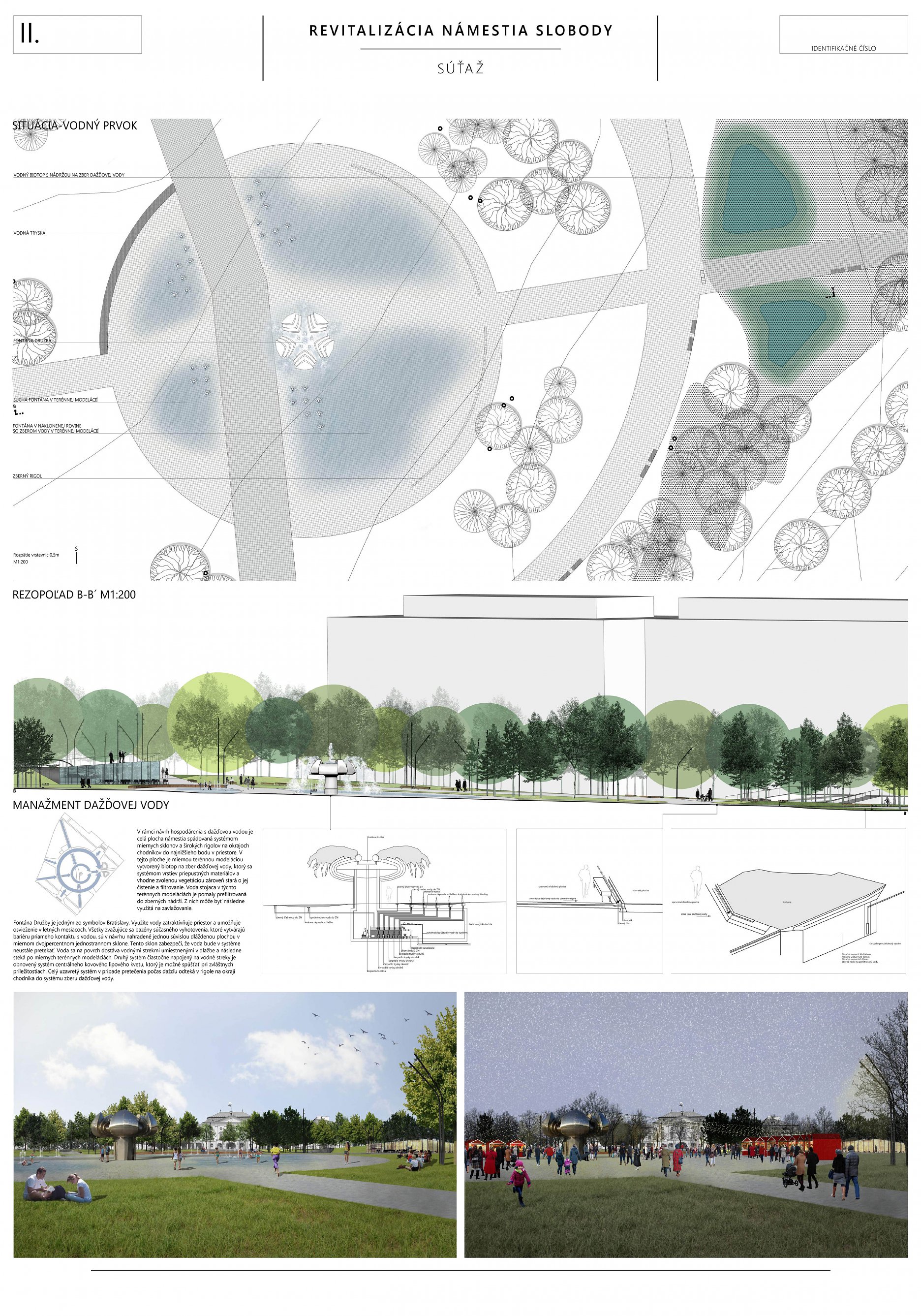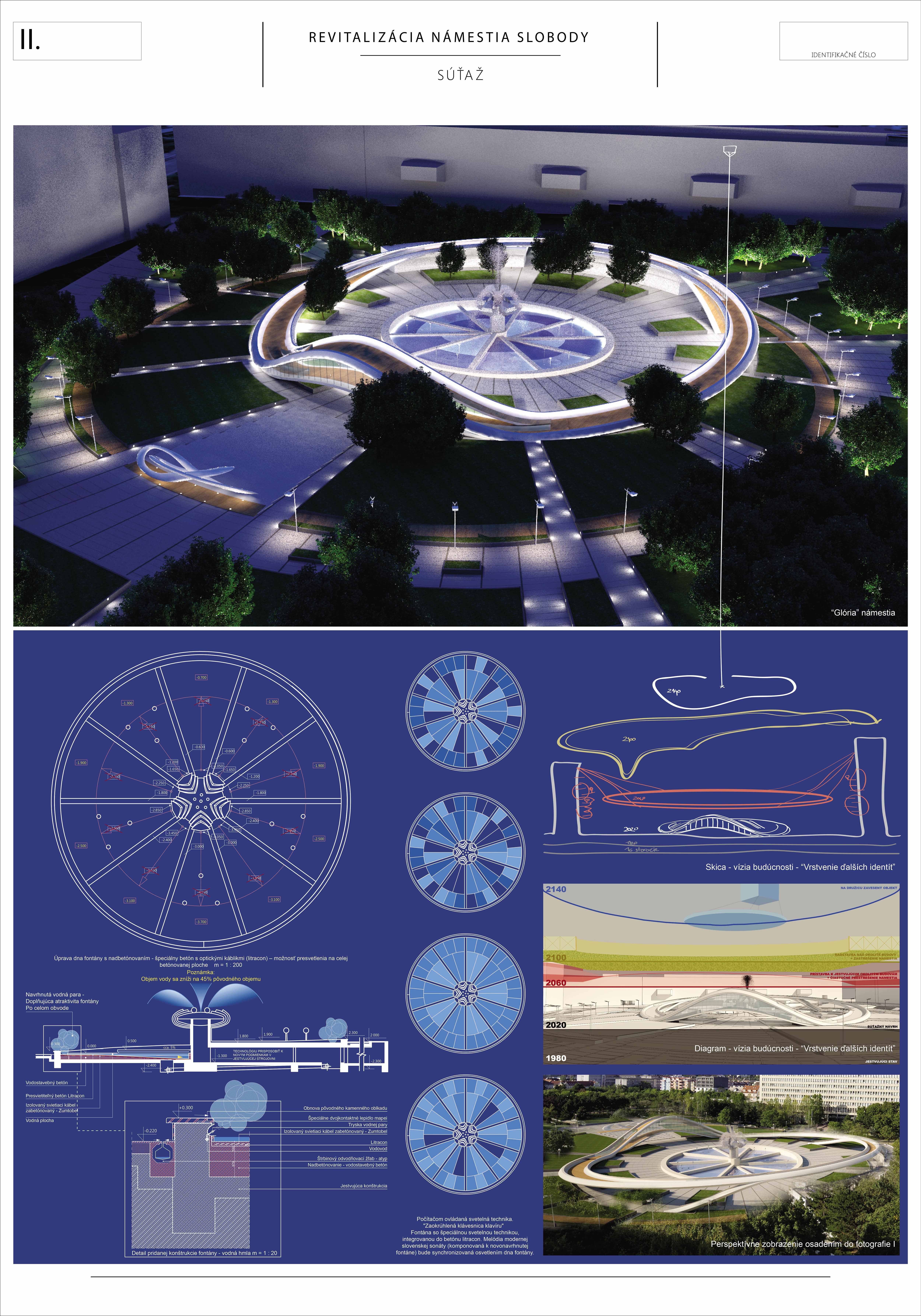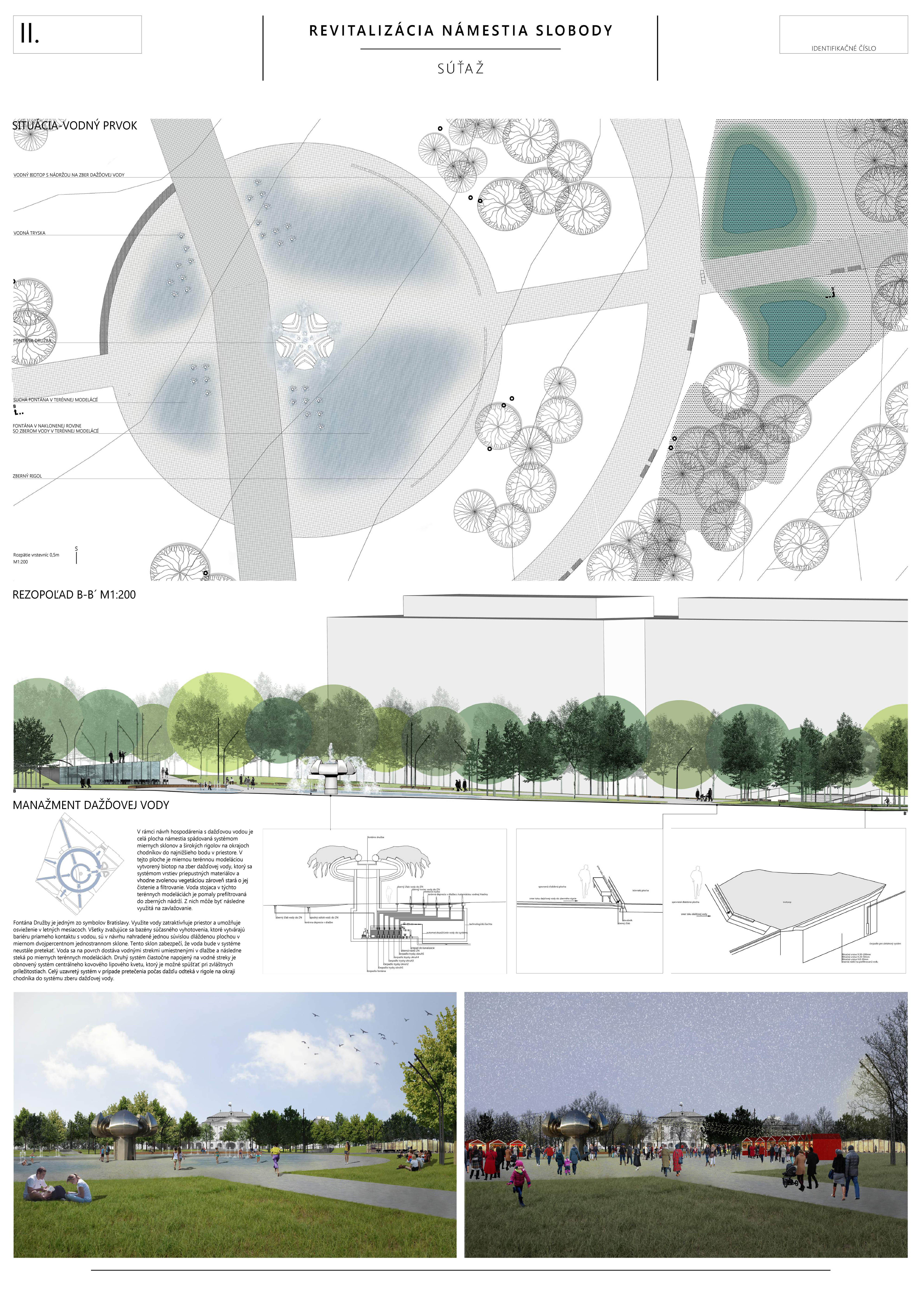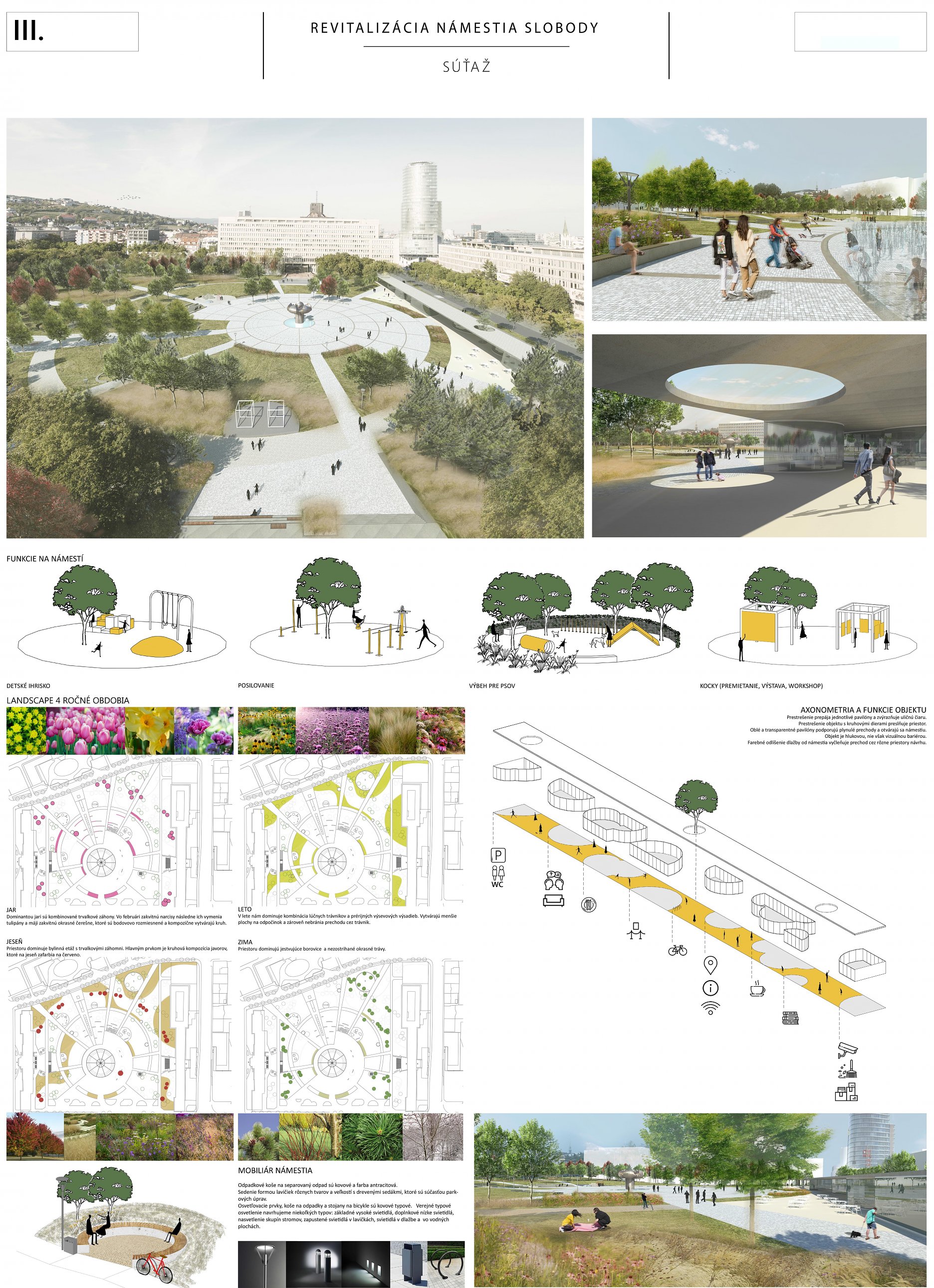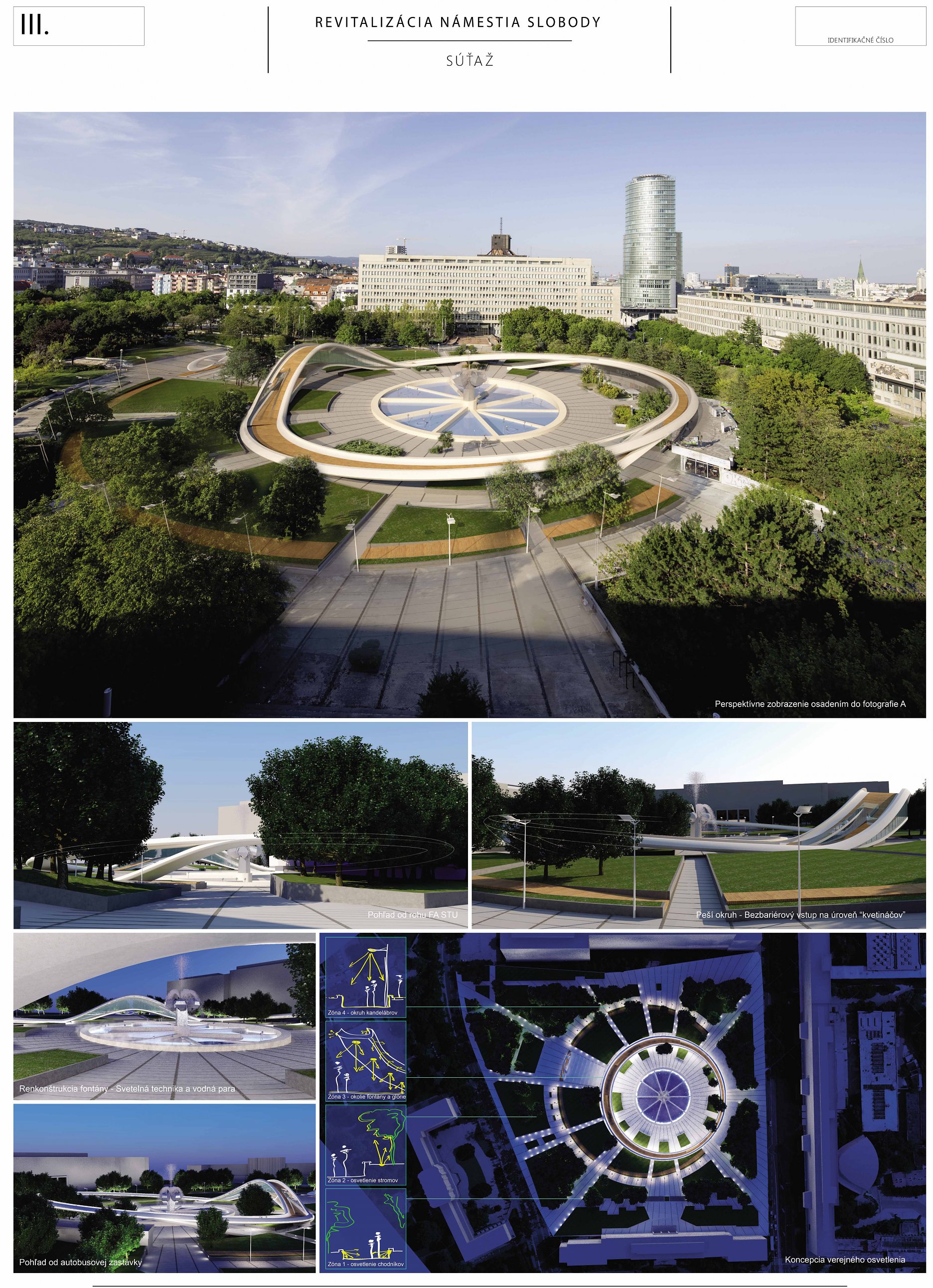 Ocenený návrh zásadne reagoval, či v grafickej alebo stručne v textovej časti (napr. k adaptácii na zmenu klímy, opatrenia v súvislosti so zeleňou, mobiliárom a pod.) na všetky požadované kritériá novej podoby námestia. Svoju kvalitu zakladá na pôvodnom architektonickom návrhu a zohľadňujúc potreby prevádzky, údržby, udržateľnosti a pod. ho "faceliftuje". Podobne, ako mobiliár, ide podľa autorov o kvalitný dizajn vhodný pre dané miesto. Navrhujú využitie súčasných svietidiel (pozn. poroty: tieto však nie sú pôvodné a ani technickými parametrami nespĺňajú požadovanú energetickú udržateľnosť). Svoj postoj autori vysvetľujú v sprievodnej správe: