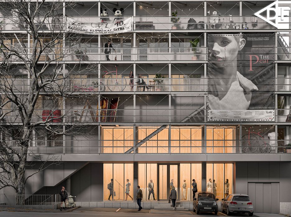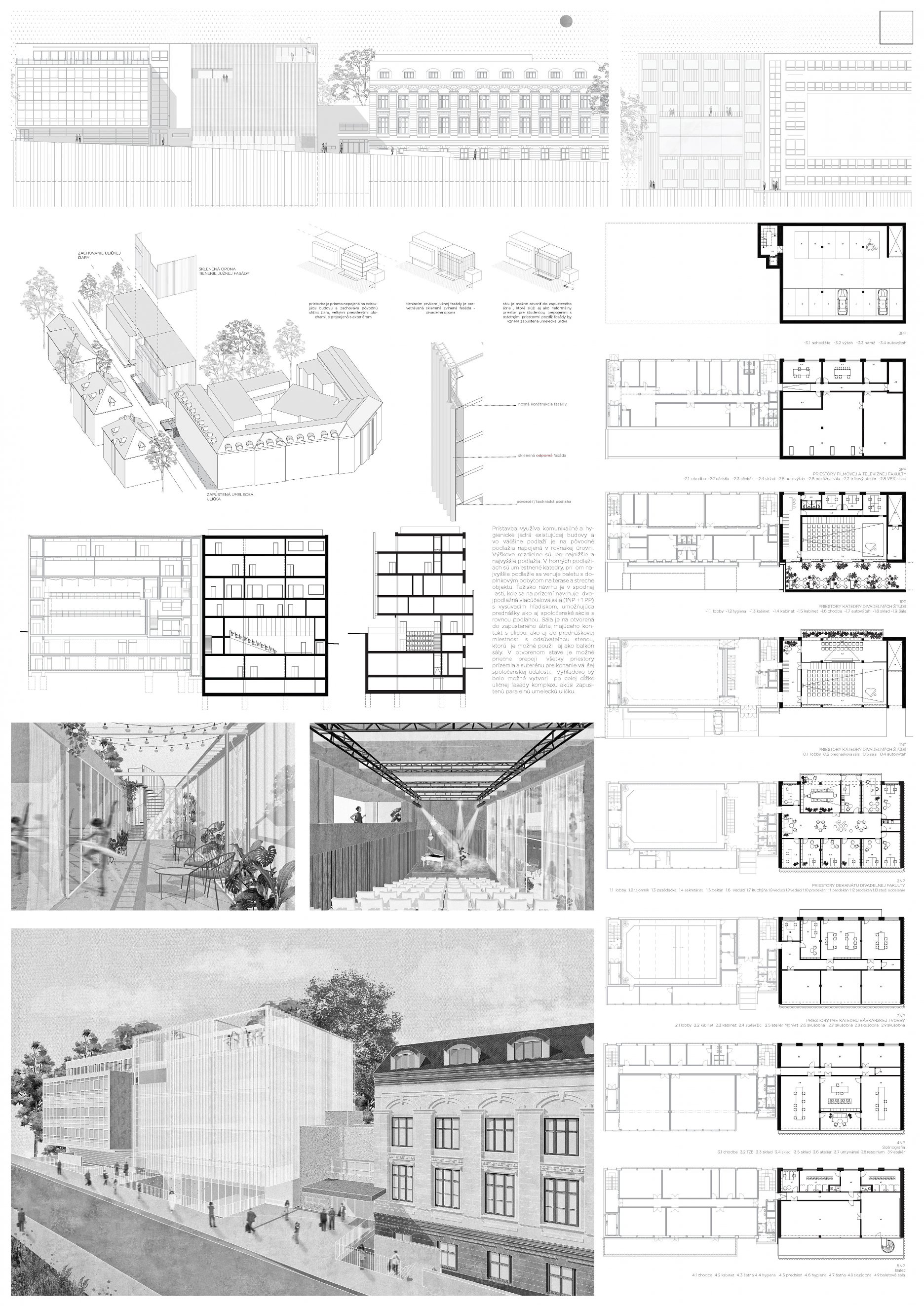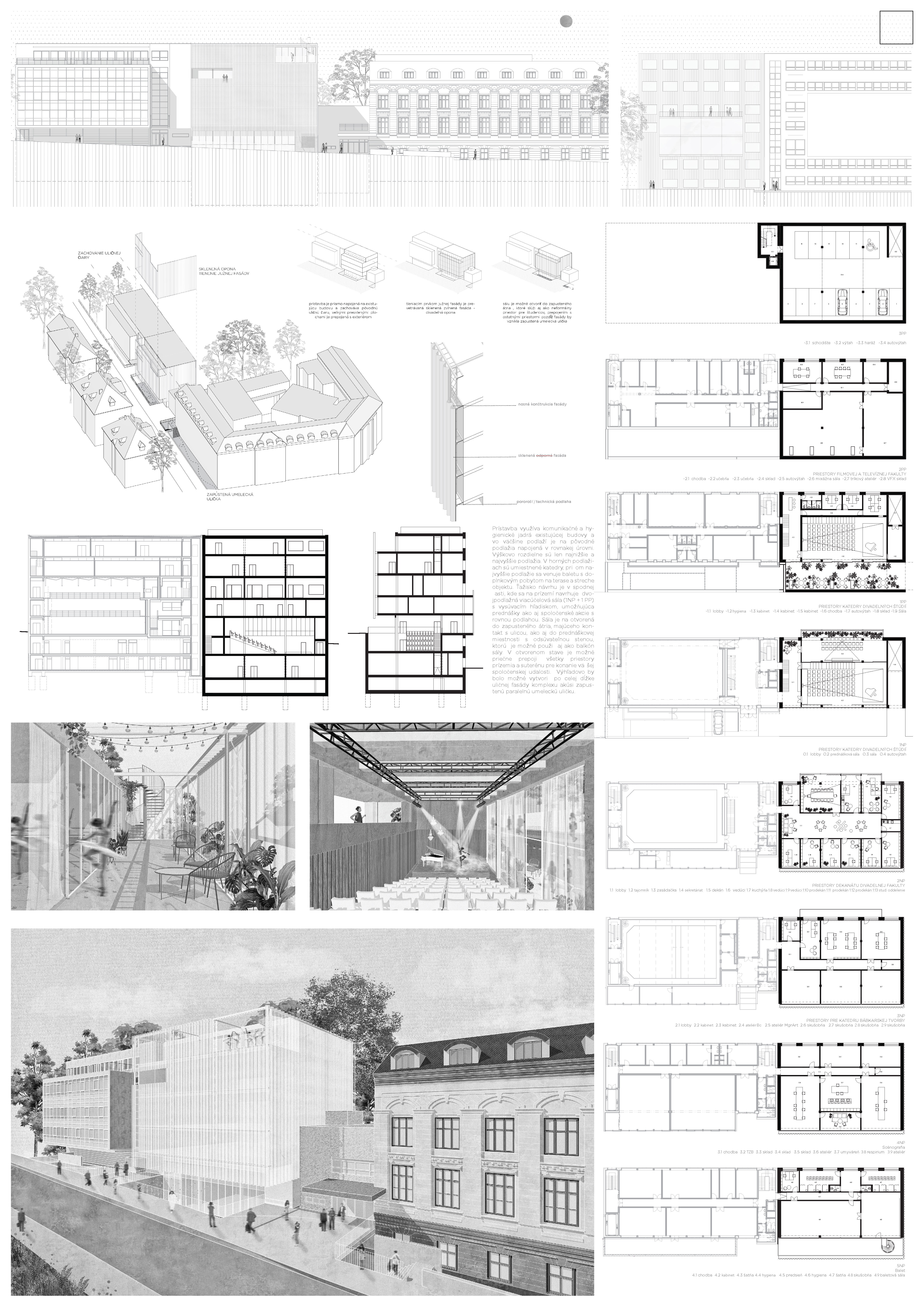 Budova je navrhnutá s jasne vyjadreným architektonickým rukopisom, ktorý v sebe spája aktuálny vzhľad s citáciou kordónových ríms okolitých stavieb. Diagonálne, pílové elementy na streche a v parteri, spolu s výklopnými markízami poskytujú budove originálnu, ľahko odlíšiteľnú identitu, ktorá by podliehala ďalšiemu schvaľovaniu v procese povoľovania. Návrh si v parteri volí variant zvýšeného predpolia a priečne vloženej otvorenej sály s preskleným zadným prospektom javiska. Takéto riešenie hodnotí porota z pohľadu uvažovanej multifunkčnej prevádzky ako limitujúce, napriek vizuálnym kvalitám a pozitívnemu vplyvu na verejný priestor v predpolí budovy. Jasne navrhnutý nosný systém v kombinácii s ľahkými a mobilnými priečkami prispievajú k flexibilite a variabilite priestorov.