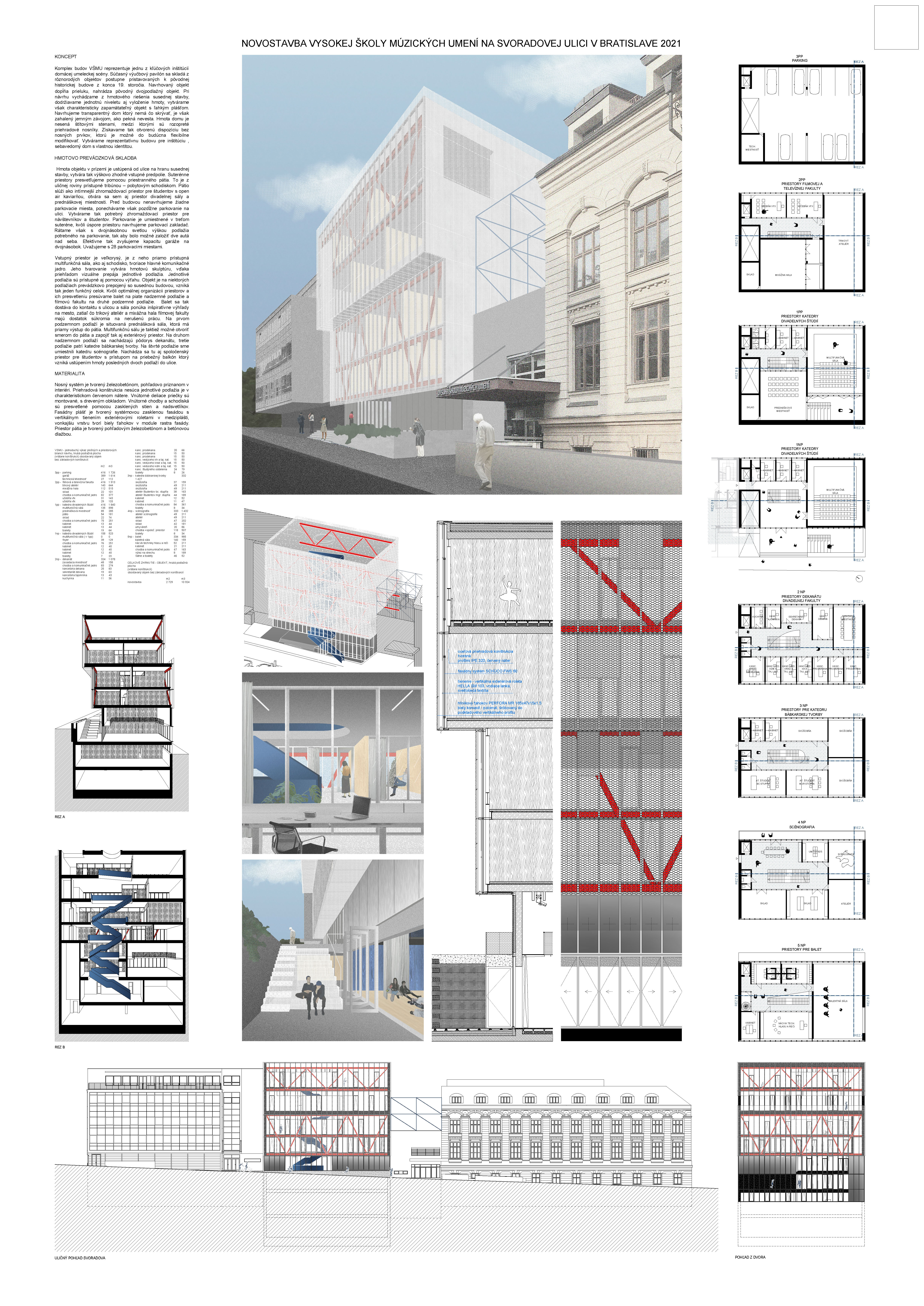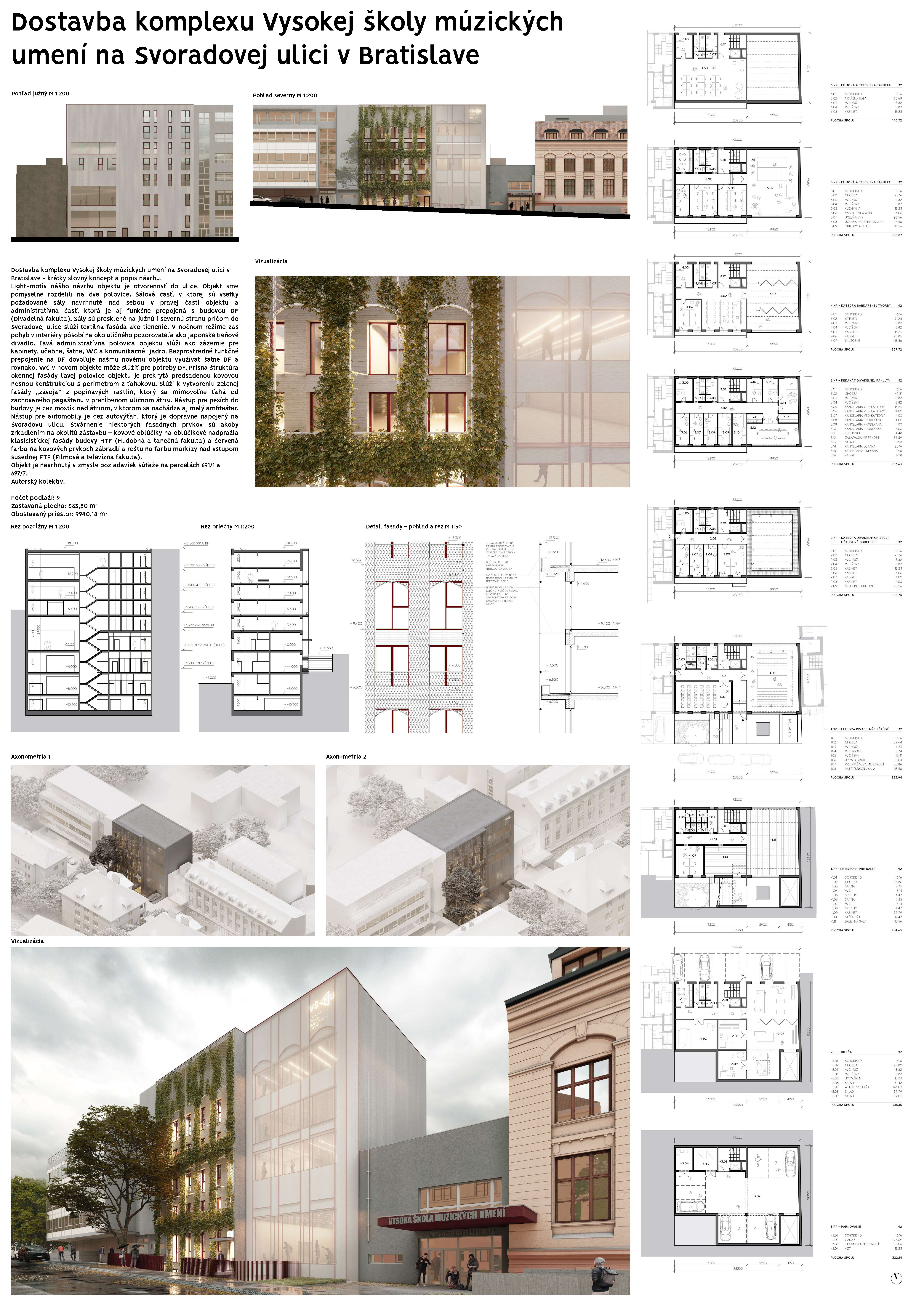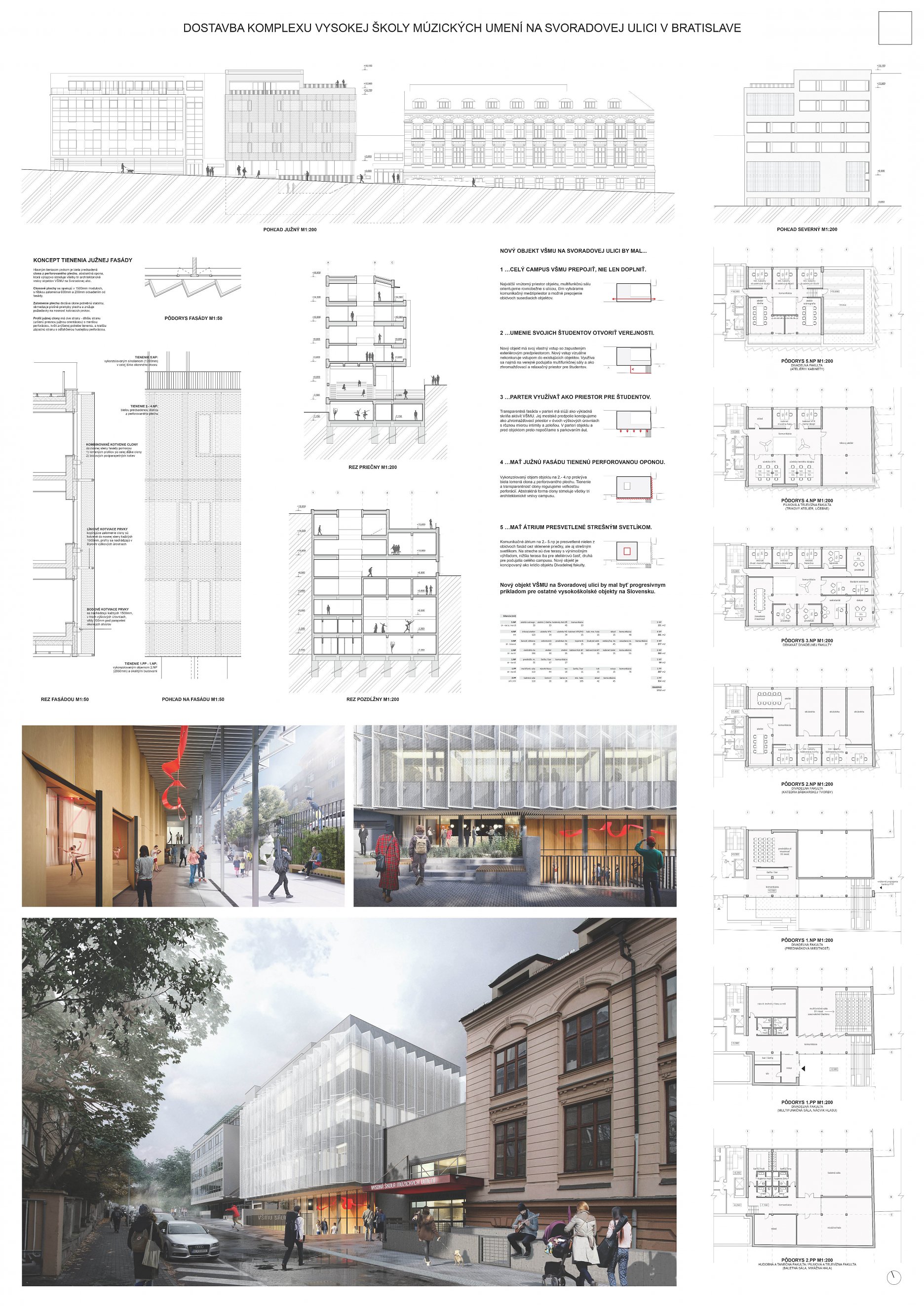 Reprezentant „oponovej“ architektúry, ktorý podľa hodnotenia poroty najlepšie využil túto formalistickú ideu v prospech kvality architektonického návrhu. Vrstvenie a tektonika fasády, striedanie jej otvorenosti a uzavretosti vytvárajú vyváženú a vkusnú kompozíciu, harmonicky dopĺňajúcu prieluku v obraze Svoradovej ulice. Dominantný presklenie multifunkčnej sály s priehľadom zo schodov spájajúcich ulicu so Zámockou ulicou skreslene evokuje dojem hlavného vstupu do objektu. Uzavretý dvor v uličnom profile pred budovou má potenciál slúžiť ako chránený exteriérový priestor pre študentov školy. Návrh je nejasný v riešení dispozície, najmä koncepcie sálových priestorov a z pohľadu prevádzkových nárokov školy by vyžadoval viaceré zmeny.