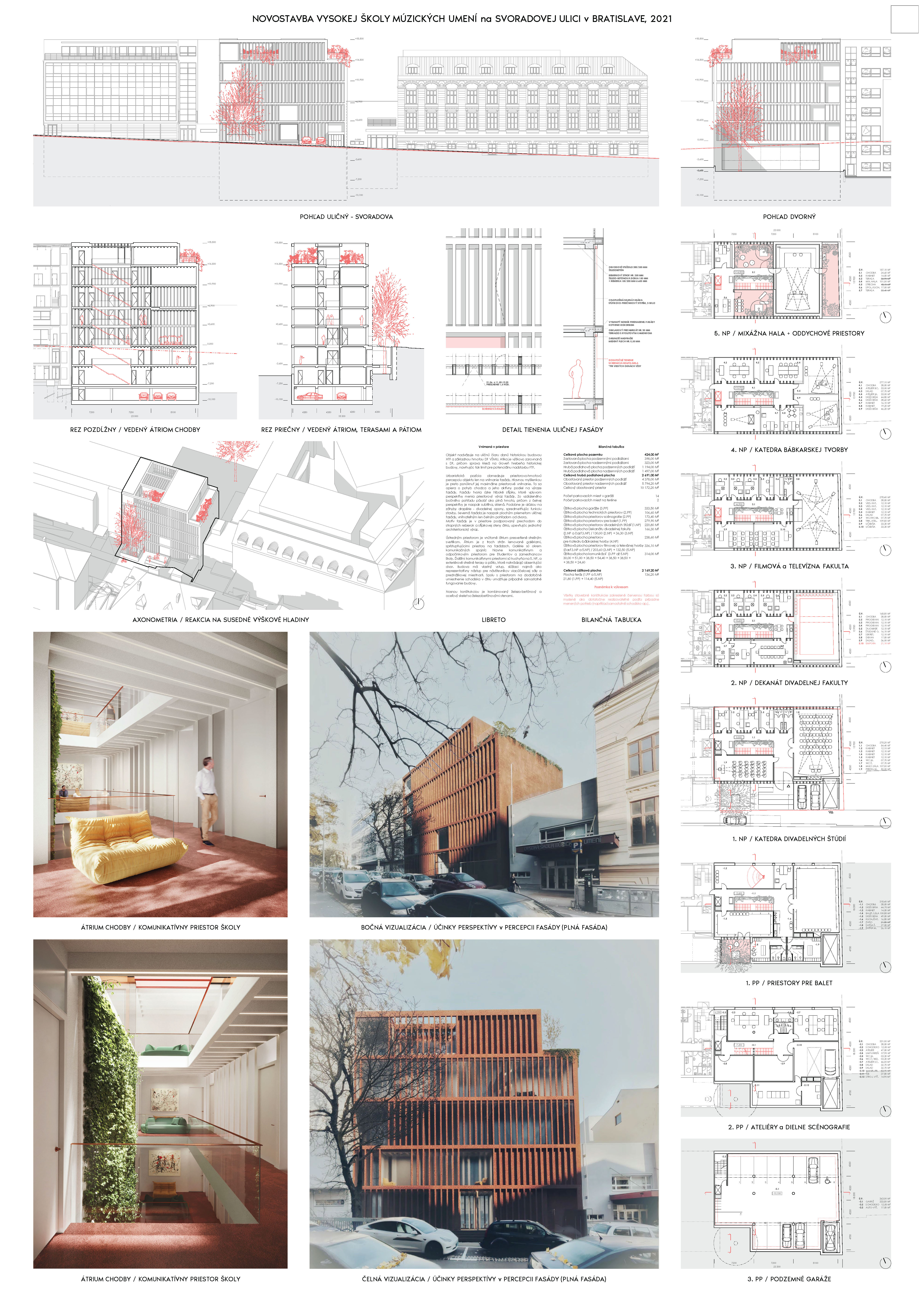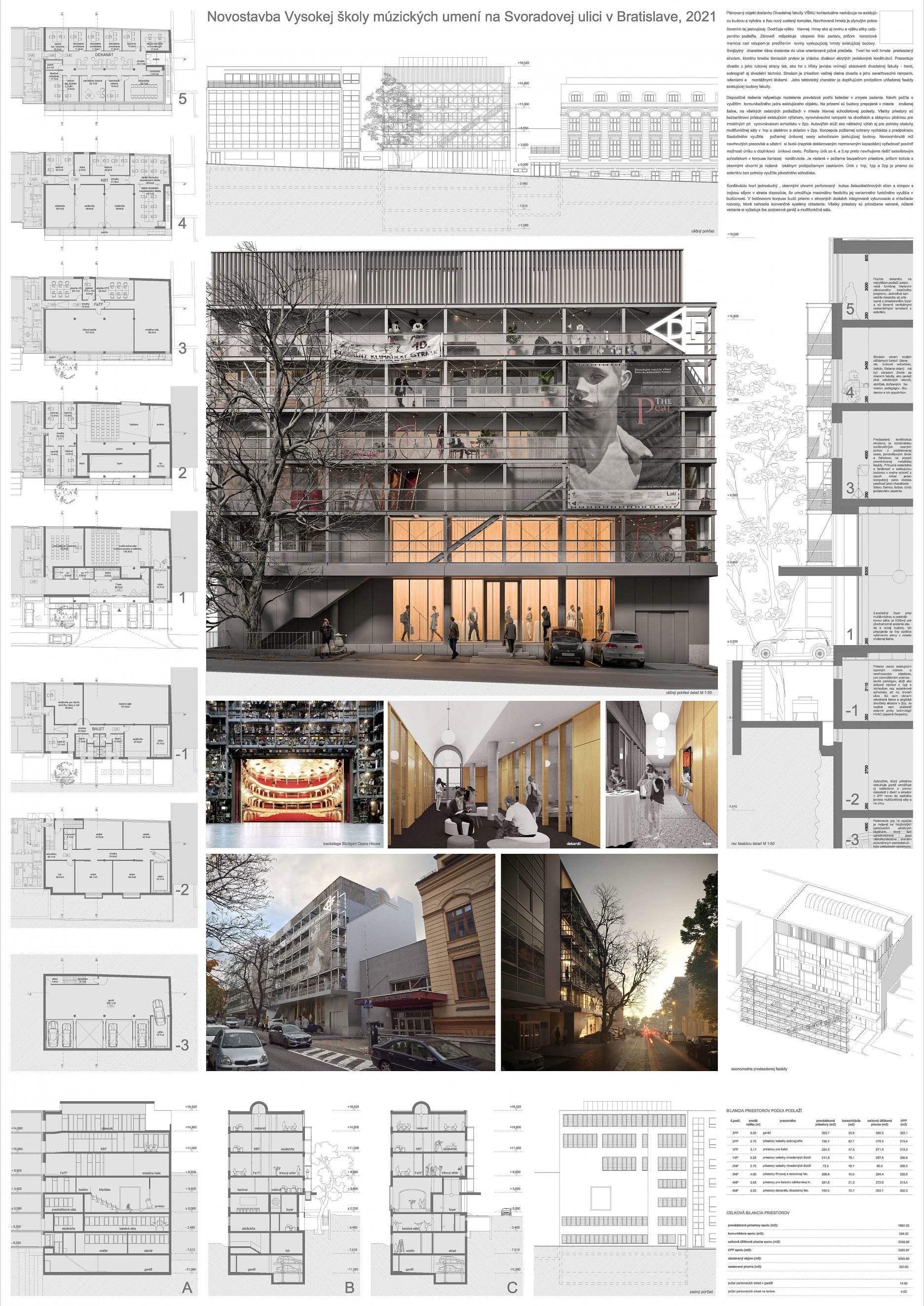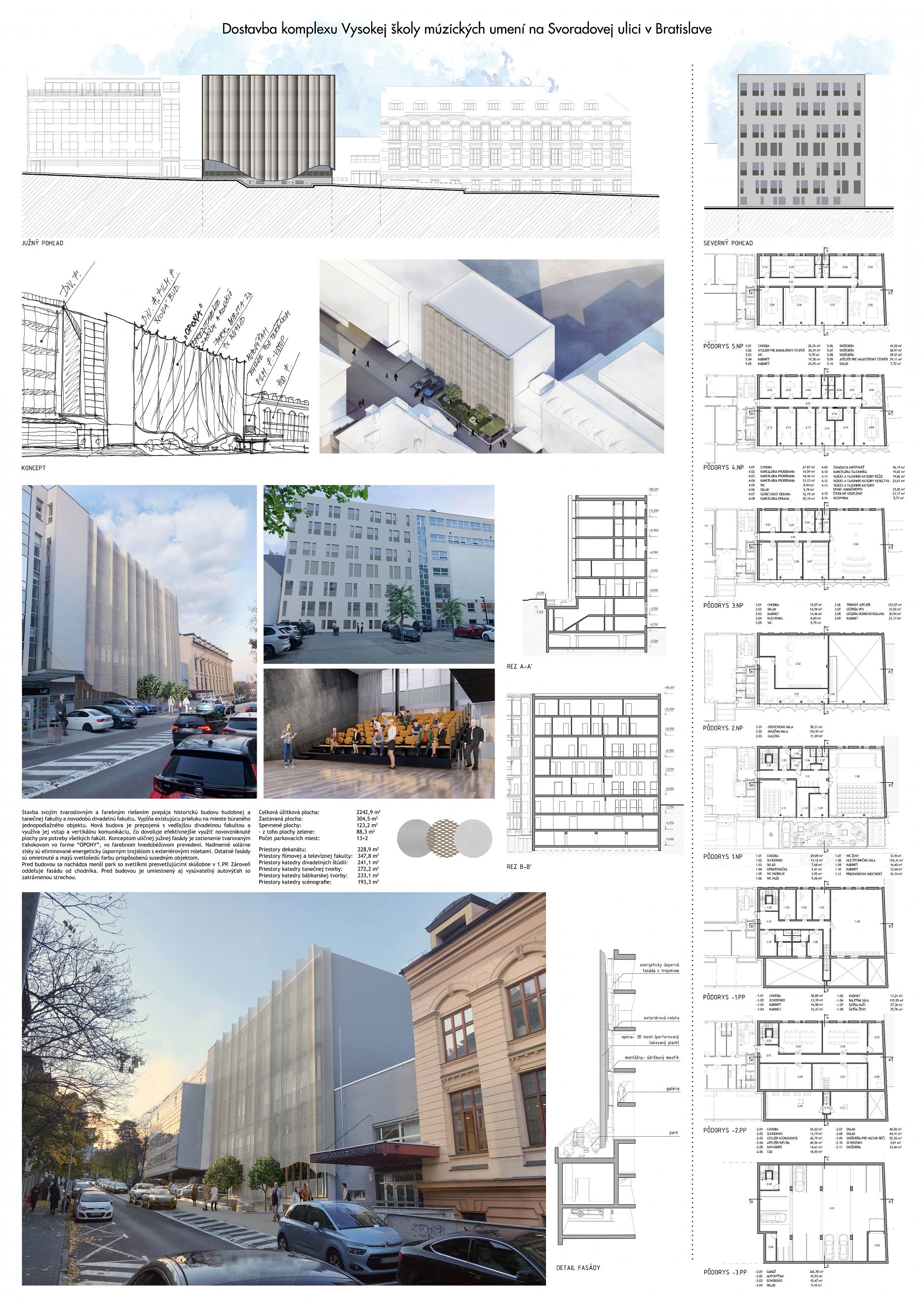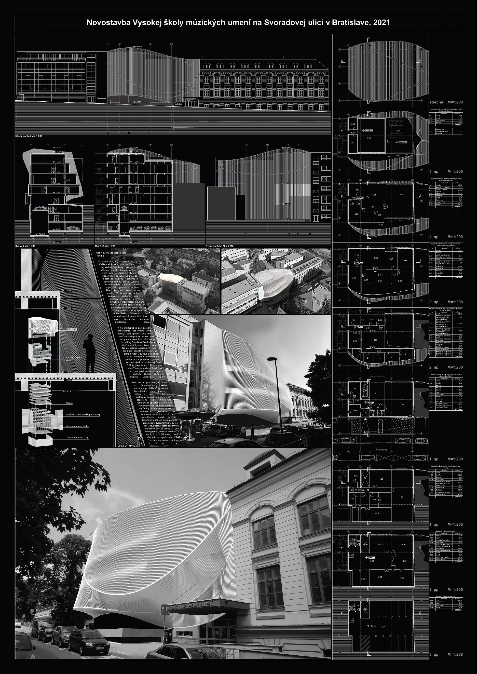 Reprezentant „oponovej“ architektúry, ktorý podľa hodnotenia poroty najlepšie využil túto formalistickú ideu v prospech kvality architektonického návrhu. Vrstvenie a tektonika fasády, striedanie jej otvorenosti a uzavretosti vytvárajú vyváženú a vkusnú kompozíciu, harmonicky dopĺňajúcu prieluku v obraze Svoradovej ulice. Dominantný presklenie multifunkčnej sály s priehľadom zo schodov spájajúcich ulicu so Zámockou ulicou skreslene evokuje dojem hlavného vstupu do objektu. Uzavretý dvor v uličnom profile pred budovou má potenciál slúžiť ako chránený exteriérový priestor pre študentov školy. Návrh je nejasný v riešení dispozície, najmä koncepcie sálových priestorov a z pohľadu prevádzkových nárokov školy by vyžadoval viaceré zmeny.