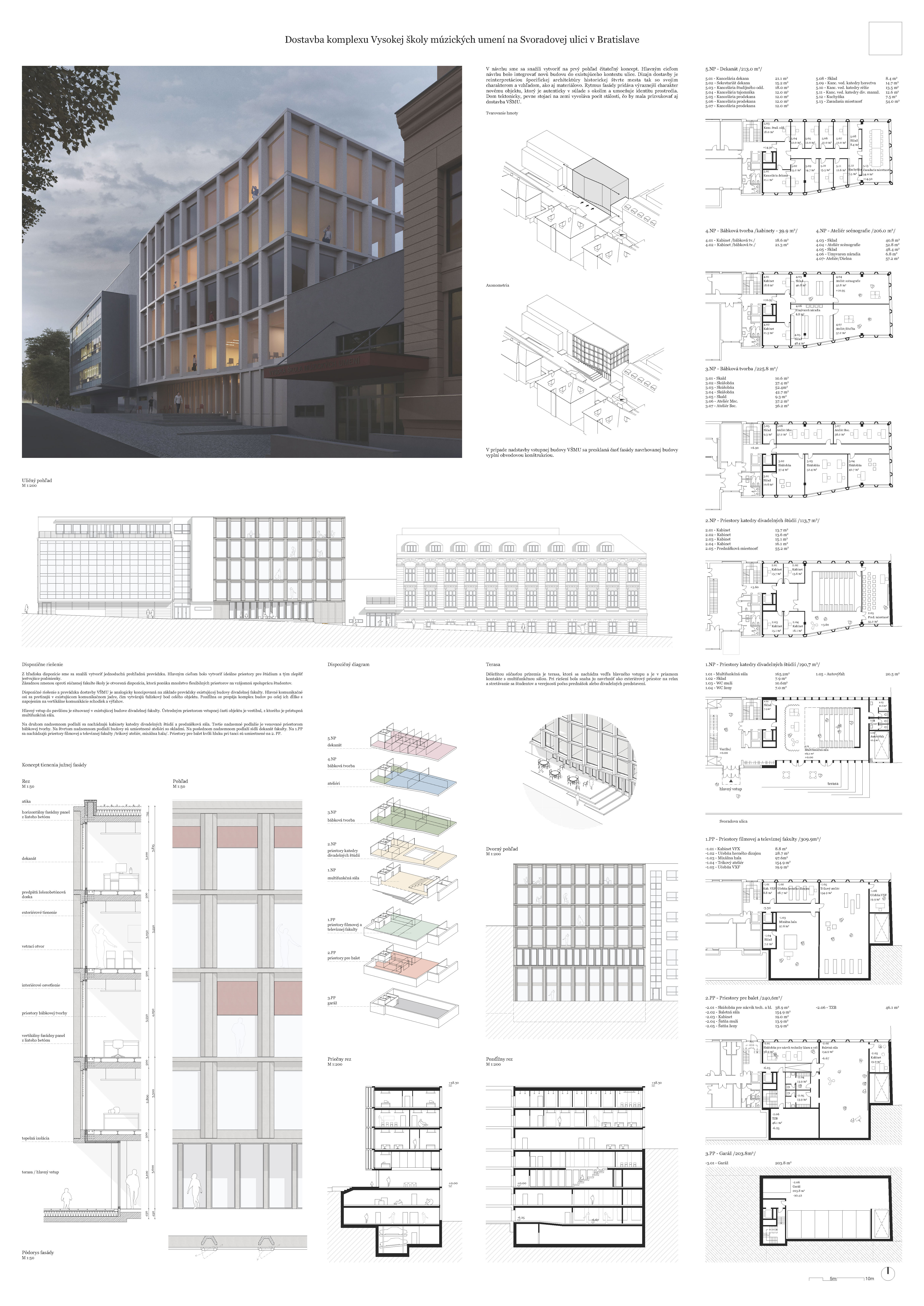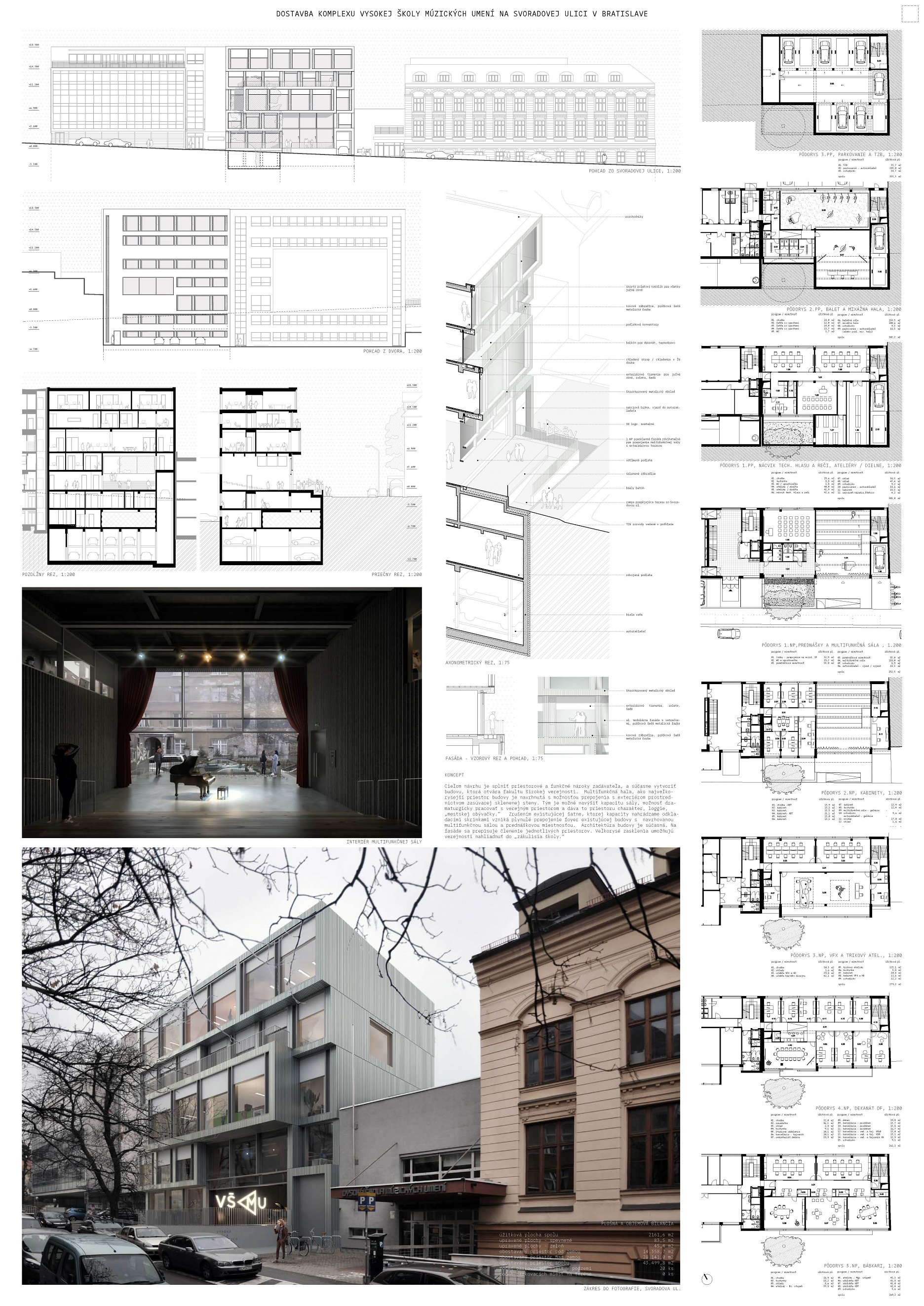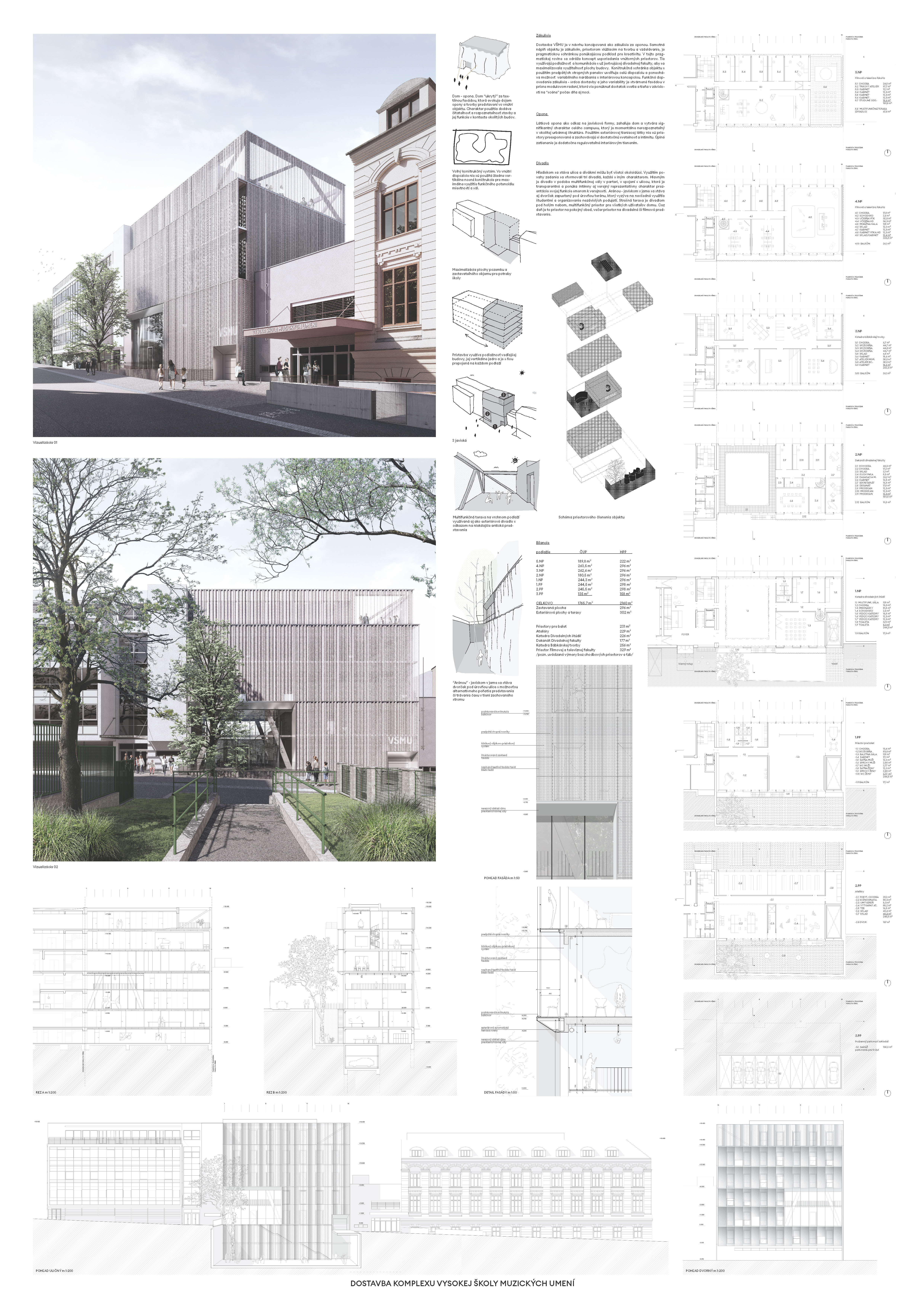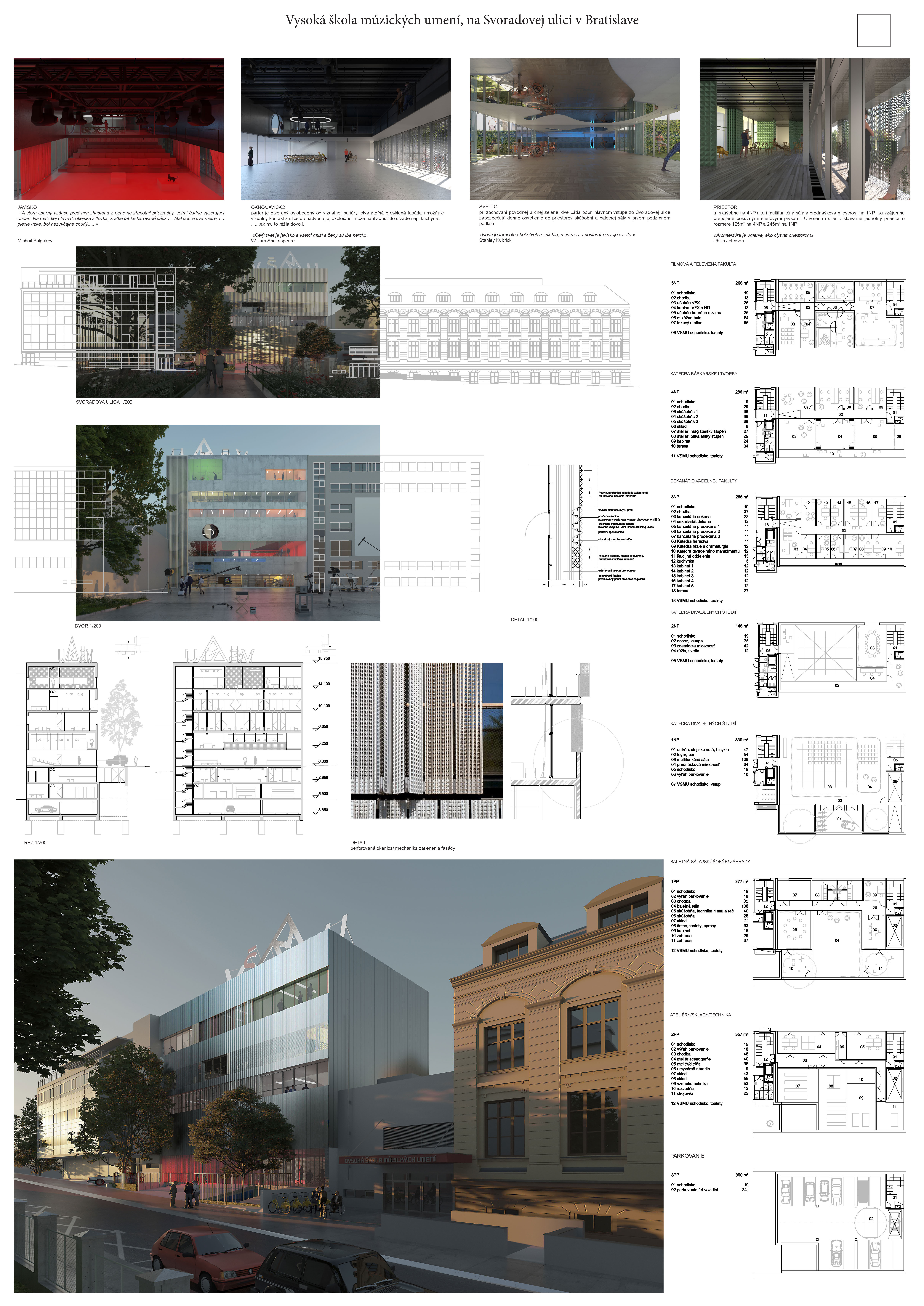 Navrhnutá dispozícia je riešená v súlade so zadaním a primerane rešpektuje rozdelenie prevádzok podľa požiadavky vyhlasovateľa. Riešenie fasády s predsadenými pavlačami porota vyhodnotila z viacerých aspektov ako zodpovedajúce potrebám dostavby školy, poskytujúce vhodné pasívne tienenie fasády a tiež exteriérovú pobytovú plochu na každom podlaží. Zároveň je, podľa názoru poroty, v navrhnutom rozsahu, vhodnou architektonickou formou pre vytvorenie charakteristickej identity pre komplex budov VŠMU. Porota, vrátane zástupcu vyhlasovateľa, kladne vníma ideu odhalenia javiskovej techniky ako „rubovej strany divadla“ vyjadrenú celkovým vzhľadom návrhu dostavby. Objekt tak sympaticky komunikuje svoj obsah do ulice aj do verejného priestoru v predpolí. Vhodnosť a účelnosť navrhnutého vonkajšieho schodiska, nad rámec jeho kompozičnej funkcie vo fasáde, vyžaduje ďalšie posúdenie.