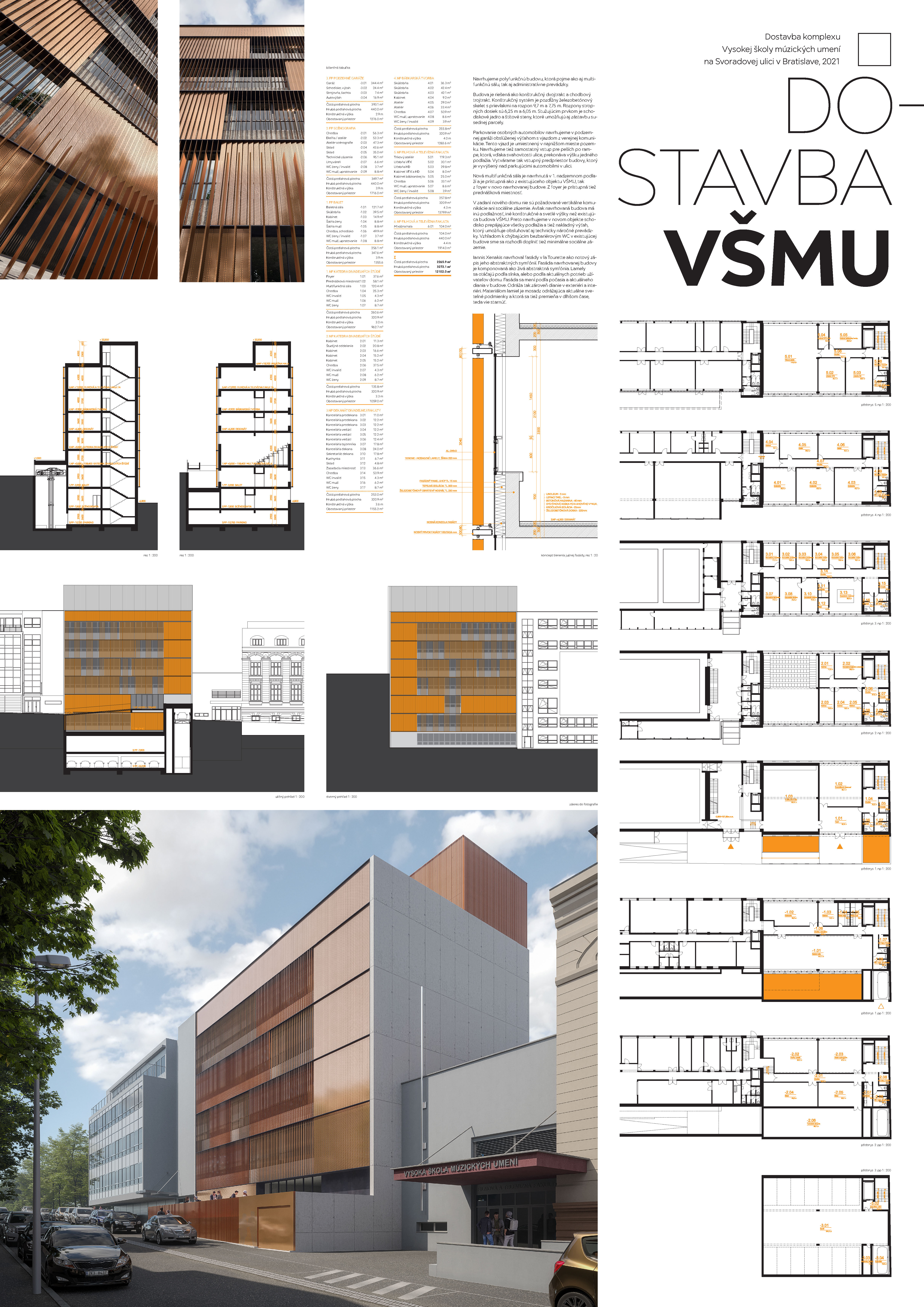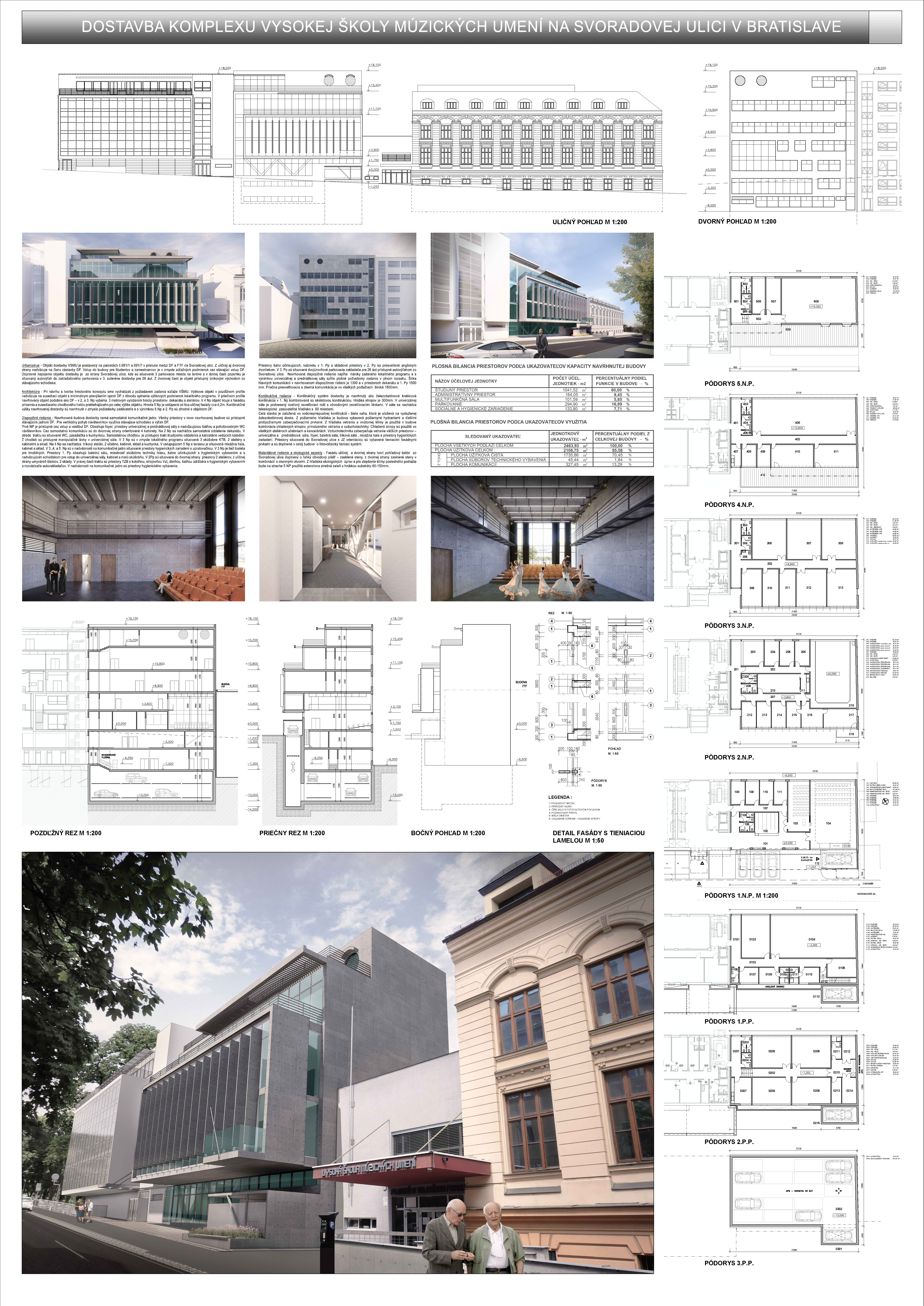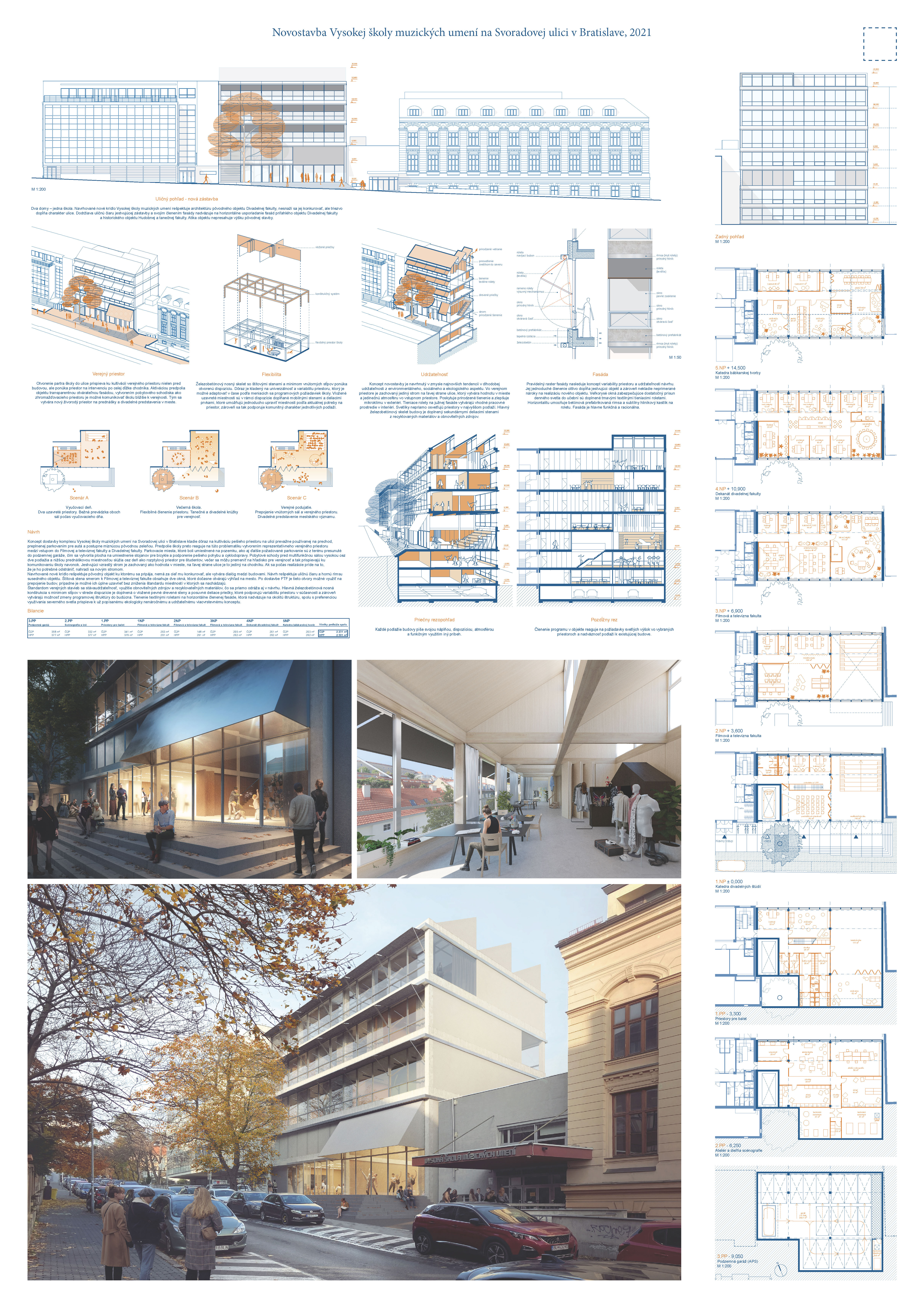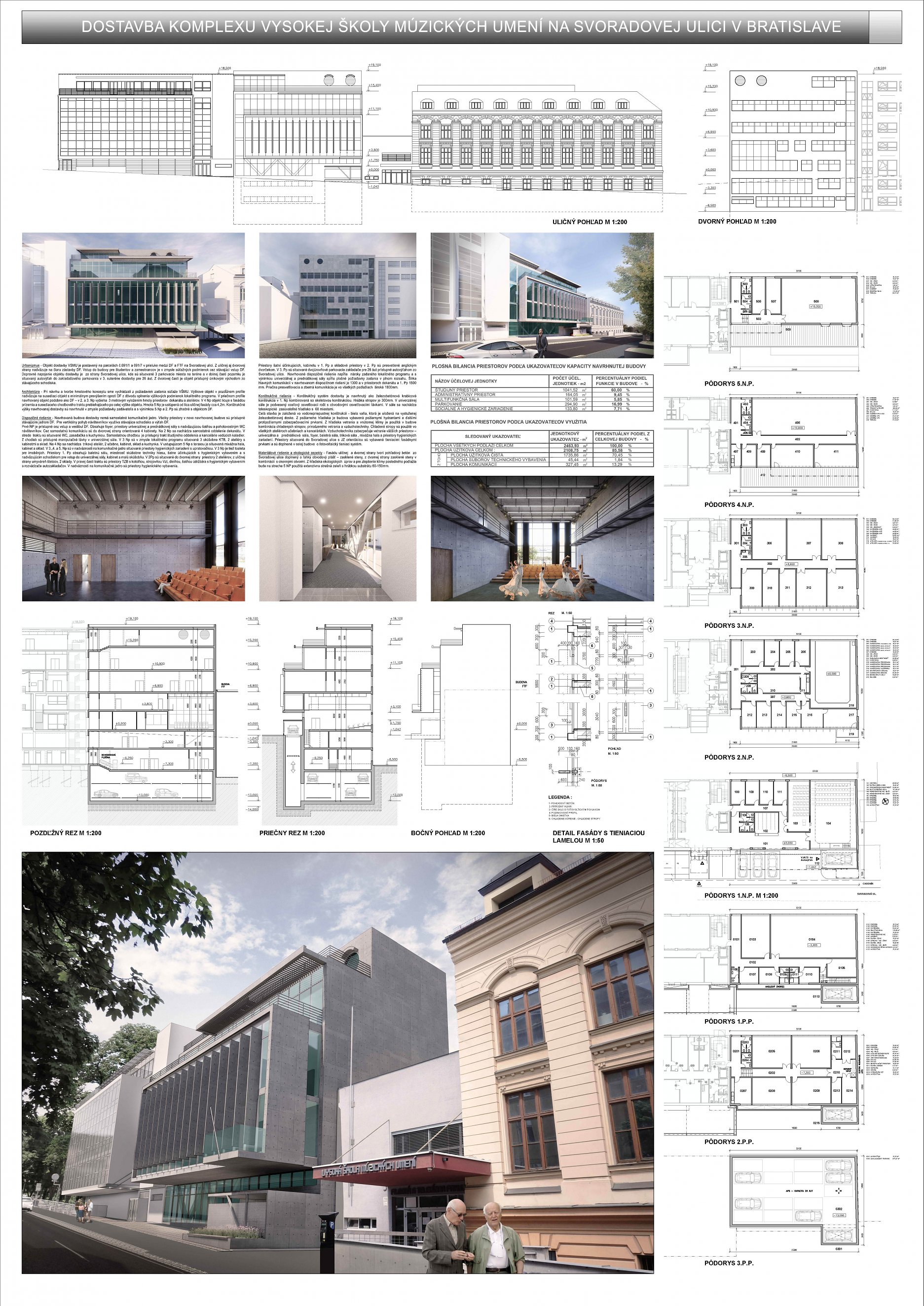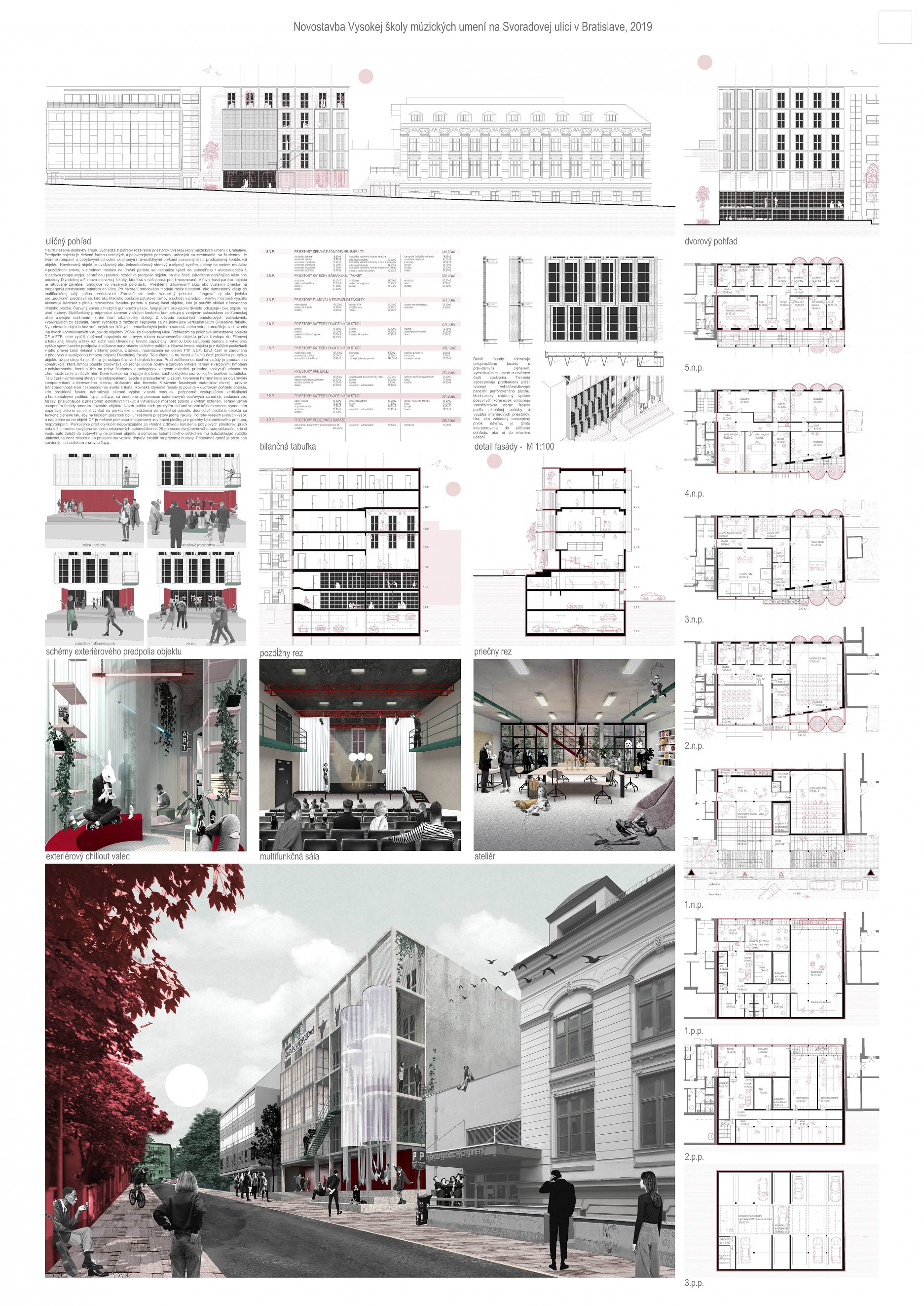 Navrhnutá dispozícia je riešená v súlade so zadaním a primerane rešpektuje rozdelenie prevádzok podľa požiadavky vyhlasovateľa. Riešenie fasády s predsadenými pavlačami porota vyhodnotila z viacerých aspektov ako zodpovedajúce potrebám dostavby školy, poskytujúce vhodné pasívne tienenie fasády a tiež exteriérovú pobytovú plochu na každom podlaží. Zároveň je, podľa názoru poroty, v navrhnutom rozsahu, vhodnou architektonickou formou pre vytvorenie charakteristickej identity pre komplex budov VŠMU. Porota, vrátane zástupcu vyhlasovateľa, kladne vníma ideu odhalenia javiskovej techniky ako „rubovej strany divadla“ vyjadrenú celkovým vzhľadom návrhu dostavby. Objekt tak sympaticky komunikuje svoj obsah do ulice aj do verejného priestoru v predpolí. Vhodnosť a účelnosť navrhnutého vonkajšieho schodiska, nad rámec jeho kompozičnej funkcie vo fasáde, vyžaduje ďalšie posúdenie.