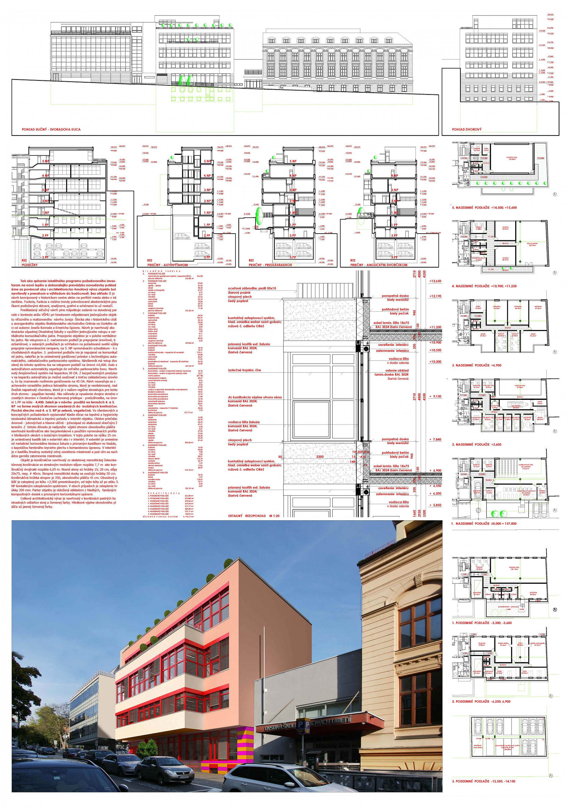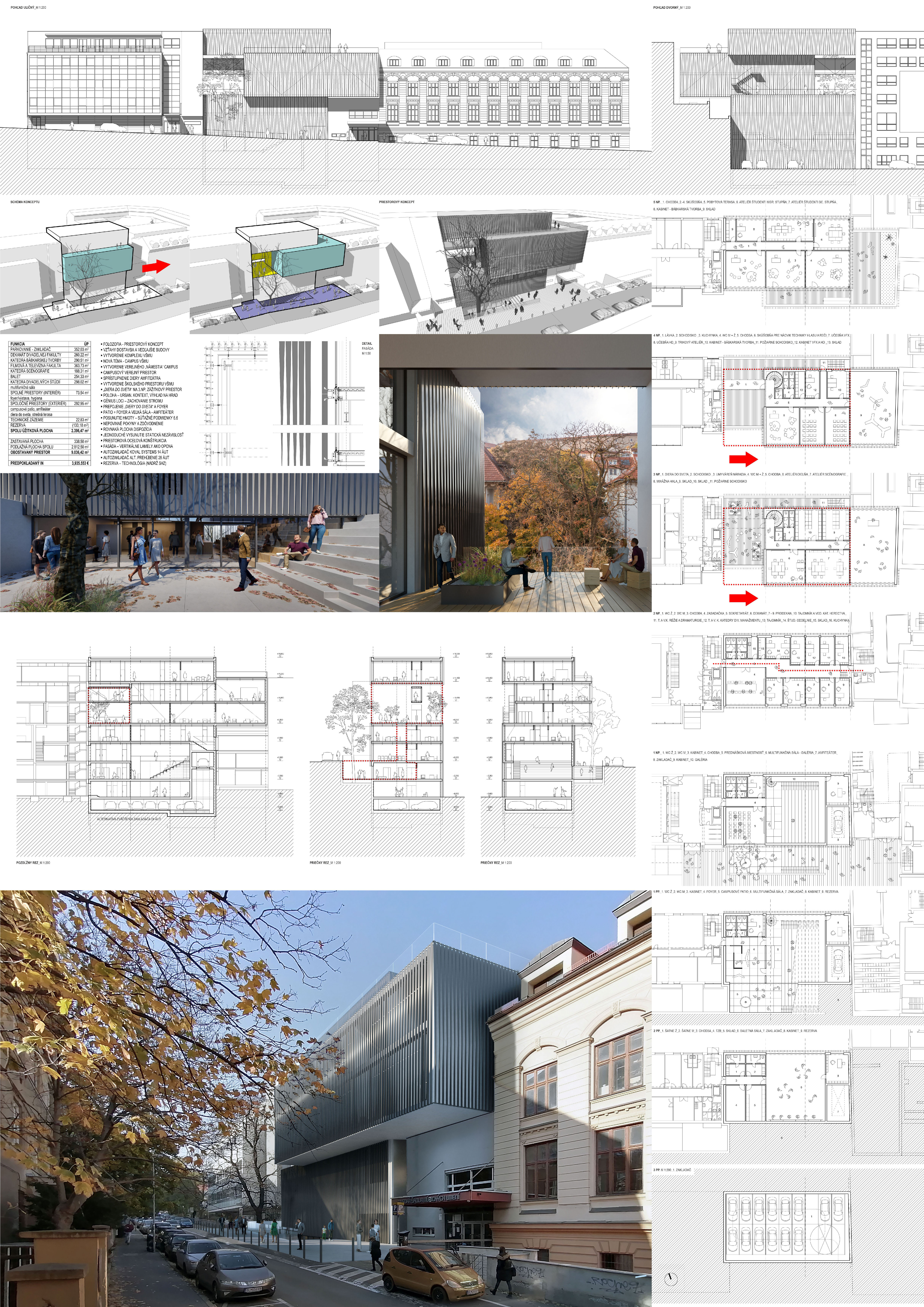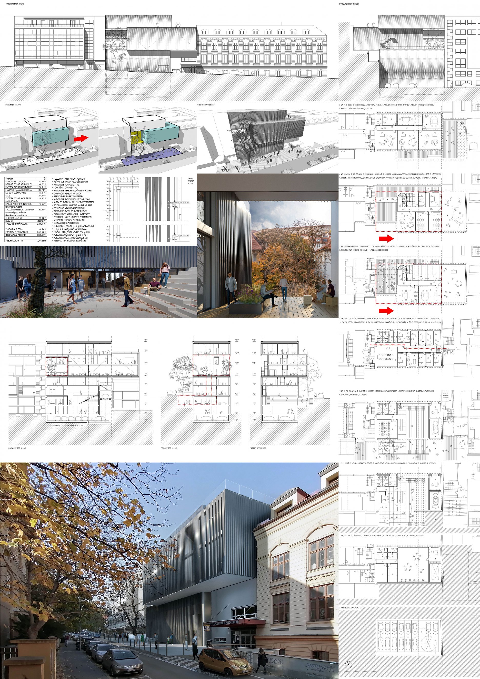 Návrh zaujal kvalitným riešením dispozičných vzťahov vytvárajúcich optimálny model prevádzky školy v novej budove. Príkladná je tiež práca s parterom a predpolím budovy, ktorá prirodzene využíva konfiguráciu terénu na zaujímavé otvorenie predpolia sálových priestorov do ulice. Porota v diskusii a hodnotení takéhoto konceptu vníma aj určité limity ponechania „jamy“ pred budovou, a to najmä z hľadiska bezbariérového prístupu, ako aj kontroly využívania exteriérových plôch.