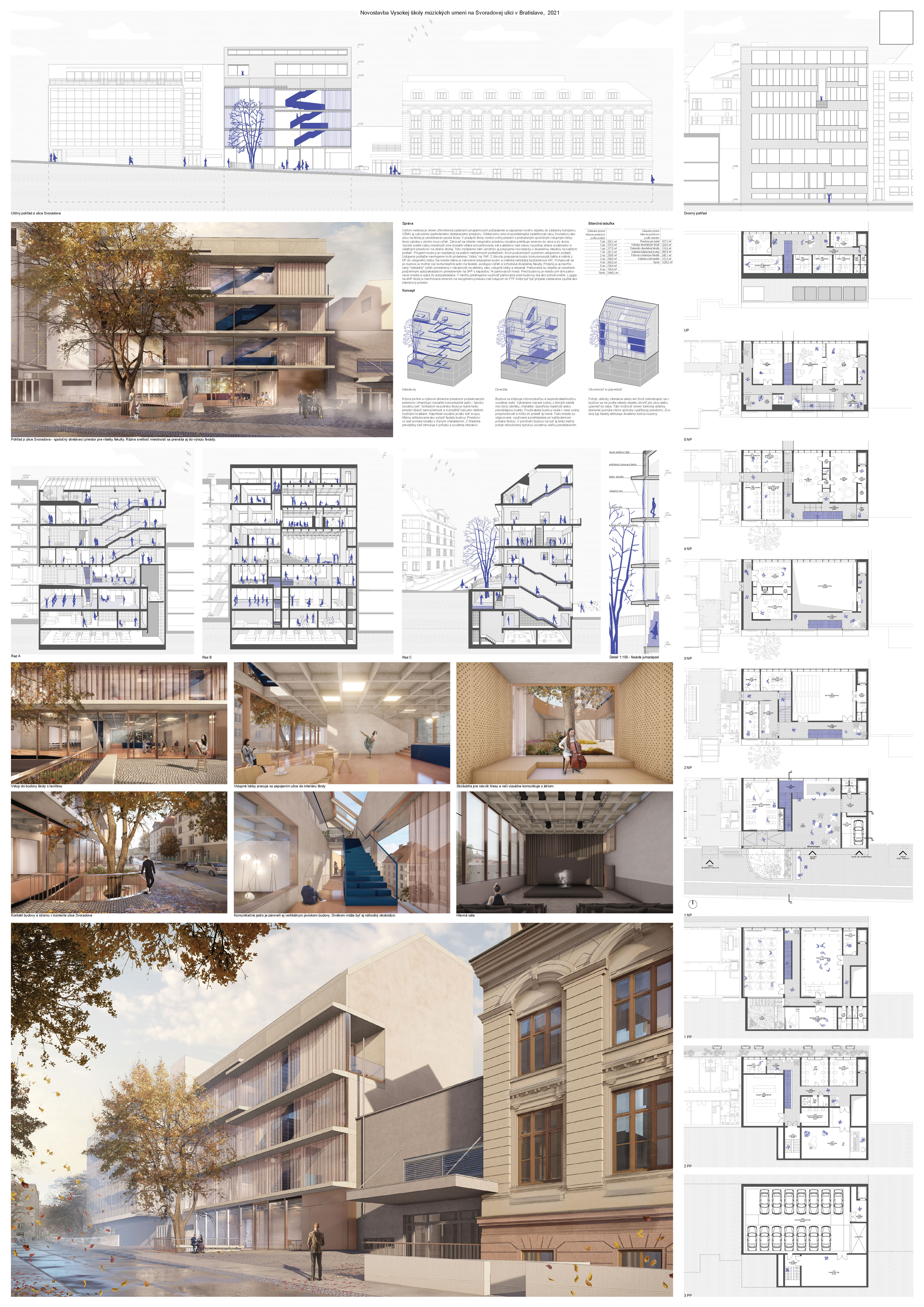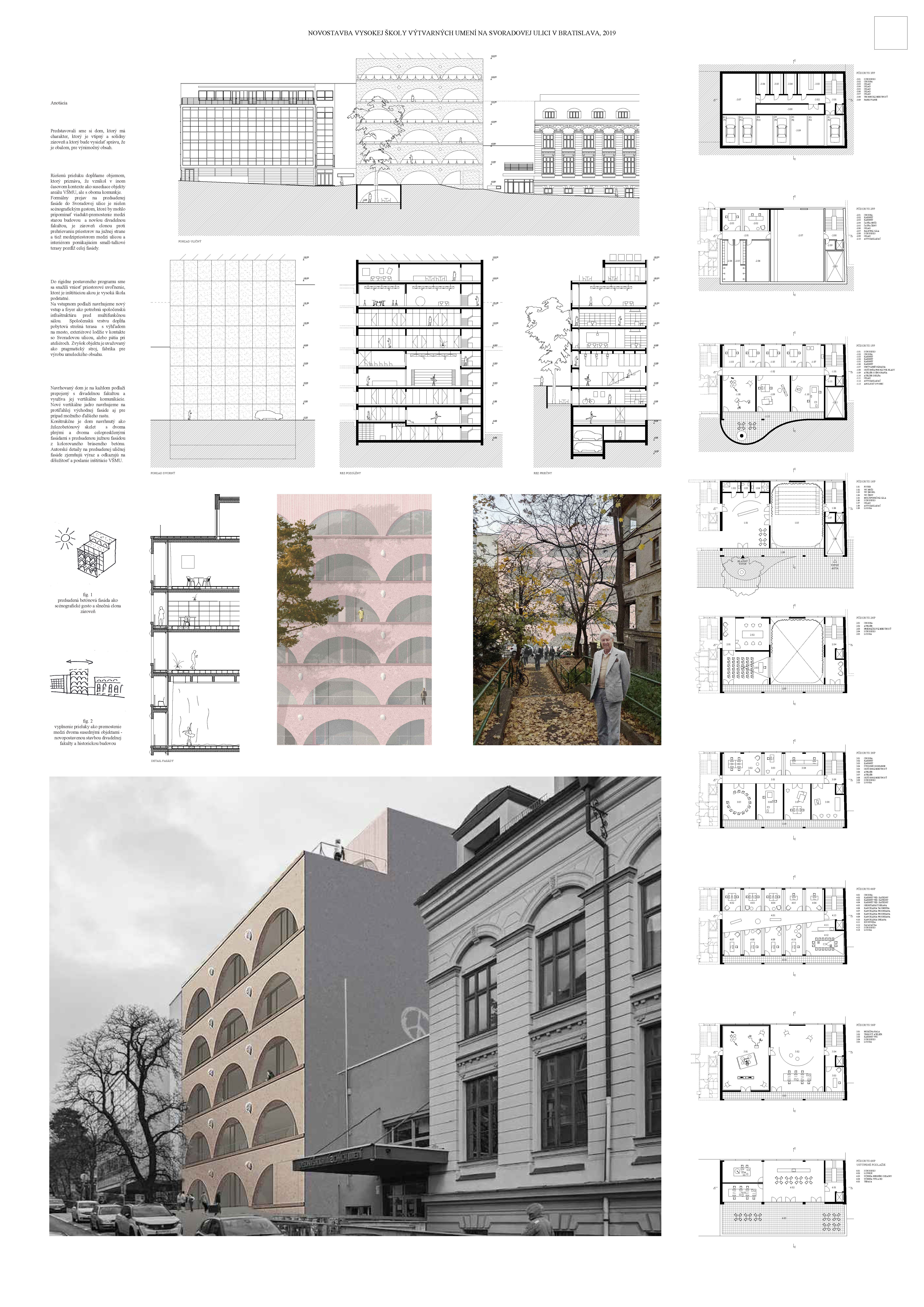 Kvalitou návrhu je strohý architektonický výraz, takmer indiferentný k miestu i času svojho vzniku, ktorý v kombinácii s minimalizovaným objemom vytvára efekt subtílnej monumentality architektúry. Elementárna forma budovy a klasicizujúci vertikálny raster terazzovej fasády, prechádzajúci viditeľne naprieč stavbou vo forme rebrového stropu, pôsobia ako primerané funkcii objektu a môžu sa stať vhodnou „kulisou“ umeleckej školy. Porota kladne hodnotí aj kompaktné dispozičné riešenie a s tým súvisiacu ekonomickosť návrhu, tá je však čiastočne eliminovaná náročným konštrukčným riešením fasády. Otvorenie a prepojenie dispozície cez sedem podlaží je diskutabilné z pohľadu prevádzky, ako aj splnenia požiadaviek protipožiarnej bezpečnosti.
