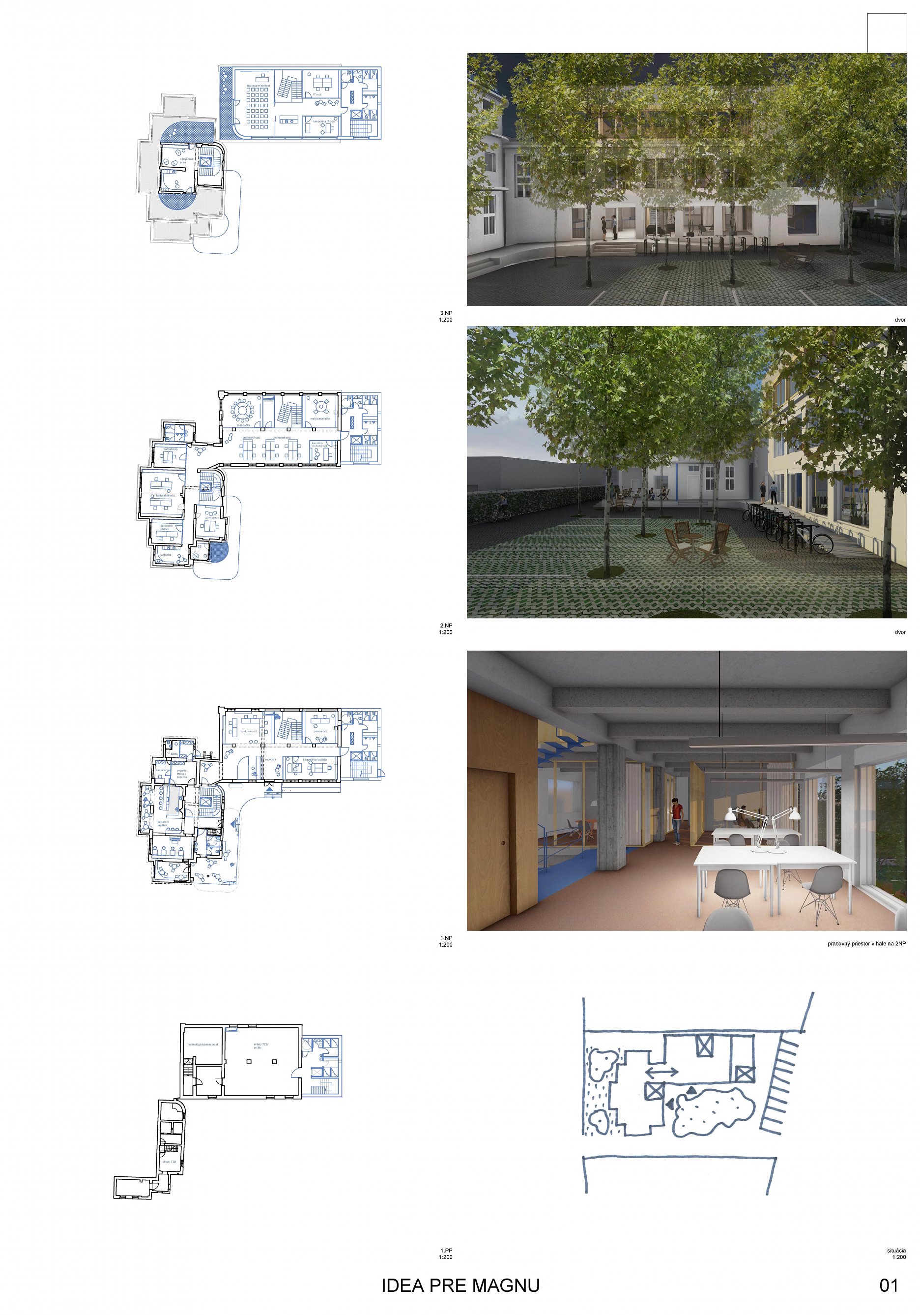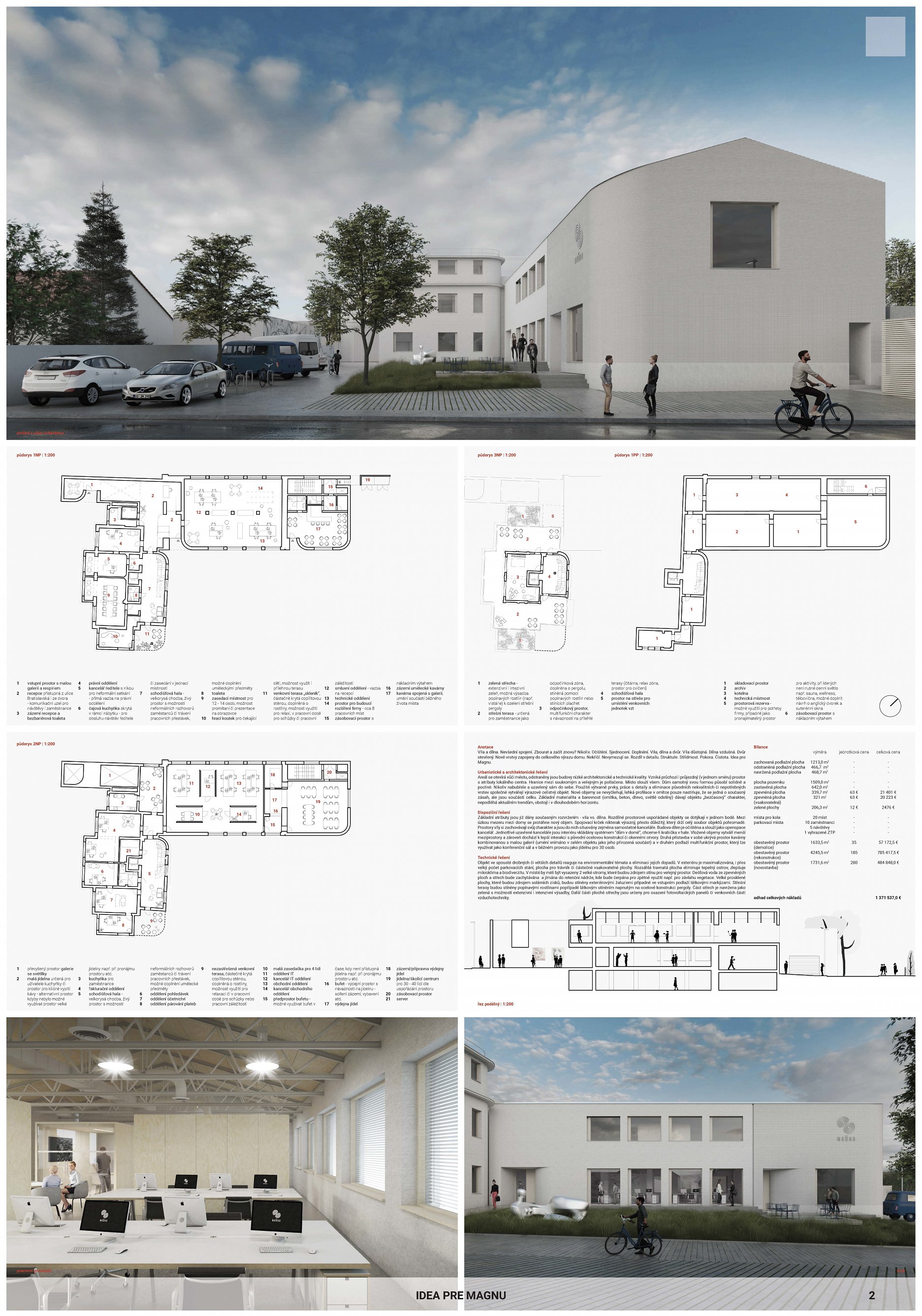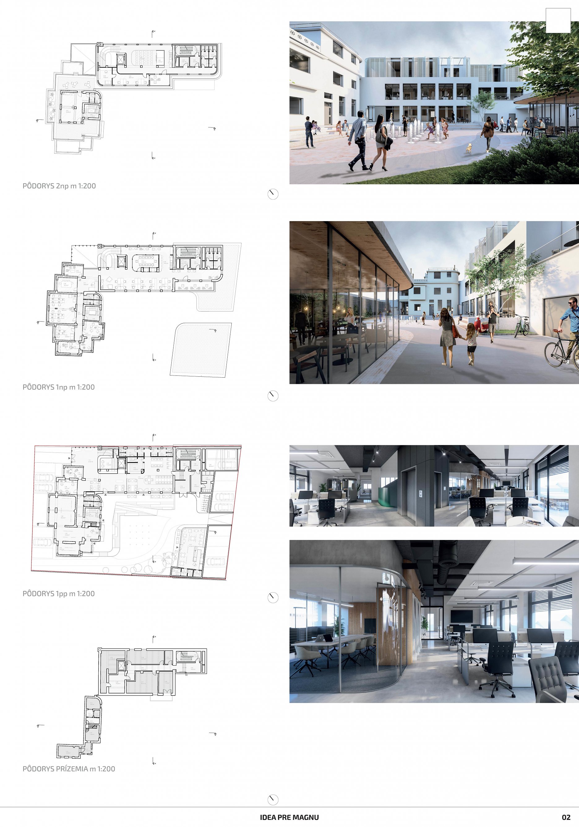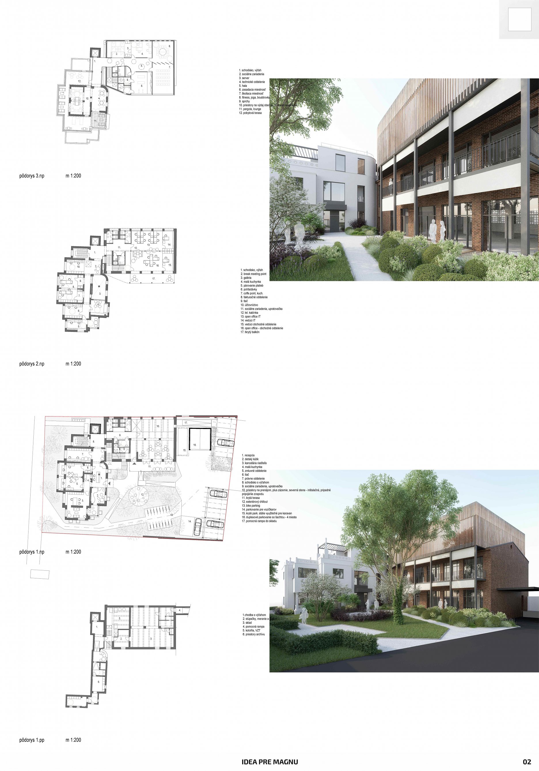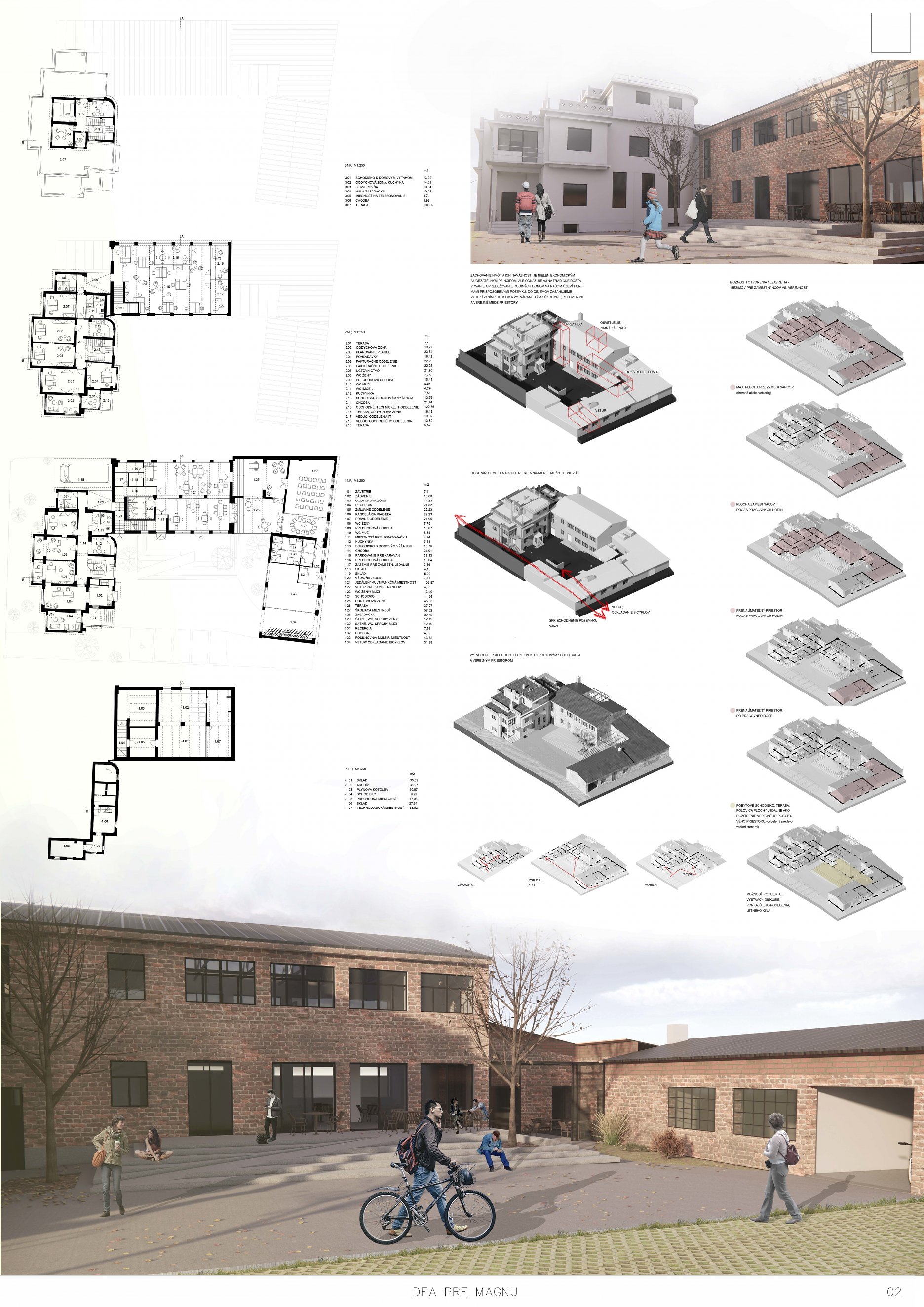 Porota v návrhu ocenila minimalizovanie búracích prác, a tým aj celkového ekologického dopadu výstavby, kedy autor počíta s usporiadaním celej dispozície do existujúcich objektov. Návrhu však chýba zaujímavý detail a prehĺbenie nastaveného konceptu. Tehlová fasády nie je pôvodná a vytvára zbytočne historizujúci dojem.
