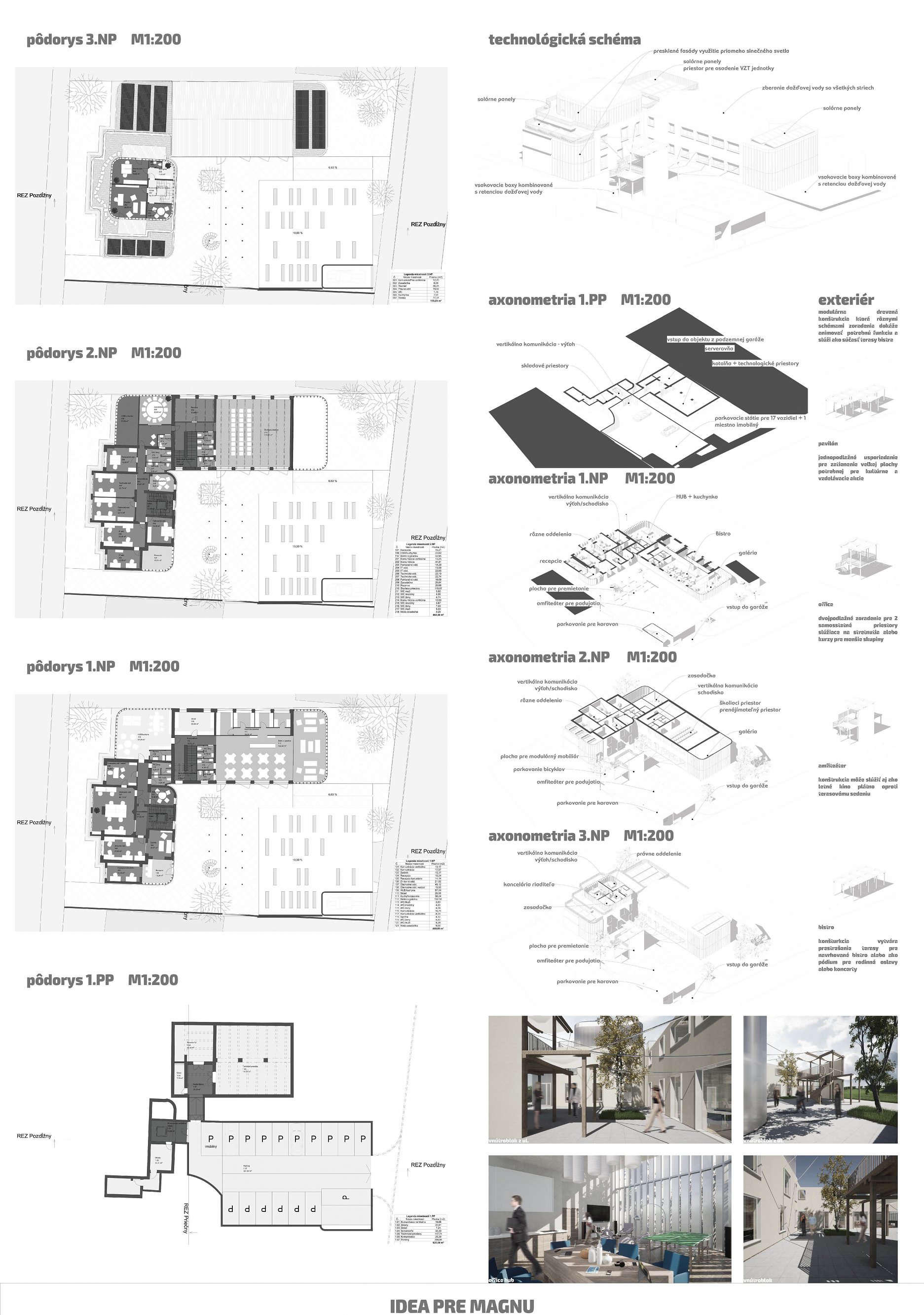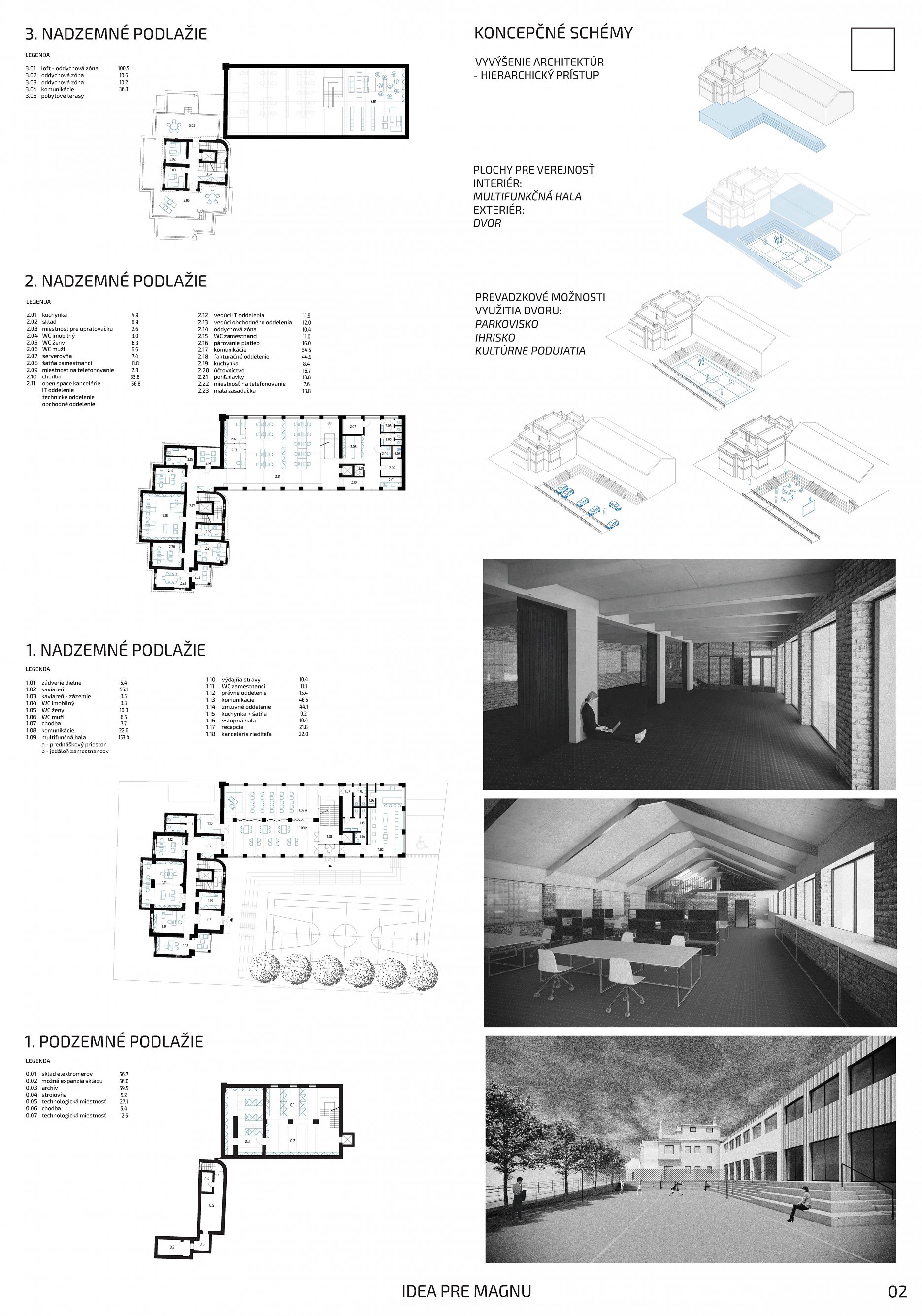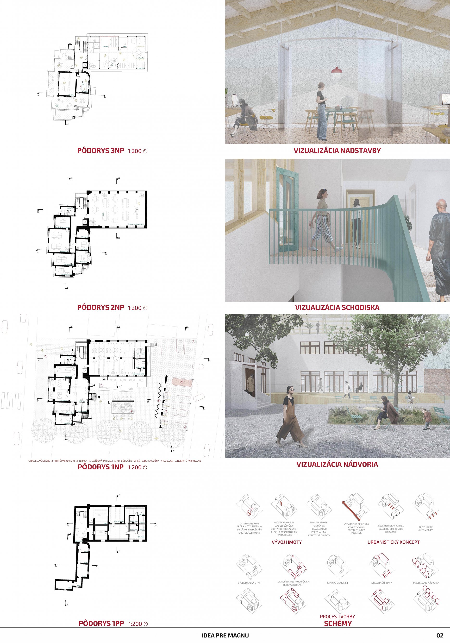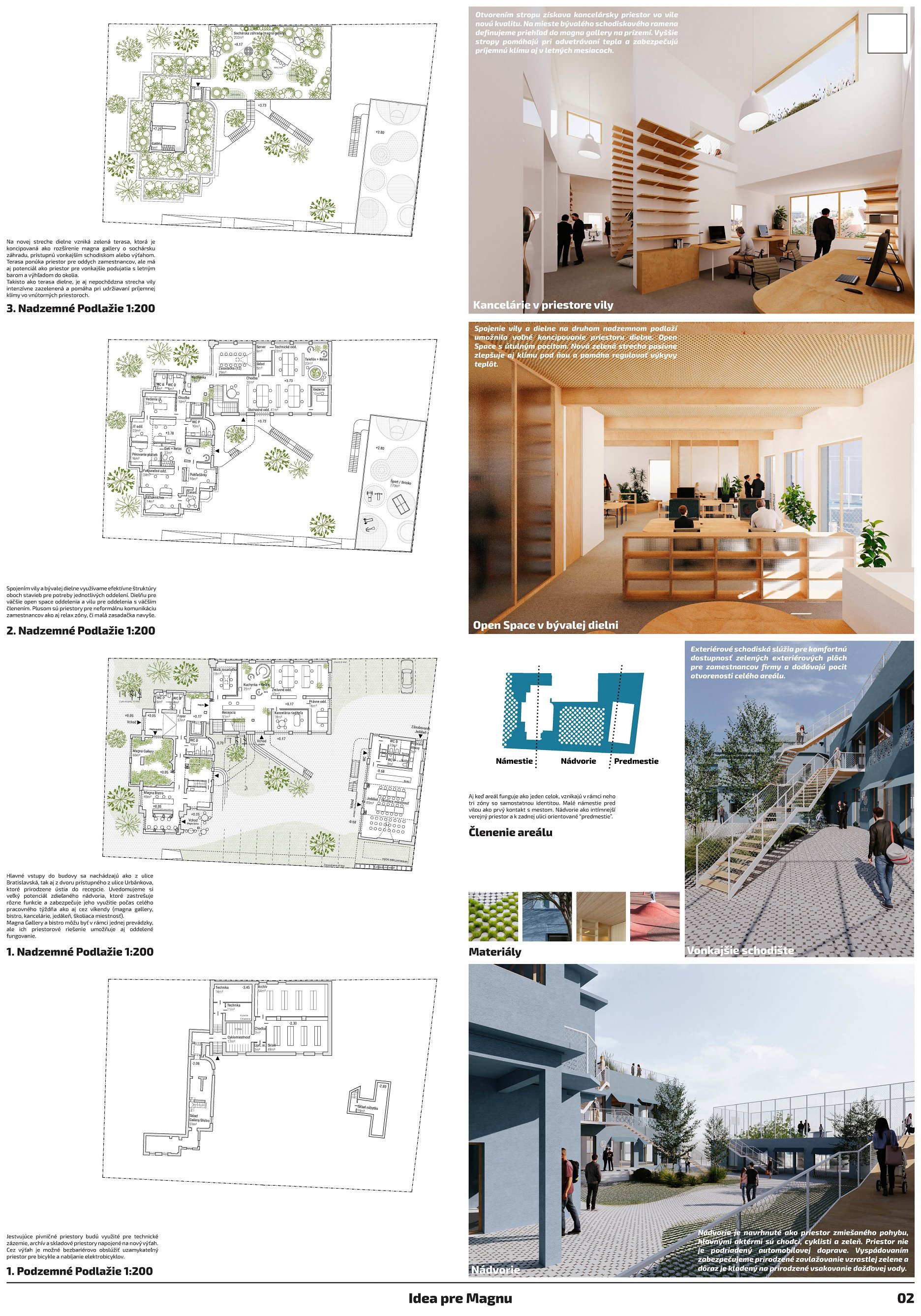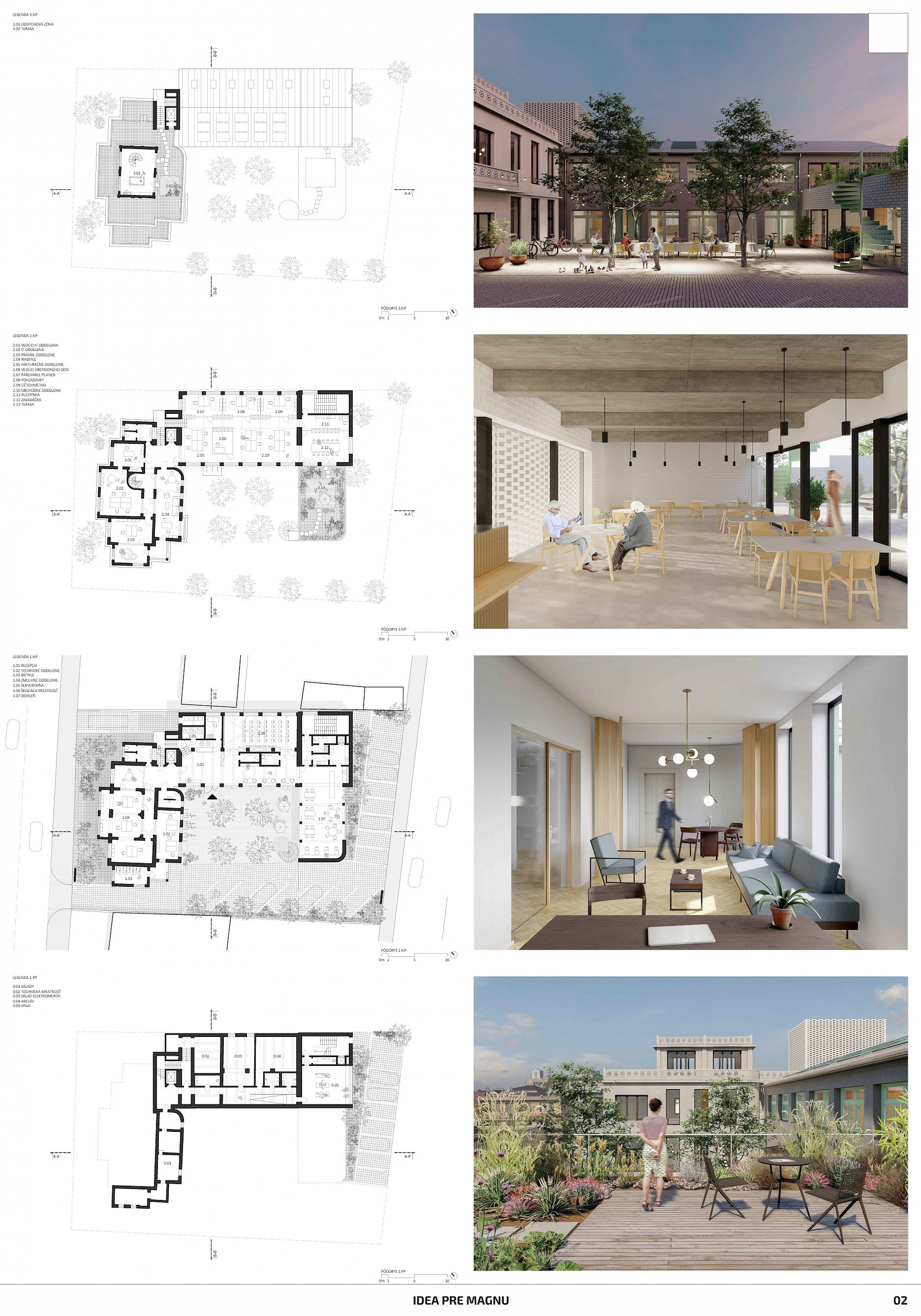 Porota v návrhu ocenila minimalizovanie búracích prác, a tým aj celkového ekologického dopadu výstavby, kedy autor počíta s usporiadaním celej dispozície do existujúcich objektov. Návrhu však chýba zaujímavý detail a prehĺbenie nastaveného konceptu. Tehlová fasády nie je pôvodná a vytvára zbytočne historizujúci dojem.