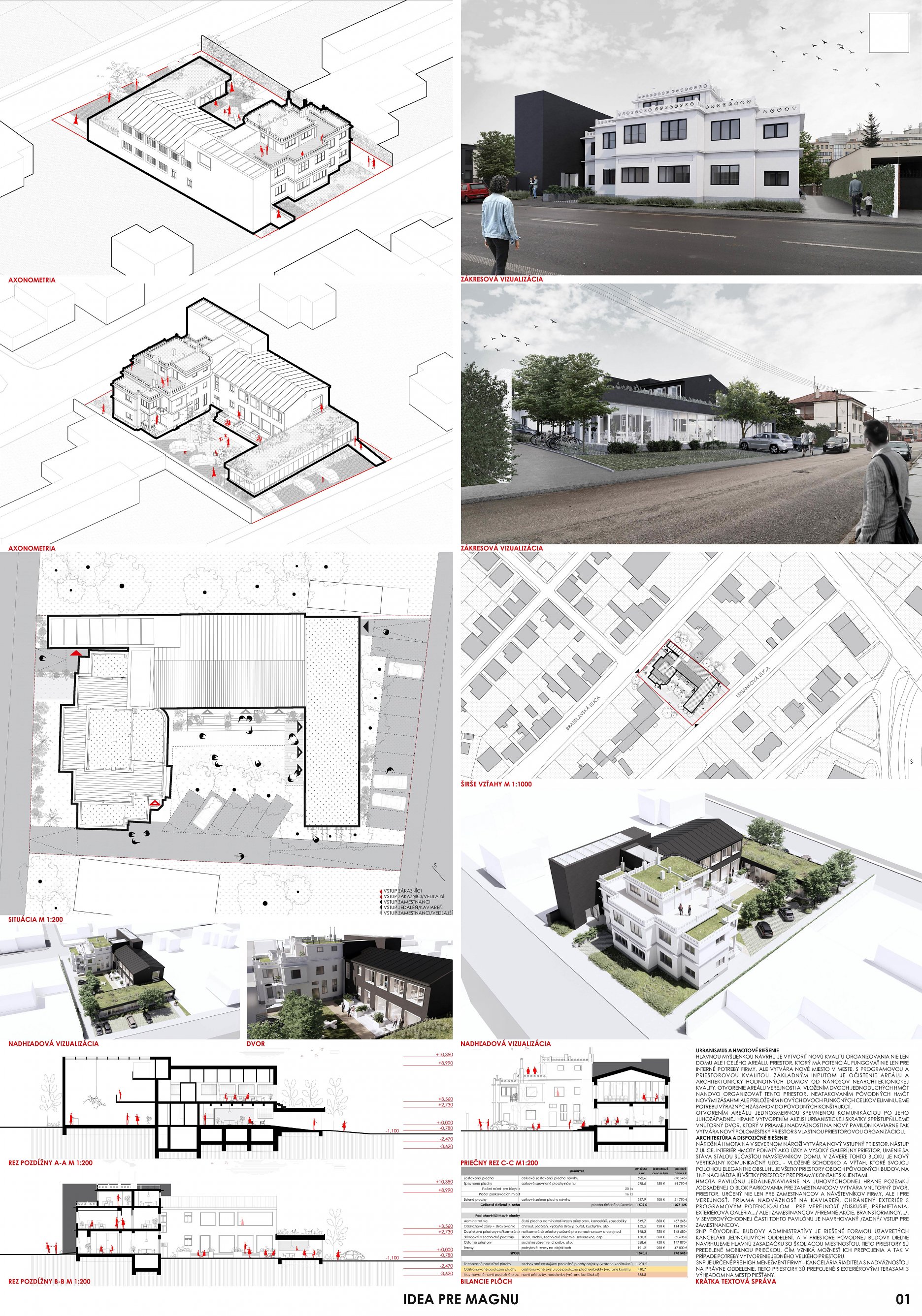 Čisté hmotové riešenie rešpektuje symetriu vily a zaujímavo člení priestor areálu. Výraznou kompozíciou autor zachoval len vilu, čím sa navrhovaná prístavba stala rovnocenným partnerom k súčasnému objektu. Centrálna poloha dostavby zabezpečuje obojstranné osvetlenie interiéru a minimalizuje negatívny vplyv na okolitú zástavbu. Nevhodné je však z pohľadu osvetlenia umiestnenie vonkajšieho spoločenského dvora a pešieho ťahu na severnej strane a statickej dopravy na južnej. Fasáda vilového objektu, vrátane zaujímavej zimnej záhrady, je dobre riešená, industriálne vyznenie okien však vytvára kontrast štýlov, ktoré pravdepodobne neodpovedajú pôvodnému objektu. Sklenenému prepojeniu medzi vilou a novým objektom chýba detail riešenia. Návrh pôsobí veľmi suverénne, no postráda kontext okolia. Množstvom búracích prác sa návrh výrazne odkláňa od predstavy danej zadaním.
