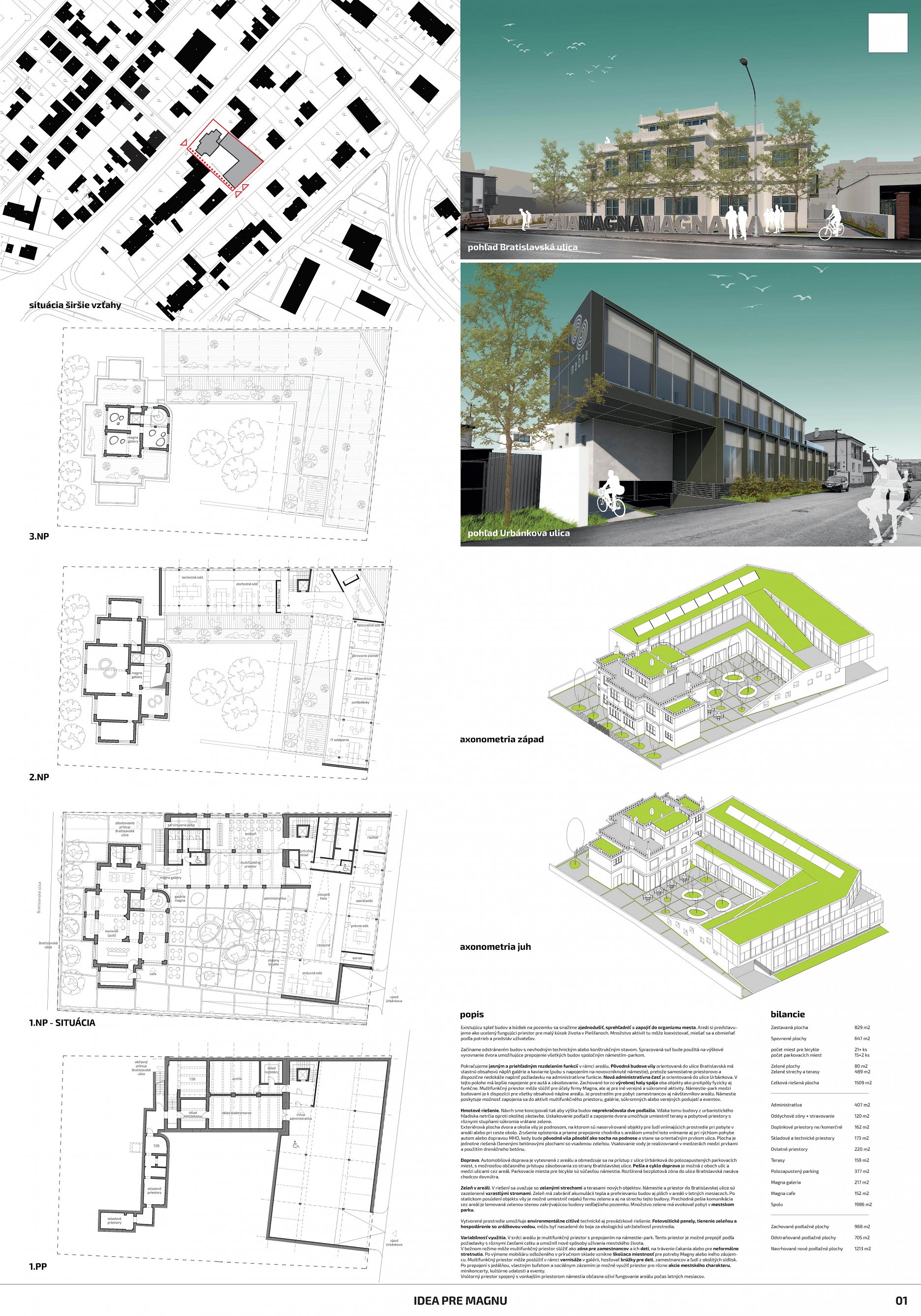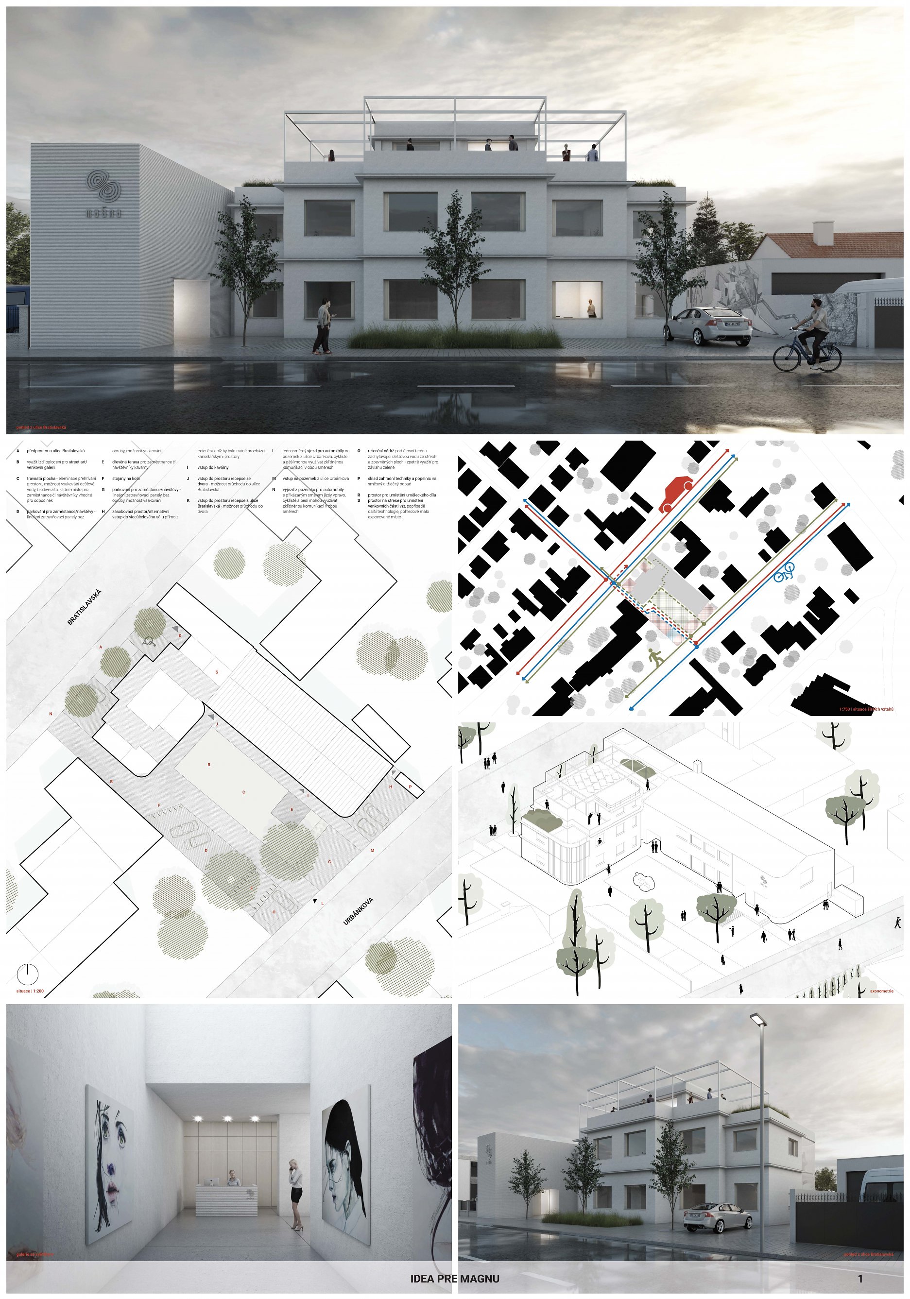 Návrh porotu presvedčil jemným, uhladeným dojmom, príjemnou materialitou, dobrým riešením dispozície objektov a zónovania areálu. Autori vo dvore vytvorili príjemné nádvorie s rozličnými pobytovými možnosťami, ktoré vyžaruje až rodinnou atmosférou. Porota ocenila aj racionálnu organizáciu statickej dopravy a hlavný vstup do objektu, ktorý je orientovaný zo strany dvora. Z Urbánkovej ulice má návrh príjemnú mierku v kontexte riešeného územia. V rámci dispozície sa autori dobre vysporiadali s funkčnou prevádzkou a vhodne umiestnili komunikačné jadrá. Porota tiež ocenila, že autorský kolektív sa sústredil na zachovanie a rekonštrukciu pôvodných objektov, a tak zredukoval potrebu budúceho búrania. Odporúčaním poroty je dopracovať exteriérové riešenie objektu vily a jej predpolie, vrátane premiestnenia parkovania karavanu. Smerom k Bratislavskej ulici pôsobí vstup do areálu nevľúdne, porota odporúča v tejto časti citlivejšie pracovať s oplotením od susedného pozemku a so zeleňou. Vnútorná dispozícia priestorov v časti objektu dielne by mala lepšie reagovať na problematické denné osvetlenie zo severnej strany.