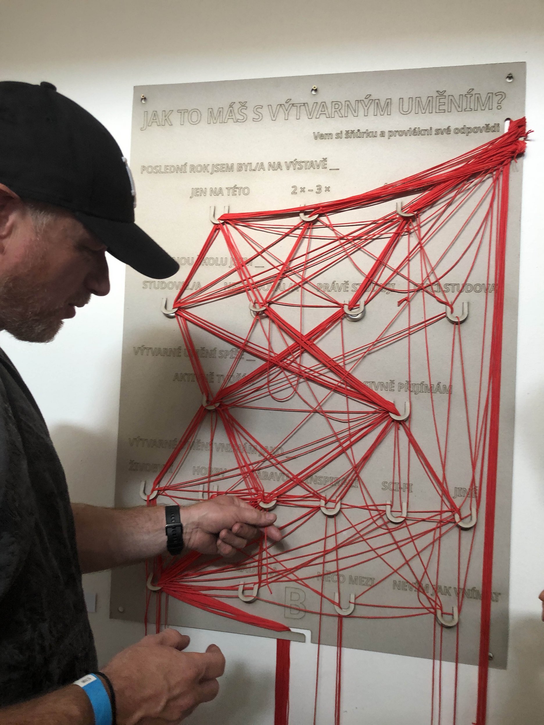 Interaktívny dotazník v priestore - jeho vyplnením sa respondenti stávajú zároveň aj tvorcami vizualizácie výskumu a aj súčasťou diela. Princíp poskytuje variabilitu v použití pre rôzne otázky, témy aj prostredie. V rámci festivalu 1. máj 2023 v kultúrnom centre Nová Cvernovka boli návštevníkom kladené jednoduché otázky s cieľom zistiť, akú skupinu tvoria návštevníci kultúrneho centra. Vyplnilo ho približne 160 ľudí. Na výstave Továreň umenia v Opave (ČR) bol týmto spôsobom preskúmaný vzťah návštevníkov k umeniu. Živý dotazník je artefakt, ktorý už počas zberu dát vytvára priestor na dialóg, prieskum či spätnú väzbu medzi návštevníkom a inštitúciou. Vďaka jednoduchému princípu fyzickej hry vťahuje do tvorby respondentov z rôznych generácií a sociologických skupín.