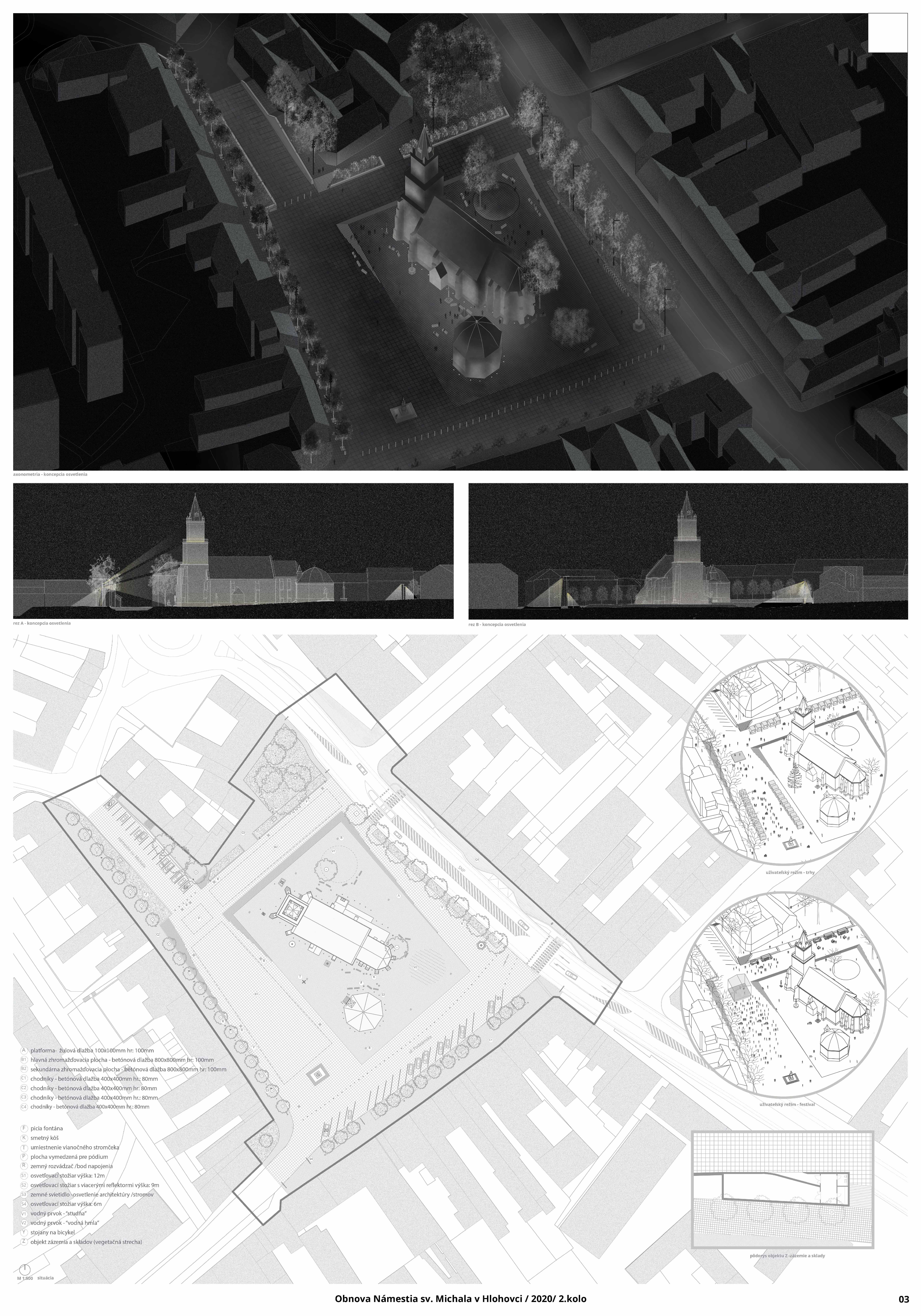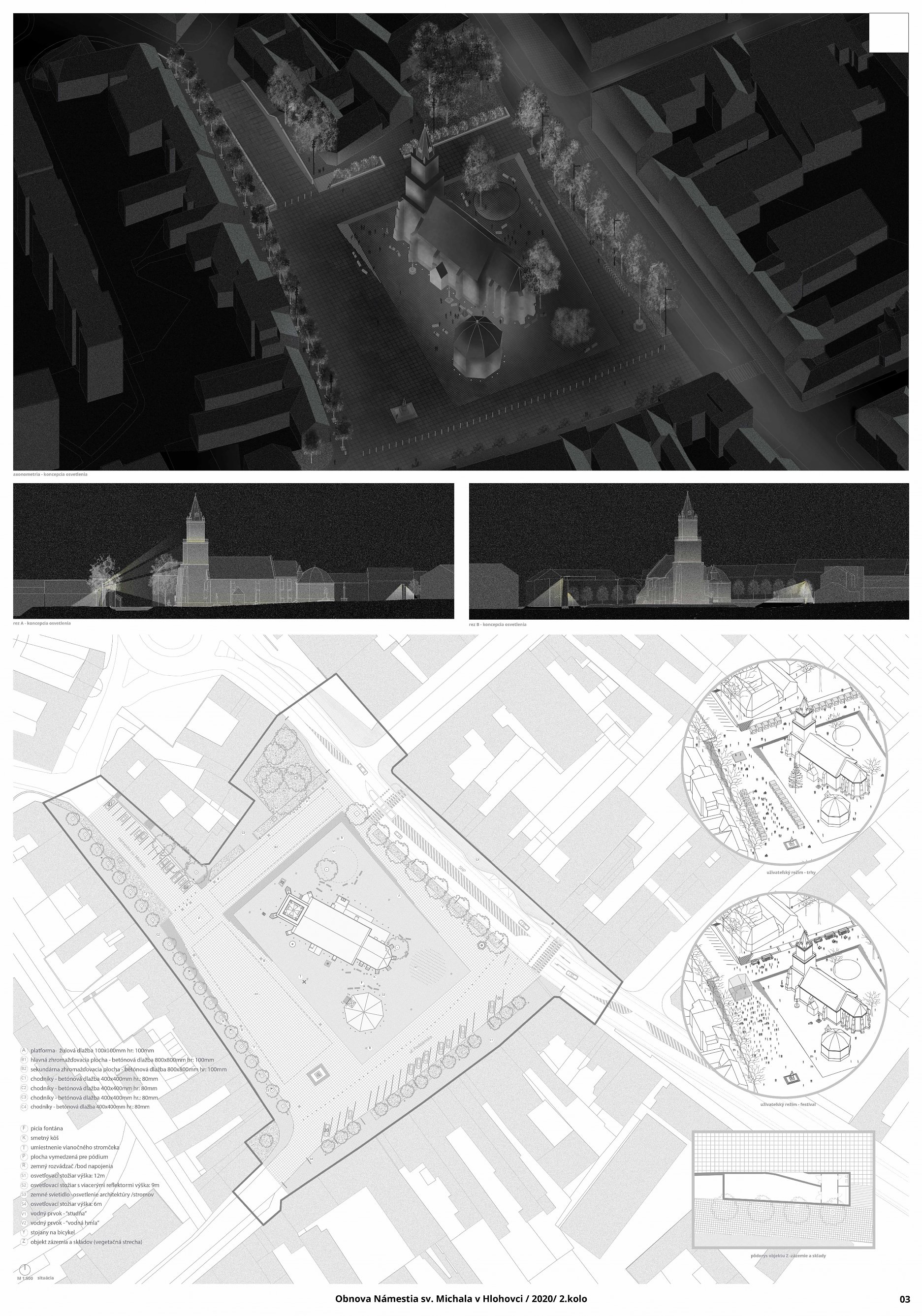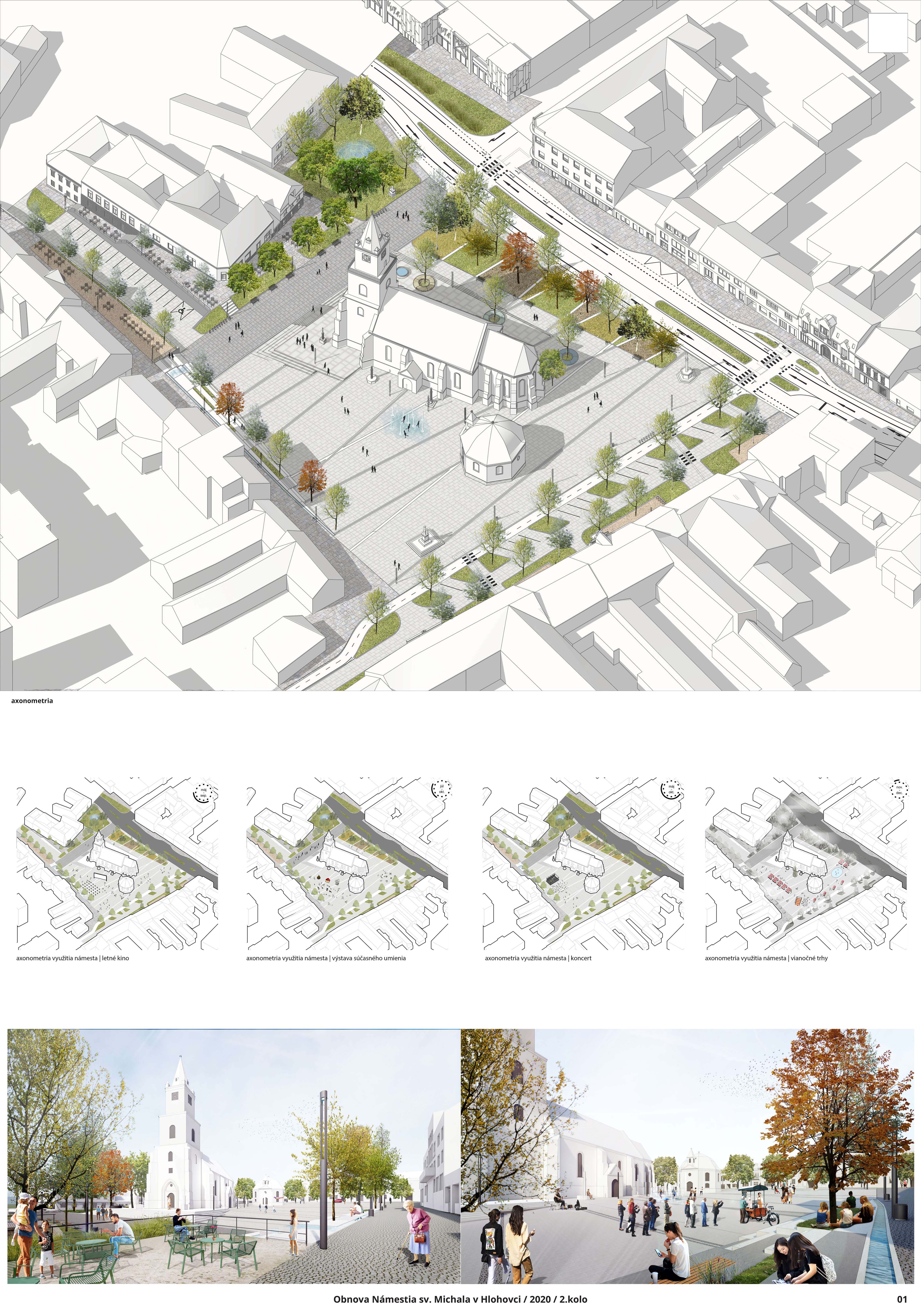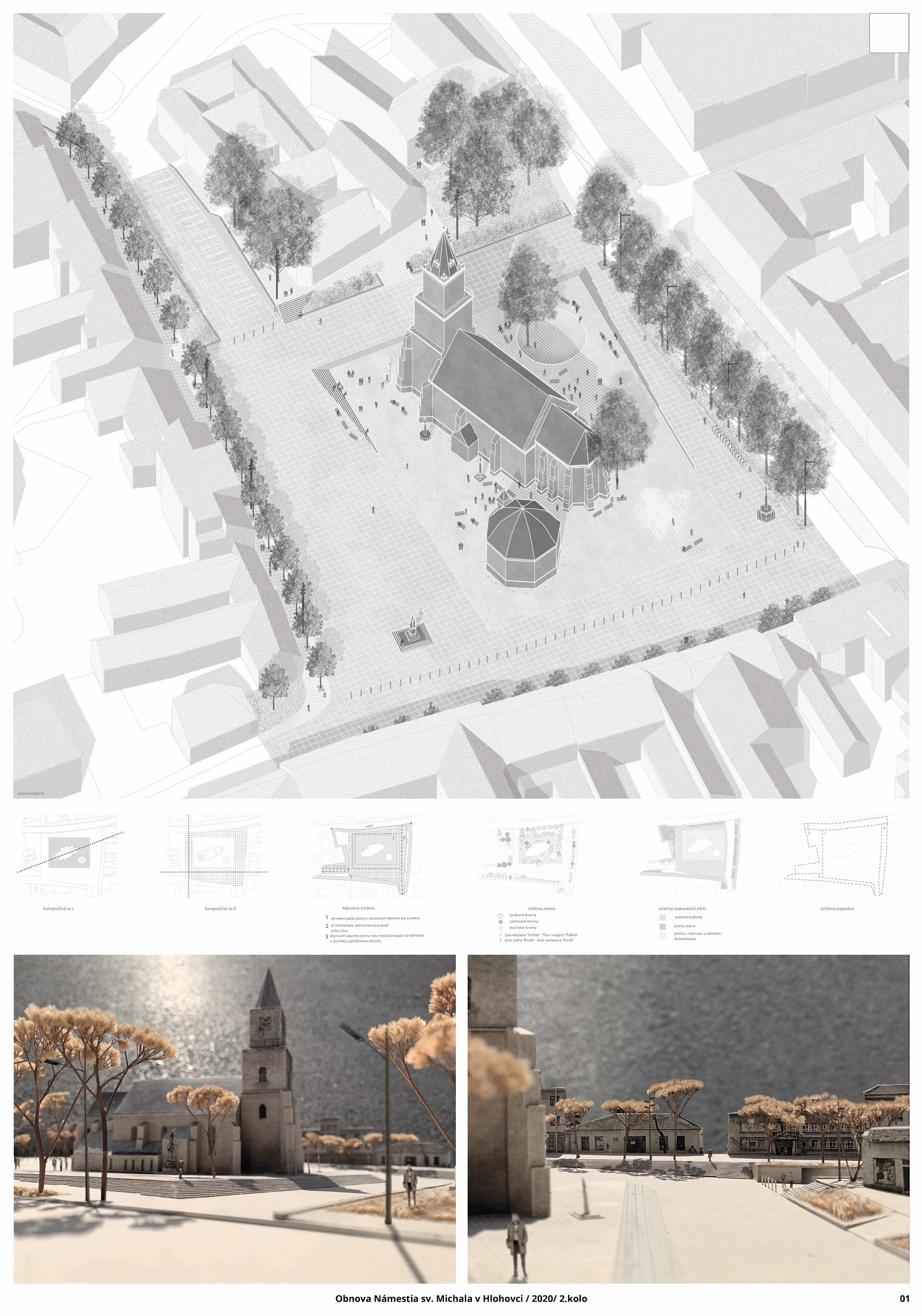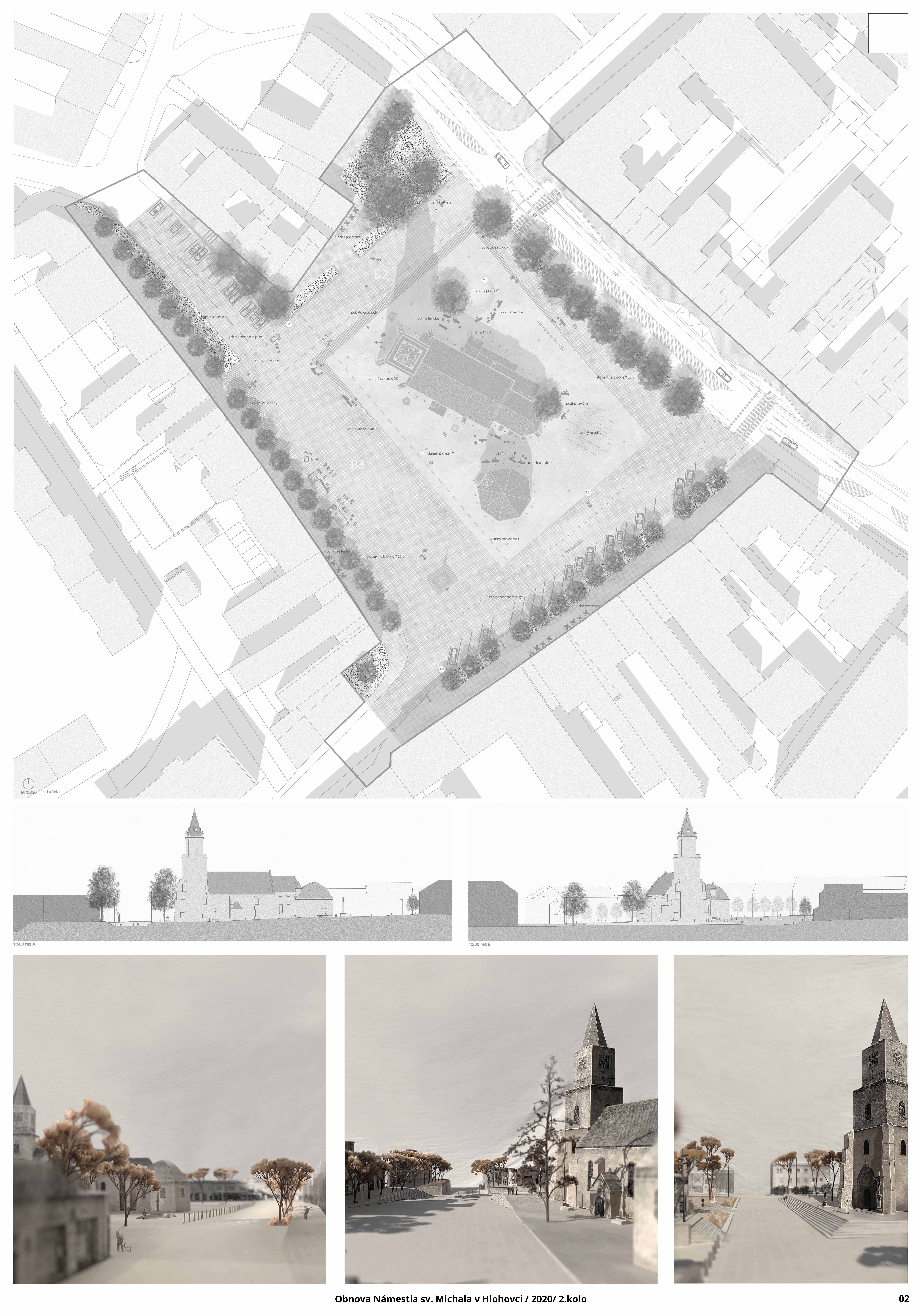 Jednoduchý a sebavedomý koncept porota vyhodnotila ako hlavnú výhodu návrhu. Jeho cieľom je jednoznačné vymedzenie plochy námestia ako centrálneho mestského priestoru s kostolom a kaplnkou na výraznej podeste. Tomu je podriadené utilitárne materiálové riešenie a detaily mobiliárových a vodných prvkov. Riešenie osvetlenia je zamerané na podtrhnutie atmosféry dominantnej architektúry. Porota kladne hodnotila návrh z pohľadu kultúrnych podujatí a vytvorenia skladového zázemia v teréne. Výrazná schodisková podesta okolo kostola je ale aj priestorovou bariérou pre pohyb peších v rámci územia. Najmä z pohľadu zelene vidieť zásadný kontrast zvoleného konceptu a očakávaného užívania námestia. Okrem stromoradí ohraničujúcich po obvode riešené územie, sú v rámci hlavnej centrálnej pobytovej zóny zachované len 2 stromy. Celá južná časť námestia tak zostáva bez prirodzeného tieňa, čím limituje užívanie a atraktivitu daného priestoru najmä v letných mesiacoch. Zároveň sa vďaka výrazném zastúpeniu spevnených plôch zvyšuje potenciál prehrievanie celého územia. Z pohľadu dopravného riešenia sa návrh postavil k existujúcim plánom úpravy ul. SNP neutrálne a nerieši možný kontext širších vzťahov a potenciálneho napojenia na pešiu zónu či okolité obslužné uličky. Odhadované náklady na realizáciu návrhu výrazne prevyšovali ostatné dva návrhy, aj s ohľadom na náročné terénne úpravy súvisiace so schodiskovou podestou.