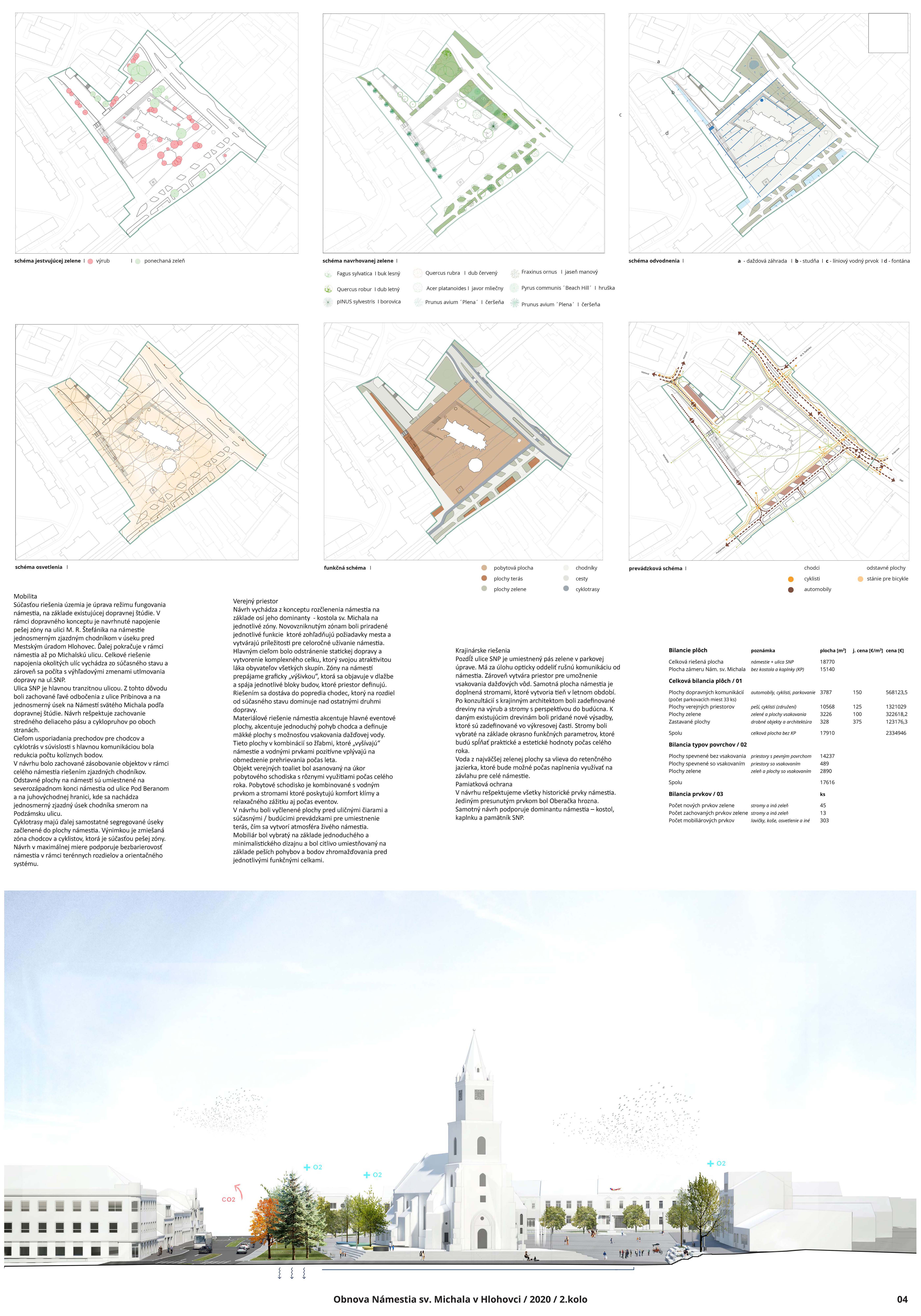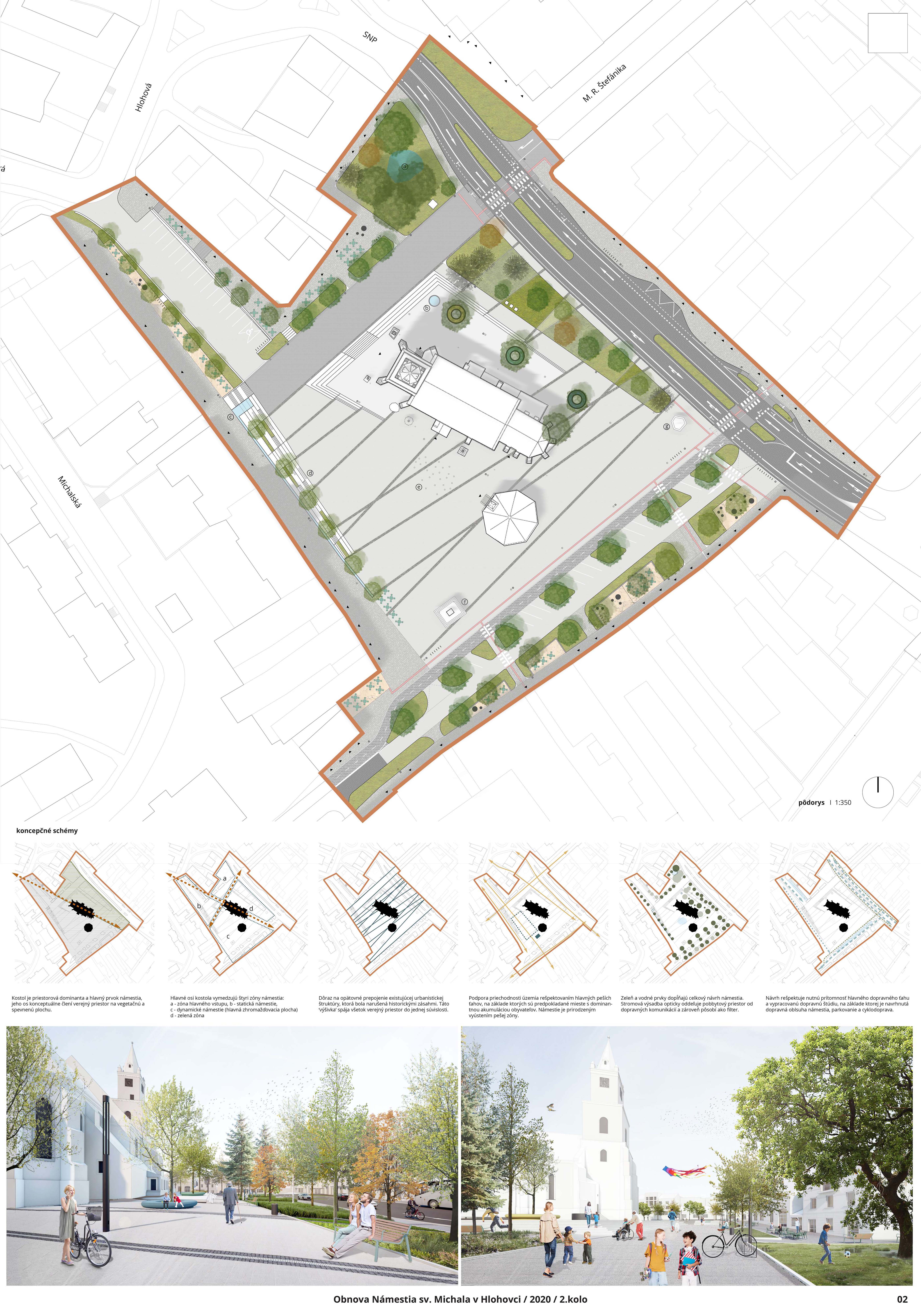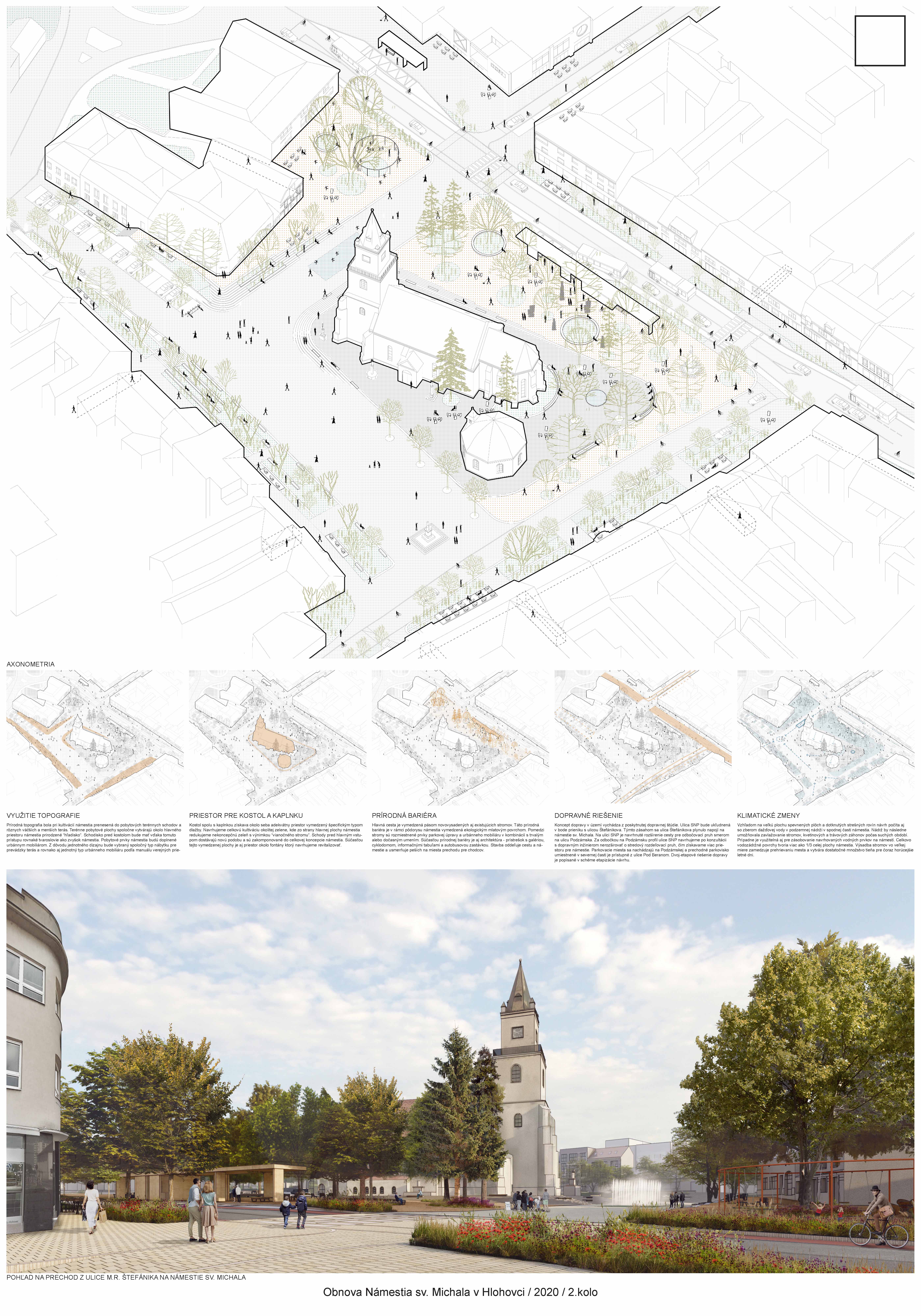 Návrh predkladá zrozumiteľný architektonický koncept nového usporiadania námestia. Vhodne rieši širšie vzťahy a kontext v rámci dotknutého územia mesta. Pri priestorovom usporiadaní bol kladený dôraz na existujúce pešie ťahy a prepojenia do bočných uličiek a podchodov. Vhodne je riešené aj potenciálne pešie dopravné prepojenie na ul. M.R.Štefánika. Jemným posunom pešieho prechodu v rámci podkladu dopravného riešenia ul. SNP, ktorý návrh prevažne rešpektuje, je docielené realizovateľné opatrenie v prospech peších. Dostatok priestoru dostali aj prevádzky objektov pre zriadenie letných terás. Zeleň je navrhovaná v kompromise medzi súčasným parkovým charakterom a zvýraznením dominanty sakrálnej architektúry. Zelená bariéra v severnej časti od ul. SNP funguje aj na zber dažďovej vody, ktorá je ďalej zbieraná v zóne vzrastlej zelene v severnej časti námestia. V návrhu však chýba zeleň na južnej strane námestia, ktorá je najviac exponovaná a prehrievaná v letných mesiacoch. Na zváženie je preto kompozične vhodné umiestnenie jedného či viacerých významnejších solitérnych stromov. Rozporuplné je materiálové riešenie spevnených plôch, ktorých ornamentálnosť pôsobí formálne. Význam línií ako zjednocujúceho prvku je zrozumiteľný, ale navrhnutý výrazný farebný akcent môže z pohľadu chodca tvoriť len nečitateľnú spleť línií bez nadväznosti na historický kontext okolia. Pozitívny je funkčný aspekt línií ako odvodňovacích žľabov spevnenej plochy. Podesta okolo kostola zvýrazňuje nástup do kostola, avšak pôsobí nedokončene, a aj z pohľadu pamiatkovej ochrany je potrebné jednoznačné materiálové začlenenie kaplnky do jednotného priestorového vymedzenia spolu s kostolom. Hlavný vstup do kostola je potrebné riešiť bezbariérovo, napríklad odstránením schodu z juhovýchodnej strany podesty.