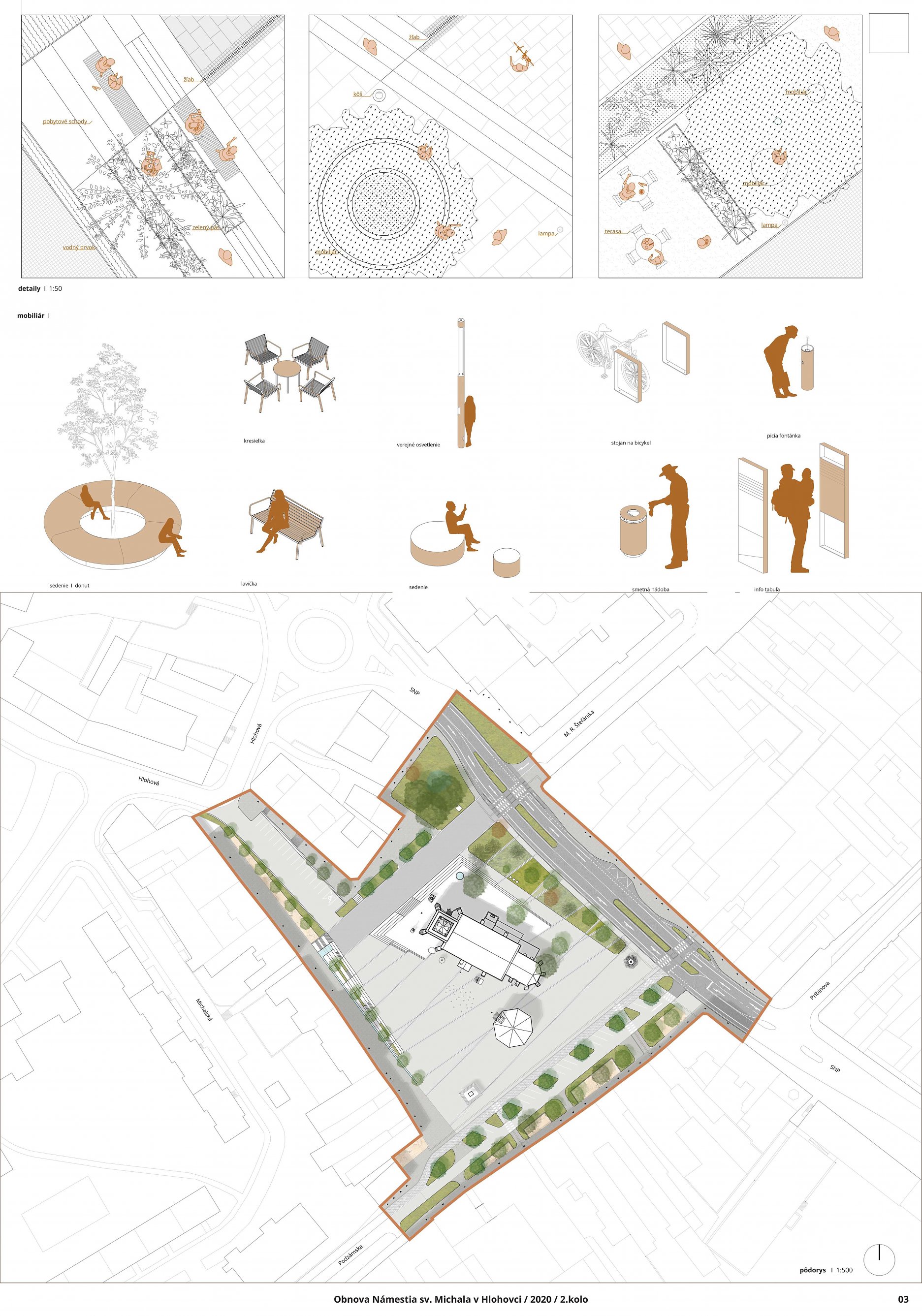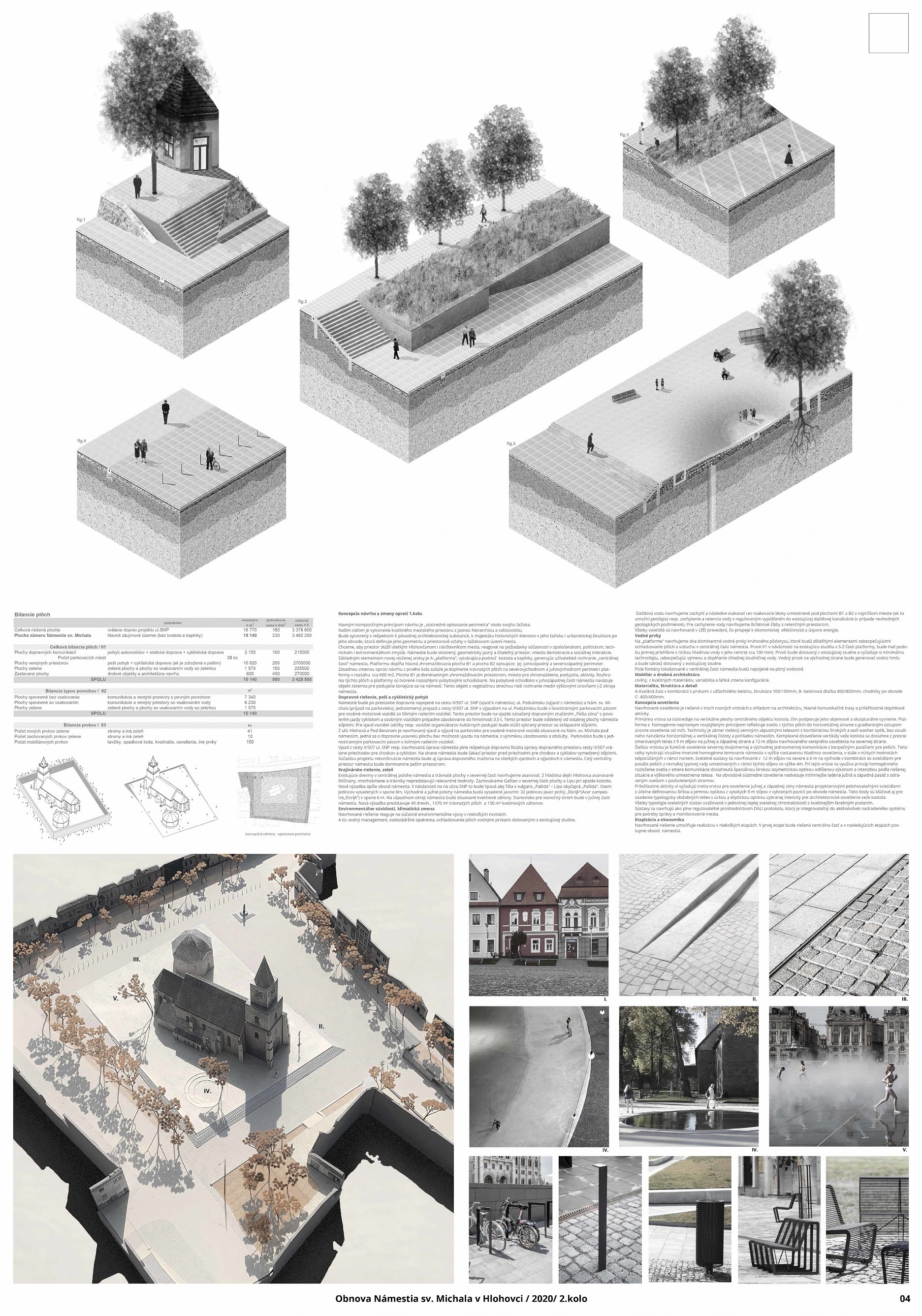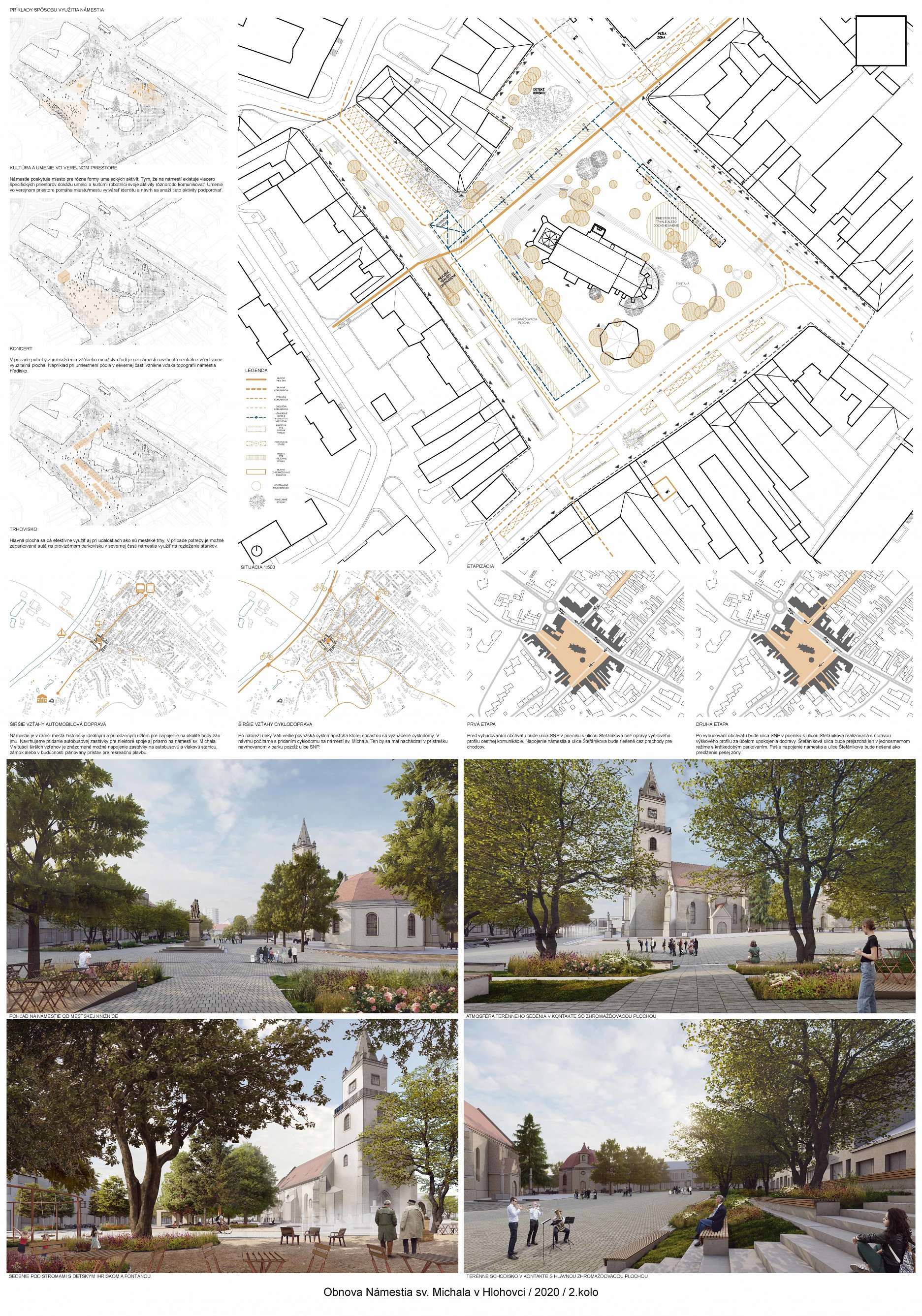Návrh predkladá zrozumiteľný architektonický koncept nového usporiadania námestia. Vhodne rieši širšie vzťahy a kontext v rámci dotknutého územia mesta. Pri priestorovom usporiadaní bol kladený dôraz na existujúce pešie ťahy a prepojenia do bočných uličiek a podchodov. Vhodne je riešené aj potenciálne pešie dopravné prepojenie na ul. M.R.Štefánika. Jemným posunom pešieho prechodu v rámci podkladu dopravného riešenia ul. SNP, ktorý návrh prevažne rešpektuje, je docielené realizovateľné opatrenie v prospech peších. Dostatok priestoru dostali aj prevádzky objektov pre zriadenie letných terás. Zeleň je navrhovaná v kompromise medzi súčasným parkovým charakterom a zvýraznením dominanty sakrálnej architektúry. Zelená bariéra v severnej časti od ul. SNP funguje aj na zber dažďovej vody, ktorá je ďalej zbieraná v zóne vzrastlej zelene v severnej časti námestia. V návrhu však chýba zeleň na južnej strane námestia, ktorá je najviac exponovaná a prehrievaná v letných mesiacoch. Na zváženie je preto kompozične vhodné umiestnenie jedného či viacerých významnejších solitérnych stromov. Rozporuplné je materiálové riešenie spevnených plôch, ktorých ornamentálnosť pôsobí formálne. Význam línií ako zjednocujúceho prvku je zrozumiteľný, ale navrhnutý výrazný farebný akcent môže z pohľadu chodca tvoriť len nečitateľnú spleť línií bez nadväznosti na historický kontext okolia. Pozitívny je funkčný aspekt línií ako odvodňovacích žľabov spevnenej plochy. Podesta okolo kostola zvýrazňuje nástup do kostola, avšak pôsobí nedokončene, a aj z pohľadu pamiatkovej ochrany je potrebné jednoznačné materiálové začlenenie kaplnky do jednotného priestorového vymedzenia spolu s kostolom. Hlavný vstup do kostola je potrebné riešiť bezbariérovo, napríklad odstránením schodu z juhovýchodnej strany podesty.