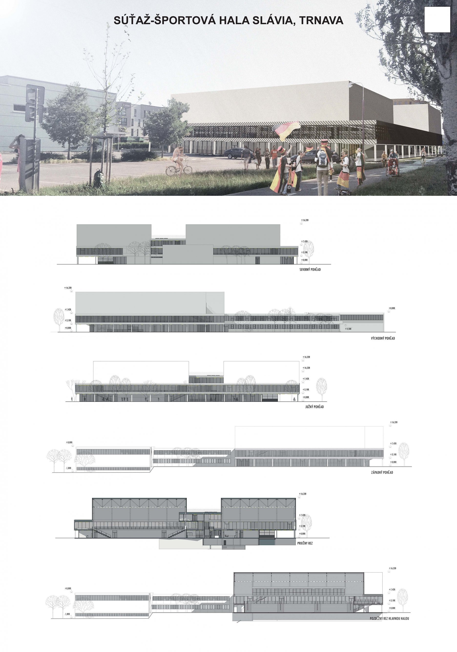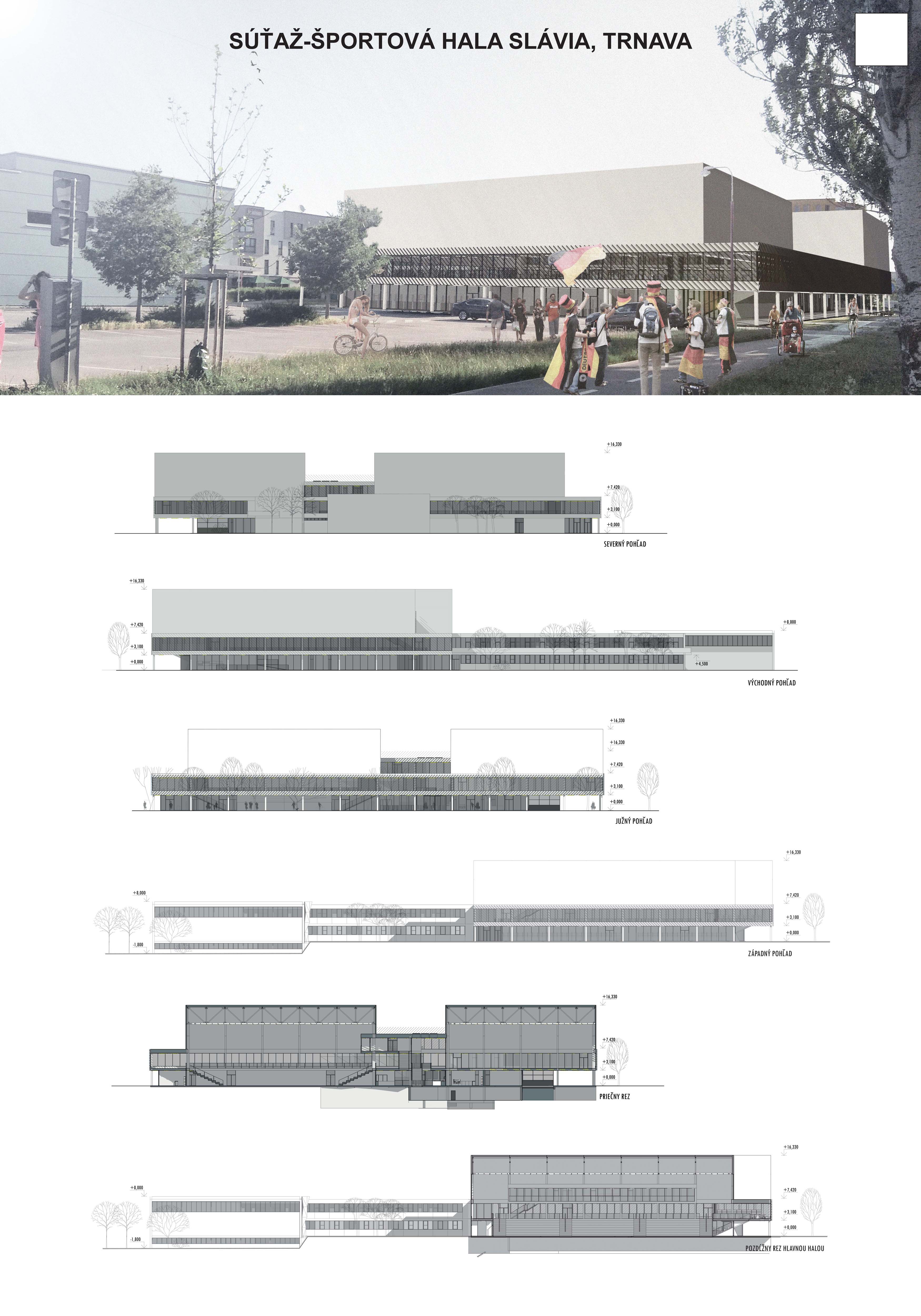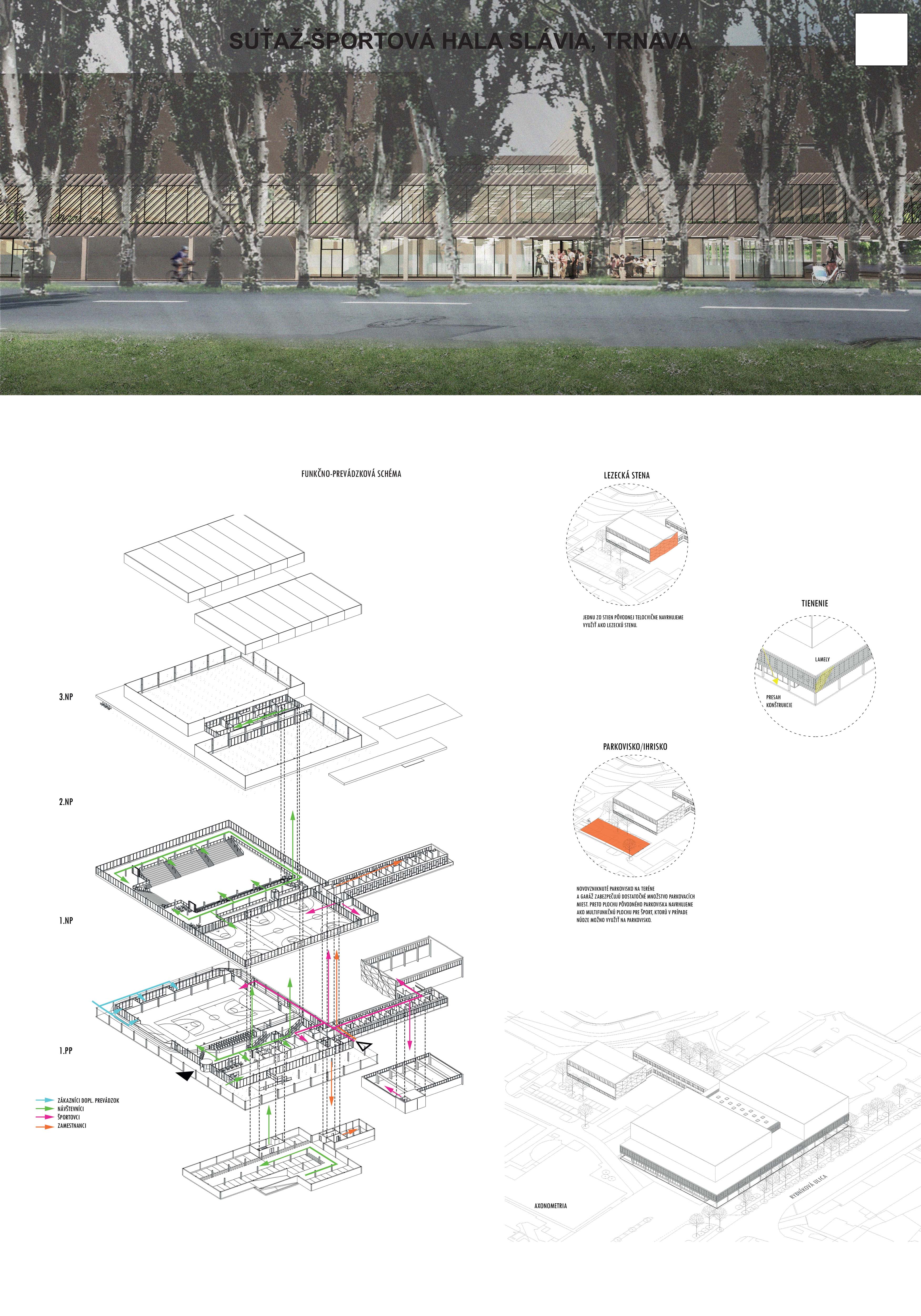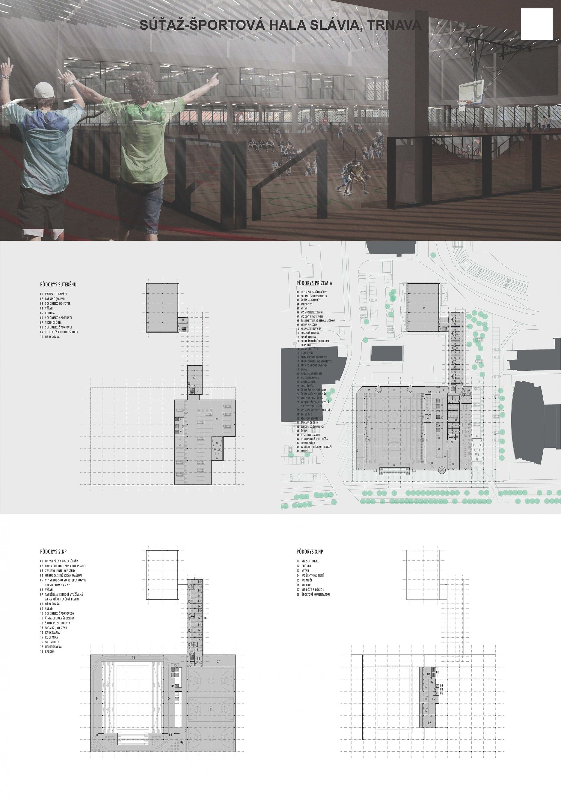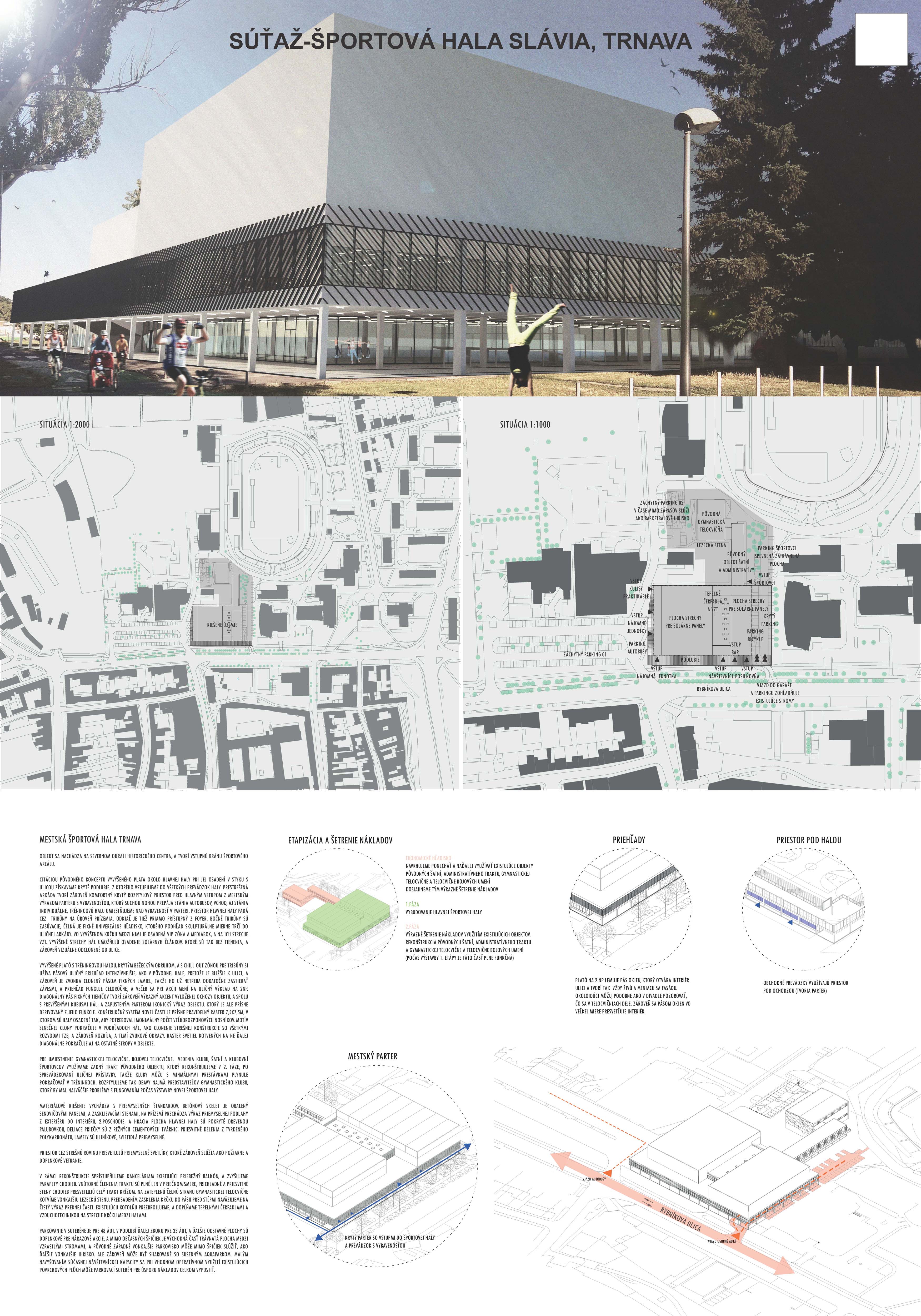 Samotná nová hlavná športová hala cituje koncept s vyvýšeným platom okolo haly, ako ho poznáme aj zo súčasného riešenia. Novým usporiadaním funkcií však v styku s ulicou vytvára na rozdiel od súčasného riešenia parter s krytým podlubím, z ktorého sa vstupuje do všetkých prevádzok haly. Tréningovú halu umiestňujeme nad vybavenosť v parteri (obchody, bar, posilňovňa), priestor hlavnej haly padá cez tribúny na úroveň prízemia. Bočné tribúny sú zasúvacie, čelná tribúna je fixné univerzálne hľadisko, ktorého podhľad ako socha mierne trčí do uličnej arkády. Vo vyvýšenom krčku medzi hlavnou a tréningovou halou je foyer s osadenou VIP zónou a mediabox. Vyvýšené strechy hál umožňujú osadenie solárnych panelov, ktoré sú tak bez tienenia, a zároveň vizuálne odclonené od ulice.