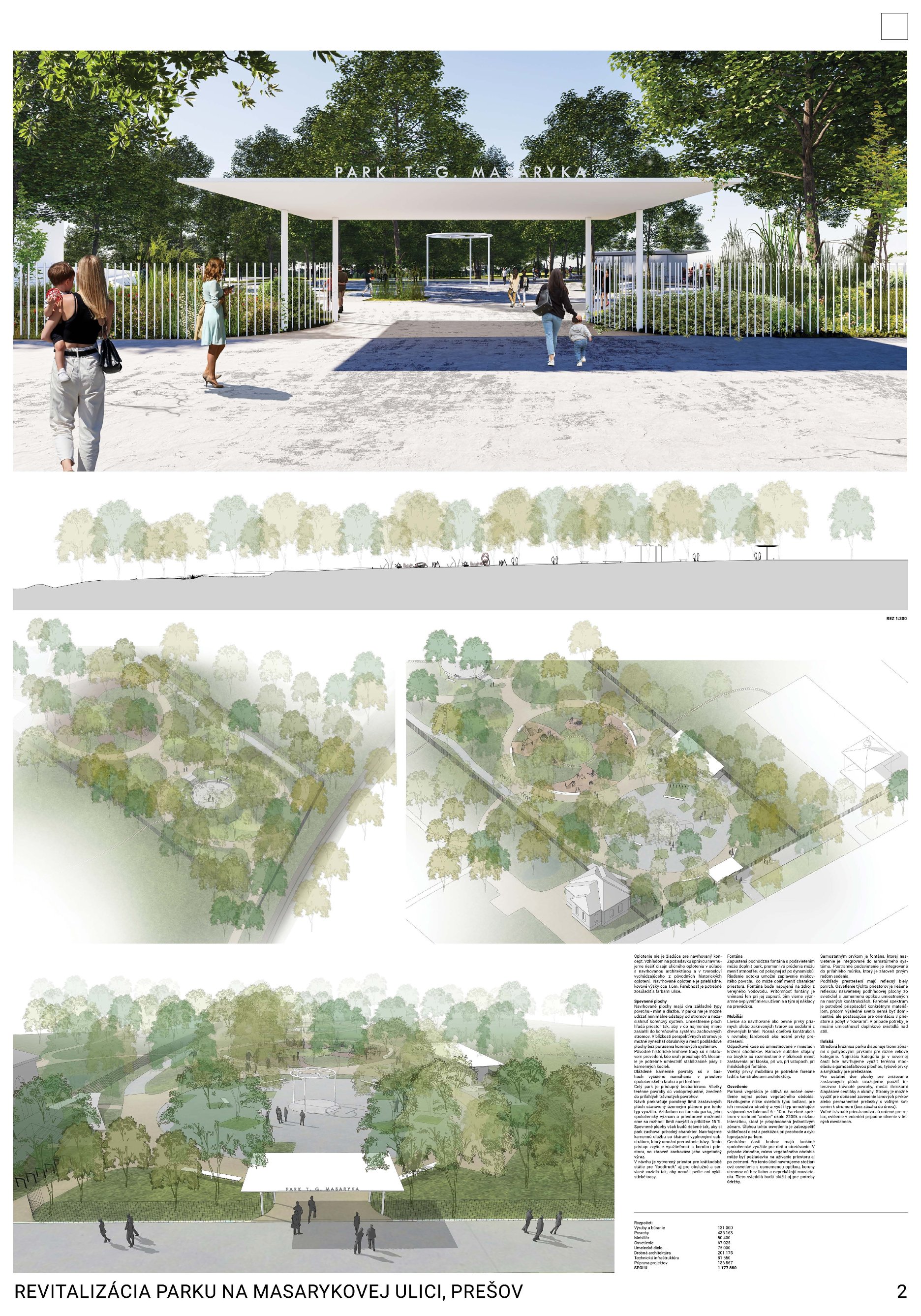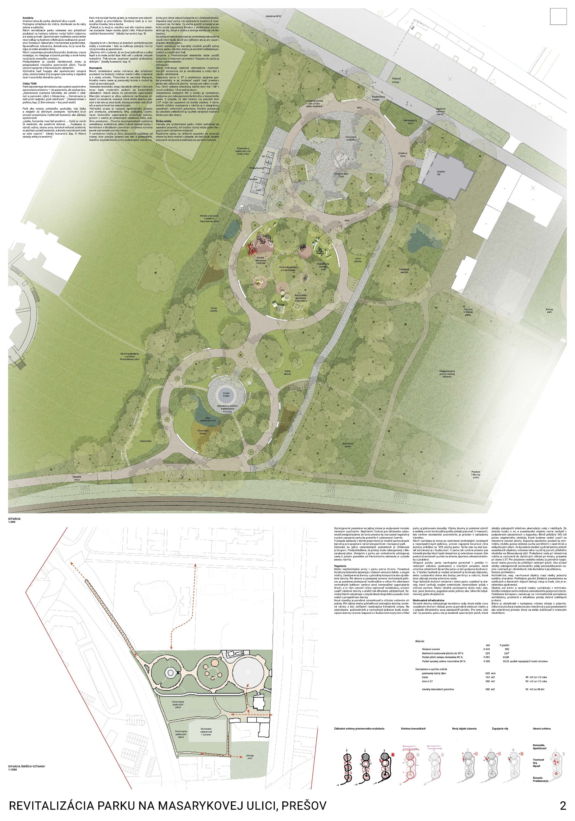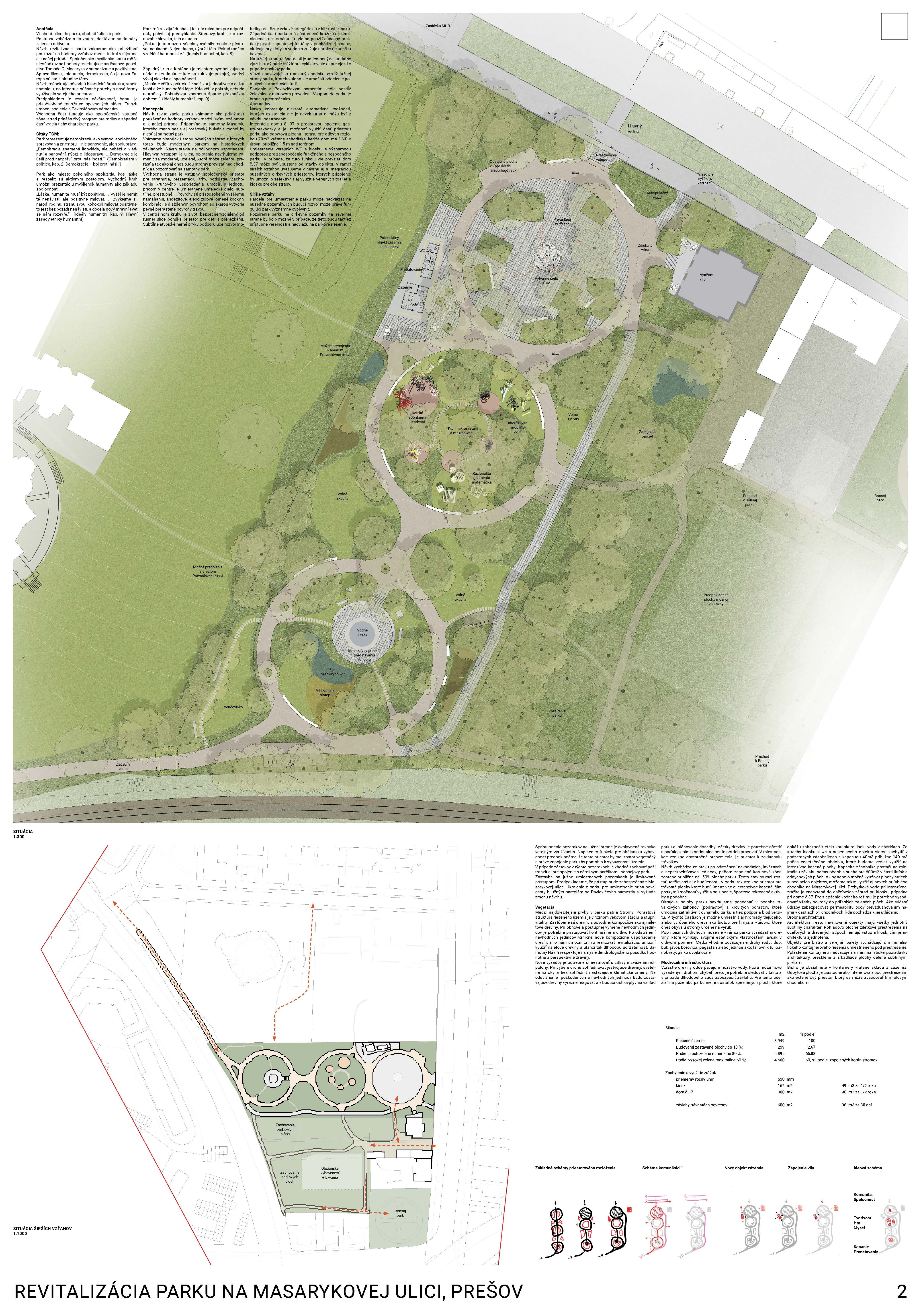 Pozitívom návrhu je ambícia vniesť do priestoru identitu (názov/pomenovanie podľa T. G. Masaryka) a uvažovanie o umiestnení umeleckého diela v hlavnom poli priestoru. Porota však uvádza, že citácia kruhového usporiadania parku z 50. rokov 20. storočia nepôsobí presvedčivo vo vzťahu k navrhovaným intenzívnym funkciám (detské ihrisko, veľká piazzeta), ktoré priestor zbytočne preťažujú. Zároveň bola kriticky hodnotená formálnosť a predimenzovanie vstupného gesta; v diskusii zaznelo, že ak by išlo o menší pavilón zvyšujúci použiteľnosť parku, mohlo by to byť prijateľnejšie, avšak v navrhnutej podobe pôsobí gesto prehrane.