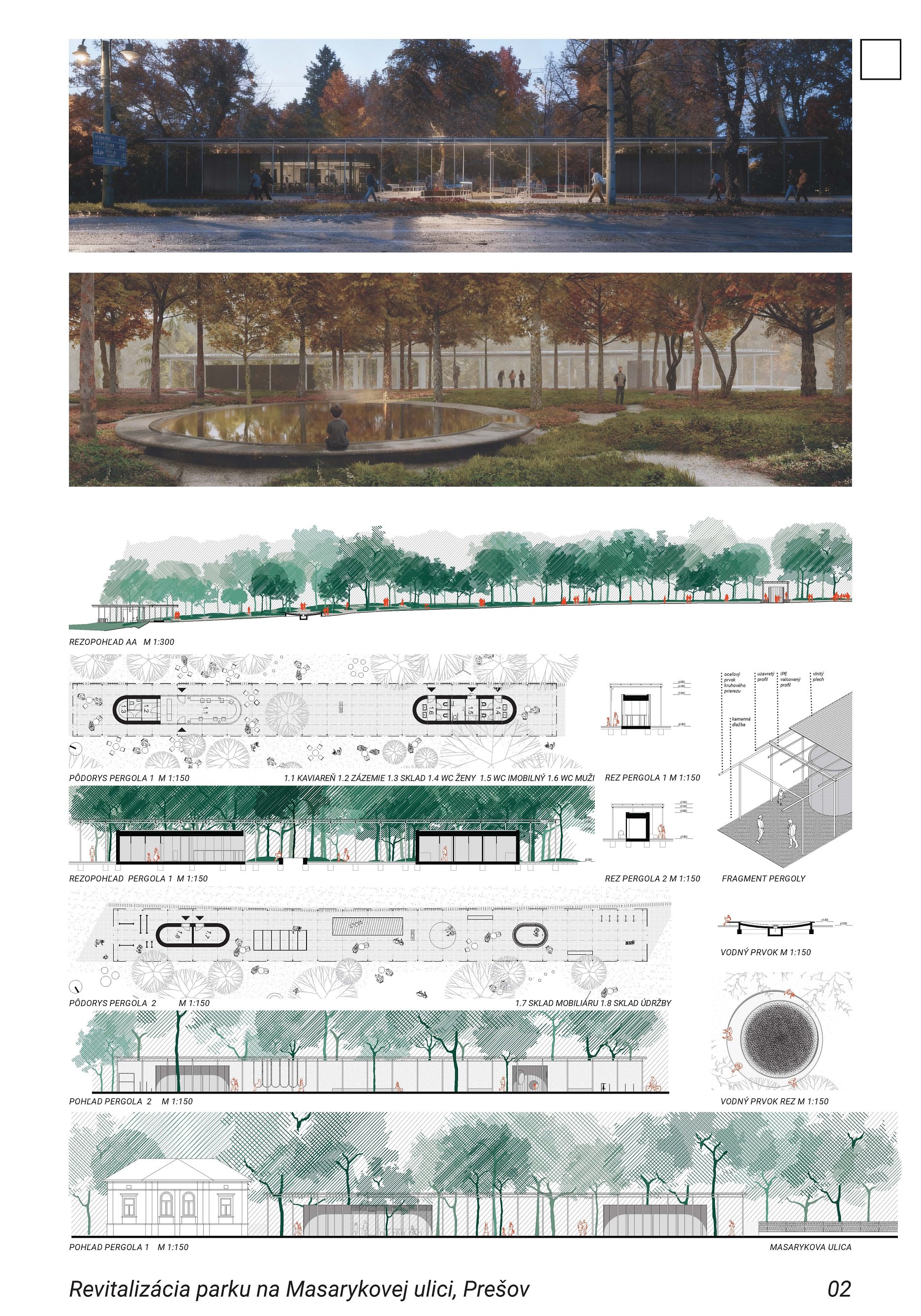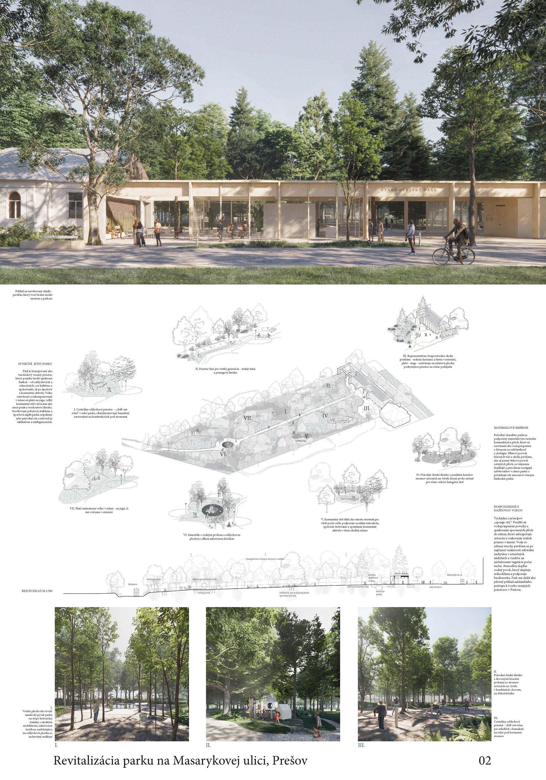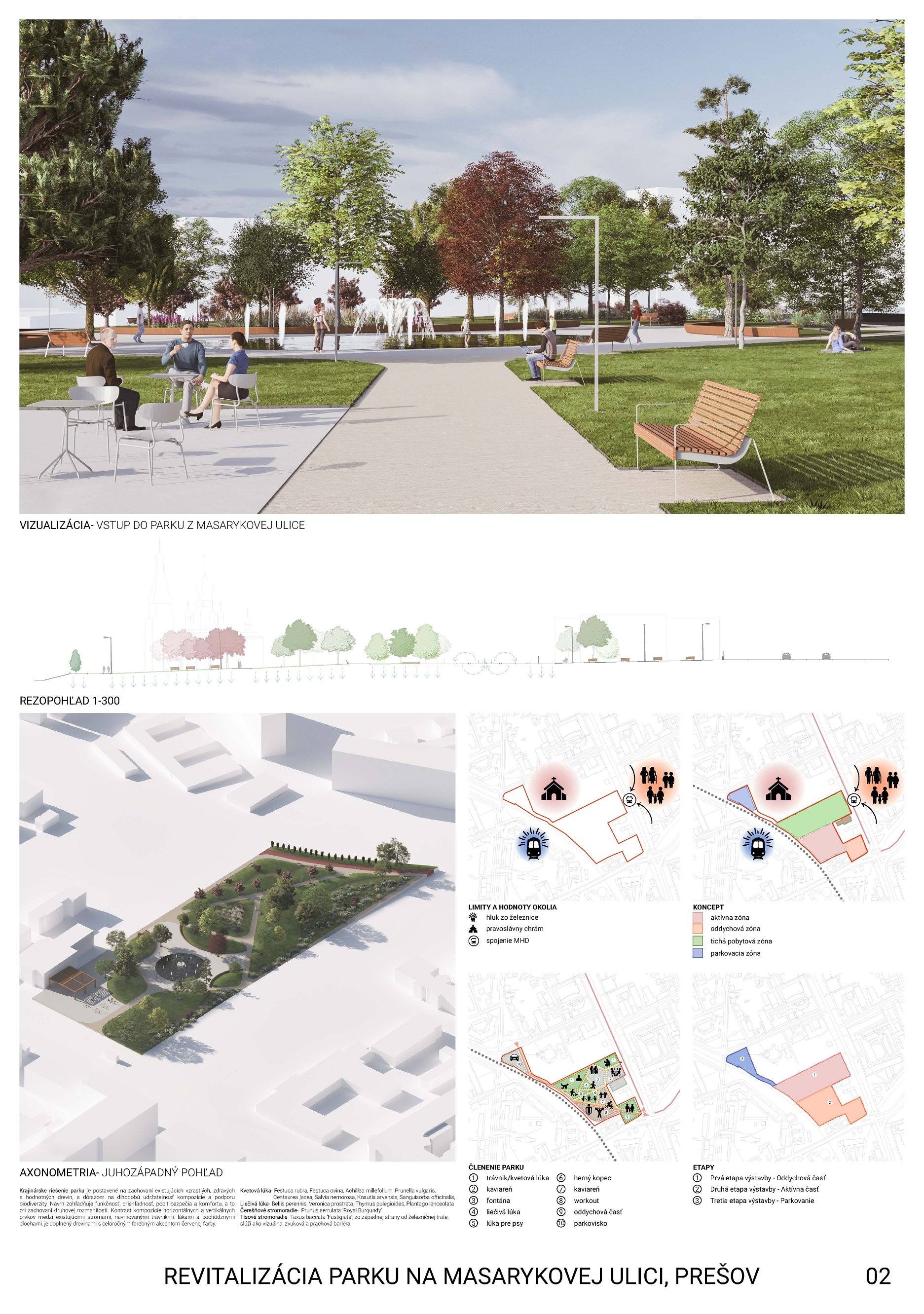 Pozitívom návrhu je ambícia vniesť do priestoru identitu (názov/pomenovanie podľa T. G. Masaryka) a uvažovanie o umiestnení umeleckého diela v hlavnom poli priestoru. Porota však uvádza, že citácia kruhového usporiadania parku z 50. rokov 20. storočia nepôsobí presvedčivo vo vzťahu k navrhovaným intenzívnym funkciám (detské ihrisko, veľká piazzeta), ktoré priestor zbytočne preťažujú. Zároveň bola kriticky hodnotená formálnosť a predimenzovanie vstupného gesta; v diskusii zaznelo, že ak by išlo o menší pavilón zvyšujúci použiteľnosť parku, mohlo by to byť prijateľnejšie, avšak v navrhnutej podobe pôsobí gesto prehrane.