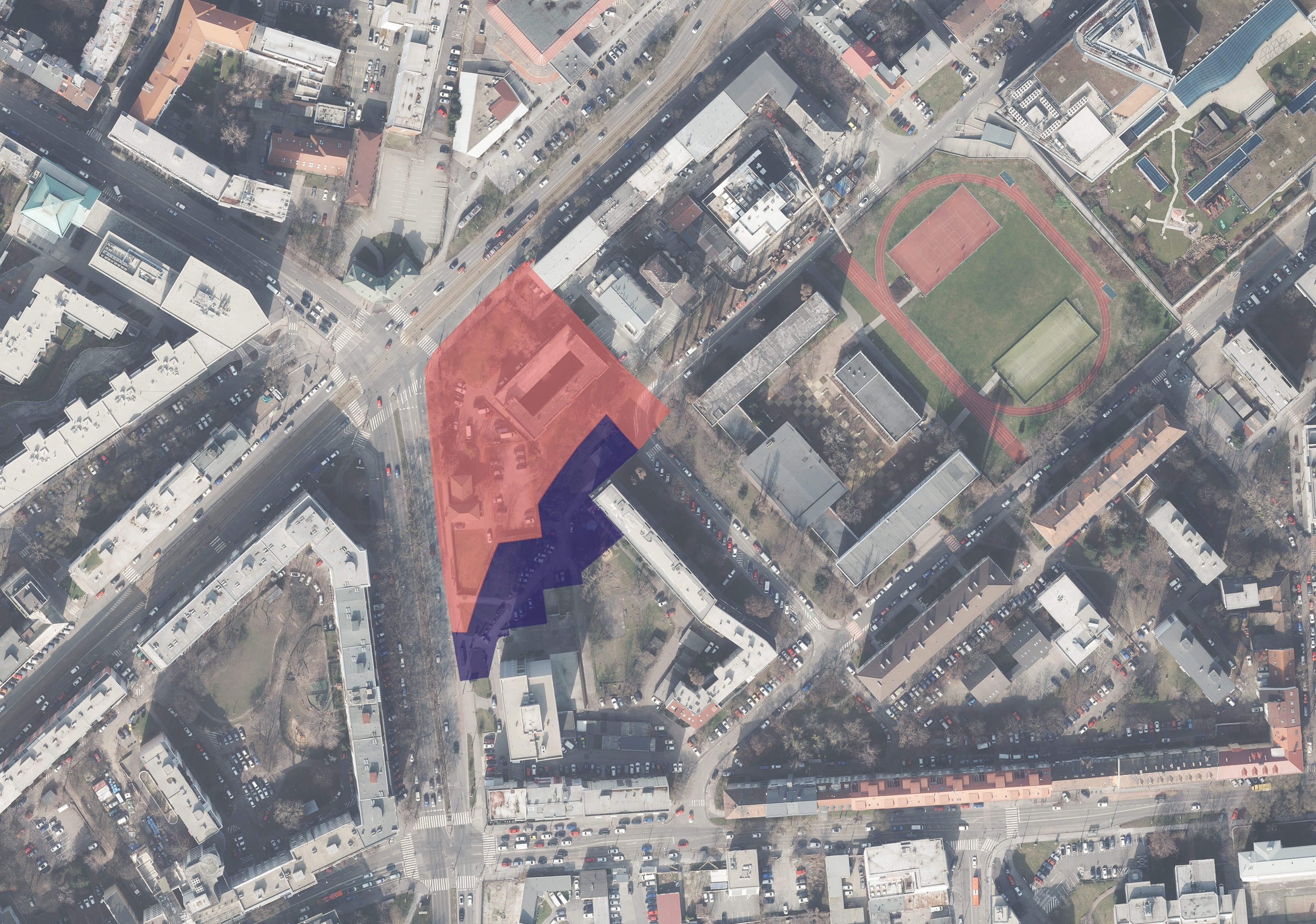 Vstup do areálu sa pre dobré napojenie na hlavné pešie ťahy a zastávky MHD predpokladá z Krížnej a Karadžičovej ulice. Areál je tiež možné otvoriť do okolia a integrovať ho vo väčšej miere do verejného priestoru.