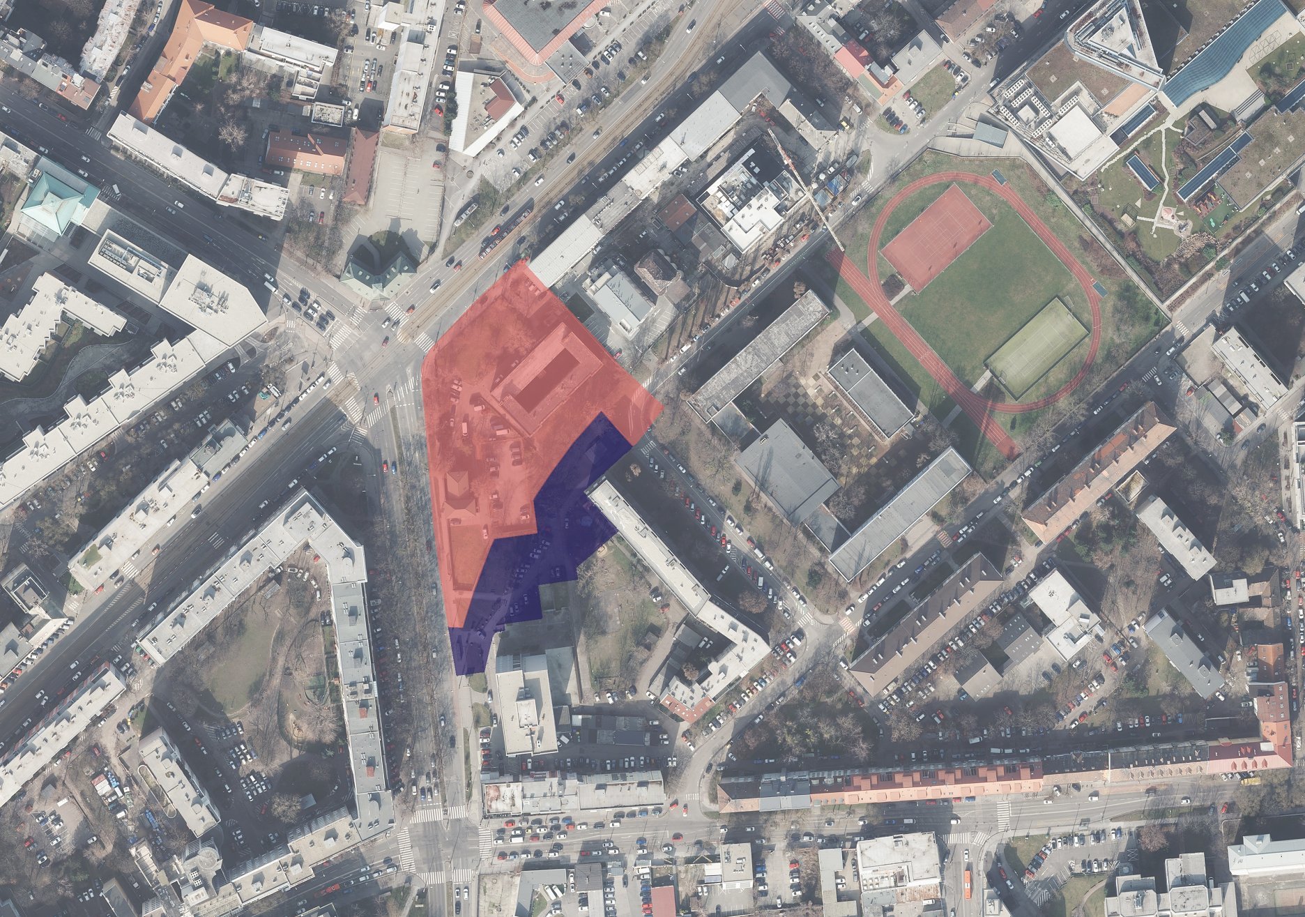 Ide o územie s celkovou rozlohou 7 684 metrov štvorcových. V minulom storočí na tomto území stál Ludwigov palác, sídlo obchodníka Johana Ludwiga, ktorý bol však koncom 2. svetovej vojny aj so susedným k nemu patriacim mlynom zbombardovaný. V areáli bola postavená a do užívania v roku 1934 daná budova vojenskej väznice, neskôr prestavaná na administratívnu budovu.