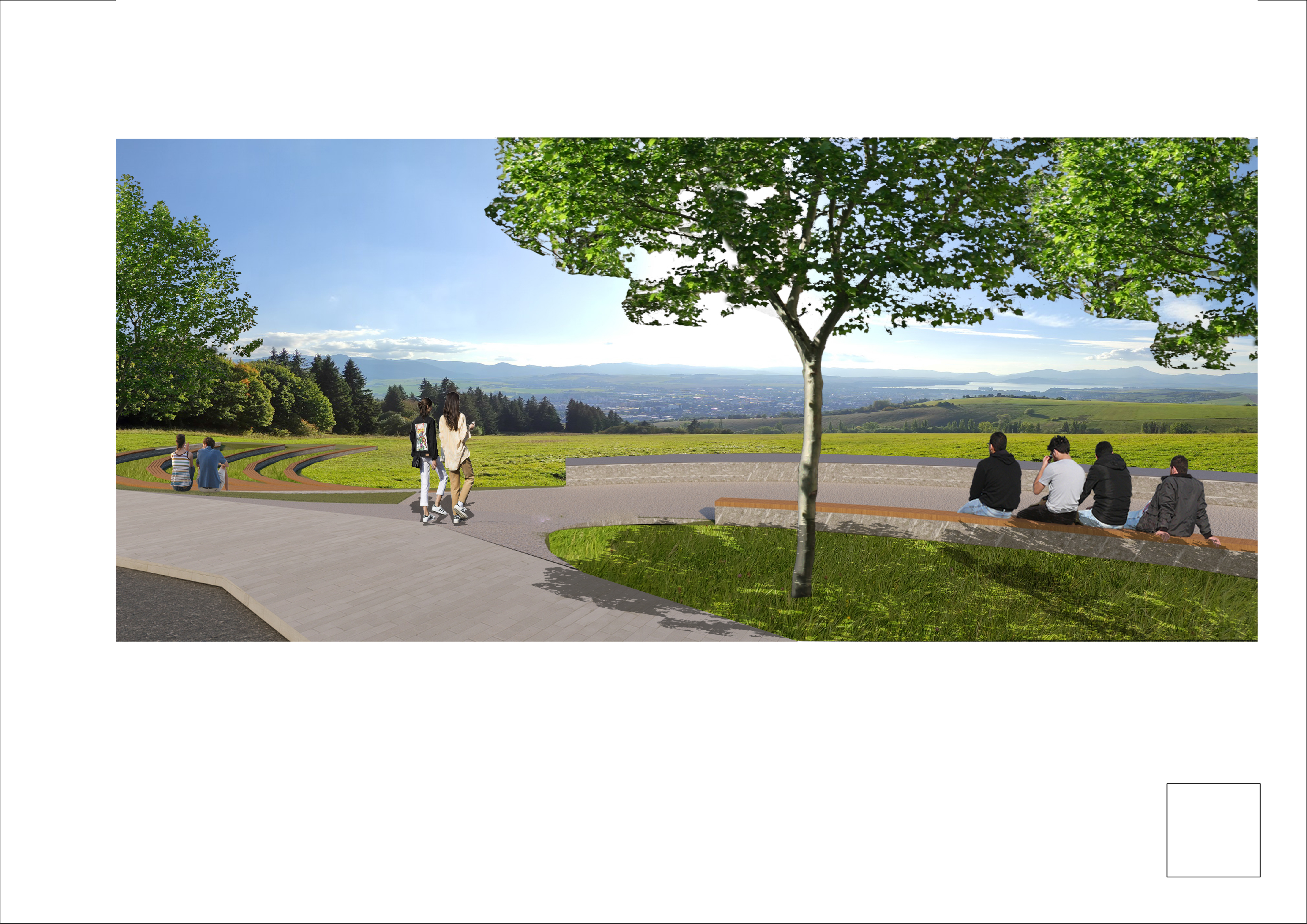 Návrh reflektuje na morfológiu terénu a využíva existujúci výhľad na krajinu. Navrhuje vyhliadkovú prevažne štrkovú terasu o ploche 180 m2 na hrebeni kopca s terénnymi schodmi na sedenie. Ideovo a tvarovo je návrh zaujímavý, vyhliadková terasa a informačný panel sú vhodnými prvkami v prostredí, betónový oporný múr obložený kamennými obrubami však pôsobí v prírodnom prostredí „ťažko“. Sekundárny priestor amfiteátra s provizórnym javiskom ponúka priestor pre kultúrne a spoločenské akcie, čo je pozitívum tohto návrhu. Autor v návrhu necíti potrebu prítomnosti vertikálneho elementu a ponúkajú skôr horizontálny princíp priestorového usporiadania prvkov. Autor pracuje s morfológiou terénu, vytvára rôzne funkčné zóny so snahou ponúknuť priestor na oddych a iné aktivity. Tieto prvky sa javia však mierne predimenzované, je otázne ich využitie, nakoľko absentuje určitá atraktívna forma, ktorá by lákala nnávštevníkov. Veľkým pozitívom je jednoznačne finančná nenáročnosť stavby, no na druhej strane návrhu chýba hlbší ideový koncept.