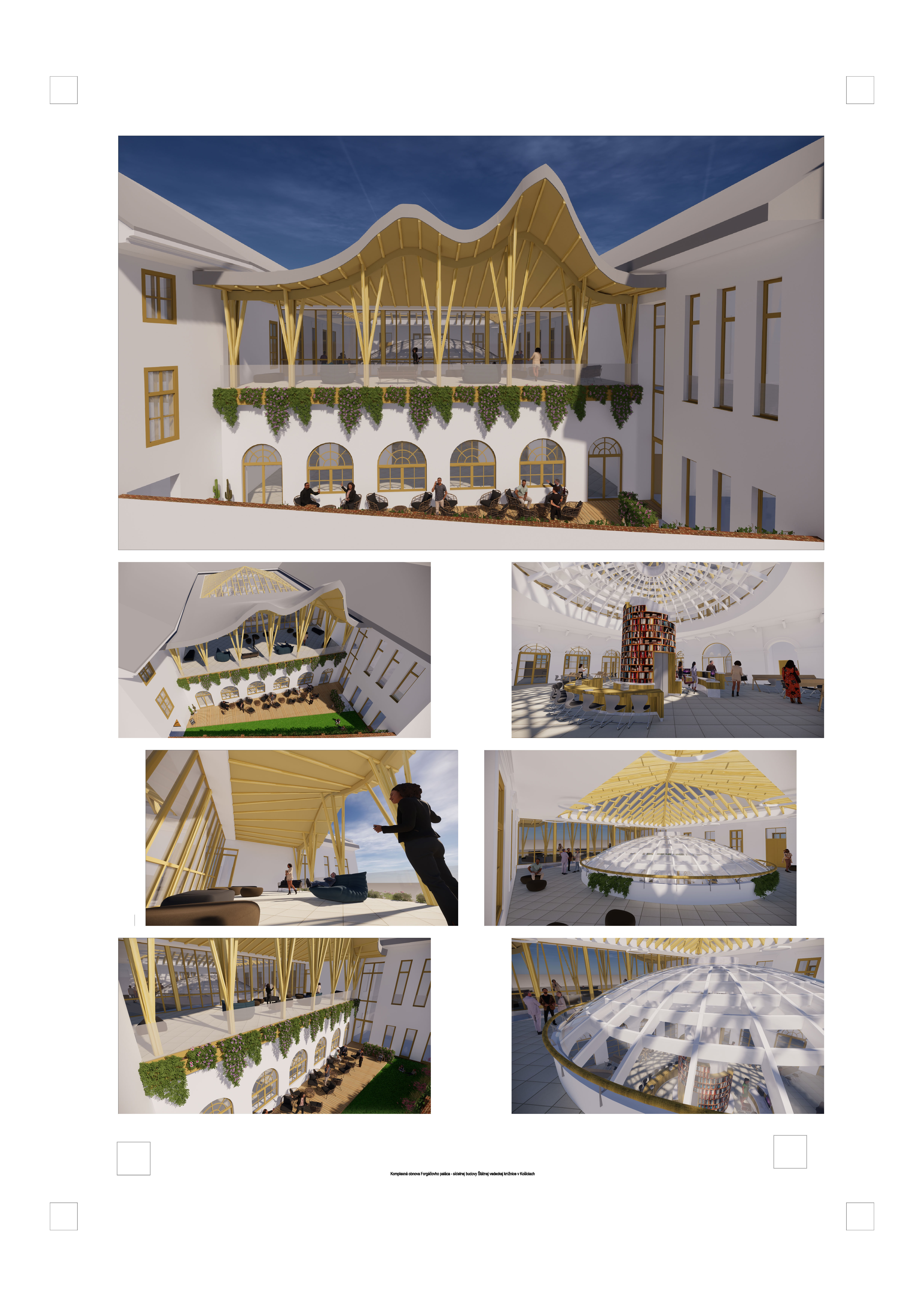 K zváženiu a prepracovaniu odporúčame priestor 2.NP nad kupolou. Umiestnenie sedenia a uloženie kníh nad kupolou nepovažujeme za reálne (aj zo statického hľadiska). Rovnako zastrešenie ETFE fóliou je nereálne z hľadiska prehrievania priestoru.